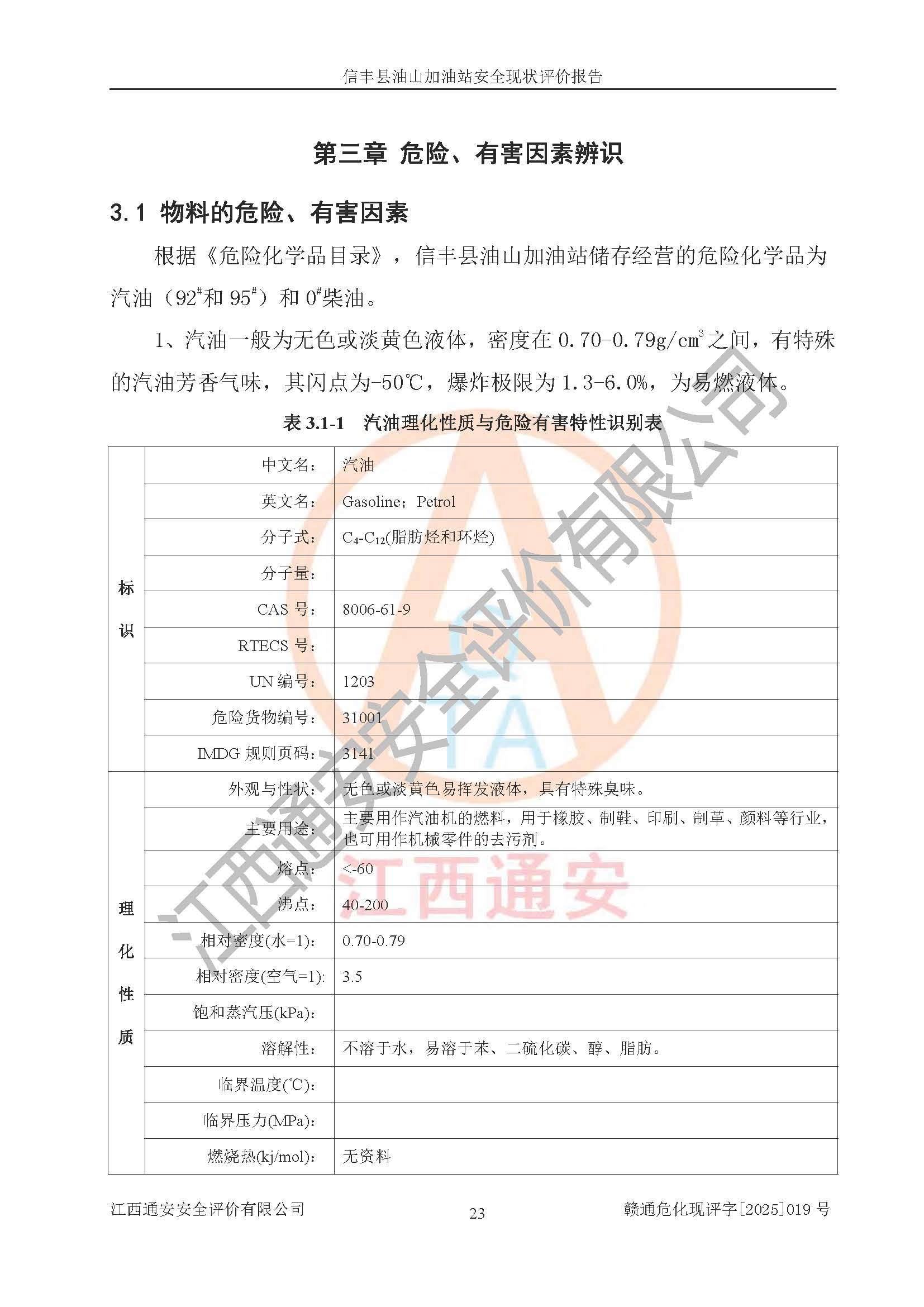 项目简介 | 信丰县油山加油站位于赣州市信丰县油山镇油山圩,投资人为陈迎生,现有员工3人,其中安全管理人员1人。该加油站2022年03月28日取得了危险化学品经营许可证,登记编号为(赣)信行审危许字[2022]009号,经营方式为零售,许可范围为汽油、柴油,**期限为2022年05月14日至2025年05月13日。该加油站2020年08月17日取得了成品油零售经营批准证书,编号为油零售证书第虔0040号,**期限为2020年06月23日至2025年06月22日。加油站设有2台埋地油罐,分别为1台35m30#柴油卧式储罐和1台25m392#汽油卧式油罐,总储存能力为42.5m³(柴油折半),为三级加油站。加油区设有1台双枪加油机和1台单枪加油机。该加油站目前运行正常。 | |||