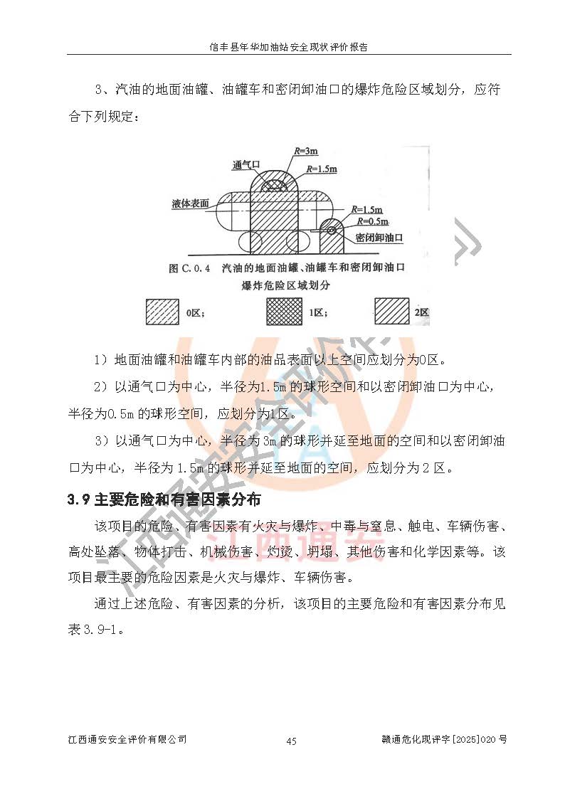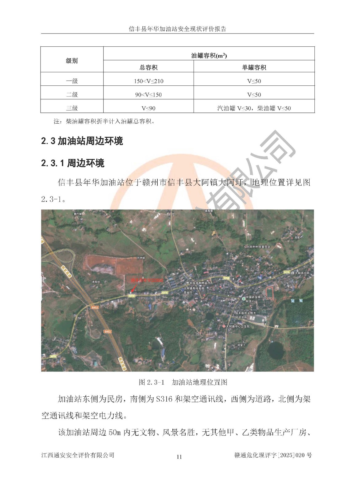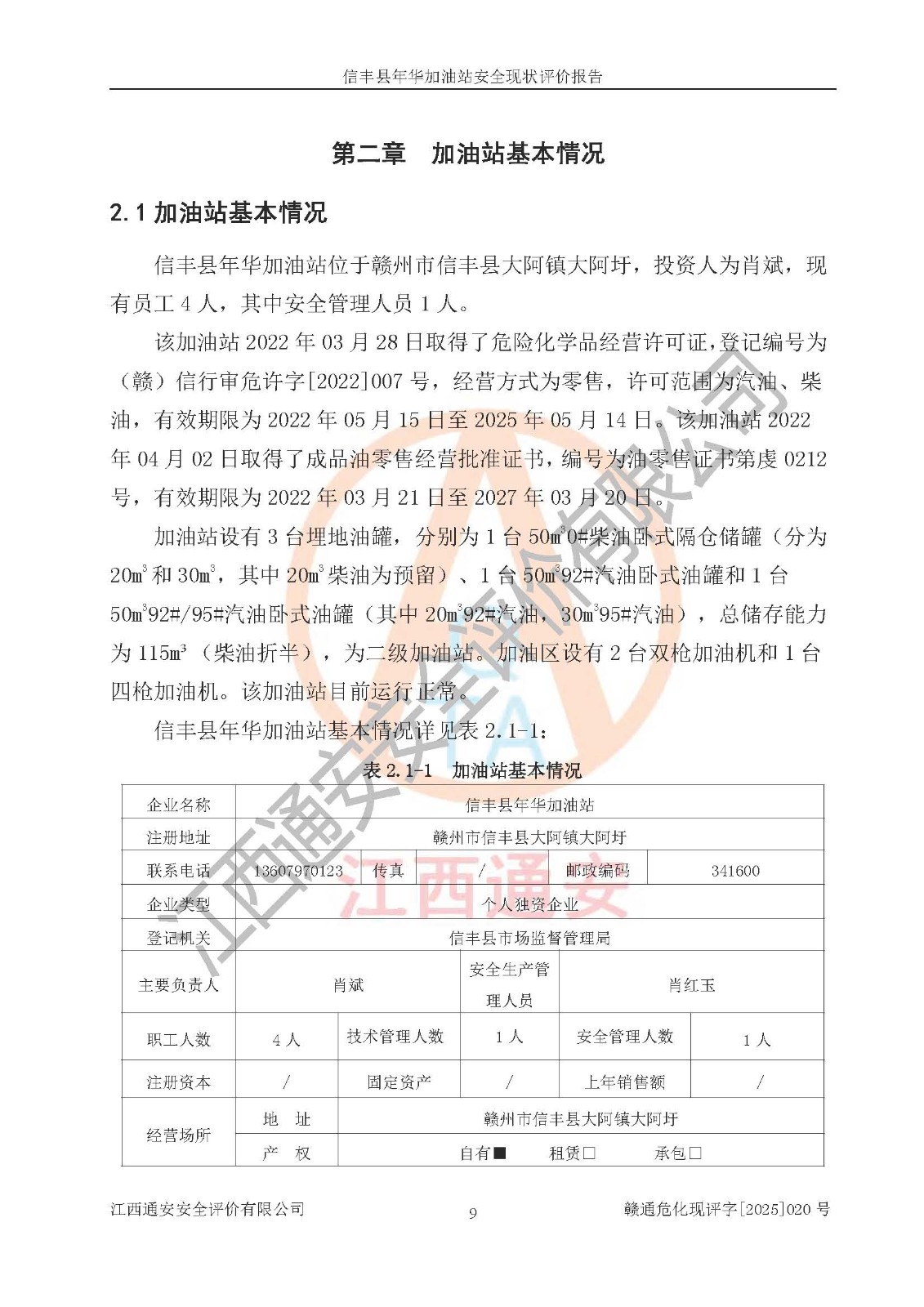 项目简介 | 信丰县年华加油站位于赣州市信丰县大阿镇大阿圩,投资人为肖斌,现有员工4人,其中安全管理人员1人。该加油站2022年03月28日取得了危险化学品经营许可证,登记编号为(赣)信行审危许字[2022]007号,经营方式为零售,许可范围为汽油、柴油,**期限为2022年05月15日至2025年05月14日。该加油站2022年04月02日取得了成品油零售经营批准证书,编号为油零售证书第虔0212号,**期限为2022年03月21日至2027年03月20日。加油站设有3台埋地油罐,分别为1台50m30#柴油卧式隔仓储罐(分为20m3和30m3,其中20m3柴油为预留)、1台50m392#汽油卧式油罐和1台50m392#/95#汽油卧式油罐(其中20m392#汽油,30m395#汽油),总储存能力为115m³(柴油折半),为二级加油站。加油区设有2台双枪加油机和1台四枪加油机。该加油站目前运行正常。 | |||