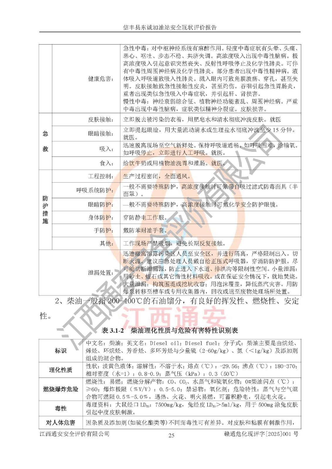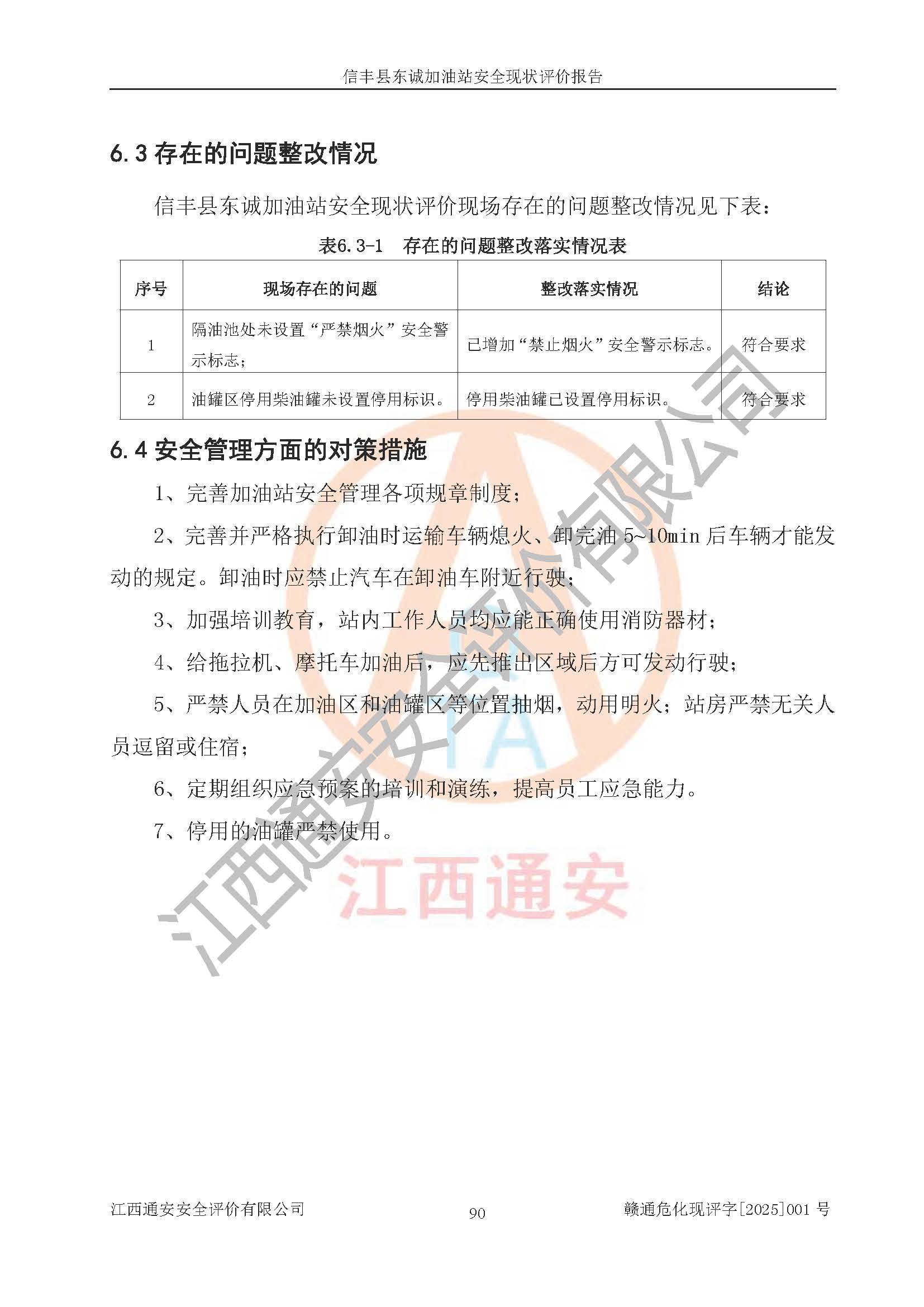 勘察现场发现的问题及安全对策措施 | 序号现场存在的问题安全对策措施1隔油池处未设置“严禁烟火”安全警示标志;应增加“严禁烟火”安全警示标志。2油罐区停用柴油罐未设置停用标识。停用柴油罐应设置停用标识。