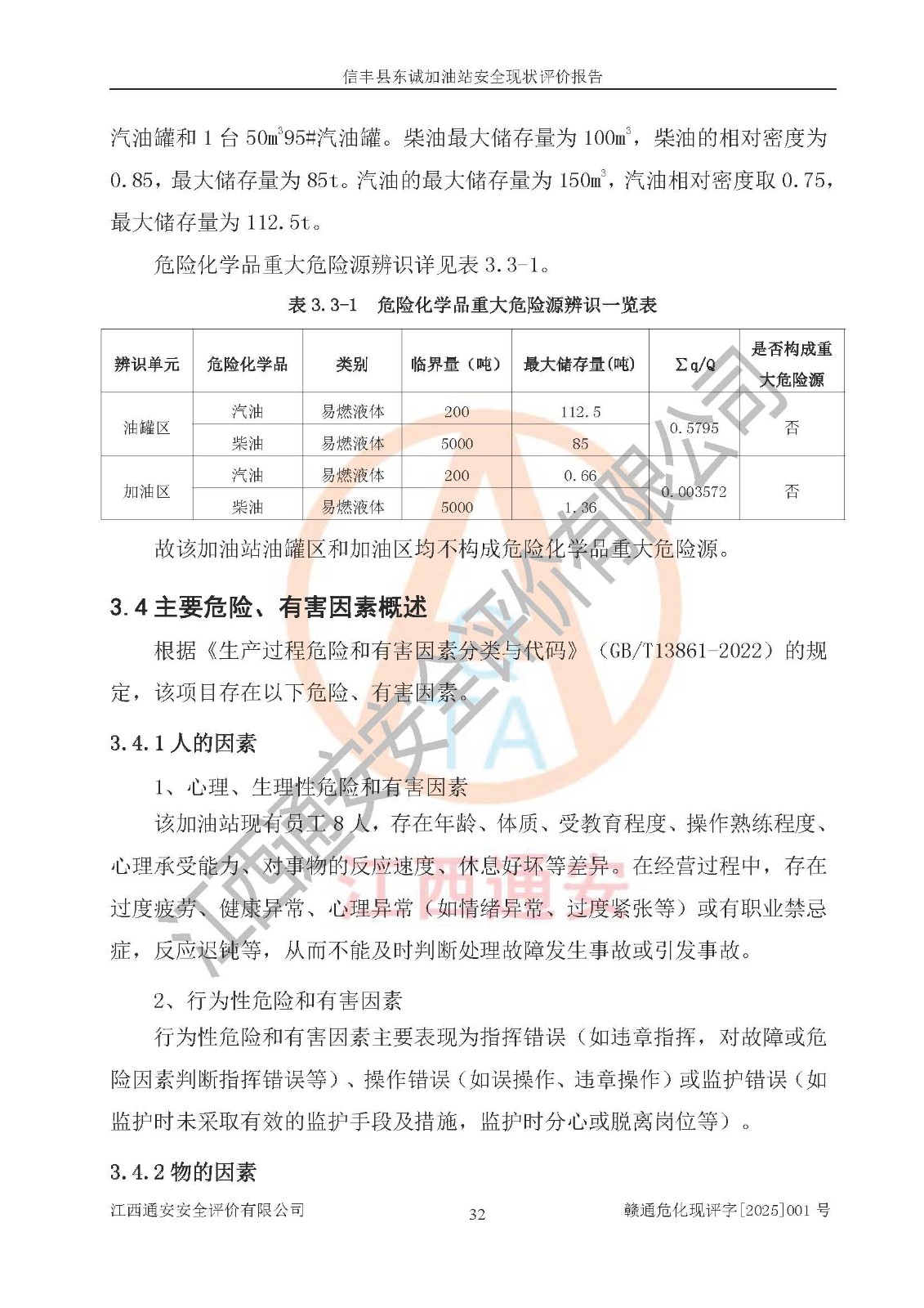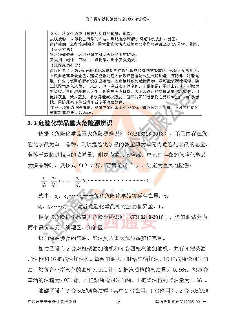 项目简介 | 信丰县东诚加油站位于赣州市信丰县嘉定镇黄家坑村,企业法定**人为李敏晖,现有员工8人,其中安全管理人员2人。该加油站2022年03月04日取得了危险化学品经营许可证,登记编号为(赣)信行审危许字[2022]006号,经营方式为零售(带有储存设施经营),许可范围为汽油、柴油,**期限为2022年03月04日至2025年03月03日。该加油站2020年8月17日取得了成品油零售经营批准证书,编号为油零售证书第虔0038号,**期限为2020年06月23日至2025年06月22日。加油站设有6台埋地油罐,其中停用1台油罐,使用的油罐分别为2台50m30#柴油卧式储罐、2台50m392#汽油卧式储罐和1台50m395#汽油卧式储罐,总储存能力为200m³(柴油折半),为一级加油站。加油区设有4台四枪加油机和2台双枪加油站。该加油站目前运行正常。 | |||