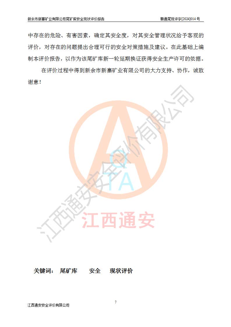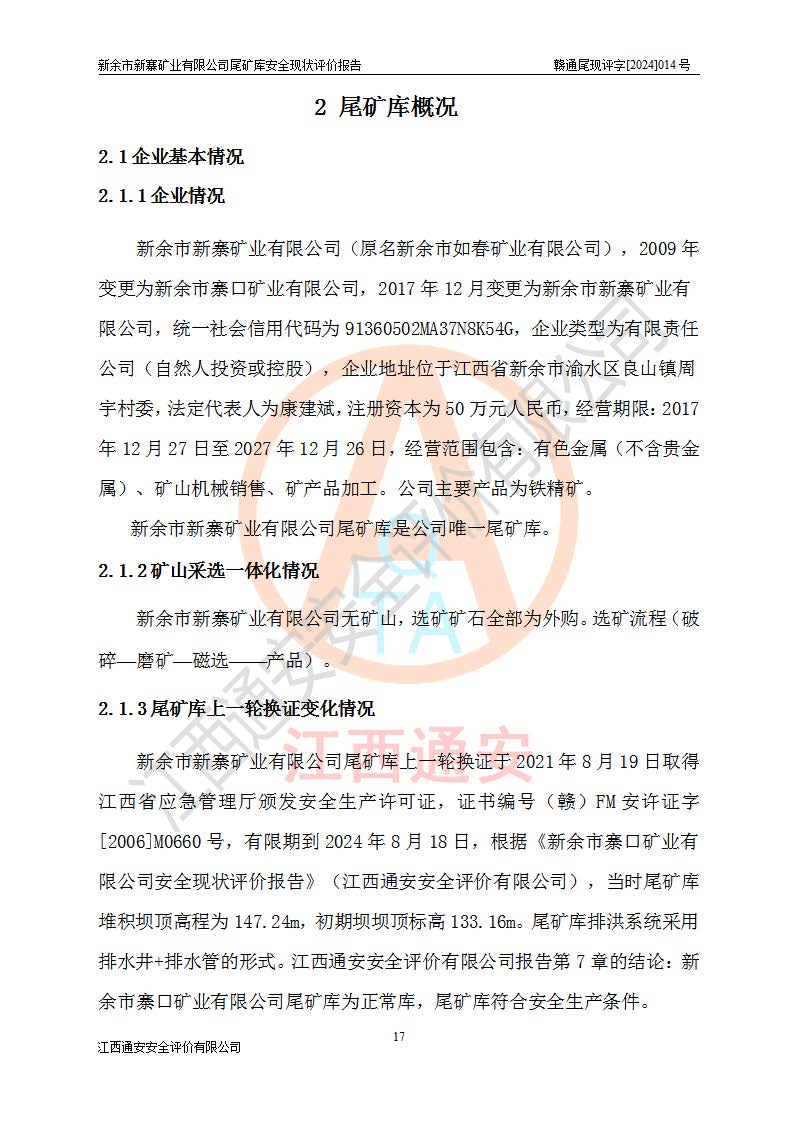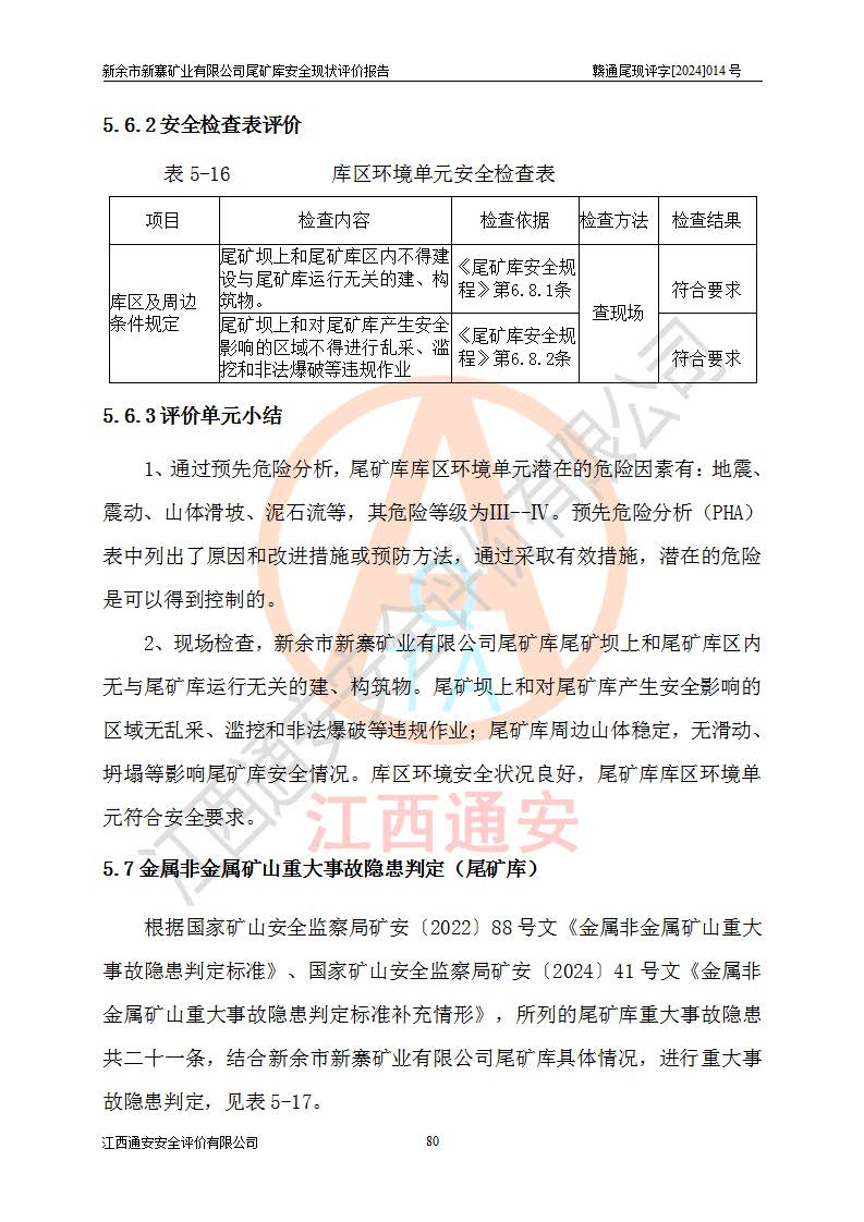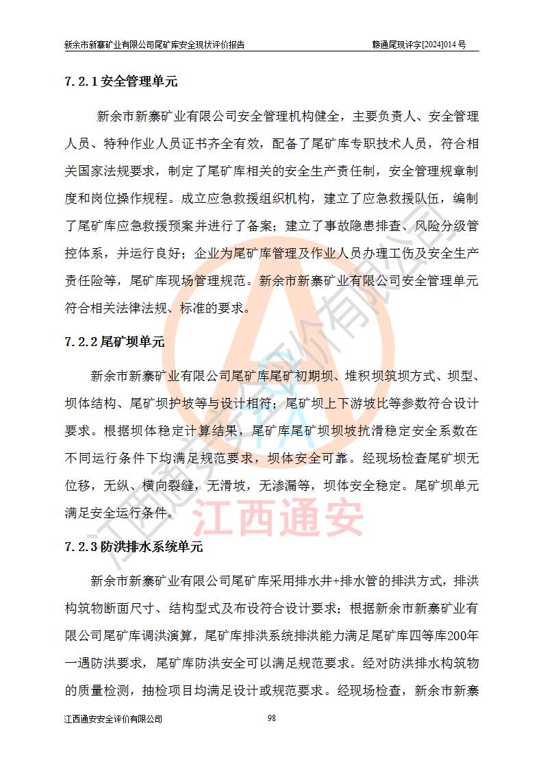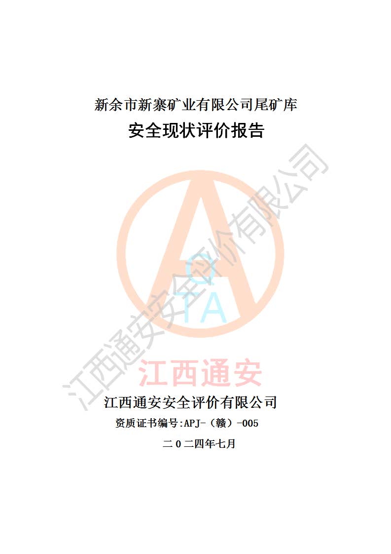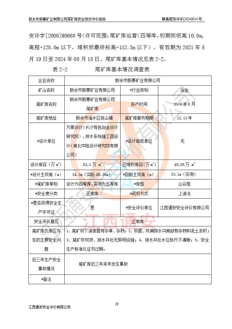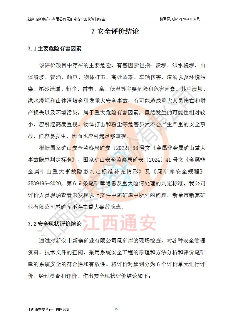 评价结论 | 新余市新寨矿业有限公司尾矿库为正常库,具备继续生产运行的安全生产条件。