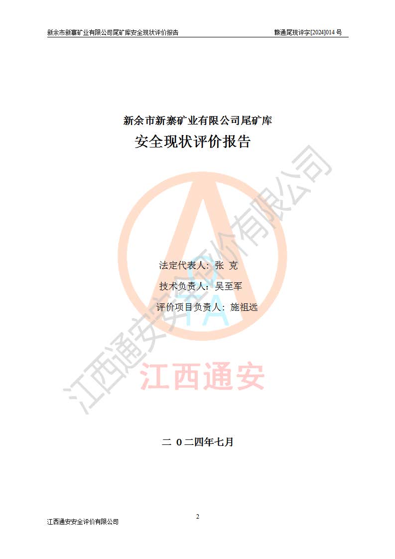 评价报告名称 | 新余市新寨矿业有限公司尾矿库安全现状评价报告 | |||