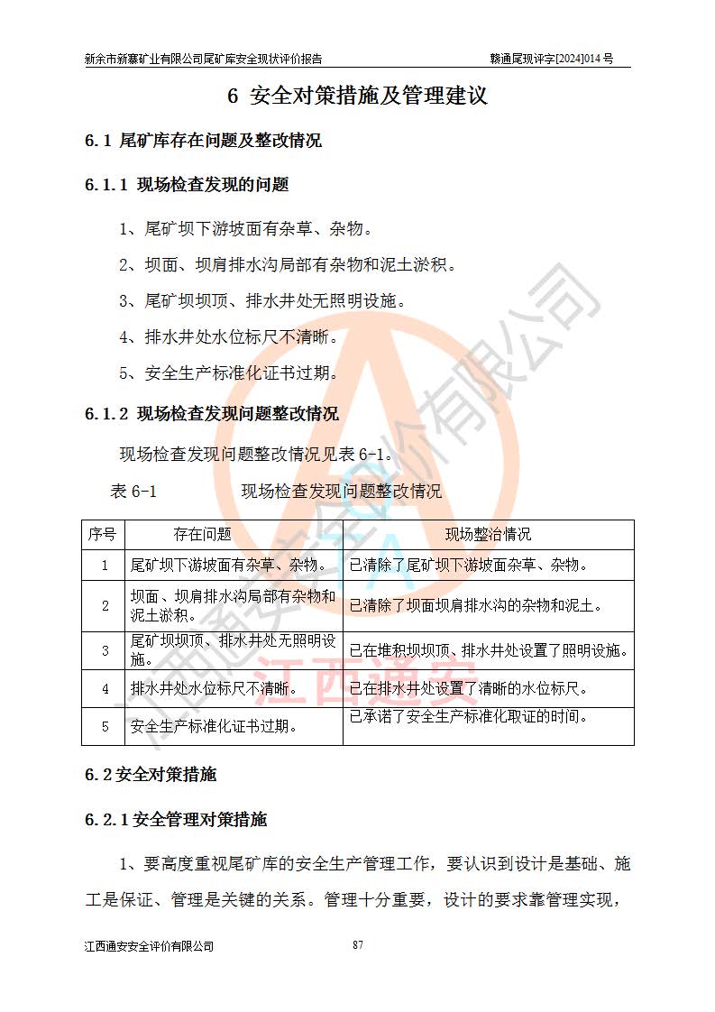 勘察现场发现的问题及安全对策措施 | 存在的问题:1、尾矿坝下游坡面有杂草杂物;2、坝面坝肩排水沟局部有杂物和泥土淤积;3、尾矿坝坝顶、排水井处无照明设施;4、排水井处水位标尺不清晰。 整改措施:1、清除尾矿坝下游坡面杂草杂物;2、清理坝面坝肩排水沟的杂物和泥土;3、在尾矿坝坝顶、排水井处设置照明设施;4、在排水井处设置清晰的水位标尺。 | |||