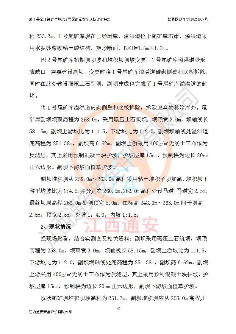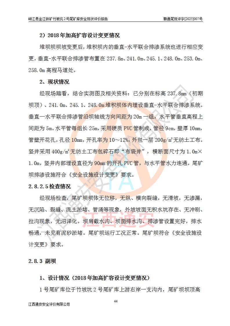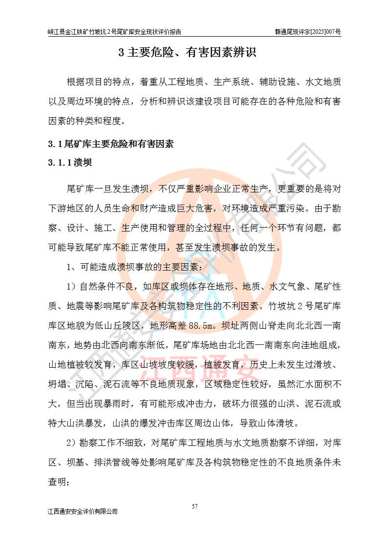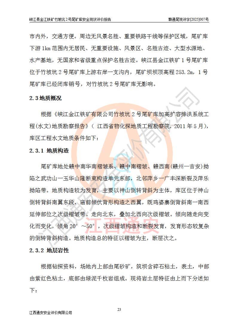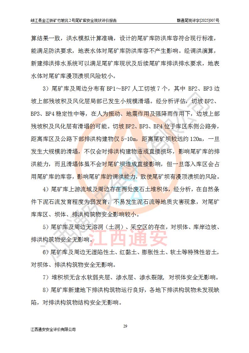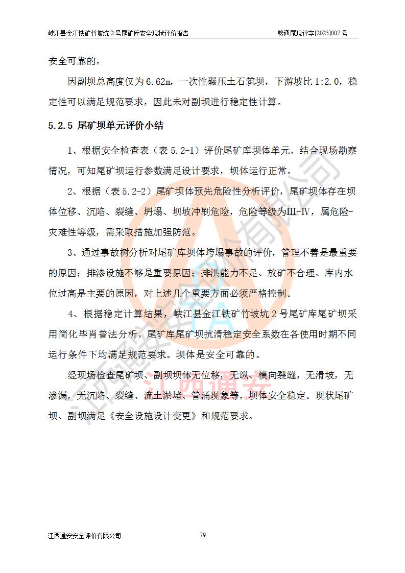 评价结论 | 峡江县金江铁矿竹坡坑2号尾矿库现状与《峡江县金江铁矿竹坡坑2号尾矿库加高扩容工程安全设施设计变更》一致,竹坡坑2号尾矿库为正常库,具备继续生产运行的安全生产条件。 | |||