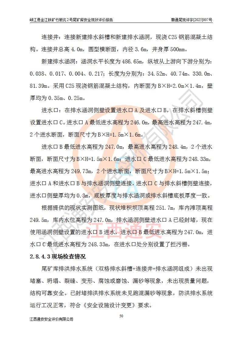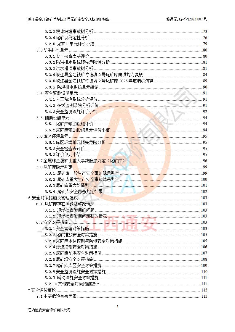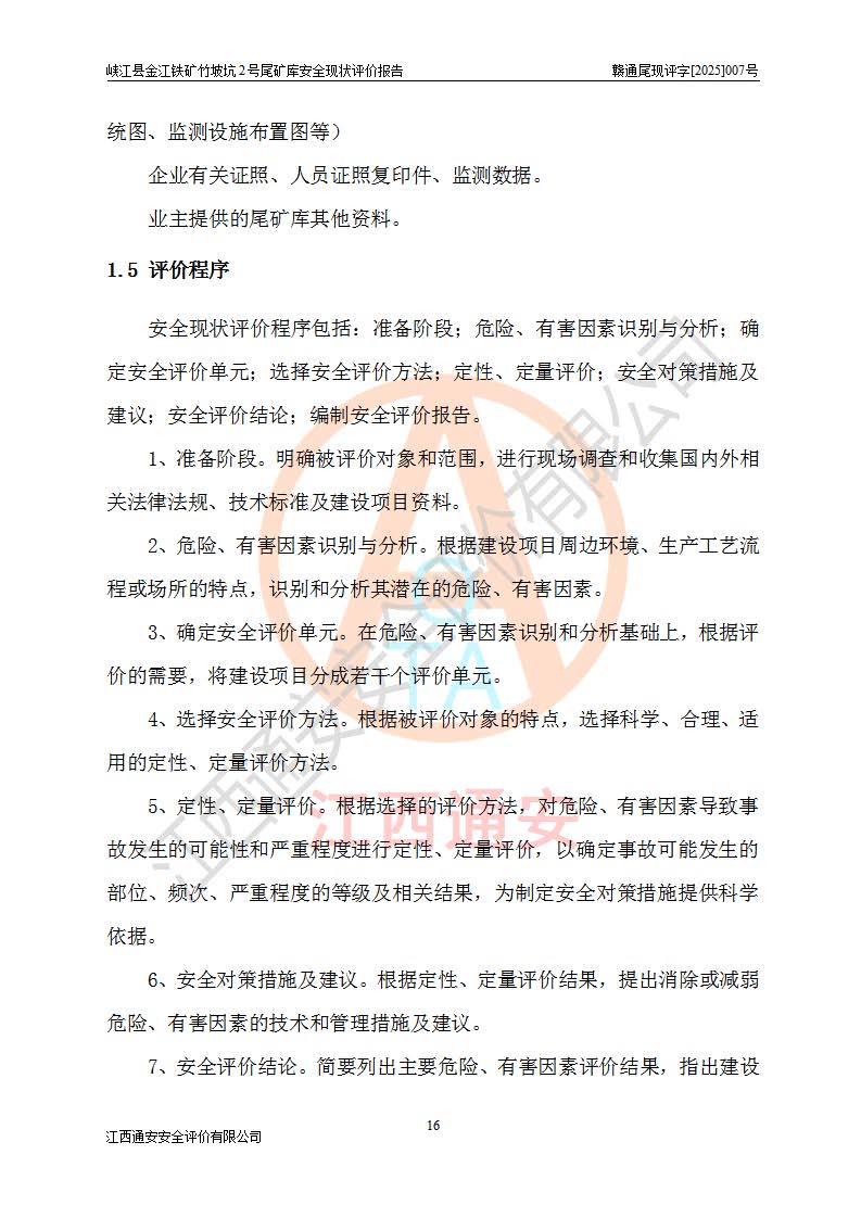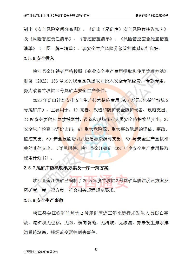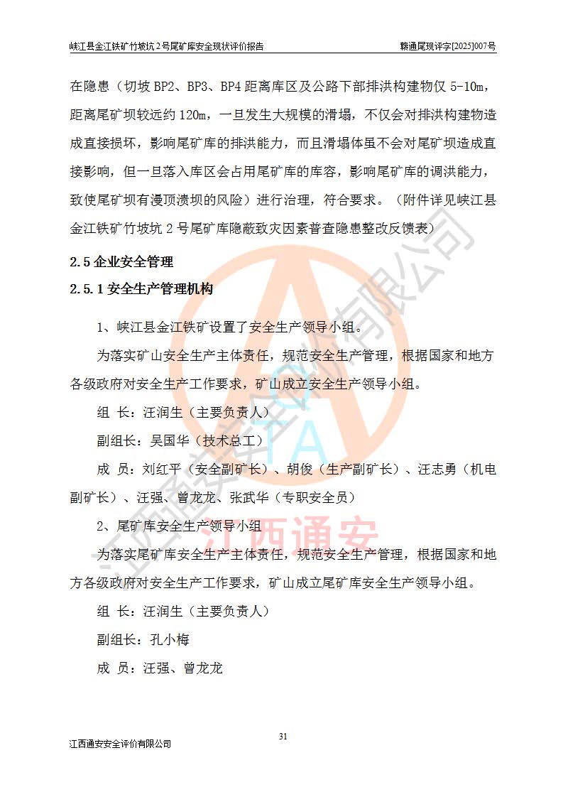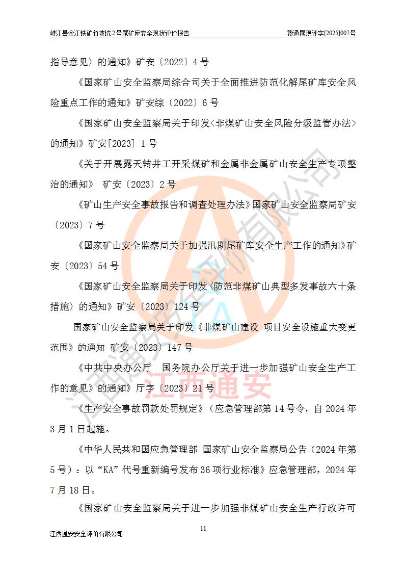 评价结论 | 峡江县金江铁矿竹坡坑2号尾矿库现状与《峡江县金江铁矿竹坡坑2号尾矿库加高扩容工程安全设施设计变更》一致,竹坡坑2号尾矿库为正常库,具备继续生产运行的安全生产条件。 | |||