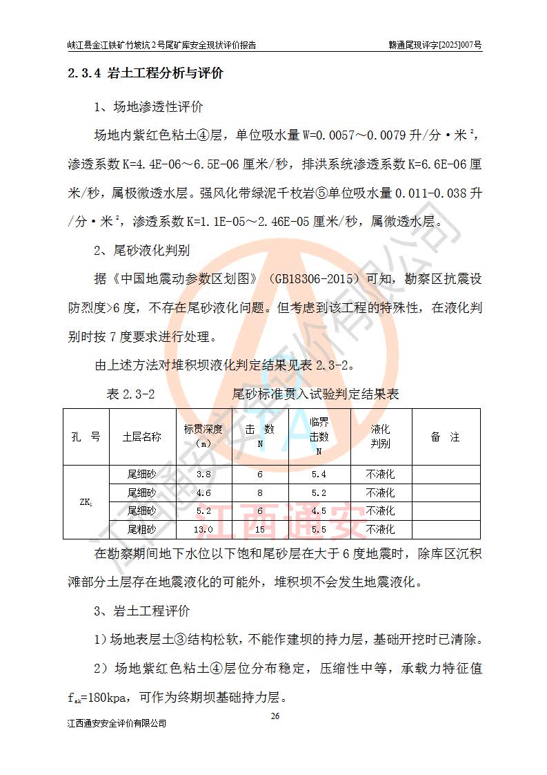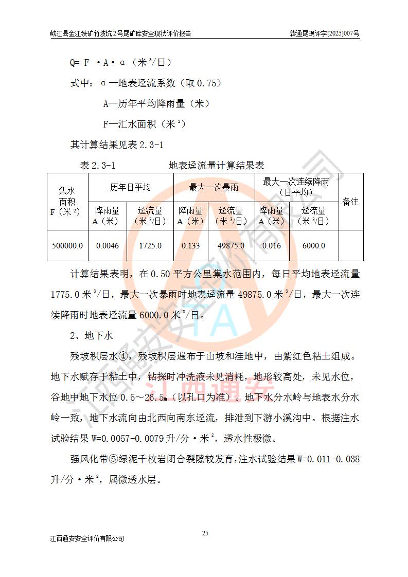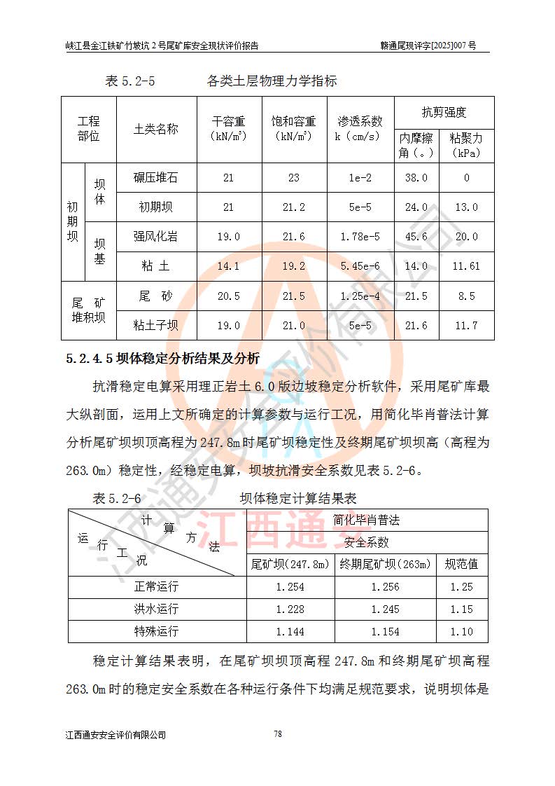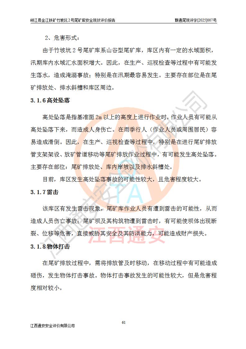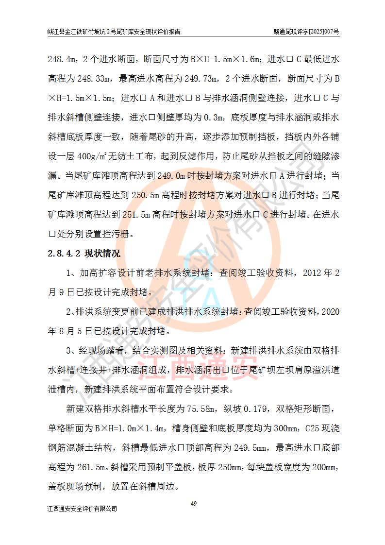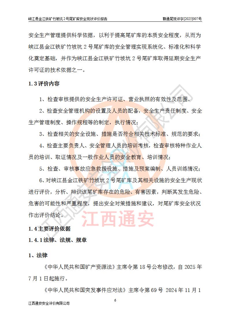 评价结论 | 峡江县金江铁矿竹坡坑2号尾矿库现状与《峡江县金江铁矿竹坡坑2号尾矿库加高扩容工程安全设施设计变更》一致,竹坡坑2号尾矿库为正常库,具备继续生产运行的安全生产条件。 | |||