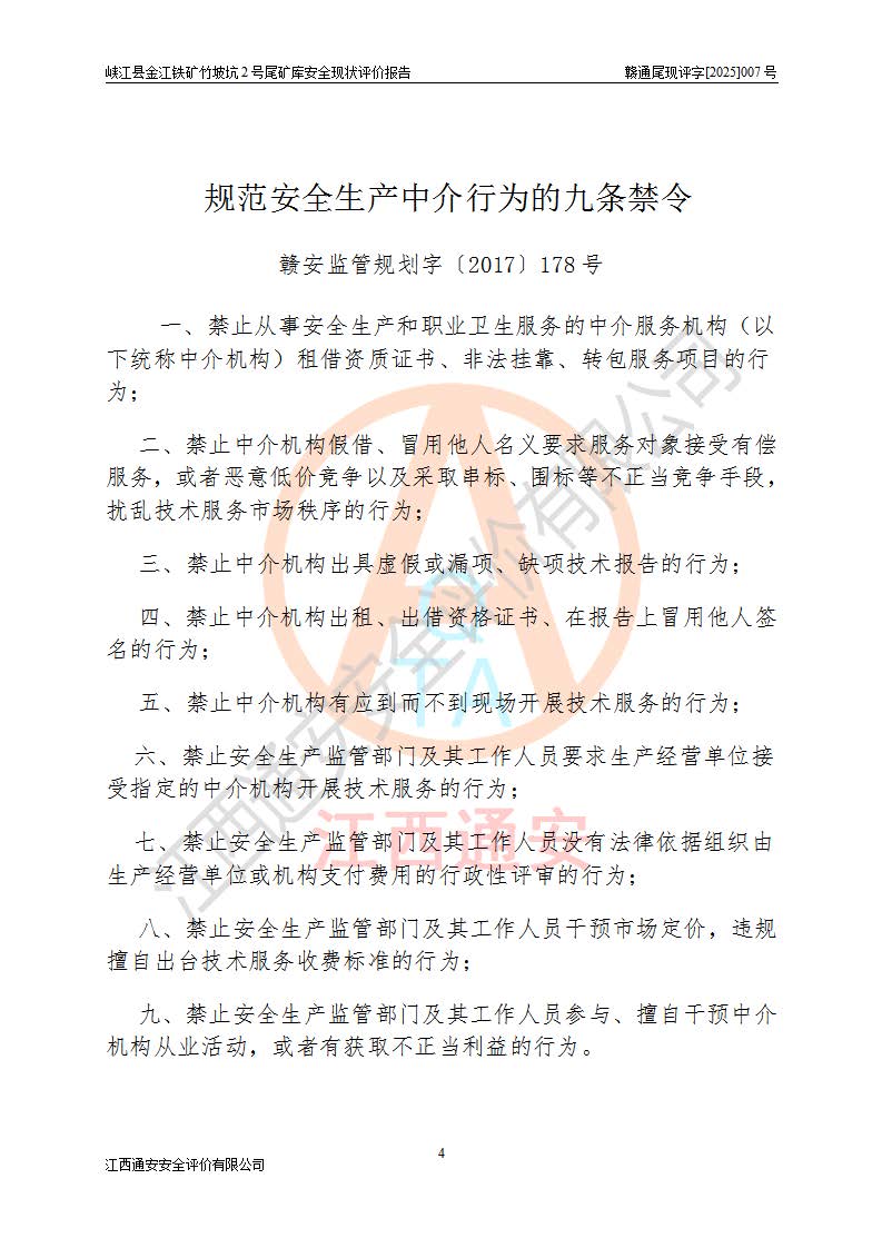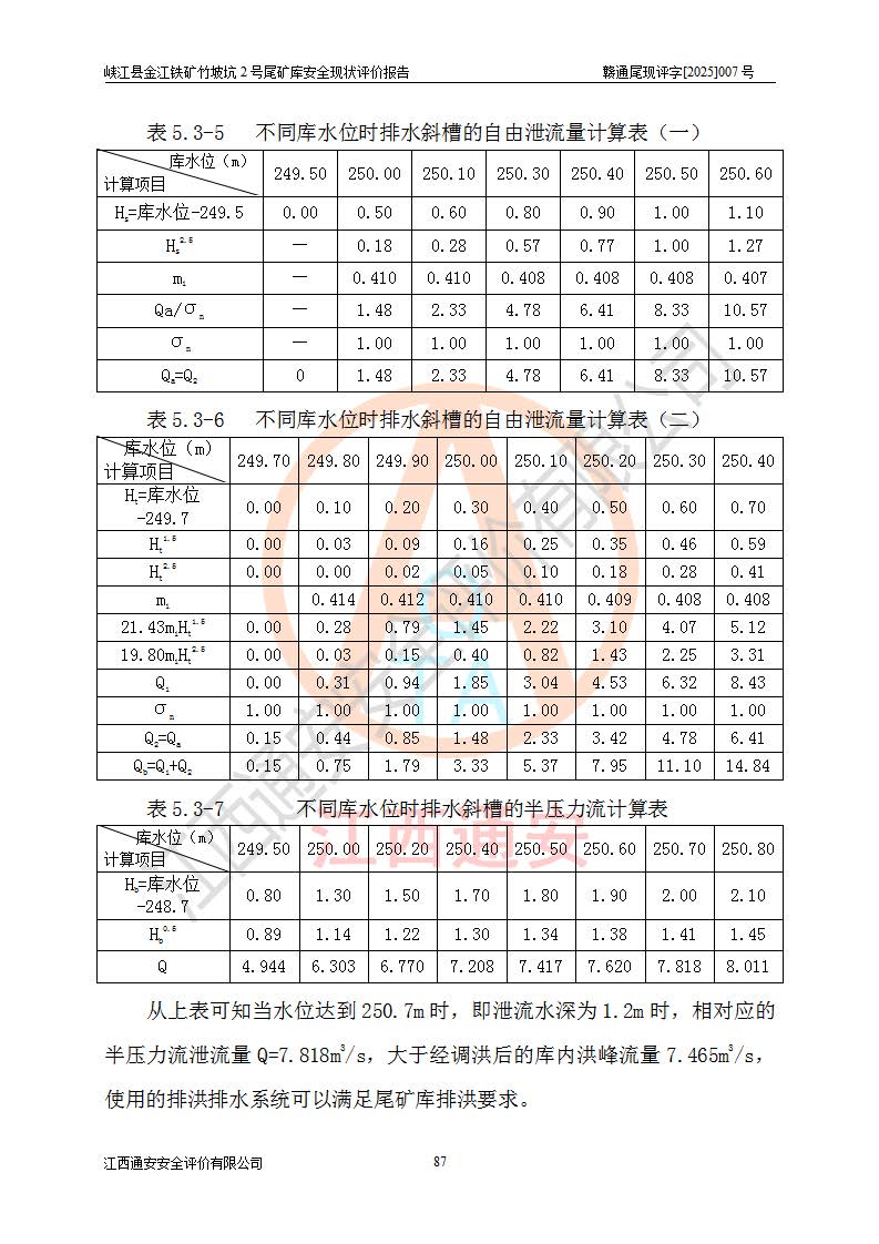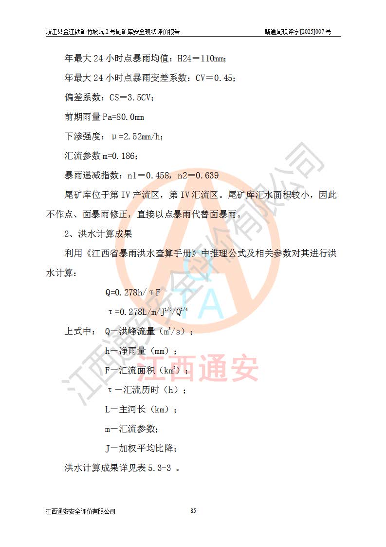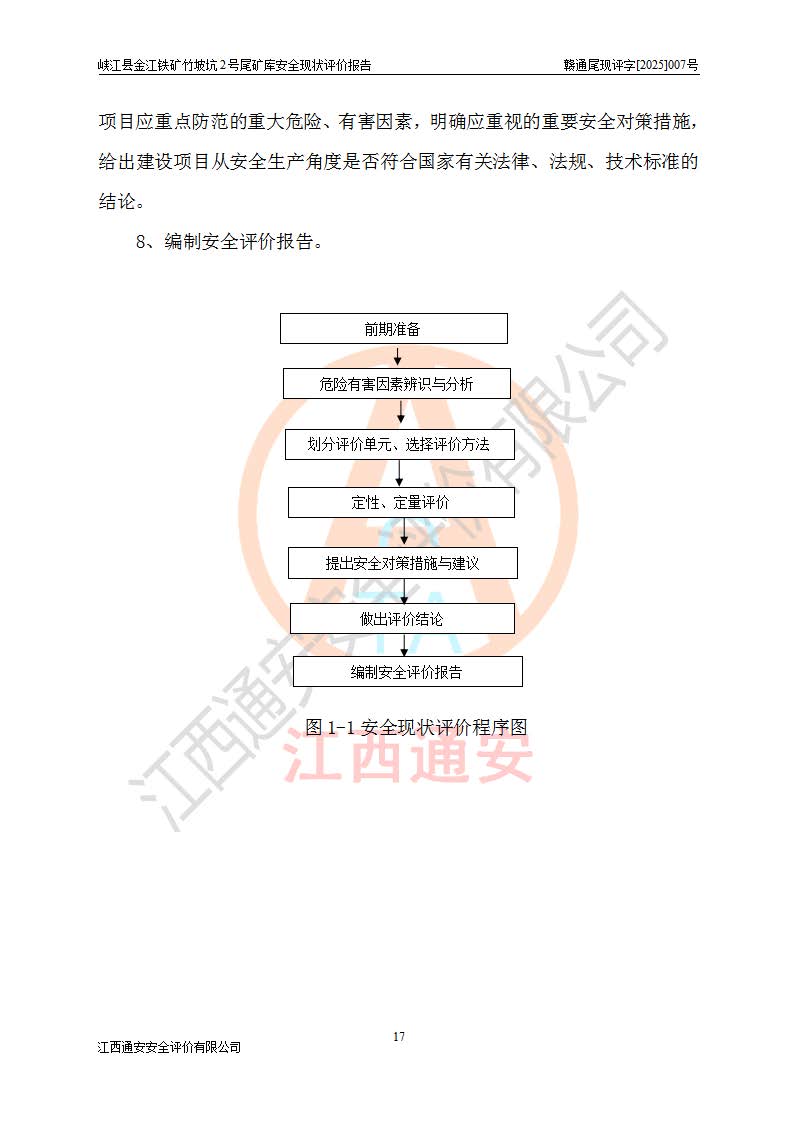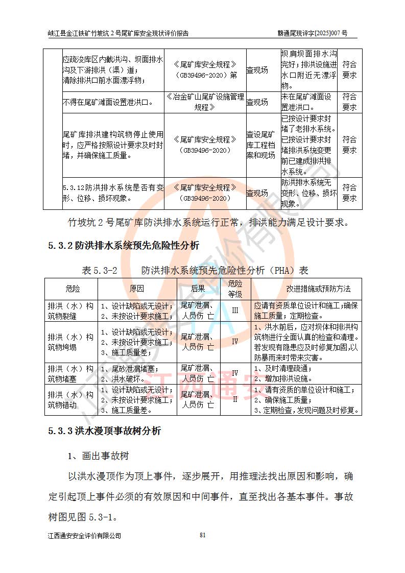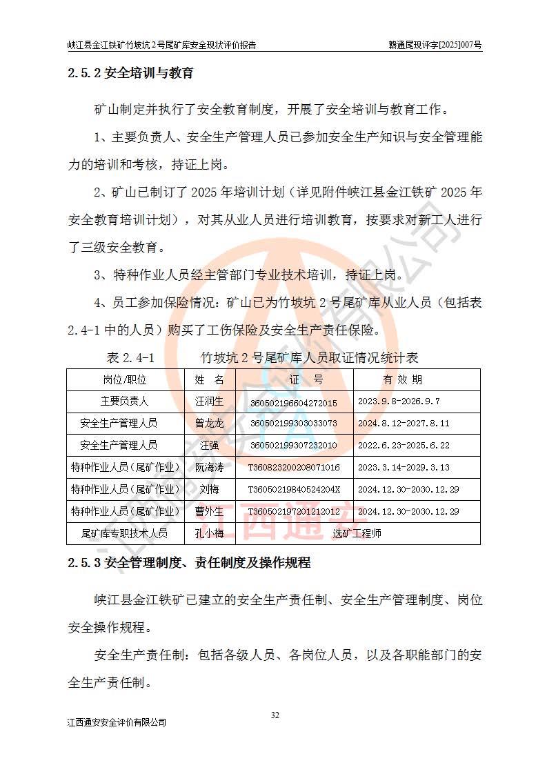 评价结论 | 峡江县金江铁矿竹坡坑2号尾矿库现状与《峡江县金江铁矿竹坡坑2号尾矿库加高扩容工程安全设施设计变更》一致,竹坡坑2号尾矿库为正常库,具备继续生产运行的安全生产条件。 | |||