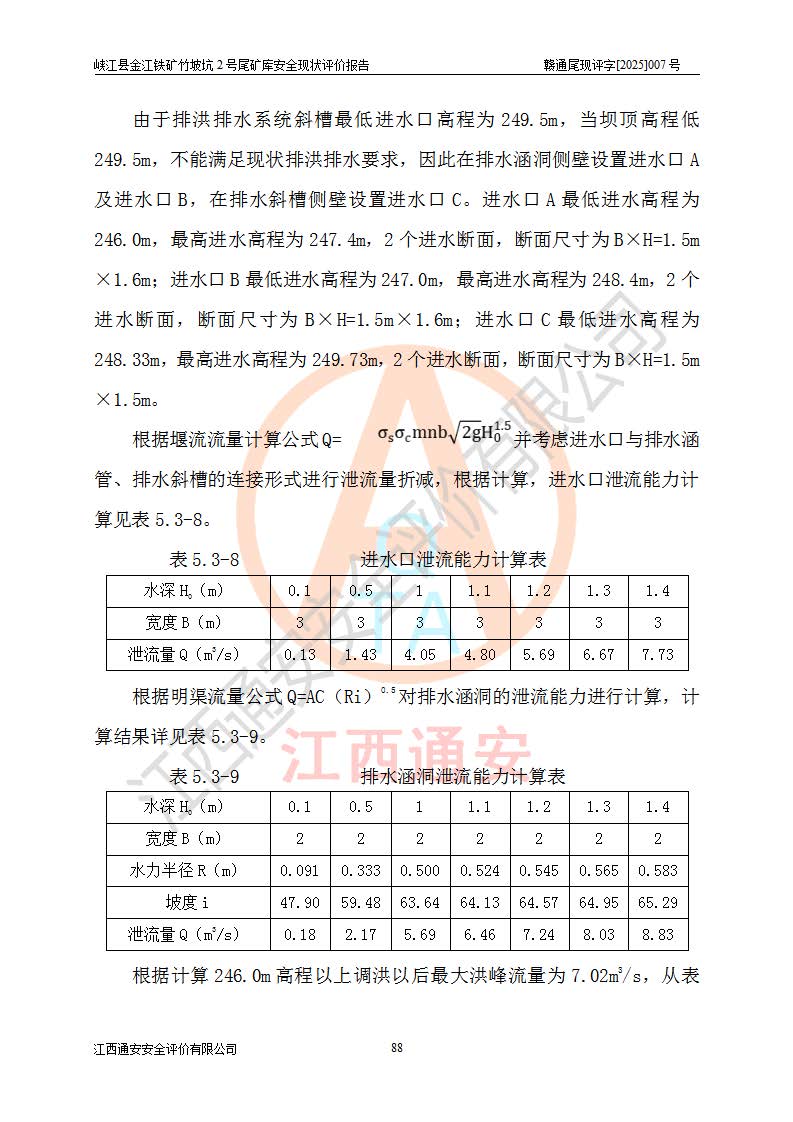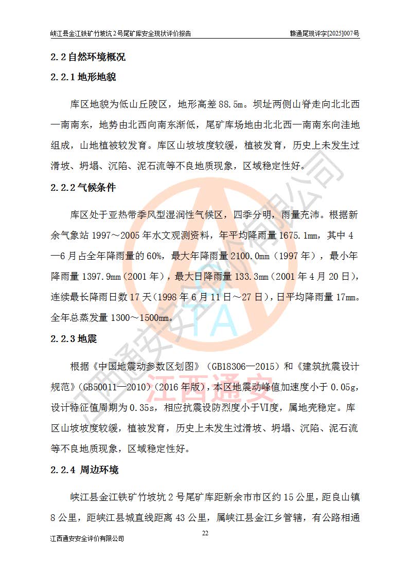 项目简介 | 峡江县金江铁矿成立于2004年5月9日,投资人为汪润生,为个人独资企业,住所为江西省吉安市峡江县金江乡黑虎村委二龙山,经营范围为铁矿露天/地下开采,铁精粉加工销售,废石尾砂加工销售。竹坡坑2号尾矿库位于峡江县金江乡黑虎村,靠近新余市与峡江县交界处,距峡江县城直线距离43**,距新余市良山镇直线距离8**,现状尾矿坝坝顶中部地理坐标:北纬X:27°35′47.96″,东经Y:114°53′41.06″,有公路相通市内外,交通方便。 峡江县金江铁矿竹坡坑2号尾矿库原设计尾矿坝为碾压土坝,采用风化土料一次性筑坝,总坝高26.0m,顶宽6.0m,坝顶高程为237.1m,坝轴线长94.5m,尾矿库库容为49.8×104m3。 2011年江西省冶金设计院有限责任公司对竹坡坑2号尾矿库进行加高扩容设计,2018年由原设计单位江西省冶金设计院有限责任公司对峡江县金江铁矿竹坡坑2号尾矿库加高扩容安全设施进行了设计变更。设计变更后竹坡坑2号尾矿库*终坝顶高程为263.0m,总坝高51.9m,尾矿库总库容为184.20×104m3,尾矿库为四等库。排洪系统采用双格斜槽+连接井+排水涵洞。 峡江县金江铁矿竹坡坑2号尾矿库于2022年5月20日取得江西省应急管理厅颁发的安全生产许可证,证书编号(赣)FM安许证字[2022]M1815号,有限期从2022年5月20日到2025年5月19日,为三年期。依照《非煤矿矿山企业安全生产许可证延期换证工作》的通知,根据***《安全生产许可证条例》、《江西省安全生产条例》、《非煤矿山安全生产许可证实施办法》、《江西省非煤矿矿山企业安全生产许可证办法》等规定的要求,受峡江县金江铁矿委托,我公司承担了竹坡坑2号尾矿库延期换证安全现状评价工作。 | |||