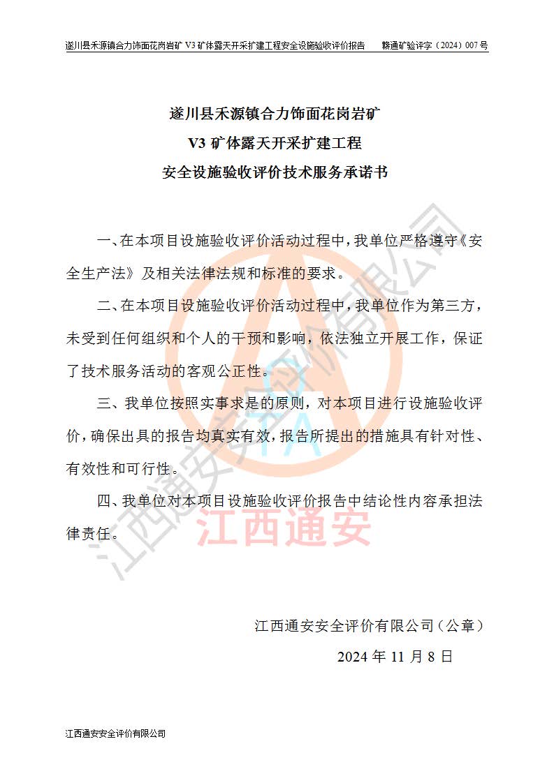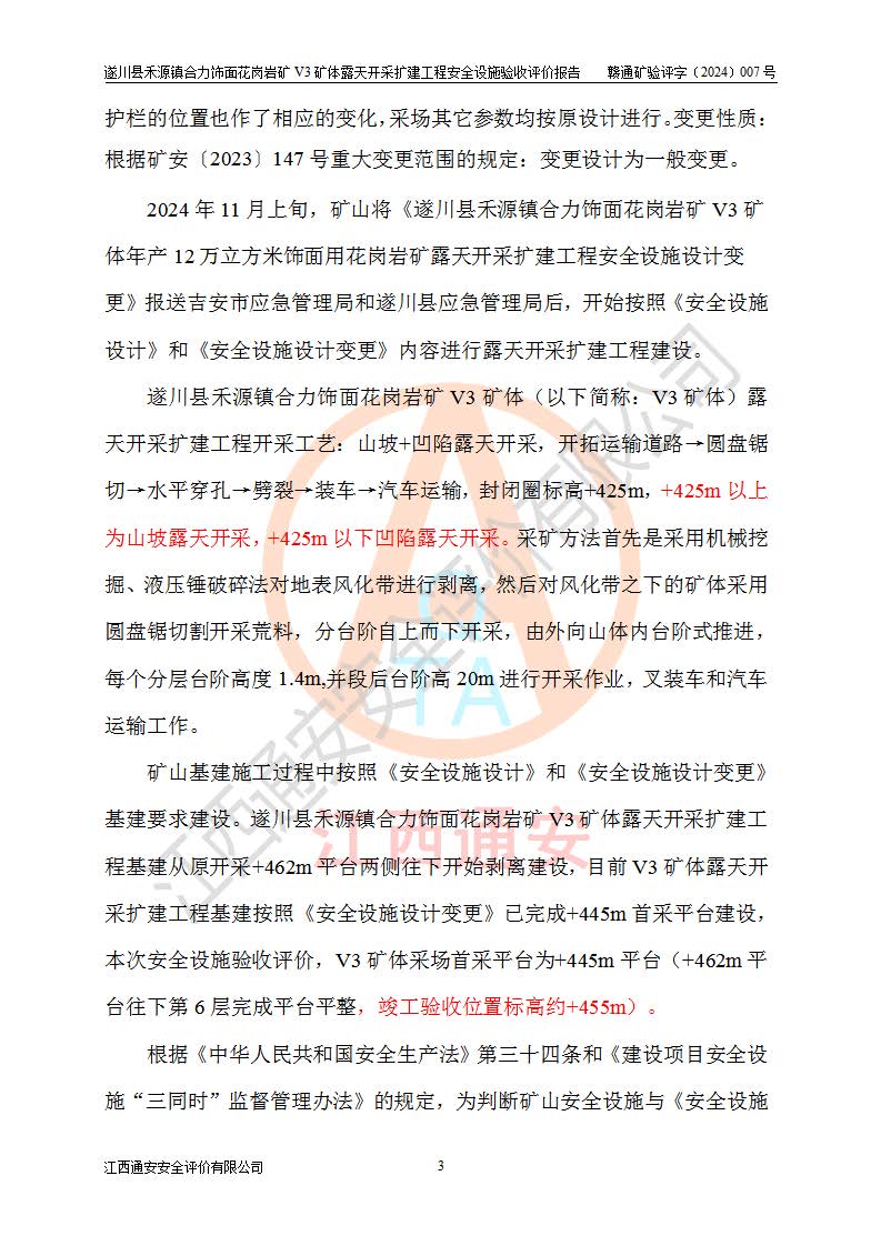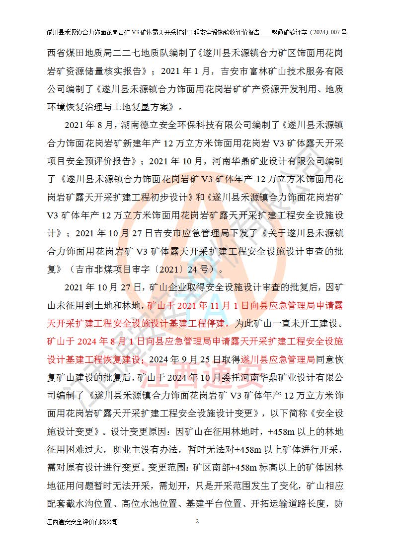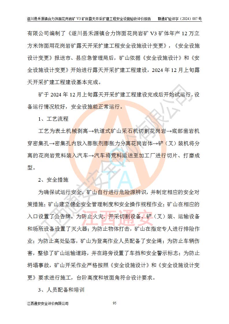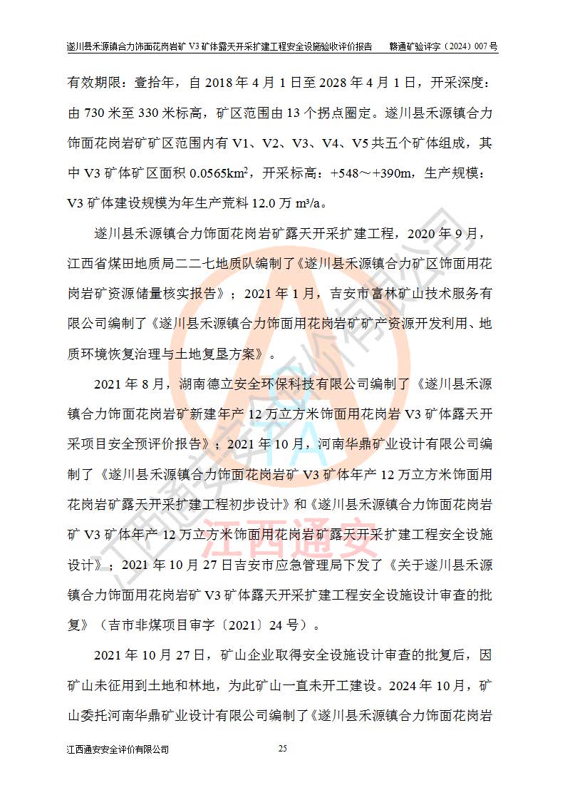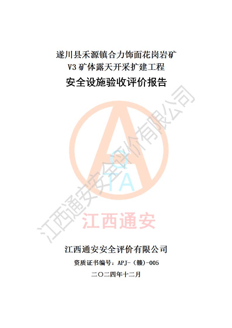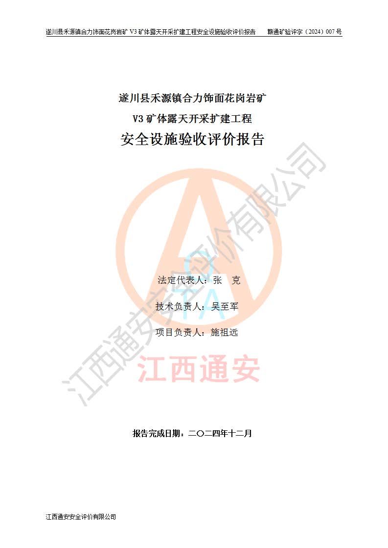 项目名称 | 遂川县禾源镇合力饰面花岗岩矿V3矿体露天开采扩建工程安全设施验收评价报告 | ||||