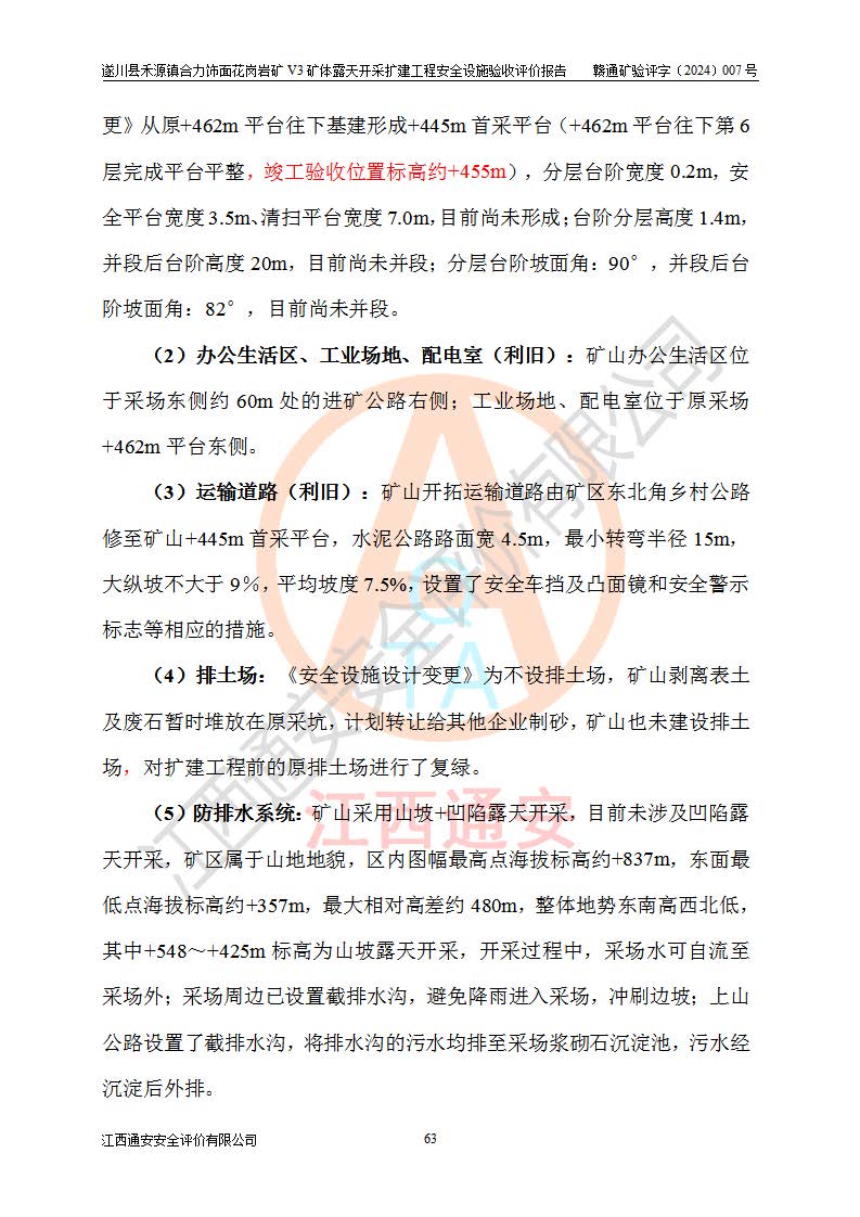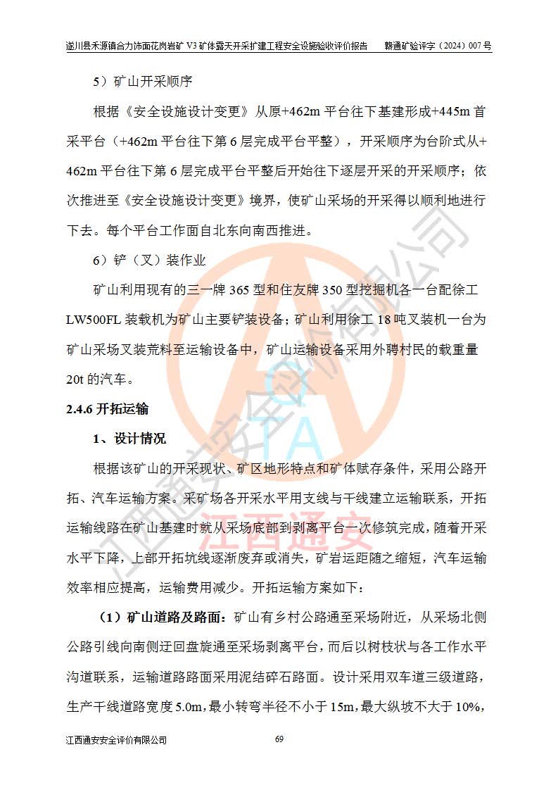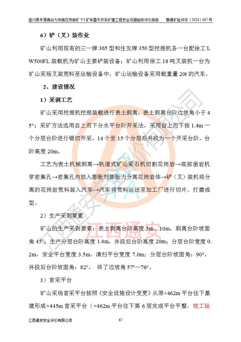 项目简介 | 遂川县禾源镇合力饰面花岗岩矿V3矿体属于遂川县禾源镇合力饰面花岗岩矿一个矿体,属普通合伙企业,执行事务合伙人:林玉生,经营范围:饰面用花岗岩矿开采,销售(凭**许可证经营)。遂川县禾源镇合力饰面花岗岩矿位于遂川县县城200°方位直距21**的禾源镇三溪自然村境内,行政区划属遂川县禾源镇管辖,矿区位置地理坐标:东经114°25′24″~114°26′05″,北纬26°08′58″~26°10′04″,矿区公司地理坐标:东经114°25′44″,北纬26°09′28″。矿区有约10km矿山公路至禾源镇**所在地,与禾源~遂川县城公路相接,距离遂川县城约21km,交通便利。 遂川县禾源镇合力饰面花岗岩矿露天开采扩建工程,2020年9月,江西省煤田地质局二二七地质队编制了《遂川县禾源镇合力矿区饰面用花岗岩矿资源储量核实报告》;2021年1月,吉安市富林矿山技术服务有限公司编制了《遂川县禾源镇合力饰面用花岗岩矿矿产资源开发利用、地质环境恢复治理与土地复垦方案》。2021年8月,湖南德立安全**科技有限公司编制了《遂川县禾源镇合力饰面花岗岩矿新建年产12万立方米饰面用花岗岩V3矿体露天开采项目安全预评价报告》;2021年10月,河南华鼎矿业设计有限公司编制了《遂川县禾源镇合力饰面花岗岩矿V3矿体年产12万立方米饰面用花岗岩矿露天开采扩建工程初步设计》和《遂川县禾源镇合力饰面花岗岩矿V3矿体年产12万立方米饰面用花岗岩矿露天开采扩建工程安全设施设计》;2021年10月27日吉安市应急管理局下发了《关于遂川县禾源镇合力饰面用花岗岩矿V3矿体露天开采扩建工程安全设施设计审查的批复》(吉市非煤项目审字〔2021〕24号)。 2021年10月27日,矿山企业取得安全设施设计审查的批复后,因矿山未征用到土地和林地,矿山于2021年11月1日向县应急管理局申请露天开采扩建工程安全设施设计基建工程停建,为此矿山一直未开工建设。矿山于2024年8月1日向县应急管理局申请露天开采扩建工程安全设施设计基建工程恢复建设;2024年9月25日取得遂川县应急管理局同意恢复矿山建设的批复后,矿山于2024年10月委托河南华鼎矿业设计有限公司编制了《遂川县禾源镇合力饰面花岗岩矿V3矿体年产12万立方米饰面用花岗岩矿露天开采扩建工程安全设施设计变更》,以下简称《安全设施设计变更》。设计变更原因:因矿山在征用林地时,+458m以上的林地征用困难过大,现业主没有办法,暂时无法对+458m以上矿体进行开采,需对原有设计进行变更。变更范围:矿区南部+458m标高以上的矿体因林地征用问题暂时无法开采,需划开,只是开采范围发生了变化,矿山相应配套截水沟位置、高位水池位置、基建平台位置、开拓运输道路长度,防护栏的位置也作了相应的变化,采场其它参数均按原设计进行。变更性质:根据矿安〔2023〕147号重大变更范围的规定:变更设计为一般变更。 2024年11月上旬,矿山将《遂川县禾源镇合力饰面花岗岩矿V3矿体年产12万立方米饰面用花岗岩矿露天开采扩建工程安全设施设计变更》报送吉安市应急管理局和遂川县应急管理局后,开始按照《安全设施设计》和《安全设施设计变更》内容进行露天开采扩建工程建设。 遂川县禾源镇合力饰面花岗岩矿V3矿体露天开采扩建工程开采工艺:山坡+凹陷露天开采,开拓运输道路→圆盘锯切→水平穿孔→劈裂→装车→汽车运输,封闭圈标高+425m,+425m以上为山坡露天开采,+425m以下凹陷露天开采。采矿方法首先是采用机械挖掘、液压锤破碎法对地表风化带进行剥离,然后对风化带之下的矿体采用圆盘锯切割开采荒料,分台阶自上而下开采,由外向山体内台阶式推进,每个分层台阶**1.4m,并段后台阶高20m进行开采作业,叉装车和汽车运输工作。 矿山基建施工过程中按照《安全设施设计》和《安全设施设计变更》基建要求建设。遂川县禾源镇合力饰面花岗岩矿V3矿体露天开采扩建工程基建从原开采+462m平台两侧往下开始剥离建设,目前V3矿体露天开采扩建工程基建按照《安全设施设计变更》已完成+445m首采平台建设,本次安全设施验收评价,V3矿体采场首采平台为+445m平台(+462m平台往下第6层完成平台平整,竣工验收位置标高约+455m)。 | ||||