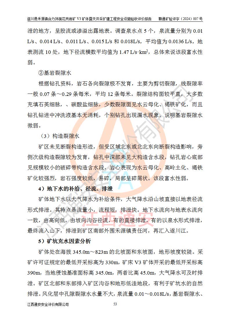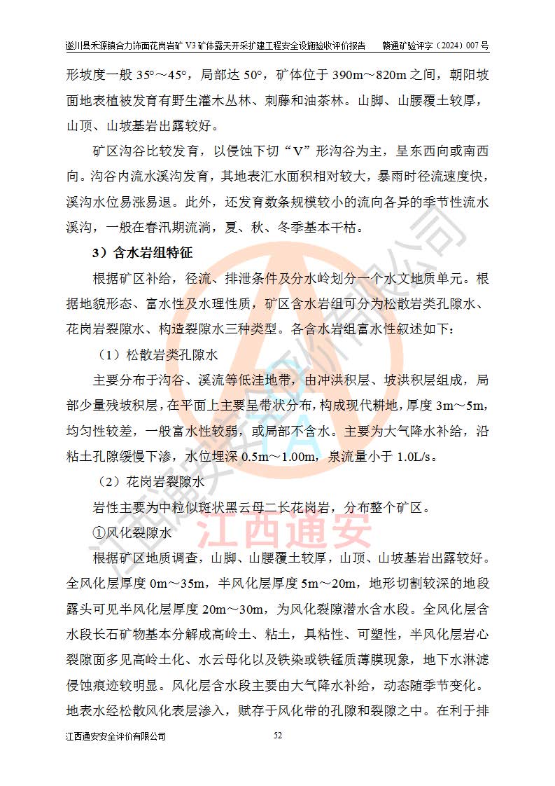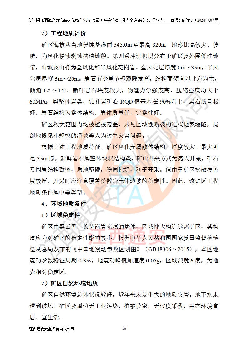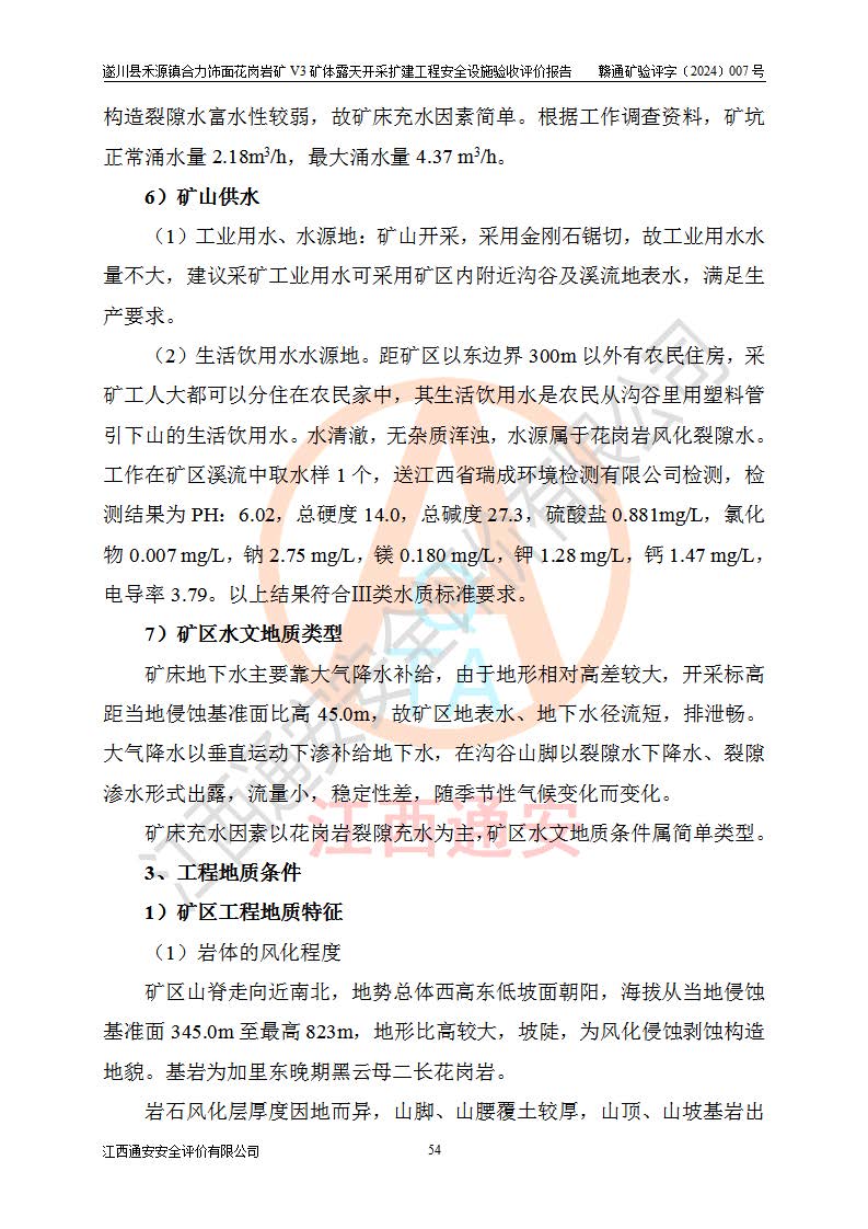 项目简介 | 遂川县禾源镇合力饰面花岗岩矿V3矿体属于遂川县禾源镇合力饰面花岗岩矿一个矿体,属普通合伙企业,执行事务合伙人:林玉生,经营范围:饰面用花岗岩矿开采,销售(凭**许可证经营)。遂川县禾源镇合力饰面花岗岩矿位于遂川县县城200°方位直距21**的禾源镇三溪自然村境内,行政区划属遂川县禾源镇管辖,矿区位置地理坐标:东经114°25′24″~114°26′05″,北纬26°08′58″~26°10′04″,矿区公司地理坐标:东经114°25′44″,北纬26°09′28″。矿区有约10km矿山公路至禾源镇**所在地,与禾源~遂川县城公路相接,距离遂川县城约21km,交通便利。 遂川县禾源镇合力饰面花岗岩矿露天开采扩建工程,2020年9月,江西省煤田地质局二二七地质队编制了《遂川县禾源镇合力矿区饰面用花岗岩矿资源储量核实报告》;2021年1月,吉安市富林矿山技术服务有限公司编制了《遂川县禾源镇合力饰面用花岗岩矿矿产资源开发利用、地质环境恢复治理与土地复垦方案》。2021年8月,湖南德立安全**科技有限公司编制了《遂川县禾源镇合力饰面花岗岩矿新建年产12万立方米饰面用花岗岩V3矿体露天开采项目安全预评价报告》;2021年10月,河南华鼎矿业设计有限公司编制了《遂川县禾源镇合力饰面花岗岩矿V3矿体年产12万立方米饰面用花岗岩矿露天开采扩建工程初步设计》和《遂川县禾源镇合力饰面花岗岩矿V3矿体年产12万立方米饰面用花岗岩矿露天开采扩建工程安全设施设计》;2021年10月27日吉安市应急管理局下发了《关于遂川县禾源镇合力饰面用花岗岩矿V3矿体露天开采扩建工程安全设施设计审查的批复》(吉市非煤项目审字〔2021〕24号)。 2021年10月27日,矿山企业取得安全设施设计审查的批复后,因矿山未征用到土地和林地,矿山于2021年11月1日向县应急管理局申请露天开采扩建工程安全设施设计基建工程停建,为此矿山一直未开工建设。矿山于2024年8月1日向县应急管理局申请露天开采扩建工程安全设施设计基建工程恢复建设;2024年9月25日取得遂川县应急管理局同意恢复矿山建设的批复后,矿山于2024年10月委托河南华鼎矿业设计有限公司编制了《遂川县禾源镇合力饰面花岗岩矿V3矿体年产12万立方米饰面用花岗岩矿露天开采扩建工程安全设施设计变更》,以下简称《安全设施设计变更》。设计变更原因:因矿山在征用林地时,+458m以上的林地征用困难过大,现业主没有办法,暂时无法对+458m以上矿体进行开采,需对原有设计进行变更。变更范围:矿区南部+458m标高以上的矿体因林地征用问题暂时无法开采,需划开,只是开采范围发生了变化,矿山相应配套截水沟位置、高位水池位置、基建平台位置、开拓运输道路长度,防护栏的位置也作了相应的变化,采场其它参数均按原设计进行。变更性质:根据矿安〔2023〕147号重大变更范围的规定:变更设计为一般变更。 2024年11月上旬,矿山将《遂川县禾源镇合力饰面花岗岩矿V3矿体年产12万立方米饰面用花岗岩矿露天开采扩建工程安全设施设计变更》报送吉安市应急管理局和遂川县应急管理局后,开始按照《安全设施设计》和《安全设施设计变更》内容进行露天开采扩建工程建设。 遂川县禾源镇合力饰面花岗岩矿V3矿体露天开采扩建工程开采工艺:山坡+凹陷露天开采,开拓运输道路→圆盘锯切→水平穿孔→劈裂→装车→汽车运输,封闭圈标高+425m,+425m以上为山坡露天开采,+425m以下凹陷露天开采。采矿方法首先是采用机械挖掘、液压锤破碎法对地表风化带进行剥离,然后对风化带之下的矿体采用圆盘锯切割开采荒料,分台阶自上而下开采,由外向山体内台阶式推进,每个分层台阶**1.4m,并段后台阶高20m进行开采作业,叉装车和汽车运输工作。 矿山基建施工过程中按照《安全设施设计》和《安全设施设计变更》基建要求建设。遂川县禾源镇合力饰面花岗岩矿V3矿体露天开采扩建工程基建从原开采+462m平台两侧往下开始剥离建设,目前V3矿体露天开采扩建工程基建按照《安全设施设计变更》已完成+445m首采平台建设,本次安全设施验收评价,V3矿体采场首采平台为+445m平台(+462m平台往下第6层完成平台平整,竣工验收位置标高约+455m)。 | ||||