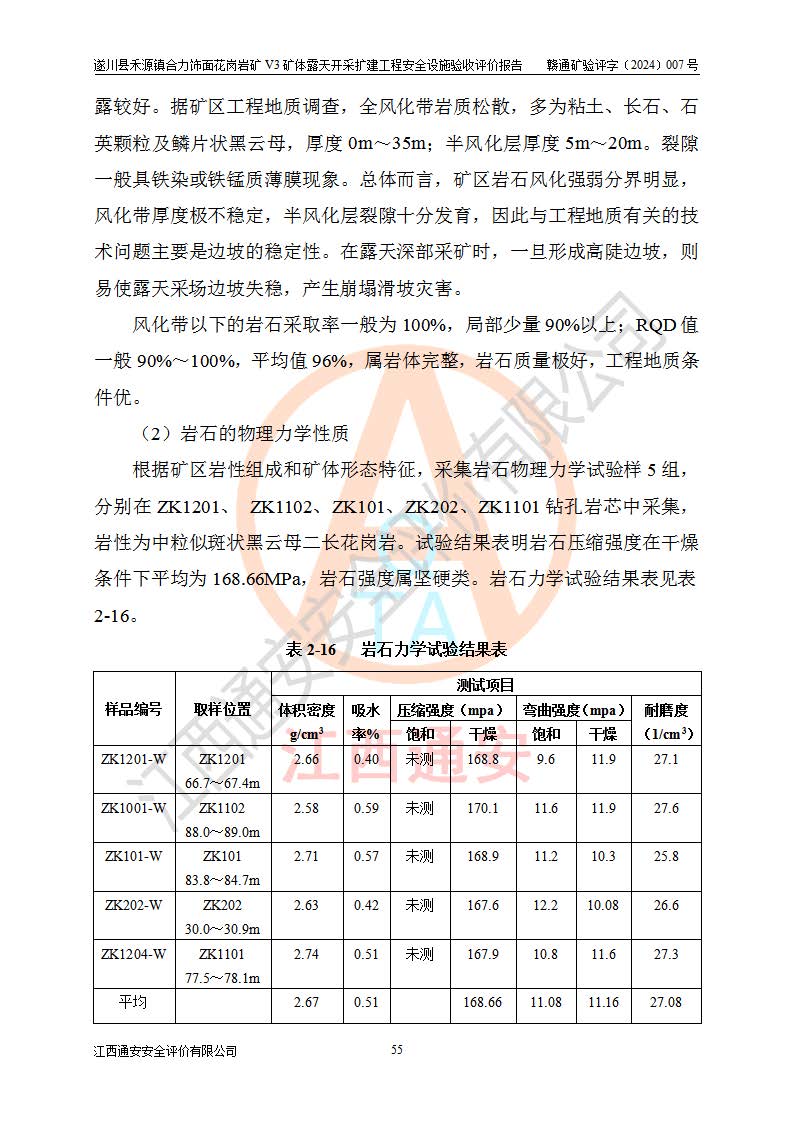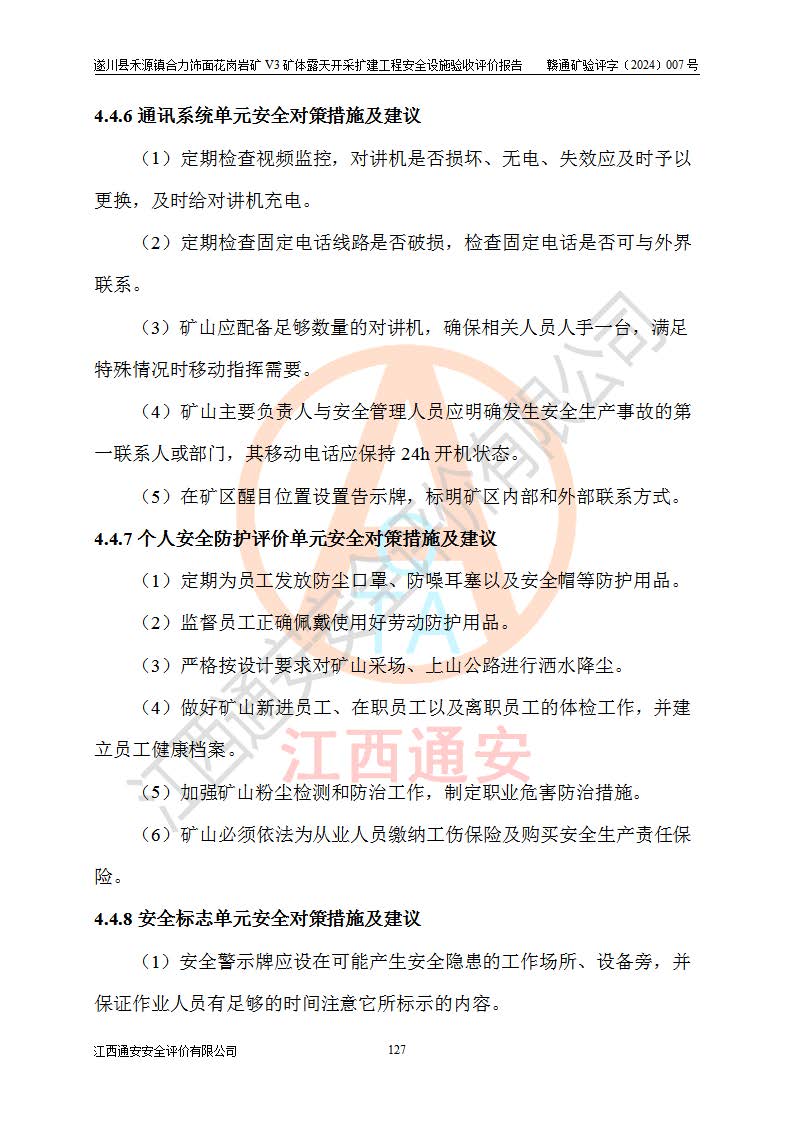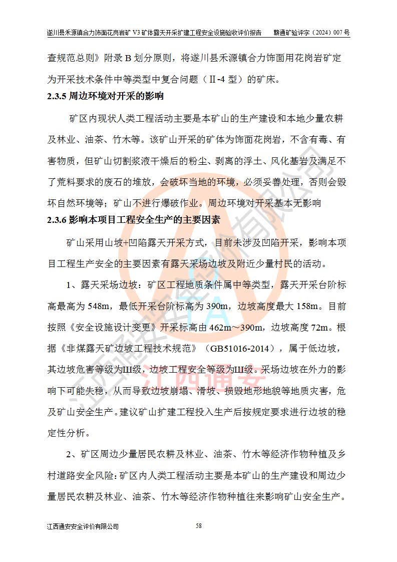 其它 | 1、该评价项目中存在的主要危险因素:火灾,坍塌(滑坡),**伤害,机械伤害,触电与雷击,物体打击,泥石流,起重伤害,高处坠落,淹溺,容器爆炸等危险有害因素。 2、该评价项目中存在的有害因素包括:粉尘、噪声与振动、不良作业环境,如高温、雷击对矿山人员的伤害和其他不利的环境因素等。 3、该评价项目为非金属露天矿山,无瓦斯和自燃发火危险,矿区范围内及周边无较大水系,矿区水文地质条件简单。该矿山只是对饰面用石料进行机械开采,不使用有毒有害危险化学品药剂。该评价项目使用的压力容器为空压机储气罐,其工作介质为空气,属**性、非易燃介质。综合上述分析,本评价项目不存在重大危险源。 上述主要危险、有害因素在采取本报告第四章第4.4节中提出的安全对策措施及建议后,能得到**控制。遂川县禾源镇合力饰面花岗岩矿V3矿体露天开采扩建工程符合《遂川县禾源镇合力饰面花岗岩矿V3矿体露天开采扩建工程安全设施设计》和《安全设施设计变更》以及**有关安全生产法律法规、规章和标准、规范要求,具备安全验收条件。 |
