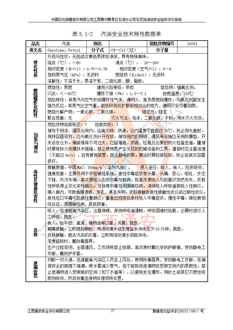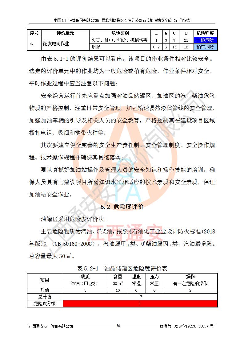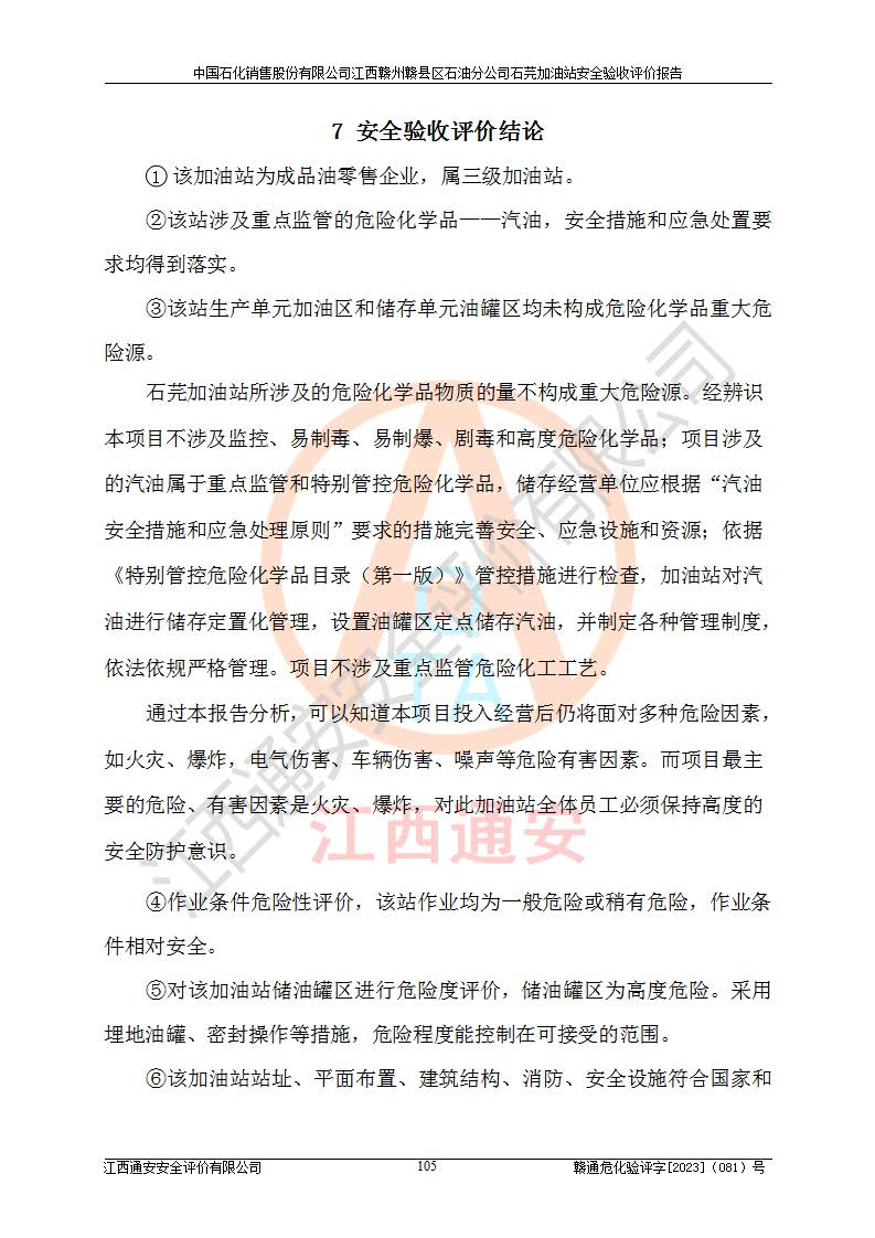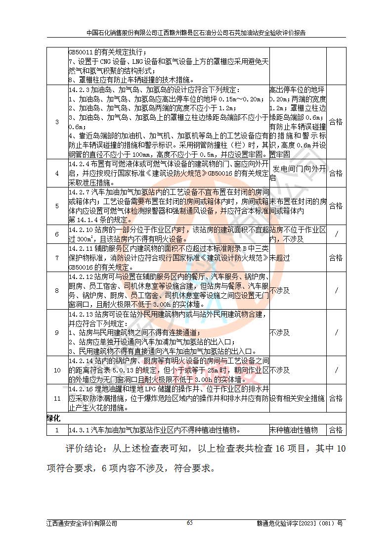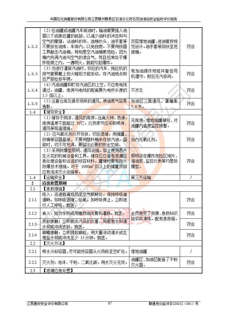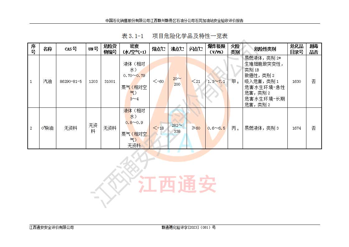 其它 | ①该加油站为成品油零售企业,属三级加油站。 ②该站涉及重点监管的危险化学品——汽油,安全措施和应急处置要求均得到落实。 ③该站生产单元加油区和储存单元油罐区均未构成危险化学品重大危险源。 石芫加油站所涉及的危险化学品物质的量不构成重大危险源。经辨识本项目不涉及监控、易制毒、易制爆、剧毒和**危险化学品;项目涉及的汽油属于重点监管和特别管控危险化学品,储存经营单位应根据“汽油安全措施和应急处理原则”要求的措施完善安全、应急设施和资源;依据《特别管控危险化学品目录(**版)》管控措施进行检查,加油站对汽油进行储存定置化管理,设置油罐区**储存汽油,并制定各种管理制度,依法依规严格管理。项目不涉及重点监管危险化工工艺。 通过本报告分析,可以知道本项目投入经营后仍将面对多种危险因素,如火灾、爆炸,电气伤害、**伤害、噪声等危险有害因素。而项目*主要的危险、有害因素是火灾、爆炸,对此加油站全体员工**保持**的安全防护意识。 ④作业条件危险性评价,该站作业均为一般危险或稍有危险,作业条件相对安全。 ⑤对该加油站储油罐区进行危险度评价,储油罐区为**危险。采用埋地油罐、密封操作等措施,危险程度能控制在可接受的范围。 ⑥该加油站站址、平面布置、建筑结构、消防、安全设施符合**和行业相关标准、规范的要求。 ⑦加油站安全现场检查经整改后符合要求。 ⑧该加油站现场情况和设计总平面布置图总体相符,安全设施运行正常**。符合**和行业相关标准、规范的要求。 ⑨该站安全生产管理制度齐全,安全管理制度及劳动保护用品管理制度执行情况良好,可以满足正常运行过程中的安全生产的需要。 综上所述:中国石化销售股份有限公司江西赣州赣县区石油分公司石芫加油站符合危险化学品经营单位的安全经营条件。 | ||||