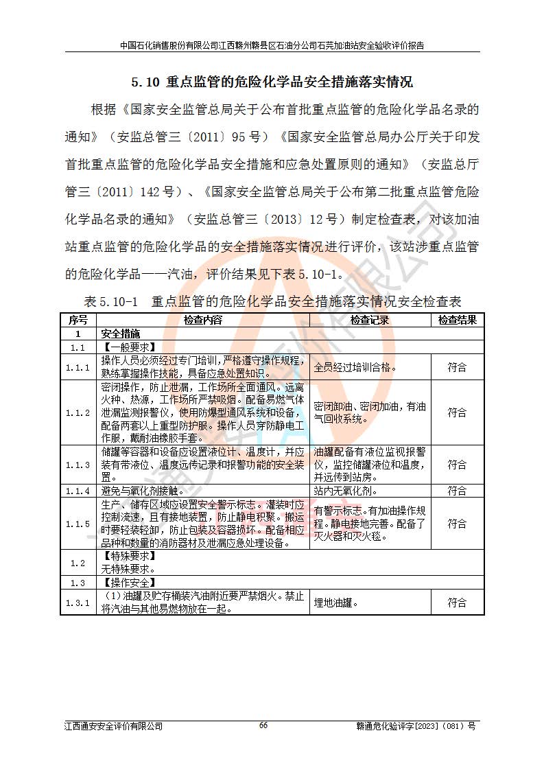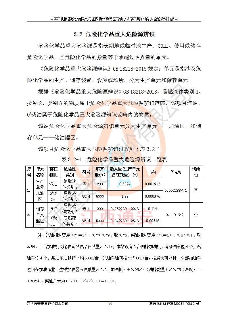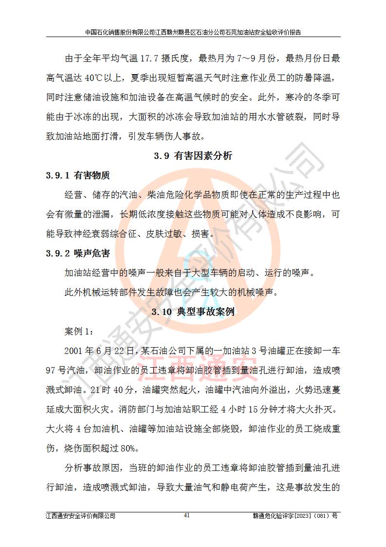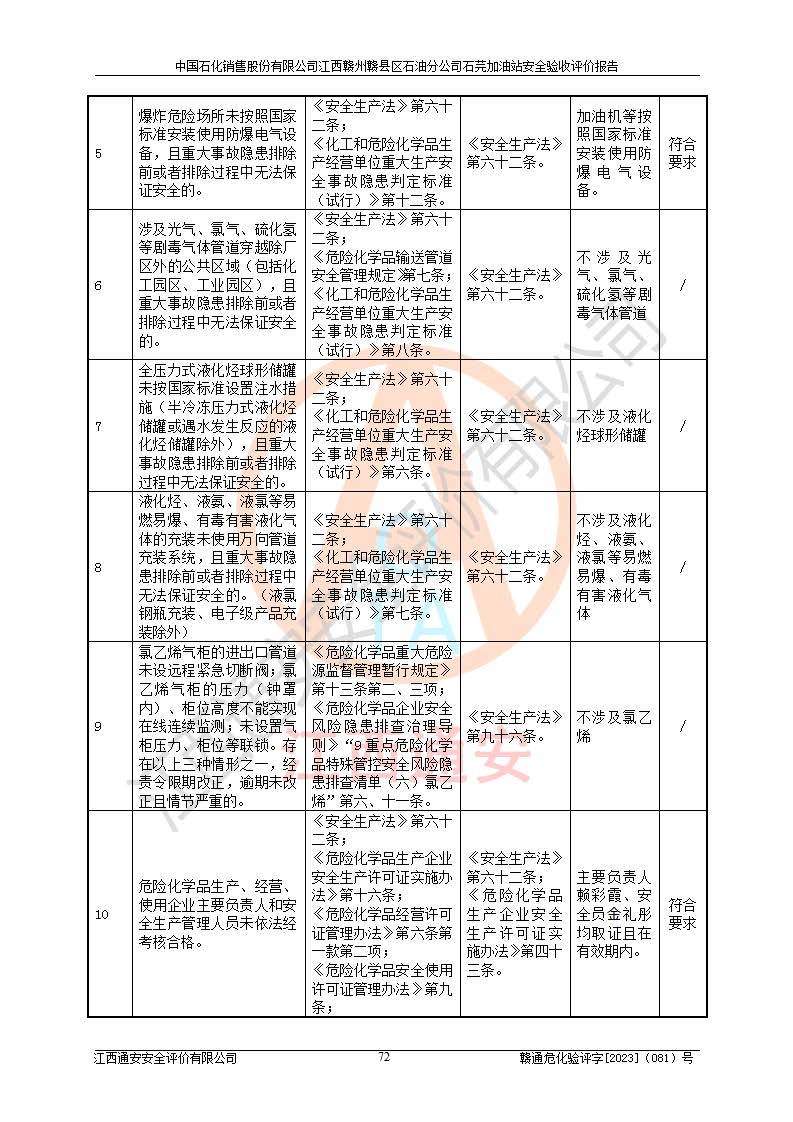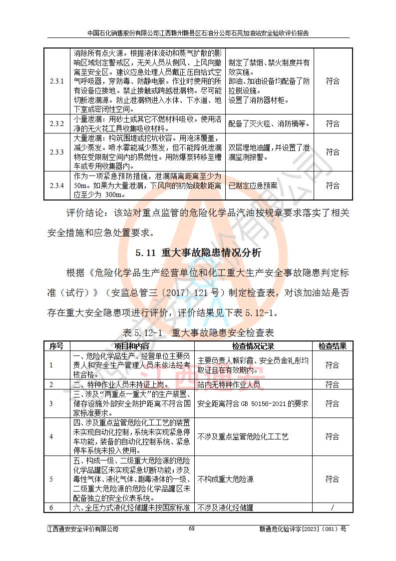 其它 | ①该加油站为成品油零售企业,属三级加油站。 ②该站涉及重点监管的危险化学品——汽油,安全措施和应急处置要求均得到落实。 ③该站生产单元加油区和储存单元油罐区均未构成危险化学品重大危险源。 石芫加油站所涉及的危险化学品物质的量不构成重大危险源。经辨识本项目不涉及监控、易制毒、易制爆、剧毒和**危险化学品;项目涉及的汽油属于重点监管和特别管控危险化学品,储存经营单位应根据“汽油安全措施和应急处理原则”要求的措施完善安全、应急设施和资源;依据《特别管控危险化学品目录(**版)》管控措施进行检查,加油站对汽油进行储存定置化管理,设置油罐区**储存汽油,并制定各种管理制度,依法依规严格管理。项目不涉及重点监管危险化工工艺。 通过本报告分析,可以知道本项目投入经营后仍将面对多种危险因素,如火灾、爆炸,电气伤害、**伤害、噪声等危险有害因素。而项目*主要的危险、有害因素是火灾、爆炸,对此加油站全体员工**保持**的安全防护意识。 ④作业条件危险性评价,该站作业均为一般危险或稍有危险,作业条件相对安全。 ⑤对该加油站储油罐区进行危险度评价,储油罐区为**危险。采用埋地油罐、密封操作等措施,危险程度能控制在可接受的范围。 ⑥该加油站站址、平面布置、建筑结构、消防、安全设施符合**和行业相关标准、规范的要求。 ⑦加油站安全现场检查经整改后符合要求。 ⑧该加油站现场情况和设计总平面布置图总体相符,安全设施运行正常**。符合**和行业相关标准、规范的要求。 ⑨该站安全生产管理制度齐全,安全管理制度及劳动保护用品管理制度执行情况良好,可以满足正常运行过程中的安全生产的需要。 综上所述:中国石化销售股份有限公司江西赣州赣县区石油分公司石芫加油站符合危险化学品经营单位的安全经营条件。 | ||||