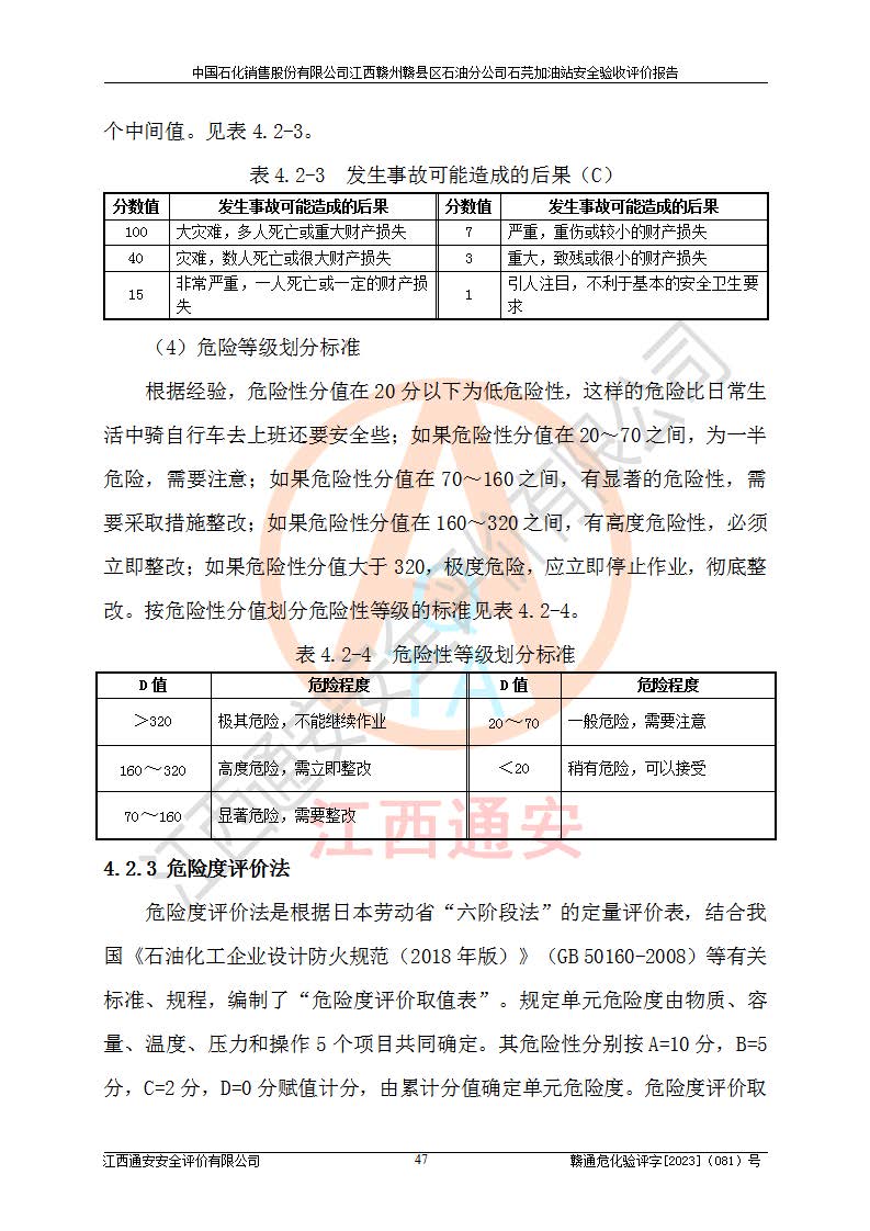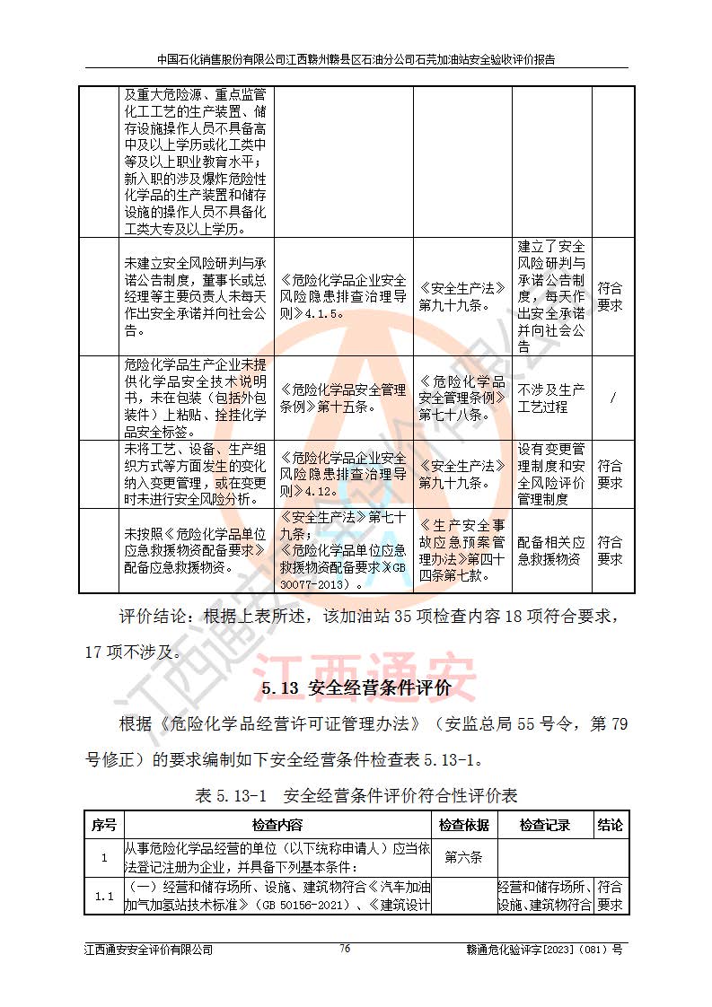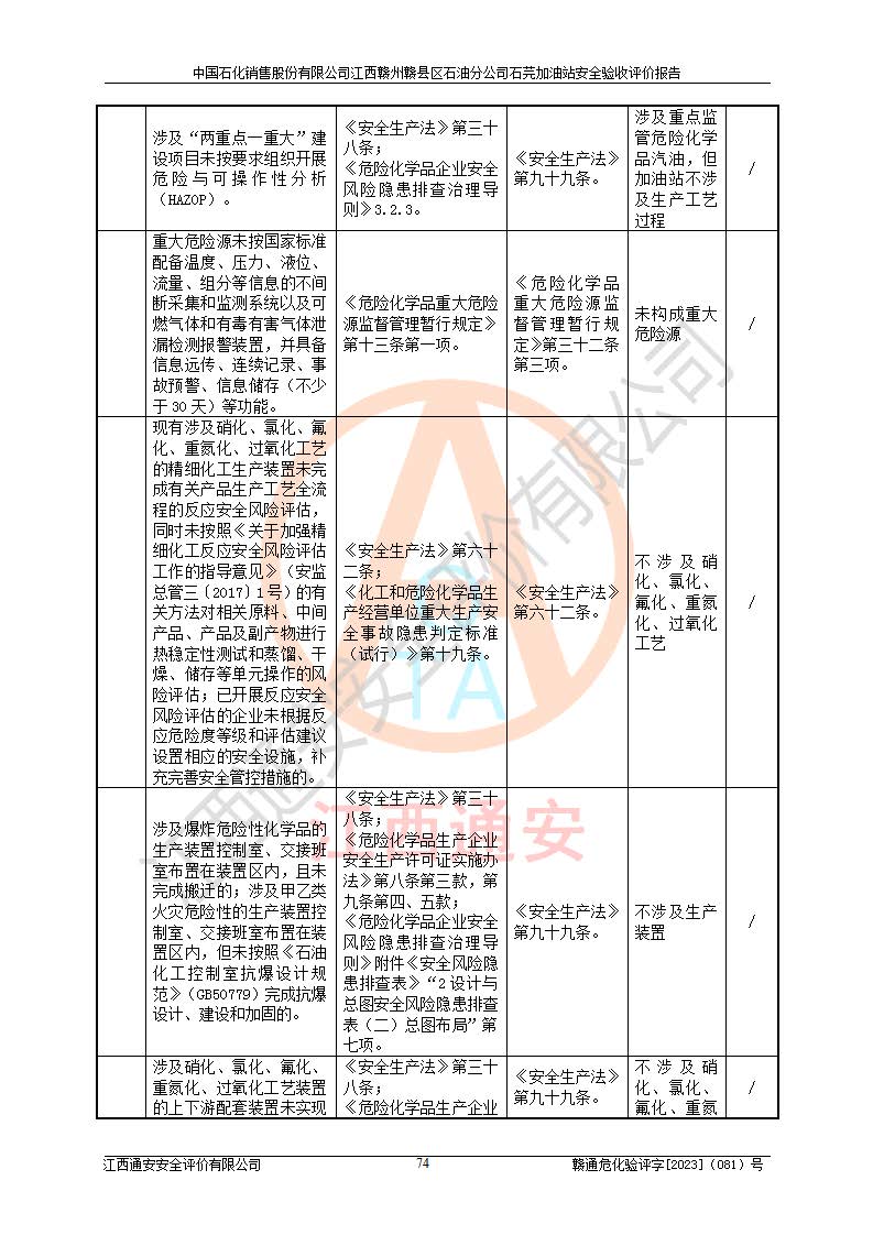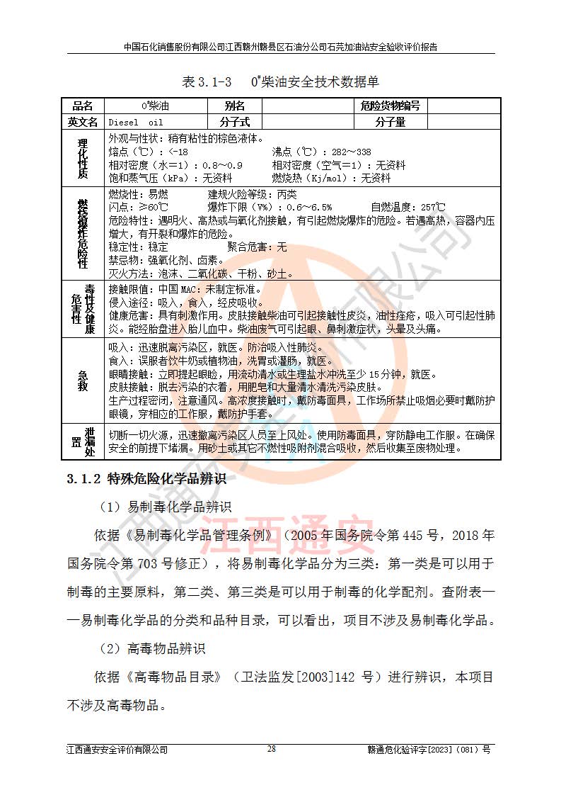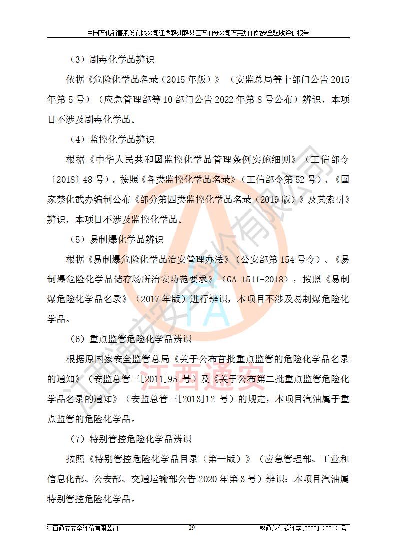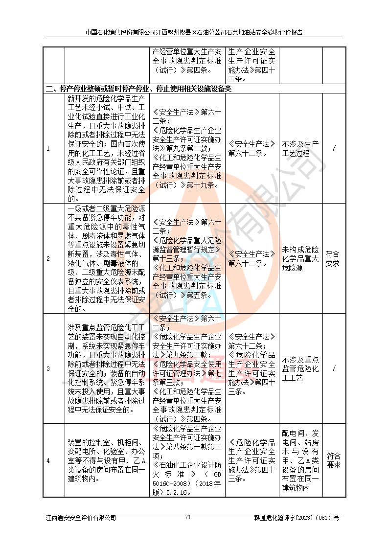 其它 | ①该加油站为成品油零售企业,属三级加油站。 ②该站涉及重点监管的危险化学品——汽油,安全措施和应急处置要求均得到落实。 ③该站生产单元加油区和储存单元油罐区均未构成危险化学品重大危险源。 石芫加油站所涉及的危险化学品物质的量不构成重大危险源。经辨识本项目不涉及监控、易制毒、易制爆、剧毒和**危险化学品;项目涉及的汽油属于重点监管和特别管控危险化学品,储存经营单位应根据“汽油安全措施和应急处理原则”要求的措施完善安全、应急设施和资源;依据《特别管控危险化学品目录(**版)》管控措施进行检查,加油站对汽油进行储存定置化管理,设置油罐区**储存汽油,并制定各种管理制度,依法依规严格管理。项目不涉及重点监管危险化工工艺。 通过本报告分析,可以知道本项目投入经营后仍将面对多种危险因素,如火灾、爆炸,电气伤害、**伤害、噪声等危险有害因素。而项目*主要的危险、有害因素是火灾、爆炸,对此加油站全体员工**保持**的安全防护意识。 ④作业条件危险性评价,该站作业均为一般危险或稍有危险,作业条件相对安全。 ⑤对该加油站储油罐区进行危险度评价,储油罐区为**危险。采用埋地油罐、密封操作等措施,危险程度能控制在可接受的范围。 ⑥该加油站站址、平面布置、建筑结构、消防、安全设施符合**和行业相关标准、规范的要求。 ⑦加油站安全现场检查经整改后符合要求。 ⑧该加油站现场情况和设计总平面布置图总体相符,安全设施运行正常**。符合**和行业相关标准、规范的要求。 ⑨该站安全生产管理制度齐全,安全管理制度及劳动保护用品管理制度执行情况良好,可以满足正常运行过程中的安全生产的需要。 综上所述:中国石化销售股份有限公司江西赣州赣县区石油分公司石芫加油站符合危险化学品经营单位的安全经营条件。 | ||||