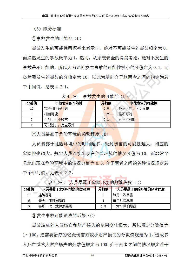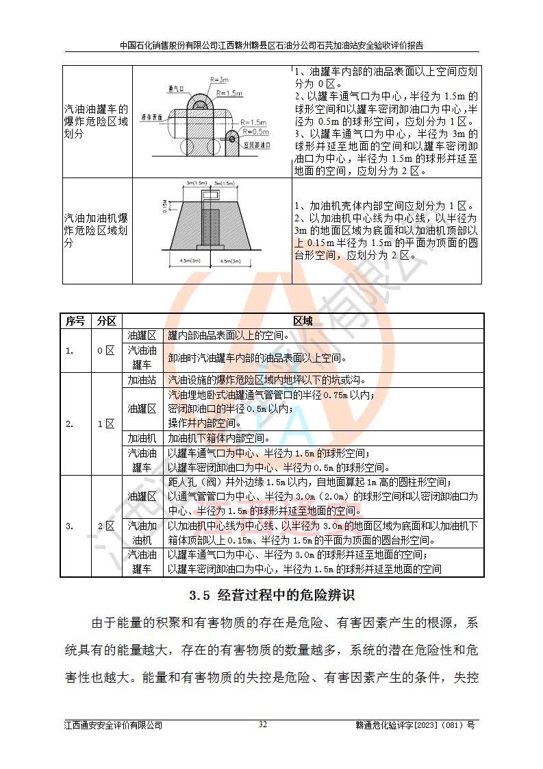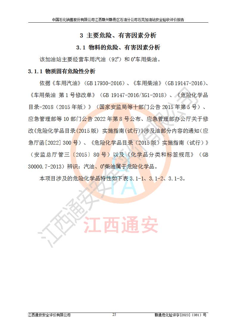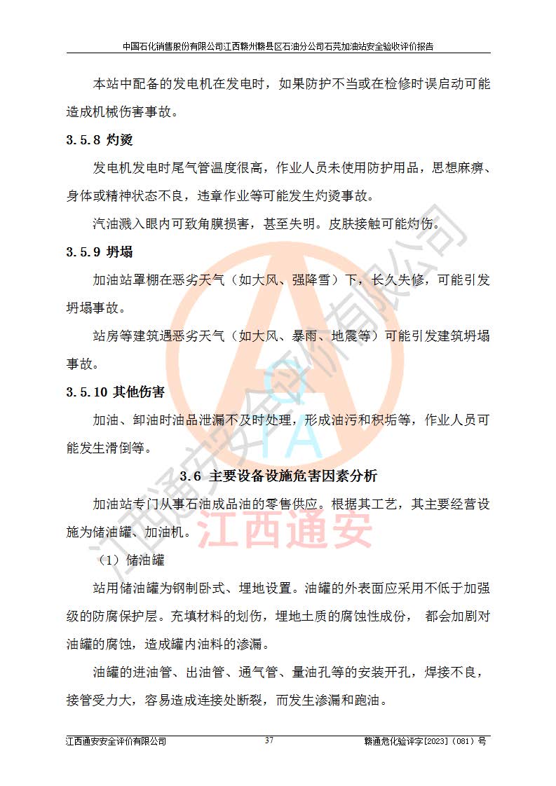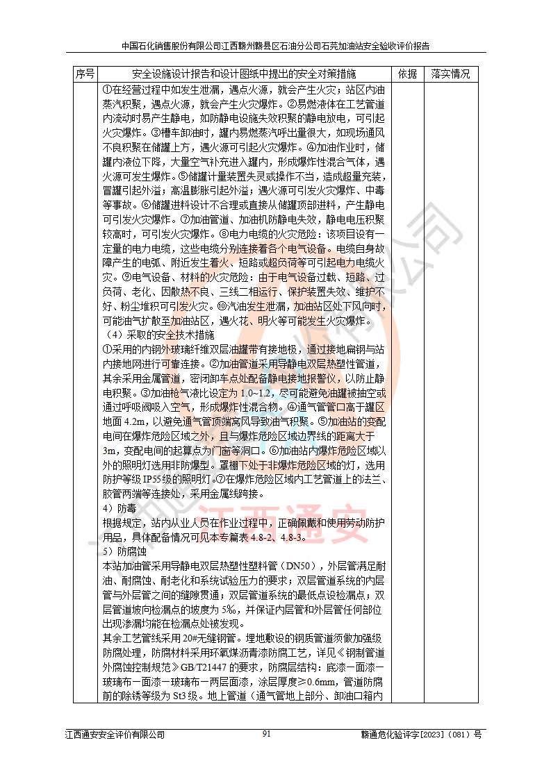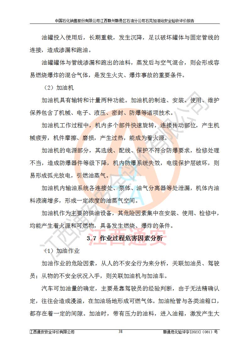 项目简介 | 中国石化销售股份有限公司江西赣州赣县区石油分公司石芫加油站,从事成品油储存经营的普通合伙公司,经营单位法人为江道勇。其站址位于江西省赣州市赣县区石莞乡沙洲坝 。站区用地为单独所有,于2014年9月登记。该加油站已运营多年,加油设施部分存在老化,为满足周边群众的用油需求、完善加油站设施设备的安全运行能力,拟在原址对加油站进行改造(除站房未改)。本站改造后油罐区内设2台油罐:0#柴油罐30㎡1台,92#汽油罐30m³1台,总容量为60m³,折算容量为45m³,油罐采用双层油罐,加油机设2台四枪加油机。本站依据《汽车加油加气加氢站技术标准》GB50156-2021表3.0.9要求属于三级加油站。 该站成立日期为2001年12月09日,统一社会信用代码91360700MA7D9TFW7X。经营范围包括成品油(汽油、柴油)零售。该站已获得江西省商务厅及赣州市行政审批局的规划布点。于2022年3月15日取得赣州市赣县区行政审批局出具的《江西省企业投资项目备案通知书》(项目统一代码为:2203-360721-04-01-888846),由河北海川能源科技股份有限公司设计。2022年4月7日已取得赣州市行政审批局出具的安全条件审查批复,2022年12月15日已取得赣州市行政审批局出具的安全设施设计审查批复。由江西力宏钢结构实业有限公司进行施工。 在经营过程中涉及的主要物料为92#95#汽油和0#柴油,按《危险化学品目录(2015版)》(安监总局等十部委公告2015年第5号)《调整〈危险化学品目录(2015版)〉》(应急管理部等十部委公告2022年第8号) 汽油、柴油属于危险化学品。 《**安全监管总局关于公布首批重点监管的危险化学品名录的通知》(安监总管三〔2011〕95号)汽油属于**重点监管的危险化学品。 根据《中华人民共和国安全生产法》、《危险化学品安全管理条例》(***第591号令)、《危险化学品经营许可证管理办法》安监总局令第55号(安监总局令第79号修正)、《危险化学品建设项目安全监督管理办法》**安全生产监督管理总局45号令(安监总局令第79号修正)、《江西省危险化学品建设项目安全监督管理实施细则(试行)》赣应急字【2021】100号文的要求,企业应对项目进行安全验收评价,以判断工程项目在劳动安全卫生方面对**及行业有关的标准和法规的符合性,并检查相关安全配套设施“三同时”的**性。 受中国石化销售股份有限公司江西赣州赣县区石油分公司石芫加油站委托,江西通安安全评价有限公司承担其三级加油站安全验收评价,组成了评价组;依据《安全评价通则》(AQ8001-2007)的要求,评价组于2023年7月10日完成了风险分析、资料收集、现场勘查和类比调查等前期准备工作,并制定了评价实施计划。评价组在资料收集、现场勘查和类比调查的基础上,根据企业提供的资料,分析了该加油站在经营过程中可能存在的主要危险、有害因素为火灾、爆炸、**伤害、触电、高处坠落、中毒与窒息、噪声、高温与辐射、有害化学物质等;在危险、有害因素分析基础上,根据加油站加油作业工艺程序、站区内功能区域特点,划分了评价单元;对划分的评价单元及单元内的危险、有害因素选择了相应的安全评价方法逐项进行分析、评价,提出相应的预防和控制对策措施。 本评价涉及的有关原始资料由委托方提供,并对其真实性负责。本报告在编写过程中,得到了加油站的大力支持与配合,以及有关行政主管部门**和有关专家的精心指导,在此深表谢意。本报告存在的不妥之处,敬请各位**和专家批评指正。 | ||||