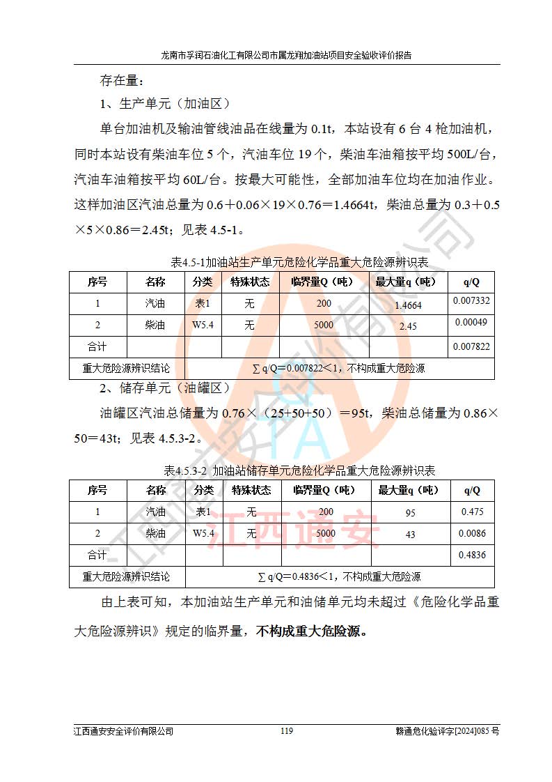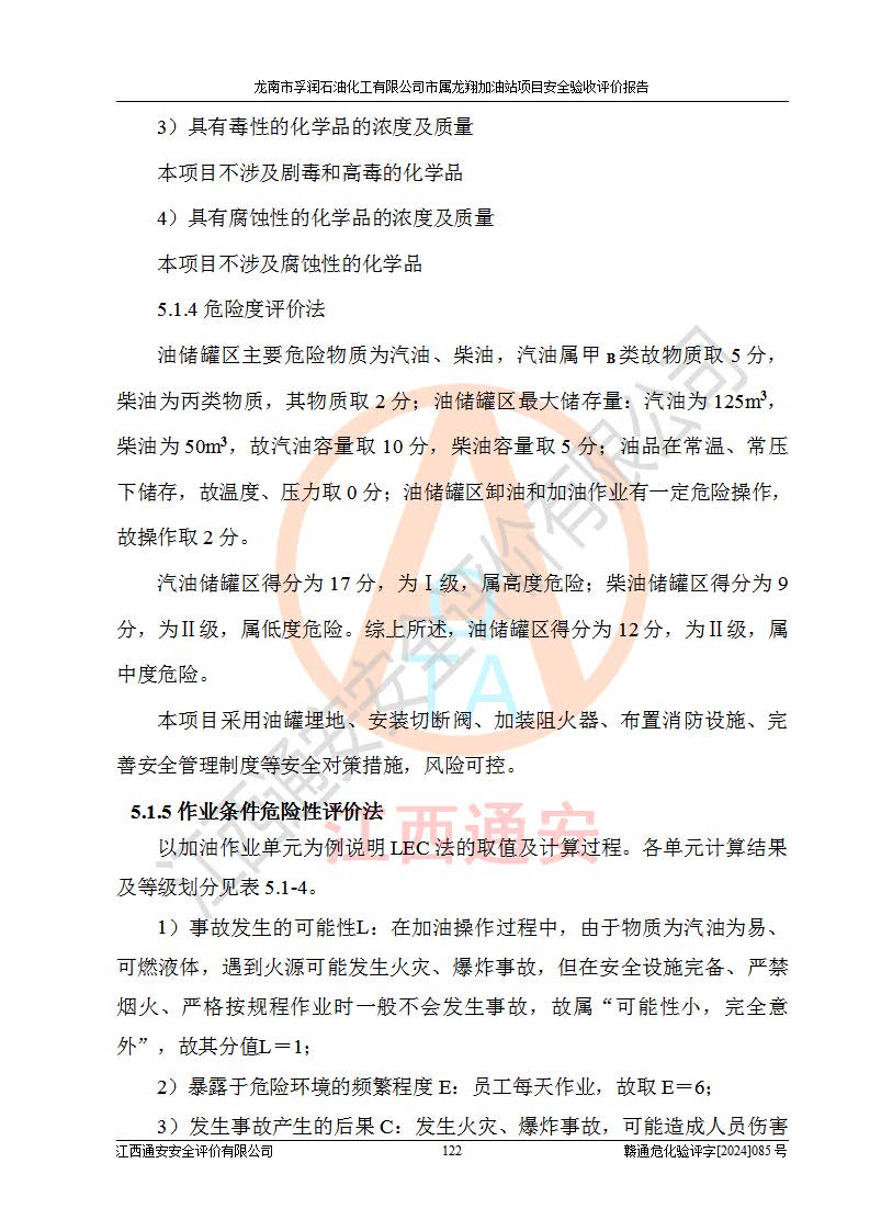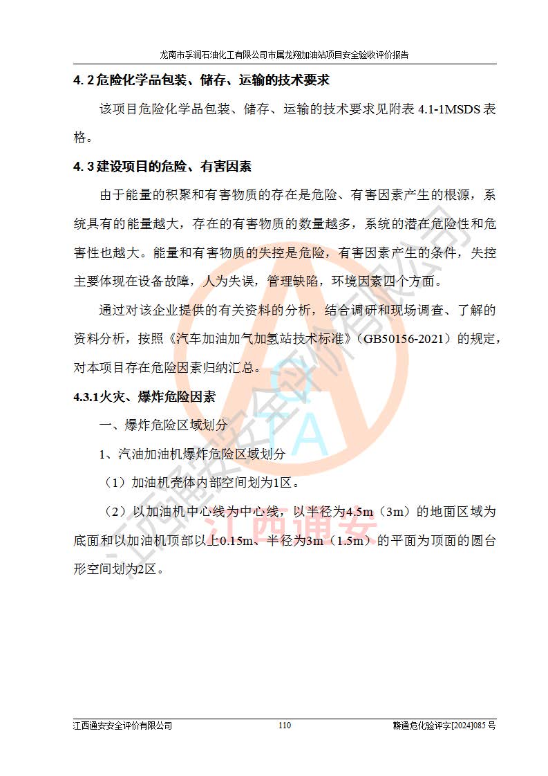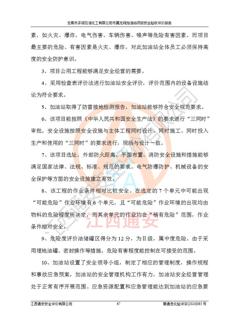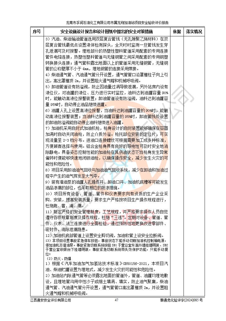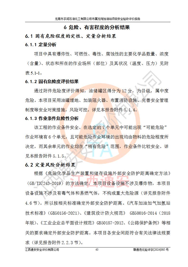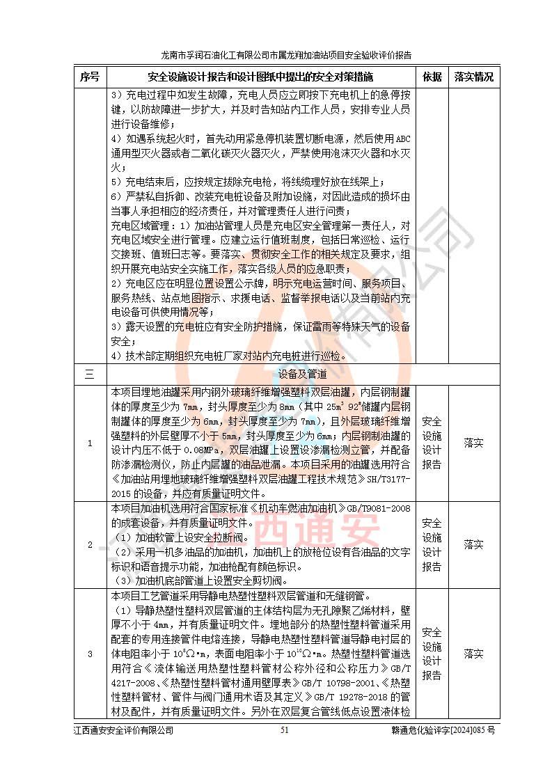 其它 | 1、龙南市孚润石油化工有限公司市属龙翔加油站为二级加油站,所涉及的危险化学品物质的量不构成重大危险源。经辨识本项目不涉及监控、易制毒、易制爆、剧毒和高毒危险化学品;项目涉及的汽油属于重点监管和特别管控危险化学品,储存经营单位应根据“汽油安全措施和应急处理原则”要求的措施完善安全、应急设施和资源;依据《特别管控危险化学品目录(**版)》管控措施进行检查,加油站对汽油进行储存定置化管理,设置油罐区**储存汽油,并制定各种管理制度,依法依规严格管理。项目不涉及重点监管危险化工工艺。 2、通过本报告分析,可以知道本项目投入经营后仍将面对多种危险因素,如火灾、爆炸,电气伤害、**伤害、噪声等危险有害因素。而项目*主要的危险、有害因素是火灾、爆炸,对此加油站全体员工**保持**的安全防护意识。 3、项目公用工程能够满足安全经营的需要。 4、采用检查表评价法进行加油站安全评价,评价范围内的设备设施结论为符合要求。 5、加油站取得了防雷接地检测报告,加油站能够符合安全规范要求。 6、该项目能按照《中华人民共和国安全生产法》的要求进行“三同时”审批,安全设施按照安全设施与主体工程同时设计、同时施工、同时投入生产和使用的“三同时”的要求进行,现场与设计一致。 7、该项目选址、外部防火距离、平面布置、消防安全设施和措施能够满足**法律、法规、标准、规范的要求。电气防爆防护、机械设备的安全保护等方面的安全设施建立**。 8、该工程的作业条件相对比较安全。在选定的7个单元中可能出现“可能危险”作业环境有6个单元,且“可能危险”作业环境的出现均由物料的危险程度所决定,而其余单元的作业均在“稍有危险”范围,作业条件相对安全。 9、危险度评价油储罐区得分为12分,为Ⅱ级,属中度危险。由于采用埋地油罐、密封操作等措施,危险有害程度能控制在可接受的范围。 10、加油站设置了安全**小组,制定了相应的管理制度,操作规程和事故应急预案,加油站的安全管理机构工作有力,加油站安全经营管理处于正常有序开展范围。应急资源配置和应急管理能达到加油站的应急要求。 综上所述,龙南市孚润石油化工有限公司市属龙翔加油站项目严格执行**有关安全生产法律、法规和有关标准、规范,认真落实并合理采纳安全条件评价报告及安全设施设计设计中的安全对策、措施及建议,做到安全设施与主体工程同时设计、同时施工、同时投入生产和使用的“三同时”,对潜在的危险、有害因素采取了安全对策措施,工程潜在的危险、有害因素可得到**控制,风险在**控制和可接受范围内。现场与设计一致。 该项目安全设施设计设计的安全设施得到落实符合**安全生产方面的法律、法规、标准、规范的要求,具备安全验收条件,符合安全生产条件。 | ||||