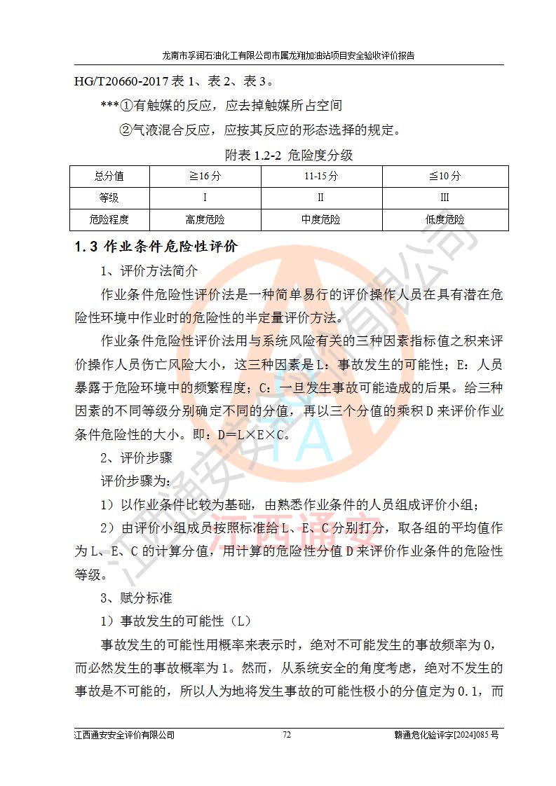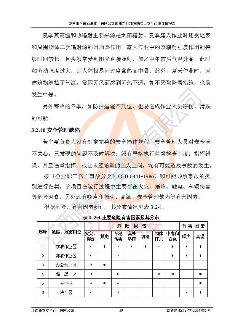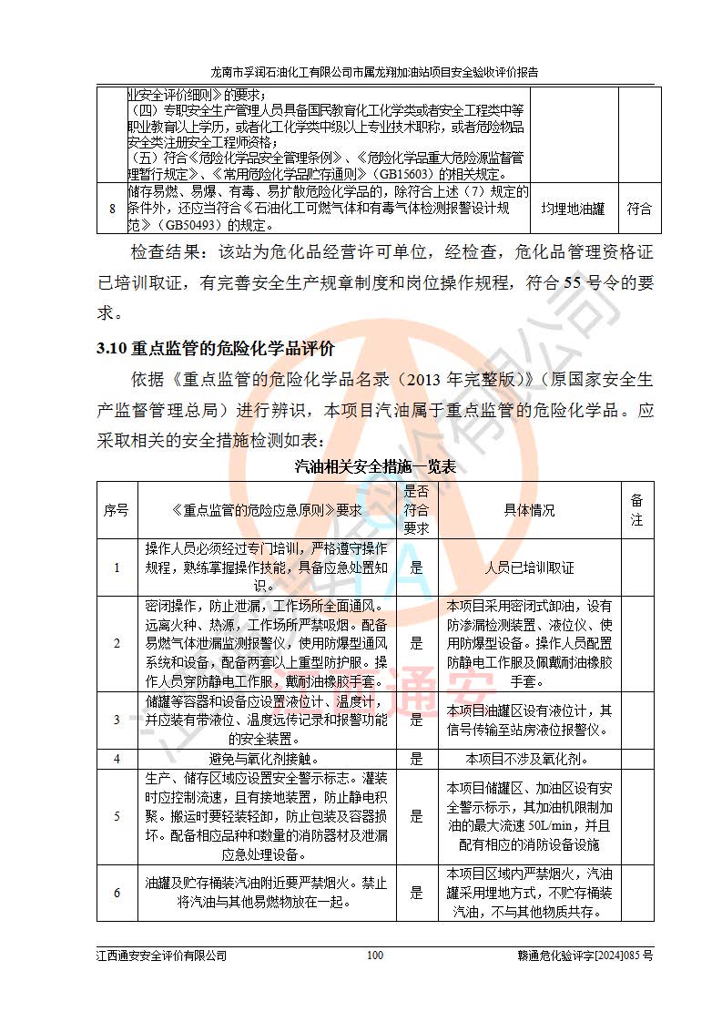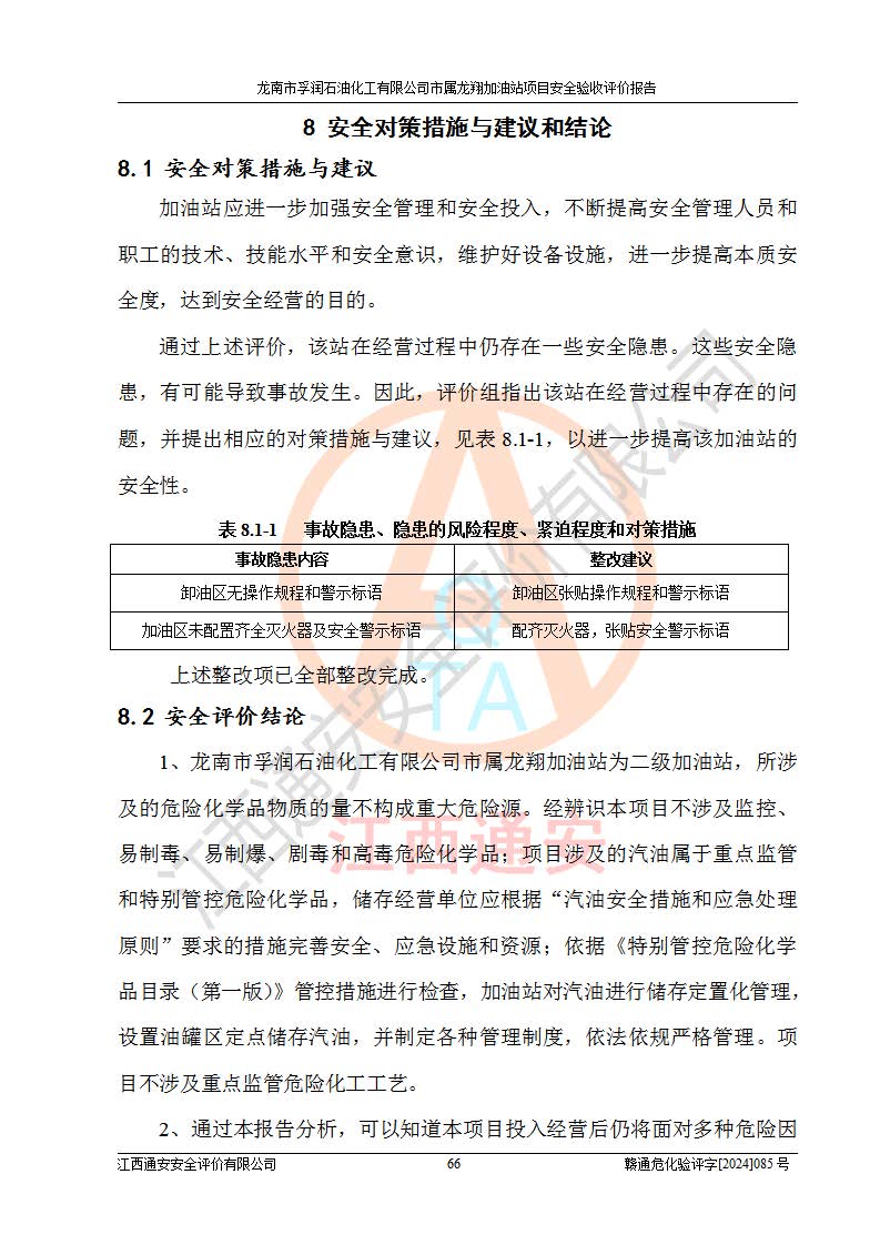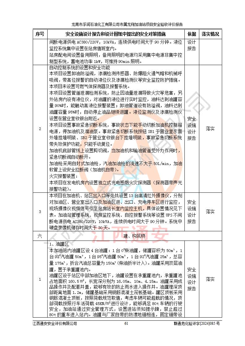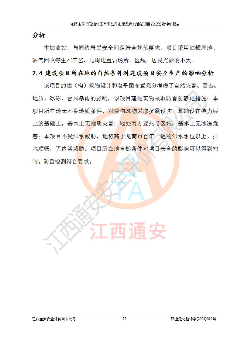 其它 | 1、龙南市孚润石油化工有限公司市属龙翔加油站为二级加油站,所涉及的危险化学品物质的量不构成重大危险源。经辨识本项目不涉及监控、易制毒、易制爆、剧毒和高毒危险化学品;项目涉及的汽油属于重点监管和特别管控危险化学品,储存经营单位应根据“汽油安全措施和应急处理原则”要求的措施完善安全、应急设施和资源;依据《特别管控危险化学品目录(**版)》管控措施进行检查,加油站对汽油进行储存定置化管理,设置油罐区**储存汽油,并制定各种管理制度,依法依规严格管理。项目不涉及重点监管危险化工工艺。 2、通过本报告分析,可以知道本项目投入经营后仍将面对多种危险因素,如火灾、爆炸,电气伤害、**伤害、噪声等危险有害因素。而项目*主要的危险、有害因素是火灾、爆炸,对此加油站全体员工**保持**的安全防护意识。 3、项目公用工程能够满足安全经营的需要。 4、采用检查表评价法进行加油站安全评价,评价范围内的设备设施结论为符合要求。 5、加油站取得了防雷接地检测报告,加油站能够符合安全规范要求。 6、该项目能按照《中华人民共和国安全生产法》的要求进行“三同时”审批,安全设施按照安全设施与主体工程同时设计、同时施工、同时投入生产和使用的“三同时”的要求进行,现场与设计一致。 7、该项目选址、外部防火距离、平面布置、消防安全设施和措施能够满足**法律、法规、标准、规范的要求。电气防爆防护、机械设备的安全保护等方面的安全设施建立**。 8、该工程的作业条件相对比较安全。在选定的7个单元中可能出现“可能危险”作业环境有6个单元,且“可能危险”作业环境的出现均由物料的危险程度所决定,而其余单元的作业均在“稍有危险”范围,作业条件相对安全。 9、危险度评价油储罐区得分为12分,为Ⅱ级,属中度危险。由于采用埋地油罐、密封操作等措施,危险有害程度能控制在可接受的范围。 10、加油站设置了安全**小组,制定了相应的管理制度,操作规程和事故应急预案,加油站的安全管理机构工作有力,加油站安全经营管理处于正常有序开展范围。应急资源配置和应急管理能达到加油站的应急要求。 综上所述,龙南市孚润石油化工有限公司市属龙翔加油站项目严格执行**有关安全生产法律、法规和有关标准、规范,认真落实并合理采纳安全条件评价报告及安全设施设计设计中的安全对策、措施及建议,做到安全设施与主体工程同时设计、同时施工、同时投入生产和使用的“三同时”,对潜在的危险、有害因素采取了安全对策措施,工程潜在的危险、有害因素可得到**控制,风险在**控制和可接受范围内。现场与设计一致。 该项目安全设施设计设计的安全设施得到落实符合**安全生产方面的法律、法规、标准、规范的要求,具备安全验收条件,符合安全生产条件。 | ||||