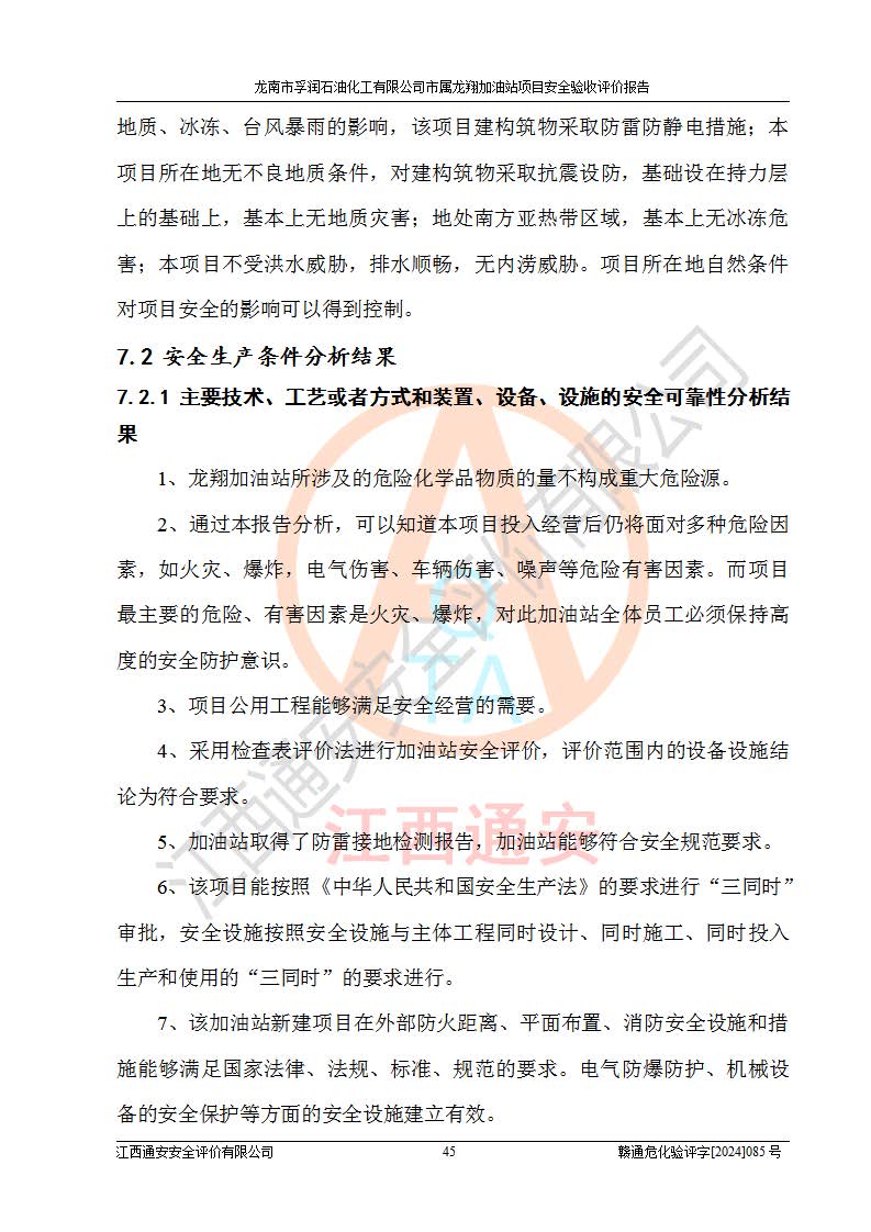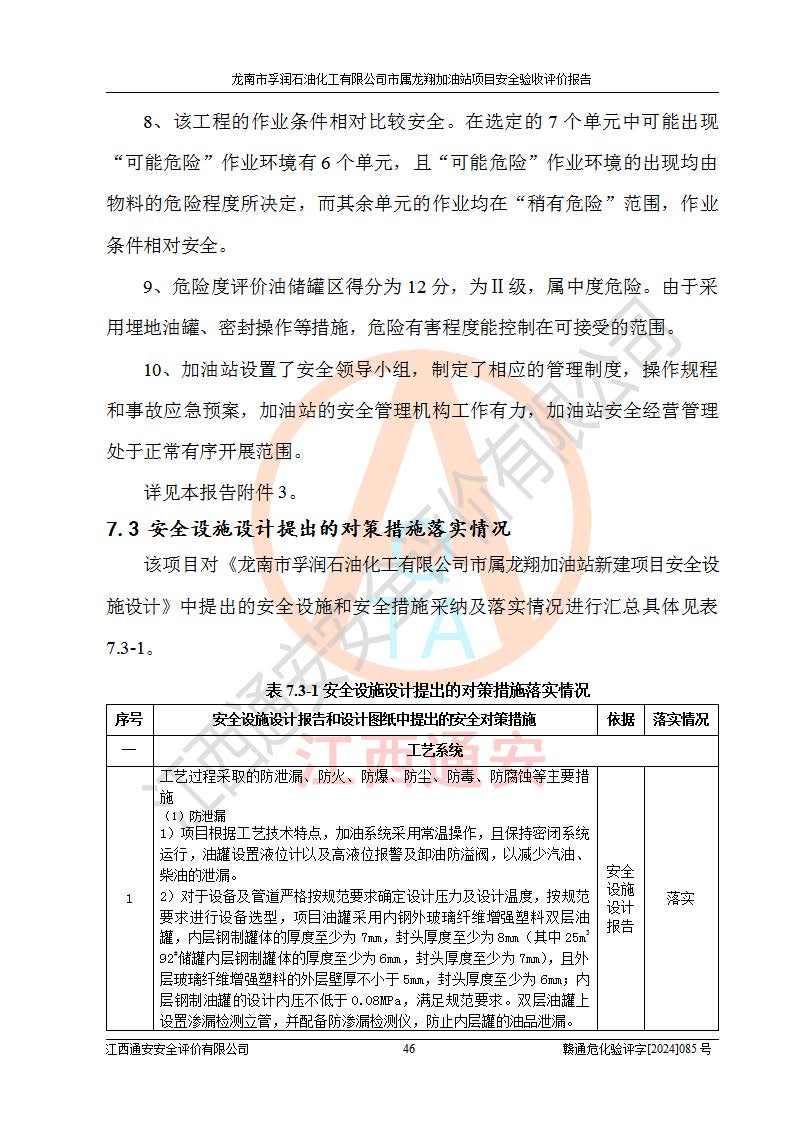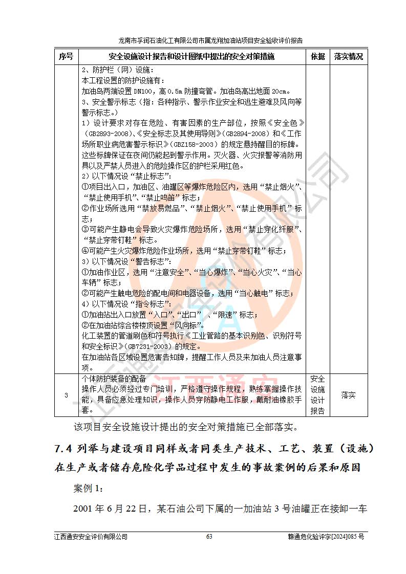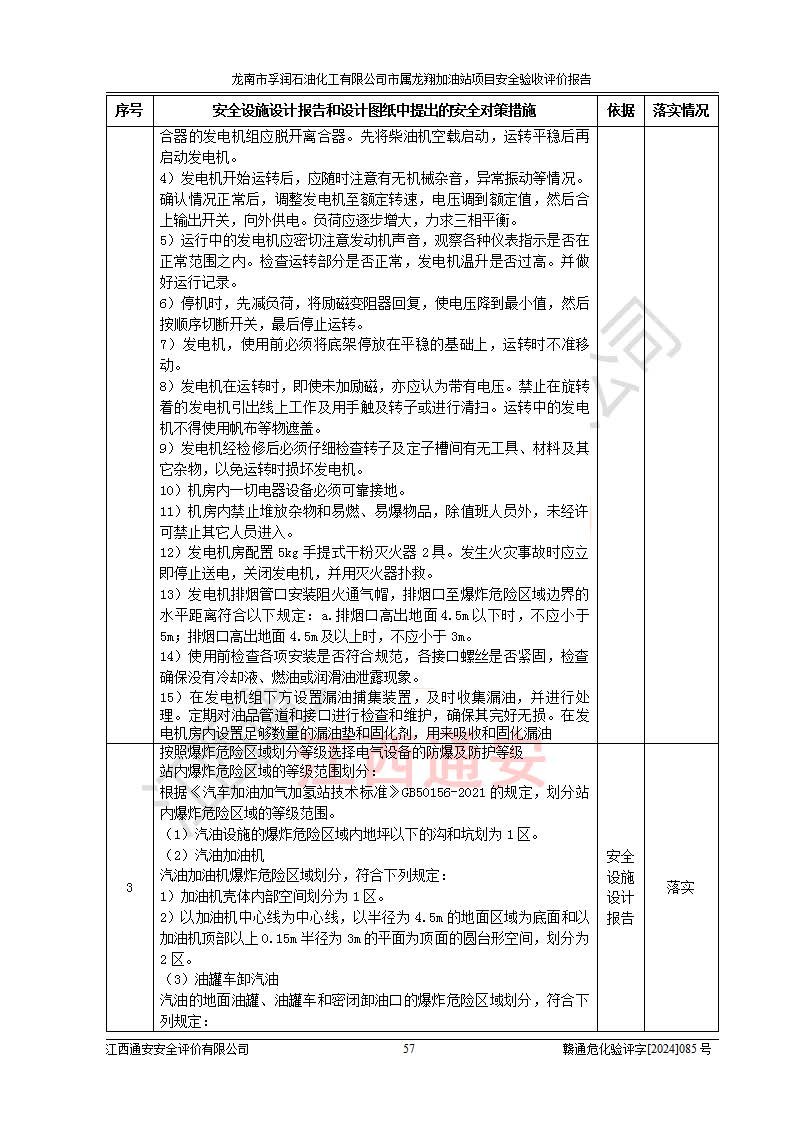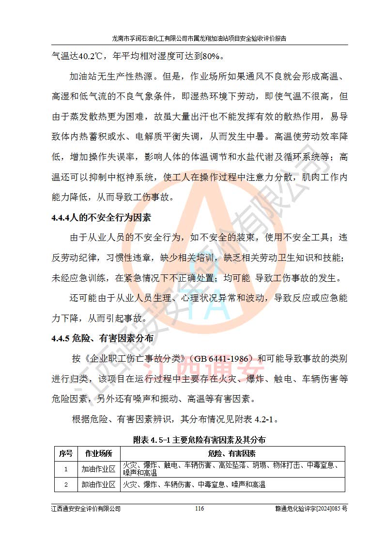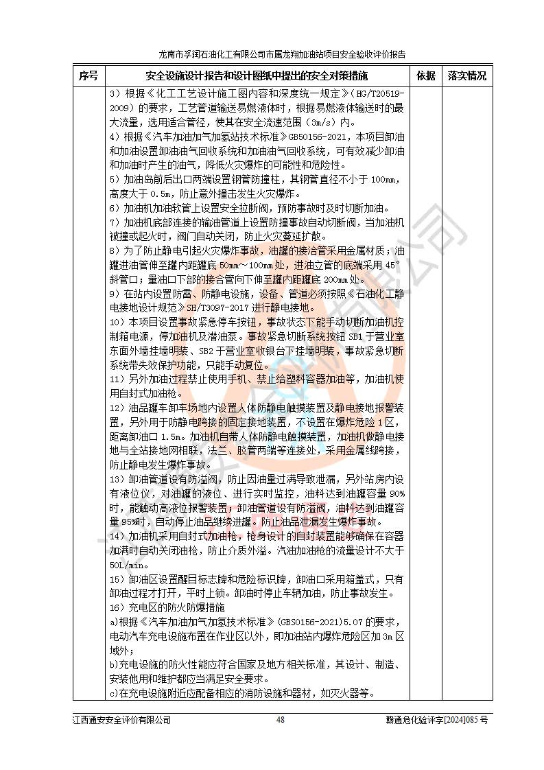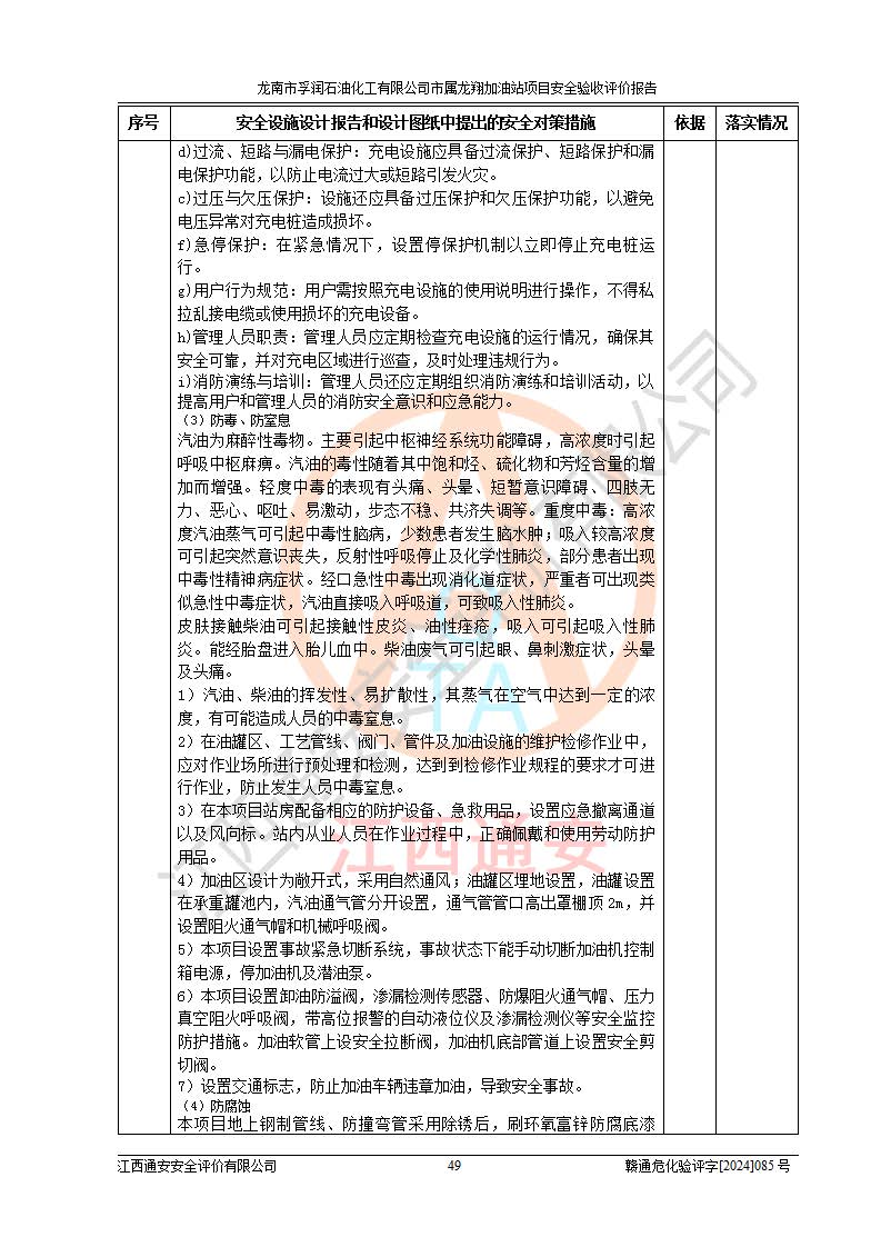 其它 | 1、龙南市孚润石油化工有限公司市属龙翔加油站为二级加油站,所涉及的危险化学品物质的量不构成重大危险源。经辨识本项目不涉及监控、易制毒、易制爆、剧毒和高毒危险化学品;项目涉及的汽油属于重点监管和特别管控危险化学品,储存经营单位应根据“汽油安全措施和应急处理原则”要求的措施完善安全、应急设施和资源;依据《特别管控危险化学品目录(**版)》管控措施进行检查,加油站对汽油进行储存定置化管理,设置油罐区**储存汽油,并制定各种管理制度,依法依规严格管理。项目不涉及重点监管危险化工工艺。 2、通过本报告分析,可以知道本项目投入经营后仍将面对多种危险因素,如火灾、爆炸,电气伤害、**伤害、噪声等危险有害因素。而项目*主要的危险、有害因素是火灾、爆炸,对此加油站全体员工**保持**的安全防护意识。 3、项目公用工程能够满足安全经营的需要。 4、采用检查表评价法进行加油站安全评价,评价范围内的设备设施结论为符合要求。 5、加油站取得了防雷接地检测报告,加油站能够符合安全规范要求。 6、该项目能按照《中华人民共和国安全生产法》的要求进行“三同时”审批,安全设施按照安全设施与主体工程同时设计、同时施工、同时投入生产和使用的“三同时”的要求进行,现场与设计一致。 7、该项目选址、外部防火距离、平面布置、消防安全设施和措施能够满足**法律、法规、标准、规范的要求。电气防爆防护、机械设备的安全保护等方面的安全设施建立**。 8、该工程的作业条件相对比较安全。在选定的7个单元中可能出现“可能危险”作业环境有6个单元,且“可能危险”作业环境的出现均由物料的危险程度所决定,而其余单元的作业均在“稍有危险”范围,作业条件相对安全。 9、危险度评价油储罐区得分为12分,为Ⅱ级,属中度危险。由于采用埋地油罐、密封操作等措施,危险有害程度能控制在可接受的范围。 10、加油站设置了安全**小组,制定了相应的管理制度,操作规程和事故应急预案,加油站的安全管理机构工作有力,加油站安全经营管理处于正常有序开展范围。应急资源配置和应急管理能达到加油站的应急要求。 综上所述,龙南市孚润石油化工有限公司市属龙翔加油站项目严格执行**有关安全生产法律、法规和有关标准、规范,认真落实并合理采纳安全条件评价报告及安全设施设计设计中的安全对策、措施及建议,做到安全设施与主体工程同时设计、同时施工、同时投入生产和使用的“三同时”,对潜在的危险、有害因素采取了安全对策措施,工程潜在的危险、有害因素可得到**控制,风险在**控制和可接受范围内。现场与设计一致。 该项目安全设施设计设计的安全设施得到落实符合**安全生产方面的法律、法规、标准、规范的要求,具备安全验收条件,符合安全生产条件。 | ||||
