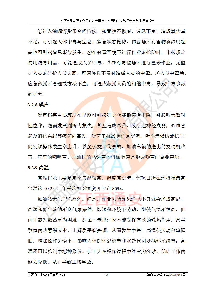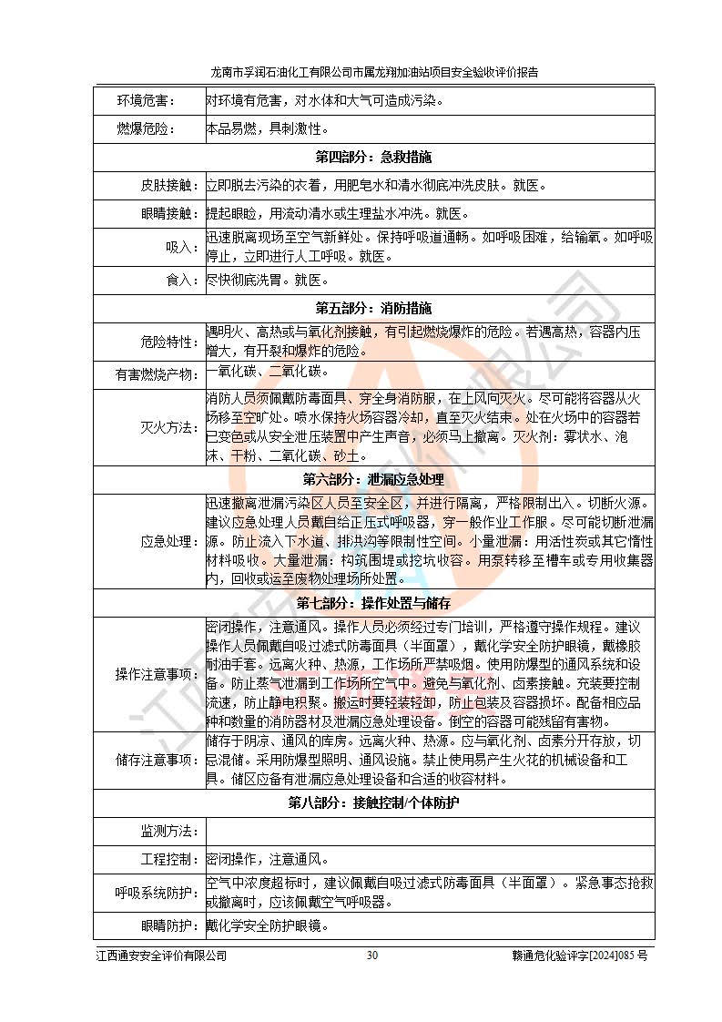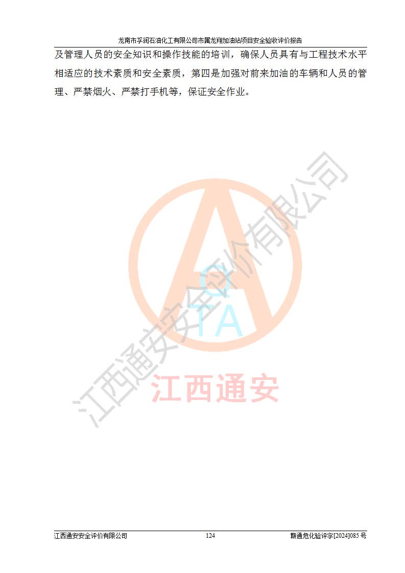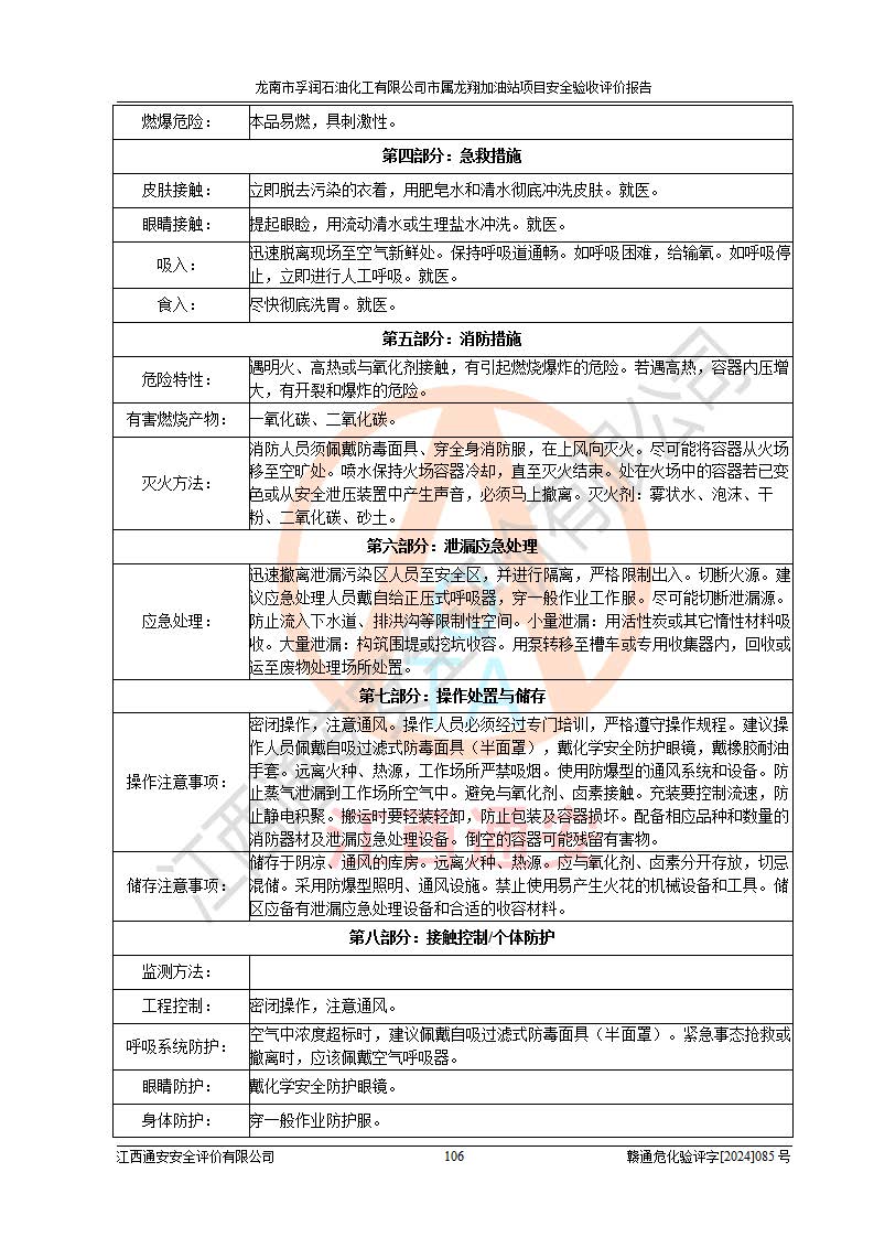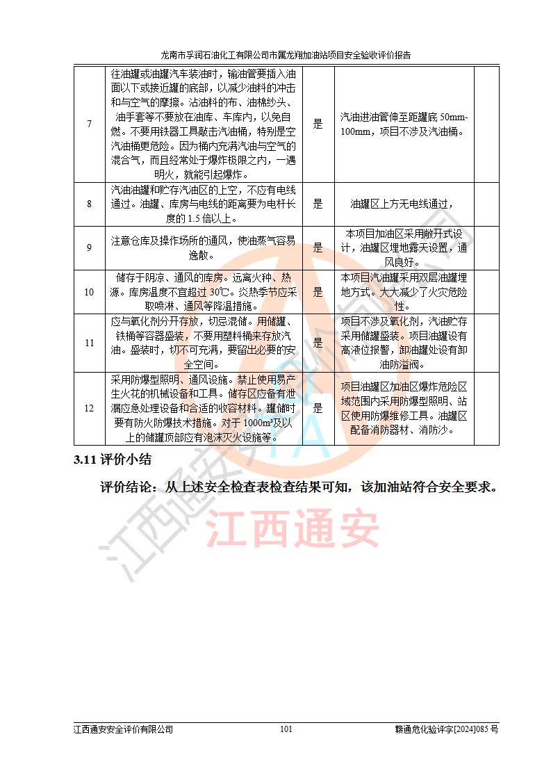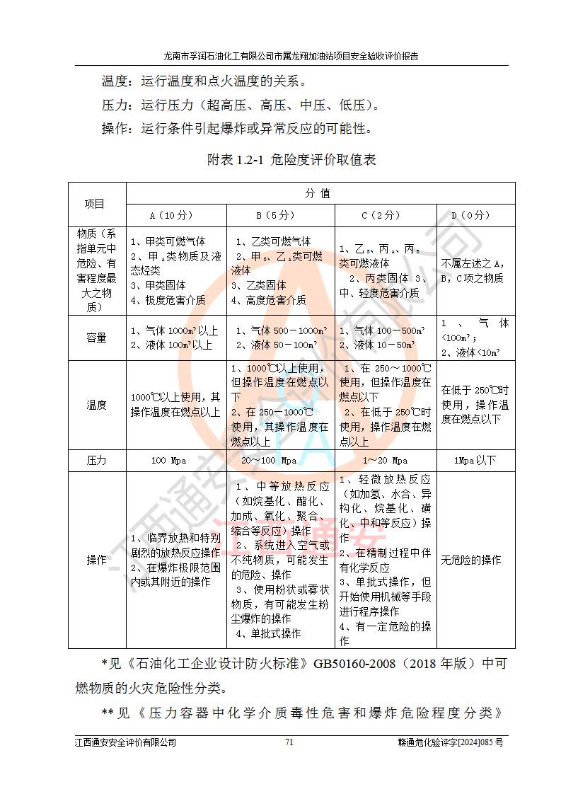其它 | 1、龙南市孚润石油化工有限公司市属龙翔加油站为二级加油站,所涉及的危险化学品物质的量不构成重大危险源。经辨识本项目不涉及监控、易制毒、易制爆、剧毒和高毒危险化学品;项目涉及的汽油属于重点监管和特别管控危险化学品,储存经营单位应根据“汽油安全措施和应急处理原则”要求的措施完善安全、应急设施和资源;依据《特别管控危险化学品目录(**版)》管控措施进行检查,加油站对汽油进行储存定置化管理,设置油罐区**储存汽油,并制定各种管理制度,依法依规严格管理。项目不涉及重点监管危险化工工艺。 2、通过本报告分析,可以知道本项目投入经营后仍将面对多种危险因素,如火灾、爆炸,电气伤害、**伤害、噪声等危险有害因素。而项目*主要的危险、有害因素是火灾、爆炸,对此加油站全体员工**保持**的安全防护意识。 3、项目公用工程能够满足安全经营的需要。 4、采用检查表评价法进行加油站安全评价,评价范围内的设备设施结论为符合要求。 5、加油站取得了防雷接地检测报告,加油站能够符合安全规范要求。 6、该项目能按照《中华人民共和国安全生产法》的要求进行“三同时”审批,安全设施按照安全设施与主体工程同时设计、同时施工、同时投入生产和使用的“三同时”的要求进行,现场与设计一致。 7、该项目选址、外部防火距离、平面布置、消防安全设施和措施能够满足**法律、法规、标准、规范的要求。电气防爆防护、机械设备的安全保护等方面的安全设施建立**。 8、该工程的作业条件相对比较安全。在选定的7个单元中可能出现“可能危险”作业环境有6个单元,且“可能危险”作业环境的出现均由物料的危险程度所决定,而其余单元的作业均在“稍有危险”范围,作业条件相对安全。 9、危险度评价油储罐区得分为12分,为Ⅱ级,属中度危险。由于采用埋地油罐、密封操作等措施,危险有害程度能控制在可接受的范围。 10、加油站设置了安全**小组,制定了相应的管理制度,操作规程和事故应急预案,加油站的安全管理机构工作有力,加油站安全经营管理处于正常有序开展范围。应急资源配置和应急管理能达到加油站的应急要求。 综上所述,龙南市孚润石油化工有限公司市属龙翔加油站项目严格执行**有关安全生产法律、法规和有关标准、规范,认真落实并合理采纳安全条件评价报告及安全设施设计设计中的安全对策、措施及建议,做到安全设施与主体工程同时设计、同时施工、同时投入生产和使用的“三同时”,对潜在的危险、有害因素采取了安全对策措施,工程潜在的危险、有害因素可得到**控制,风险在**控制和可接受范围内。现场与设计一致。 该项目安全设施设计设计的安全设施得到落实符合**安全生产方面的法律、法规、标准、规范的要求,具备安全验收条件,符合安全生产条件。 | ||||