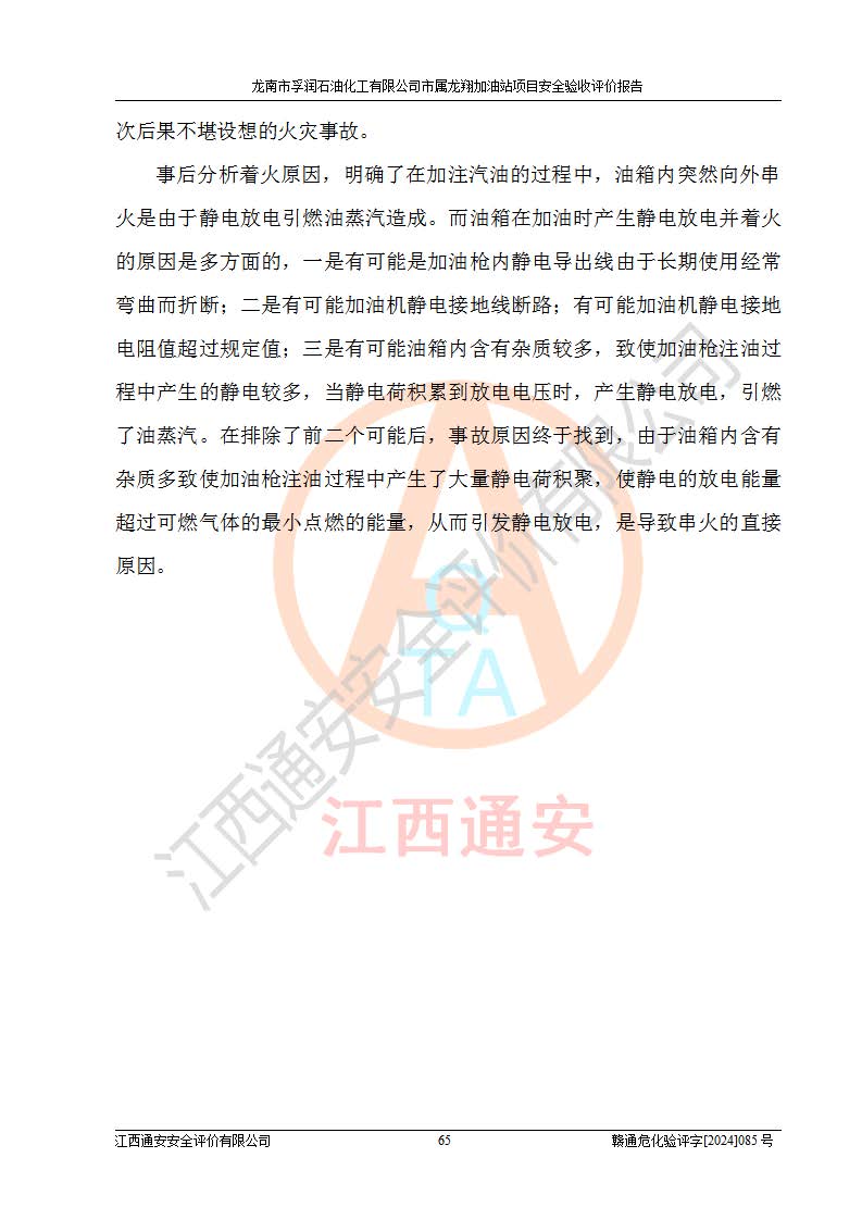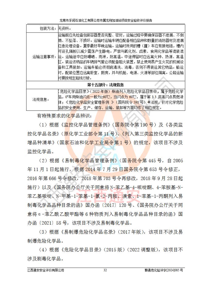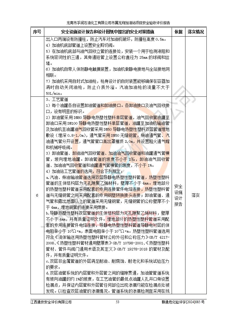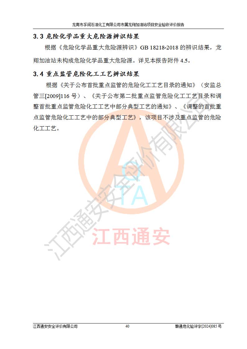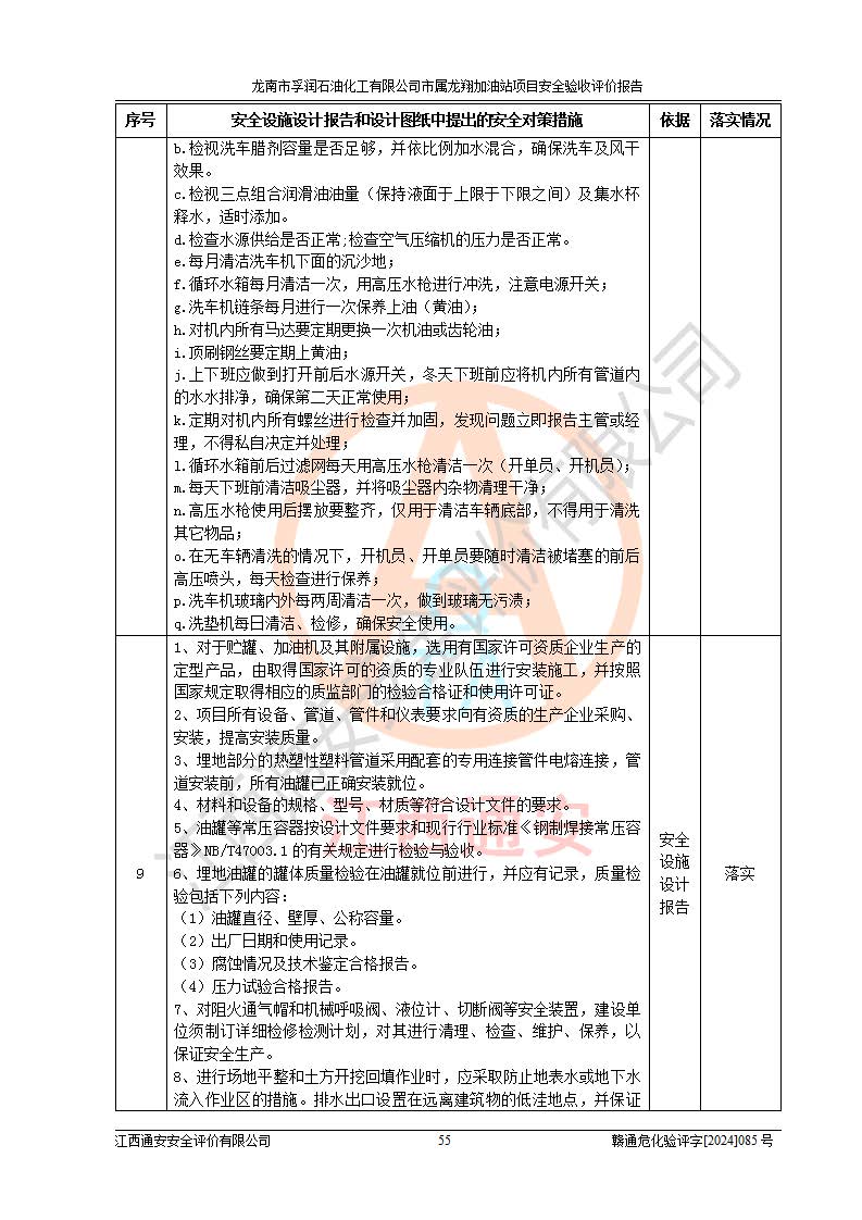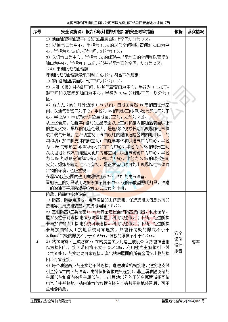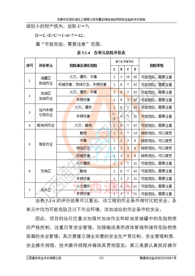 其它 | 1、龙南市孚润石油化工有限公司市属龙翔加油站为二级加油站,所涉及的危险化学品物质的量不构成重大危险源。经辨识本项目不涉及监控、易制毒、易制爆、剧毒和高毒危险化学品;项目涉及的汽油属于重点监管和特别管控危险化学品,储存经营单位应根据“汽油安全措施和应急处理原则”要求的措施完善安全、应急设施和资源;依据《特别管控危险化学品目录(**版)》管控措施进行检查,加油站对汽油进行储存定置化管理,设置油罐区**储存汽油,并制定各种管理制度,依法依规严格管理。项目不涉及重点监管危险化工工艺。 2、通过本报告分析,可以知道本项目投入经营后仍将面对多种危险因素,如火灾、爆炸,电气伤害、**伤害、噪声等危险有害因素。而项目*主要的危险、有害因素是火灾、爆炸,对此加油站全体员工**保持**的安全防护意识。 3、项目公用工程能够满足安全经营的需要。 4、采用检查表评价法进行加油站安全评价,评价范围内的设备设施结论为符合要求。 5、加油站取得了防雷接地检测报告,加油站能够符合安全规范要求。 6、该项目能按照《中华人民共和国安全生产法》的要求进行“三同时”审批,安全设施按照安全设施与主体工程同时设计、同时施工、同时投入生产和使用的“三同时”的要求进行,现场与设计一致。 7、该项目选址、外部防火距离、平面布置、消防安全设施和措施能够满足**法律、法规、标准、规范的要求。电气防爆防护、机械设备的安全保护等方面的安全设施建立**。 8、该工程的作业条件相对比较安全。在选定的7个单元中可能出现“可能危险”作业环境有6个单元,且“可能危险”作业环境的出现均由物料的危险程度所决定,而其余单元的作业均在“稍有危险”范围,作业条件相对安全。 9、危险度评价油储罐区得分为12分,为Ⅱ级,属中度危险。由于采用埋地油罐、密封操作等措施,危险有害程度能控制在可接受的范围。 10、加油站设置了安全**小组,制定了相应的管理制度,操作规程和事故应急预案,加油站的安全管理机构工作有力,加油站安全经营管理处于正常有序开展范围。应急资源配置和应急管理能达到加油站的应急要求。 综上所述,龙南市孚润石油化工有限公司市属龙翔加油站项目严格执行**有关安全生产法律、法规和有关标准、规范,认真落实并合理采纳安全条件评价报告及安全设施设计设计中的安全对策、措施及建议,做到安全设施与主体工程同时设计、同时施工、同时投入生产和使用的“三同时”,对潜在的危险、有害因素采取了安全对策措施,工程潜在的危险、有害因素可得到**控制,风险在**控制和可接受范围内。现场与设计一致。 该项目安全设施设计设计的安全设施得到落实符合**安全生产方面的法律、法规、标准、规范的要求,具备安全验收条件,符合安全生产条件。 | ||||