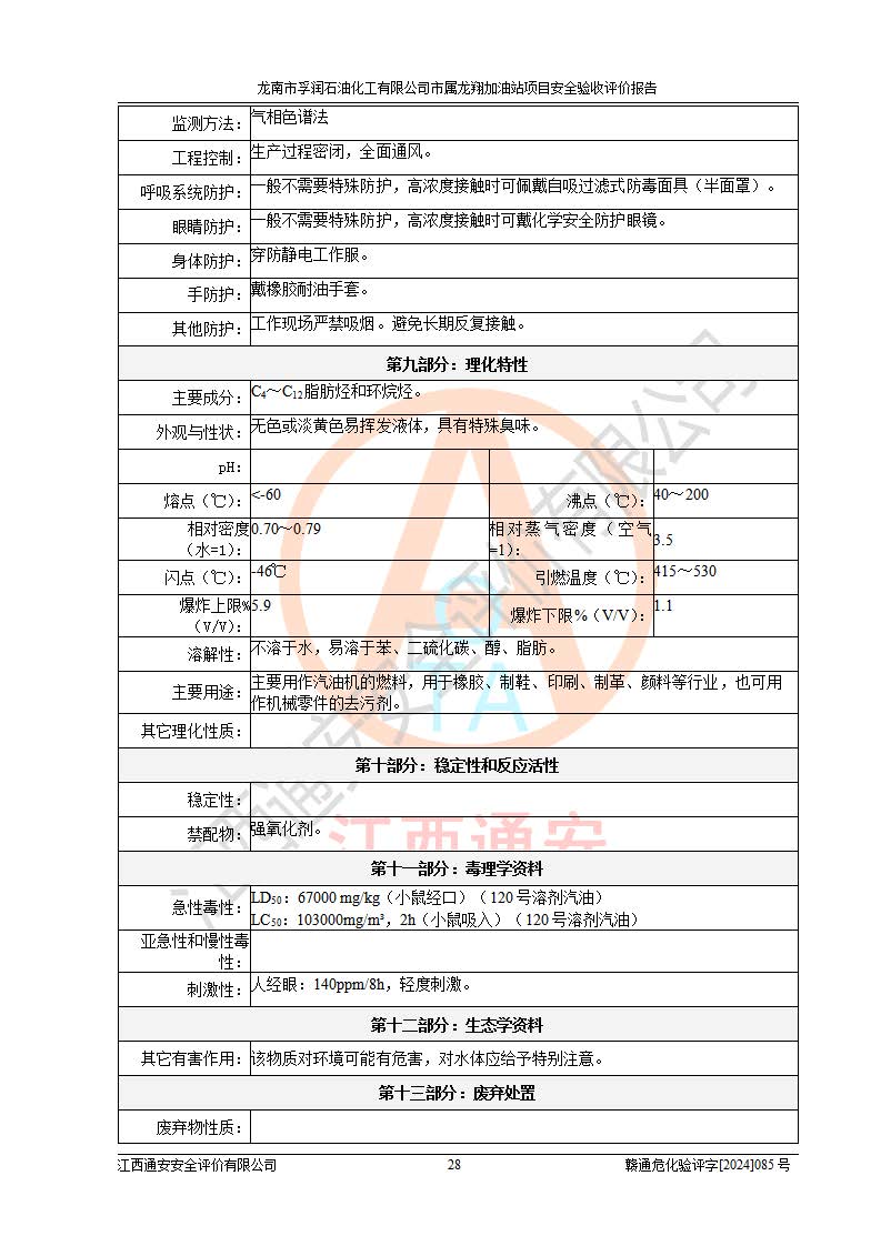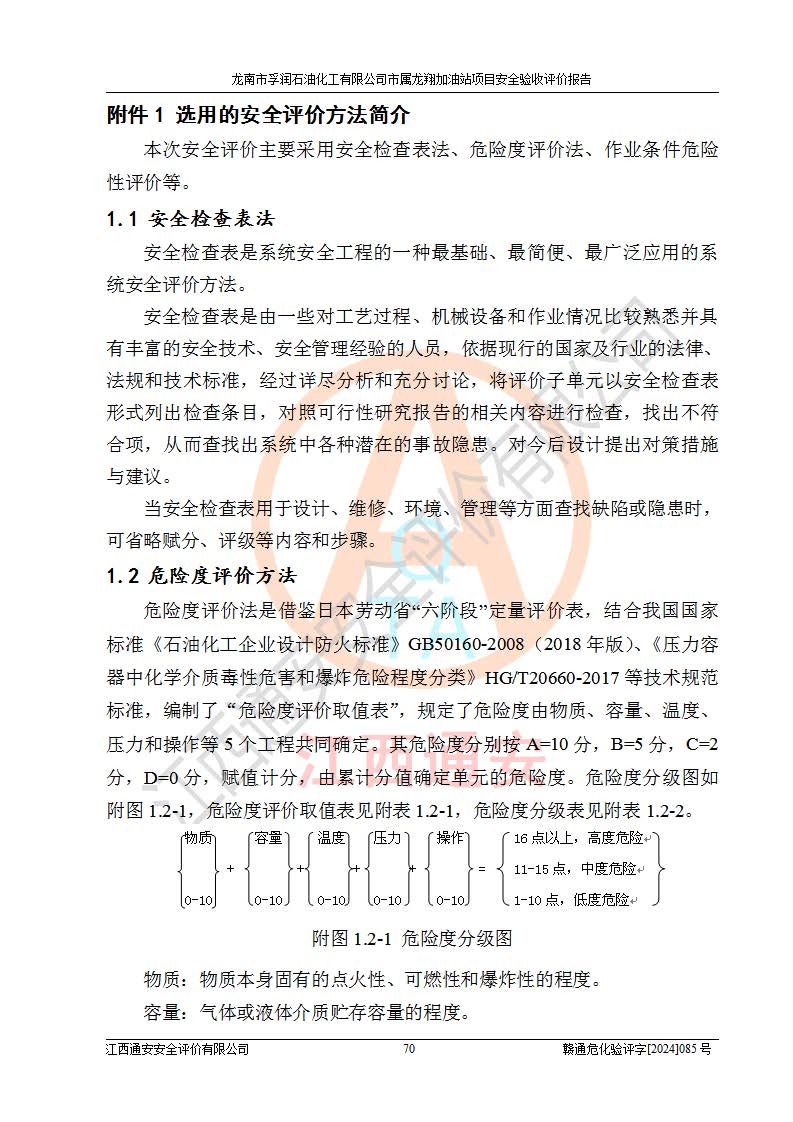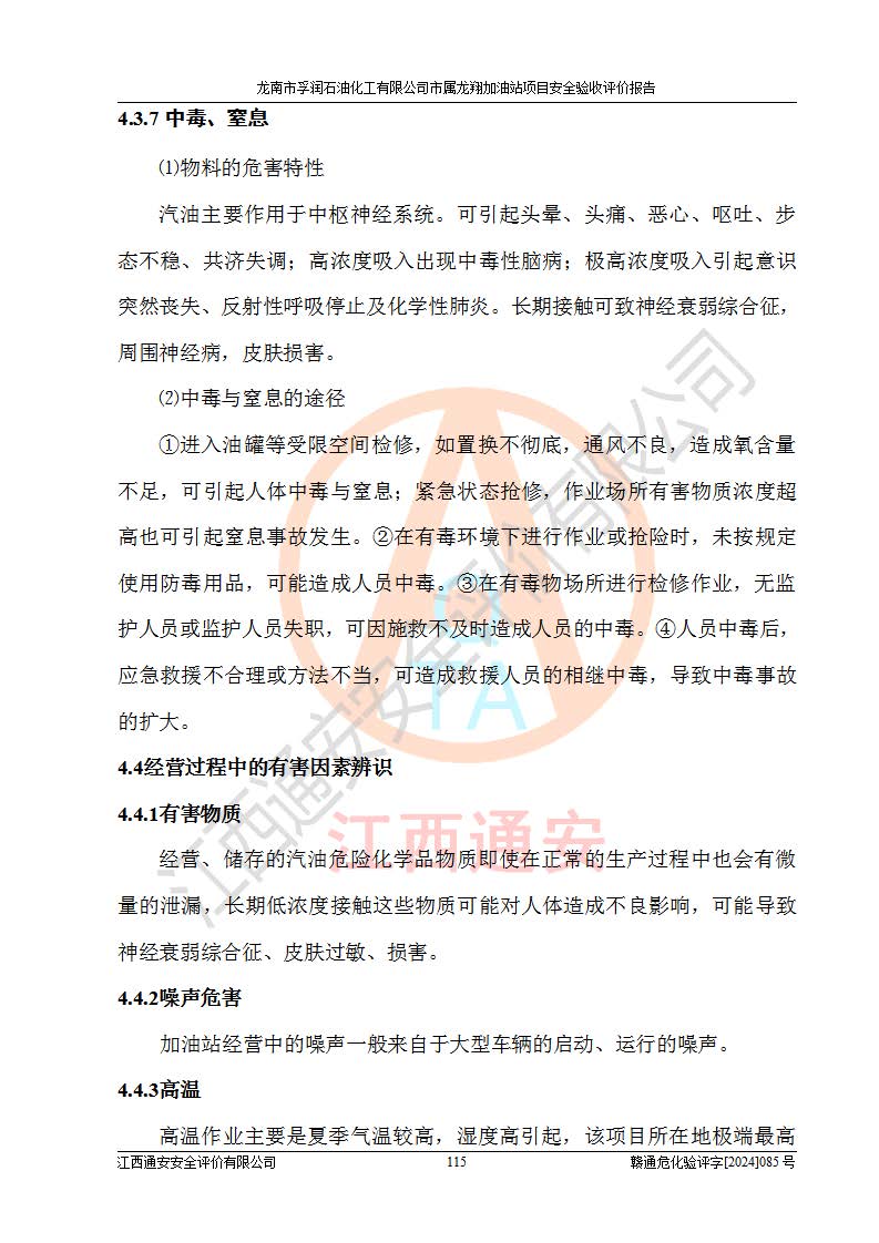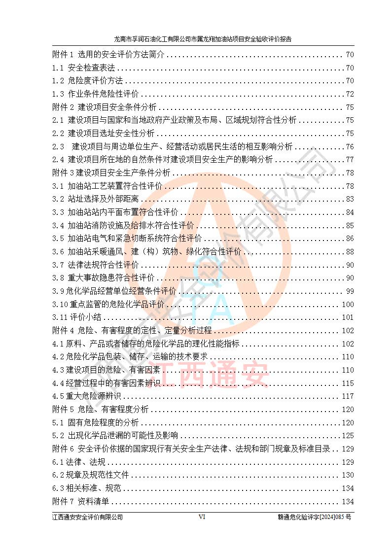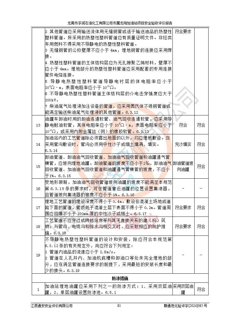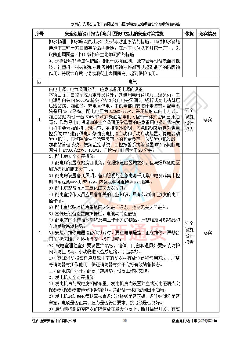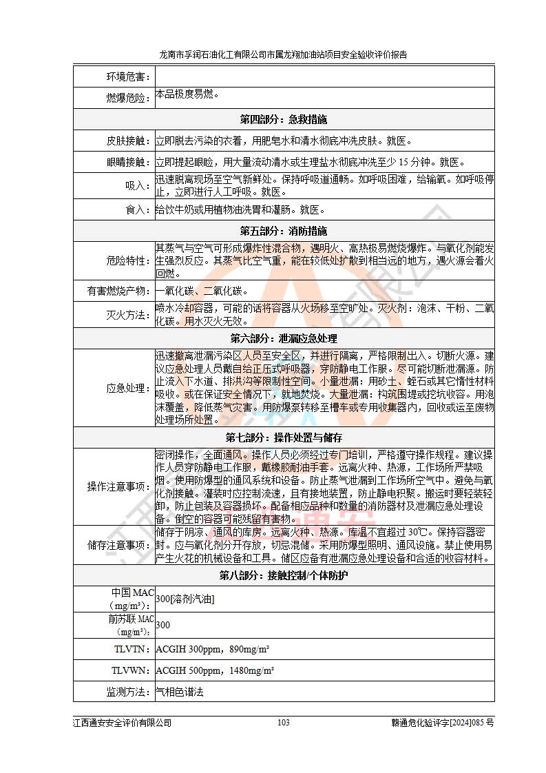 其它 | 1、龙南市孚润石油化工有限公司市属龙翔加油站为二级加油站,所涉及的危险化学品物质的量不构成重大危险源。经辨识本项目不涉及监控、易制毒、易制爆、剧毒和高毒危险化学品;项目涉及的汽油属于重点监管和特别管控危险化学品,储存经营单位应根据“汽油安全措施和应急处理原则”要求的措施完善安全、应急设施和资源;依据《特别管控危险化学品目录(**版)》管控措施进行检查,加油站对汽油进行储存定置化管理,设置油罐区**储存汽油,并制定各种管理制度,依法依规严格管理。项目不涉及重点监管危险化工工艺。 2、通过本报告分析,可以知道本项目投入经营后仍将面对多种危险因素,如火灾、爆炸,电气伤害、**伤害、噪声等危险有害因素。而项目*主要的危险、有害因素是火灾、爆炸,对此加油站全体员工**保持**的安全防护意识。 3、项目公用工程能够满足安全经营的需要。 4、采用检查表评价法进行加油站安全评价,评价范围内的设备设施结论为符合要求。 5、加油站取得了防雷接地检测报告,加油站能够符合安全规范要求。 6、该项目能按照《中华人民共和国安全生产法》的要求进行“三同时”审批,安全设施按照安全设施与主体工程同时设计、同时施工、同时投入生产和使用的“三同时”的要求进行,现场与设计一致。 7、该项目选址、外部防火距离、平面布置、消防安全设施和措施能够满足**法律、法规、标准、规范的要求。电气防爆防护、机械设备的安全保护等方面的安全设施建立**。 8、该工程的作业条件相对比较安全。在选定的7个单元中可能出现“可能危险”作业环境有6个单元,且“可能危险”作业环境的出现均由物料的危险程度所决定,而其余单元的作业均在“稍有危险”范围,作业条件相对安全。 9、危险度评价油储罐区得分为12分,为Ⅱ级,属中度危险。由于采用埋地油罐、密封操作等措施,危险有害程度能控制在可接受的范围。 10、加油站设置了安全**小组,制定了相应的管理制度,操作规程和事故应急预案,加油站的安全管理机构工作有力,加油站安全经营管理处于正常有序开展范围。应急资源配置和应急管理能达到加油站的应急要求。 综上所述,龙南市孚润石油化工有限公司市属龙翔加油站项目严格执行**有关安全生产法律、法规和有关标准、规范,认真落实并合理采纳安全条件评价报告及安全设施设计设计中的安全对策、措施及建议,做到安全设施与主体工程同时设计、同时施工、同时投入生产和使用的“三同时”,对潜在的危险、有害因素采取了安全对策措施,工程潜在的危险、有害因素可得到**控制,风险在**控制和可接受范围内。现场与设计一致。 该项目安全设施设计设计的安全设施得到落实符合**安全生产方面的法律、法规、标准、规范的要求,具备安全验收条件,符合安全生产条件。 | ||||