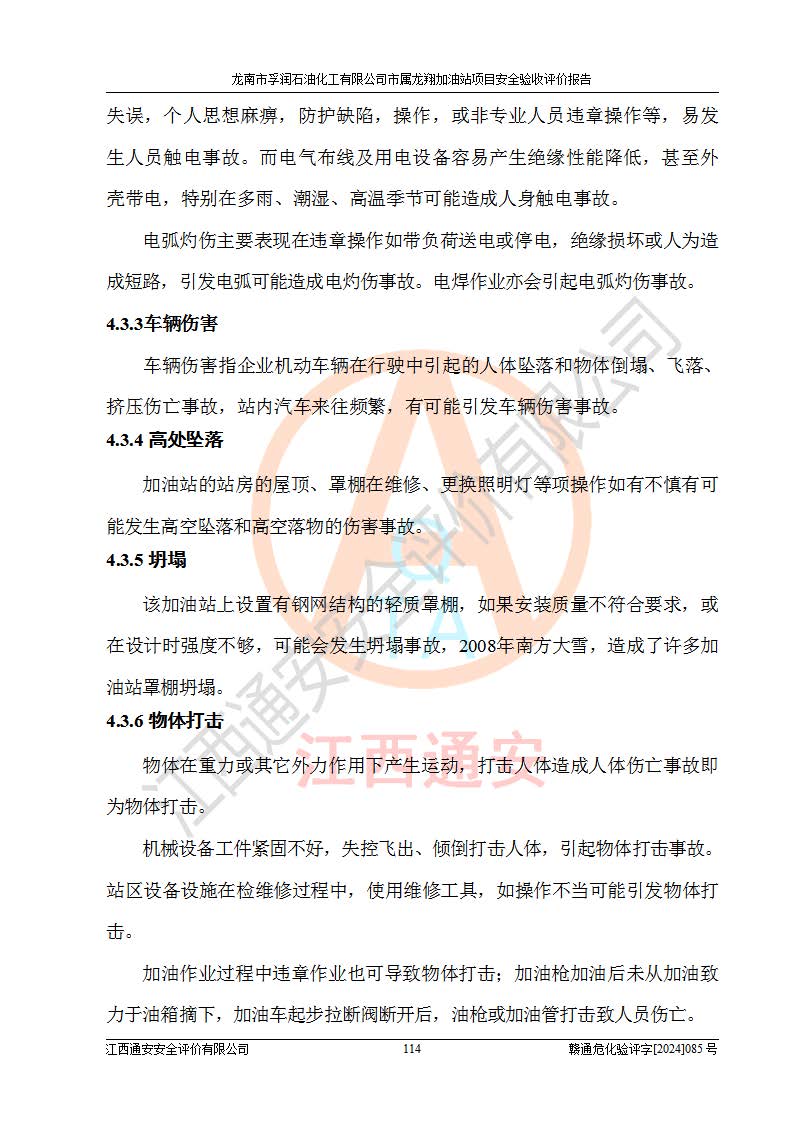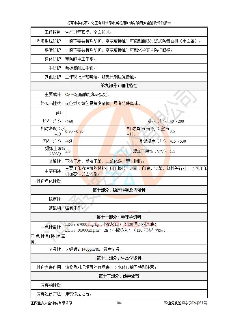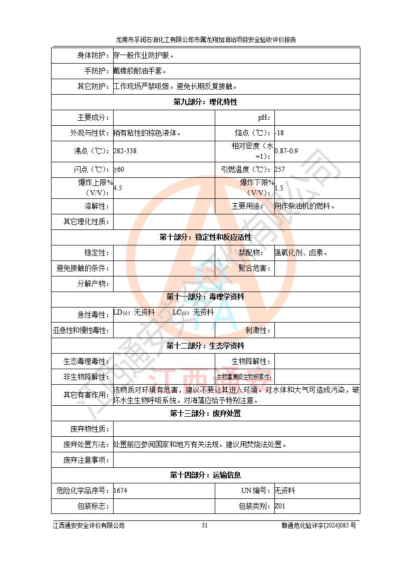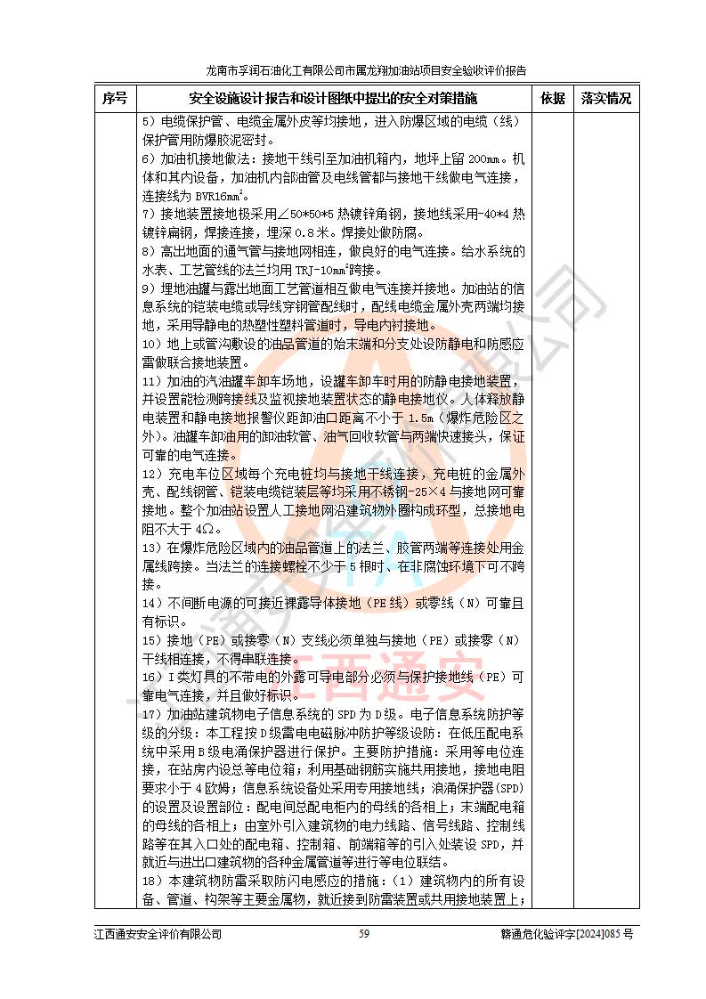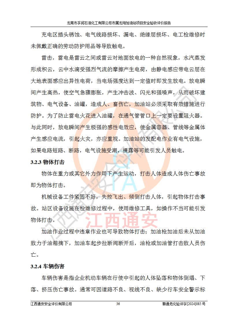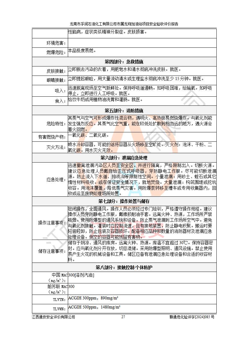 其它 | 1、龙南市孚润石油化工有限公司市属龙翔加油站为二级加油站,所涉及的危险化学品物质的量不构成重大危险源。经辨识本项目不涉及监控、易制毒、易制爆、剧毒和高毒危险化学品;项目涉及的汽油属于重点监管和特别管控危险化学品,储存经营单位应根据“汽油安全措施和应急处理原则”要求的措施完善安全、应急设施和资源;依据《特别管控危险化学品目录(**版)》管控措施进行检查,加油站对汽油进行储存定置化管理,设置油罐区**储存汽油,并制定各种管理制度,依法依规严格管理。项目不涉及重点监管危险化工工艺。 2、通过本报告分析,可以知道本项目投入经营后仍将面对多种危险因素,如火灾、爆炸,电气伤害、**伤害、噪声等危险有害因素。而项目*主要的危险、有害因素是火灾、爆炸,对此加油站全体员工**保持**的安全防护意识。 3、项目公用工程能够满足安全经营的需要。 4、采用检查表评价法进行加油站安全评价,评价范围内的设备设施结论为符合要求。 5、加油站取得了防雷接地检测报告,加油站能够符合安全规范要求。 6、该项目能按照《中华人民共和国安全生产法》的要求进行“三同时”审批,安全设施按照安全设施与主体工程同时设计、同时施工、同时投入生产和使用的“三同时”的要求进行,现场与设计一致。 7、该项目选址、外部防火距离、平面布置、消防安全设施和措施能够满足**法律、法规、标准、规范的要求。电气防爆防护、机械设备的安全保护等方面的安全设施建立**。 8、该工程的作业条件相对比较安全。在选定的7个单元中可能出现“可能危险”作业环境有6个单元,且“可能危险”作业环境的出现均由物料的危险程度所决定,而其余单元的作业均在“稍有危险”范围,作业条件相对安全。 9、危险度评价油储罐区得分为12分,为Ⅱ级,属中度危险。由于采用埋地油罐、密封操作等措施,危险有害程度能控制在可接受的范围。 10、加油站设置了安全**小组,制定了相应的管理制度,操作规程和事故应急预案,加油站的安全管理机构工作有力,加油站安全经营管理处于正常有序开展范围。应急资源配置和应急管理能达到加油站的应急要求。 综上所述,龙南市孚润石油化工有限公司市属龙翔加油站项目严格执行**有关安全生产法律、法规和有关标准、规范,认真落实并合理采纳安全条件评价报告及安全设施设计设计中的安全对策、措施及建议,做到安全设施与主体工程同时设计、同时施工、同时投入生产和使用的“三同时”,对潜在的危险、有害因素采取了安全对策措施,工程潜在的危险、有害因素可得到**控制,风险在**控制和可接受范围内。现场与设计一致。 该项目安全设施设计设计的安全设施得到落实符合**安全生产方面的法律、法规、标准、规范的要求,具备安全验收条件,符合安全生产条件。 | ||||