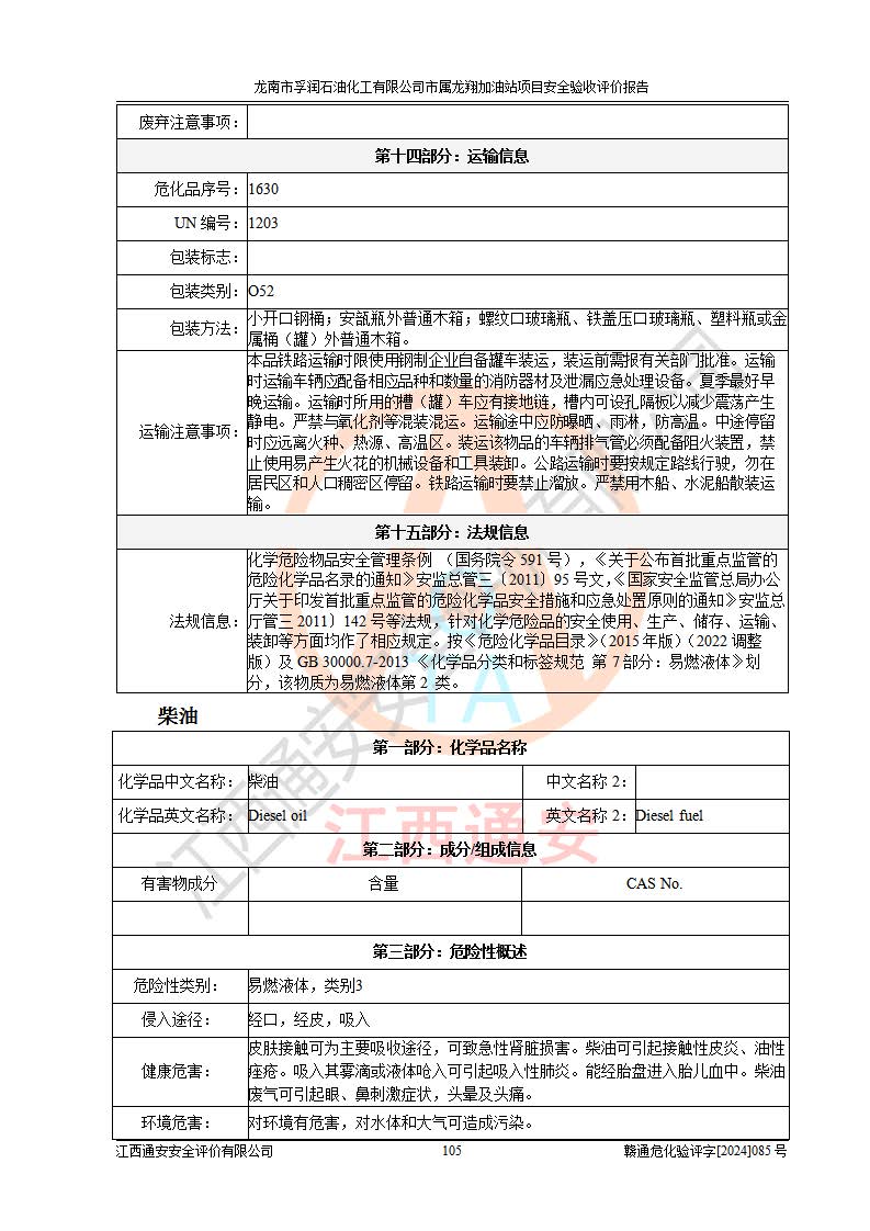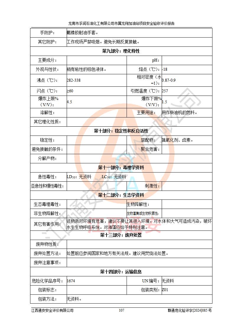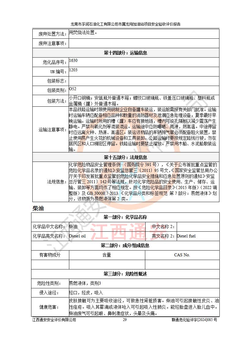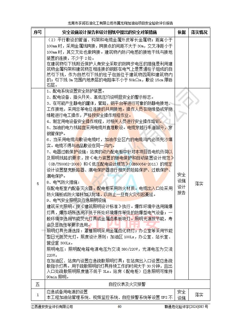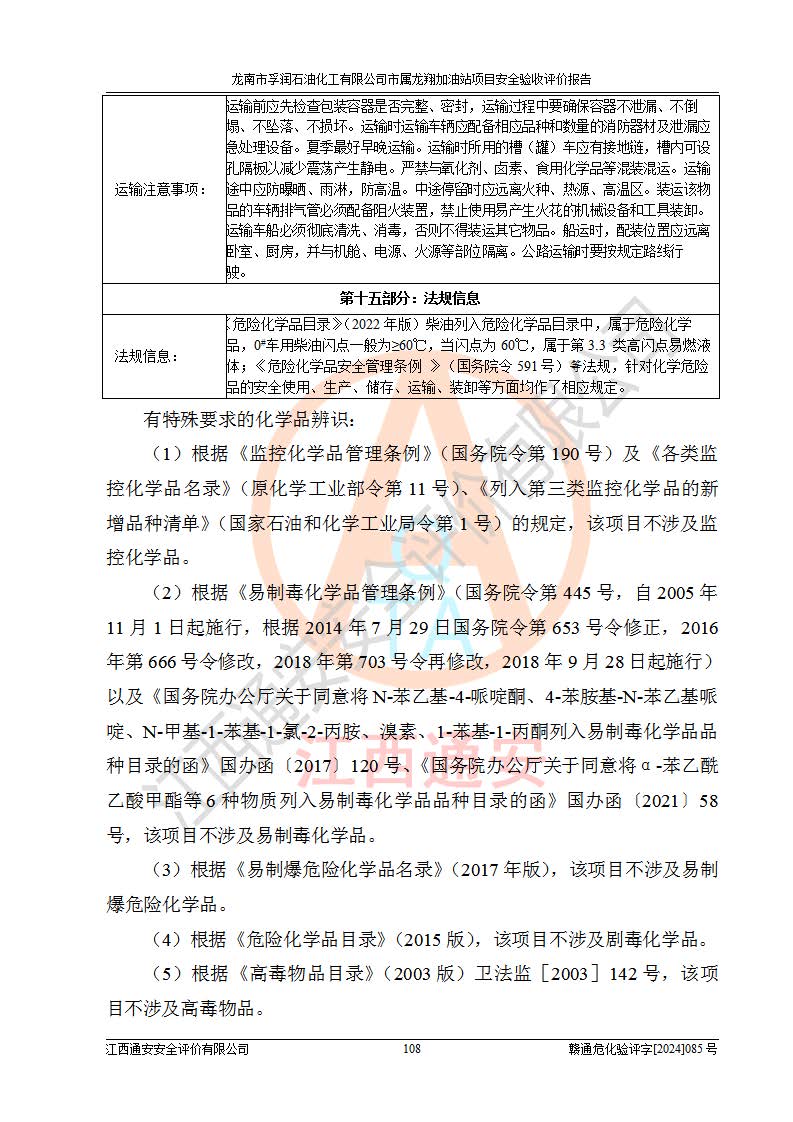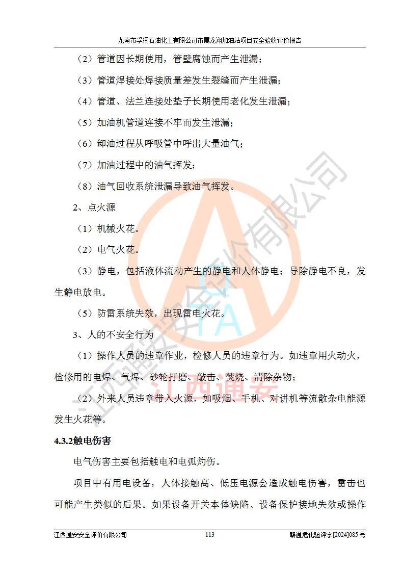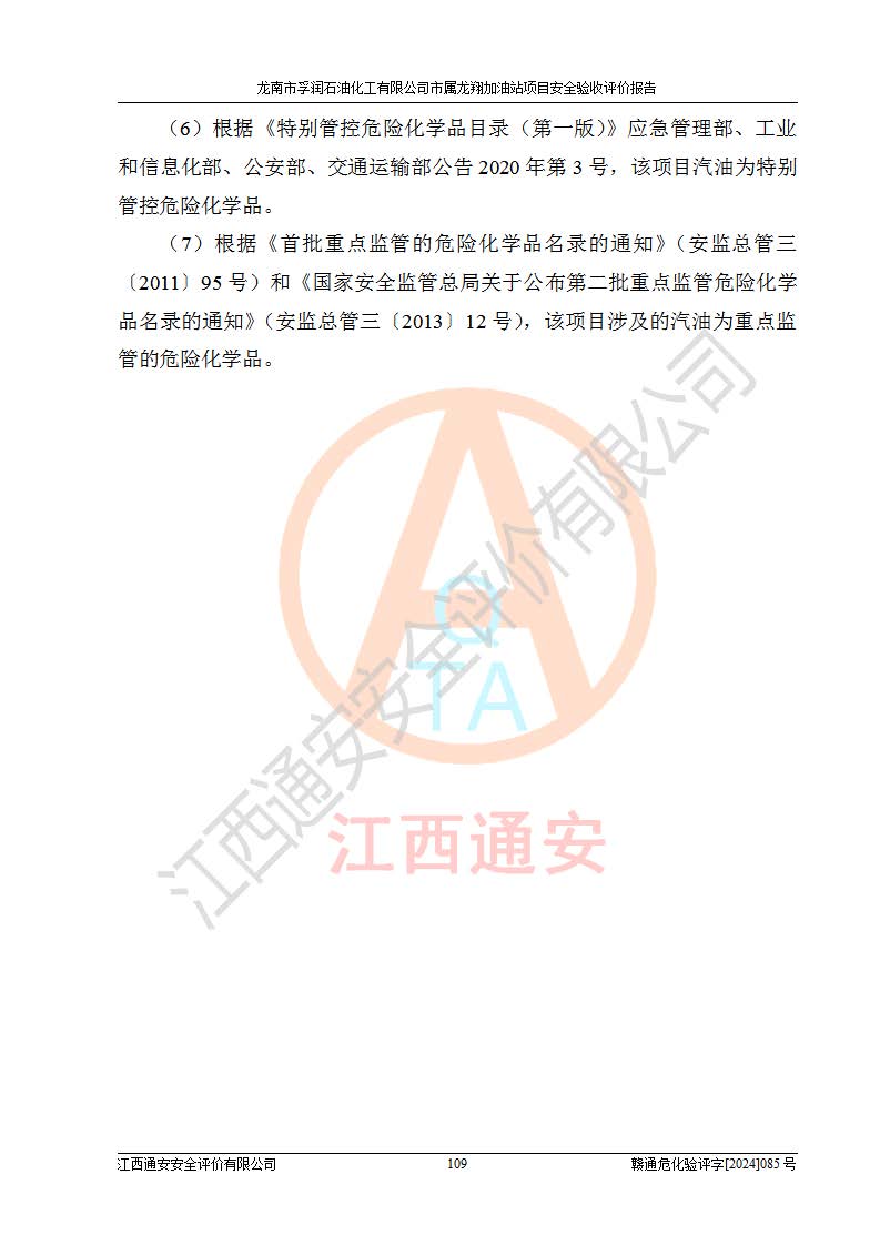其它 | 1、龙南市孚润石油化工有限公司市属龙翔加油站为二级加油站,所涉及的危险化学品物质的量不构成重大危险源。经辨识本项目不涉及监控、易制毒、易制爆、剧毒和高毒危险化学品;项目涉及的汽油属于重点监管和特别管控危险化学品,储存经营单位应根据“汽油安全措施和应急处理原则”要求的措施完善安全、应急设施和资源;依据《特别管控危险化学品目录(**版)》管控措施进行检查,加油站对汽油进行储存定置化管理,设置油罐区**储存汽油,并制定各种管理制度,依法依规严格管理。项目不涉及重点监管危险化工工艺。 2、通过本报告分析,可以知道本项目投入经营后仍将面对多种危险因素,如火灾、爆炸,电气伤害、**伤害、噪声等危险有害因素。而项目*主要的危险、有害因素是火灾、爆炸,对此加油站全体员工**保持**的安全防护意识。 3、项目公用工程能够满足安全经营的需要。 4、采用检查表评价法进行加油站安全评价,评价范围内的设备设施结论为符合要求。 5、加油站取得了防雷接地检测报告,加油站能够符合安全规范要求。 6、该项目能按照《中华人民共和国安全生产法》的要求进行“三同时”审批,安全设施按照安全设施与主体工程同时设计、同时施工、同时投入生产和使用的“三同时”的要求进行,现场与设计一致。 7、该项目选址、外部防火距离、平面布置、消防安全设施和措施能够满足**法律、法规、标准、规范的要求。电气防爆防护、机械设备的安全保护等方面的安全设施建立**。 8、该工程的作业条件相对比较安全。在选定的7个单元中可能出现“可能危险”作业环境有6个单元,且“可能危险”作业环境的出现均由物料的危险程度所决定,而其余单元的作业均在“稍有危险”范围,作业条件相对安全。 9、危险度评价油储罐区得分为12分,为Ⅱ级,属中度危险。由于采用埋地油罐、密封操作等措施,危险有害程度能控制在可接受的范围。 10、加油站设置了安全**小组,制定了相应的管理制度,操作规程和事故应急预案,加油站的安全管理机构工作有力,加油站安全经营管理处于正常有序开展范围。应急资源配置和应急管理能达到加油站的应急要求。 综上所述,龙南市孚润石油化工有限公司市属龙翔加油站项目严格执行**有关安全生产法律、法规和有关标准、规范,认真落实并合理采纳安全条件评价报告及安全设施设计设计中的安全对策、措施及建议,做到安全设施与主体工程同时设计、同时施工、同时投入生产和使用的“三同时”,对潜在的危险、有害因素采取了安全对策措施,工程潜在的危险、有害因素可得到**控制,风险在**控制和可接受范围内。现场与设计一致。 该项目安全设施设计设计的安全设施得到落实符合**安全生产方面的法律、法规、标准、规范的要求,具备安全验收条件,符合安全生产条件。 | ||||