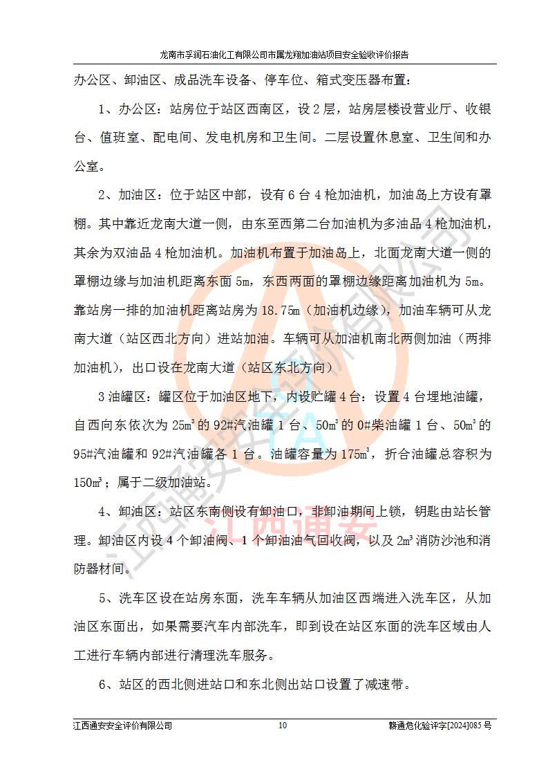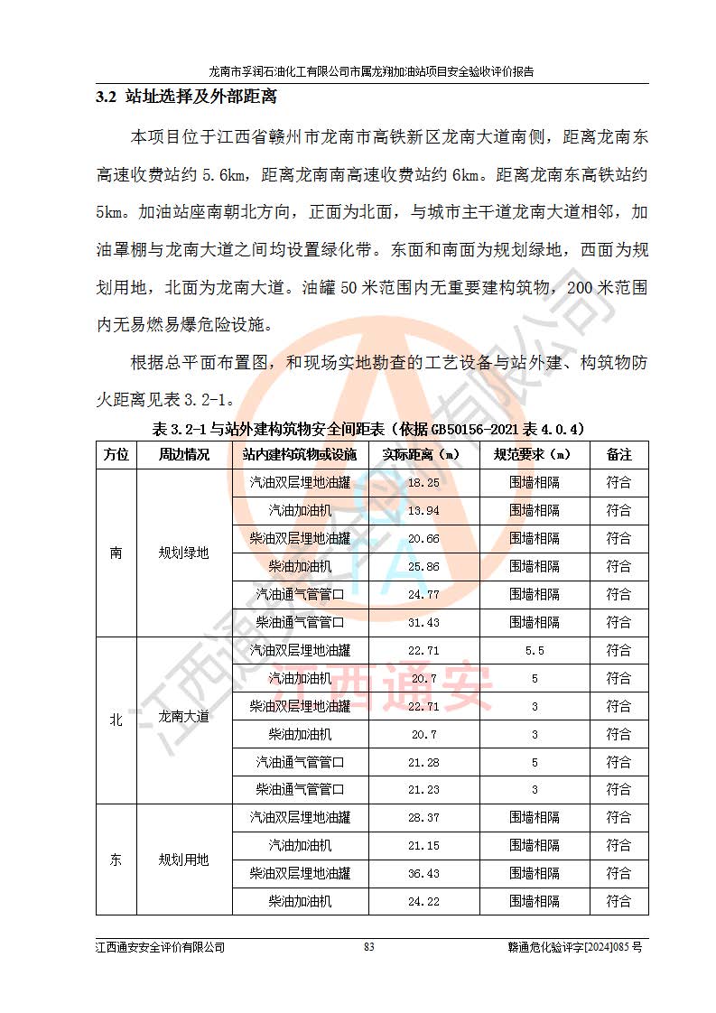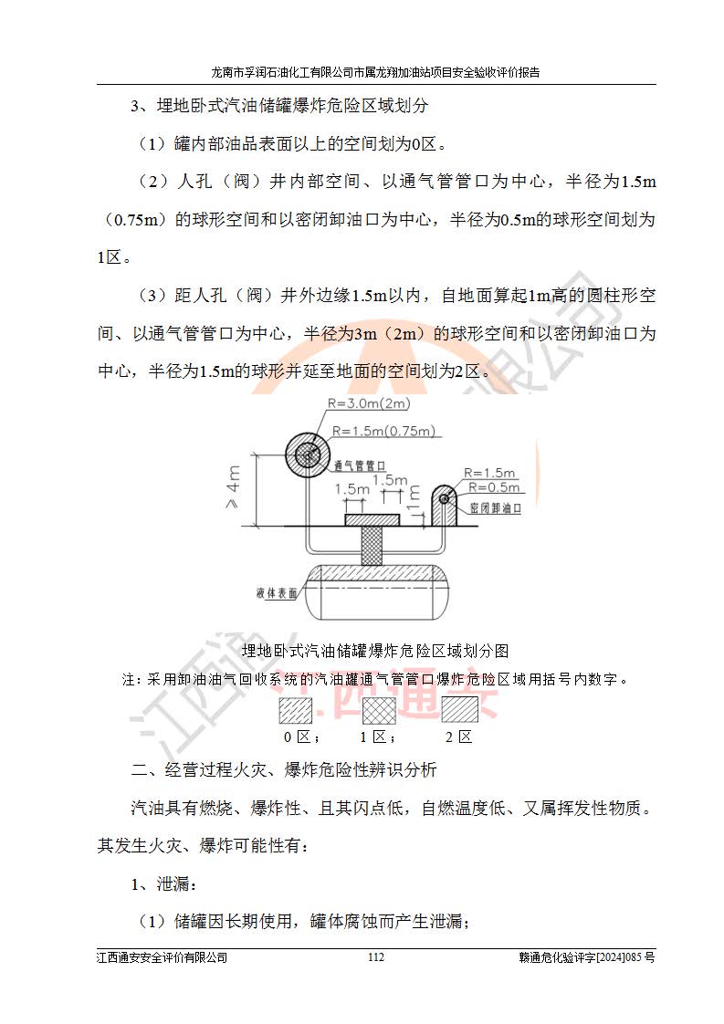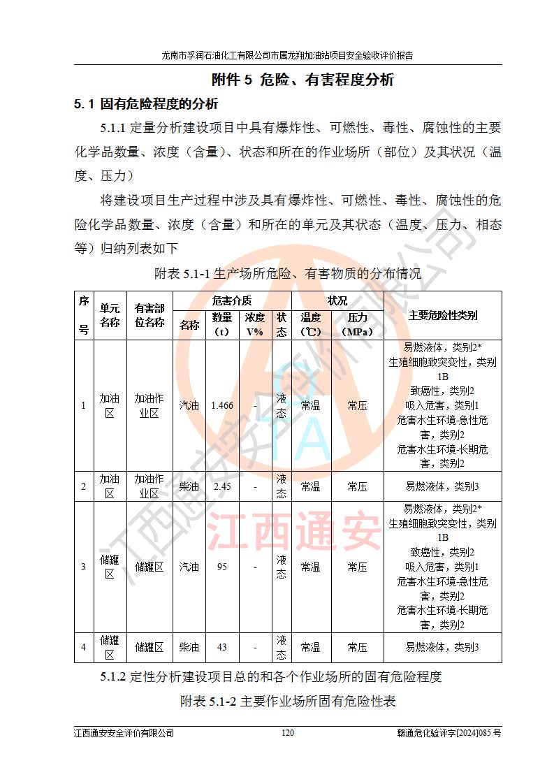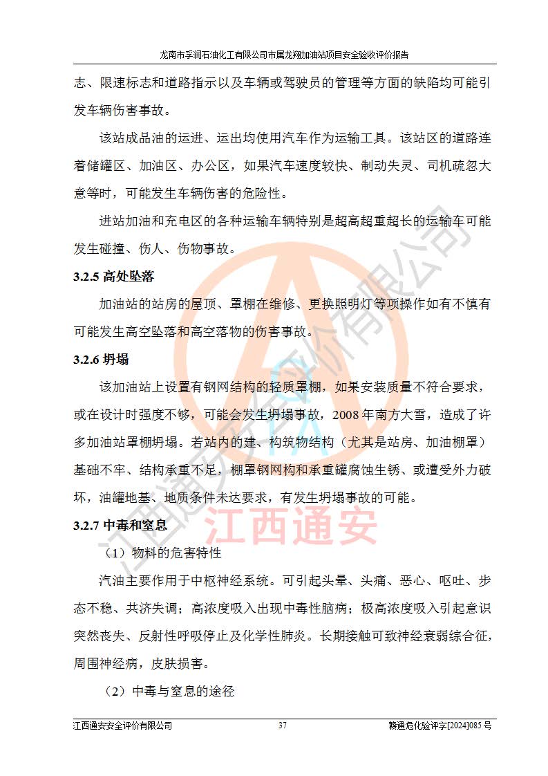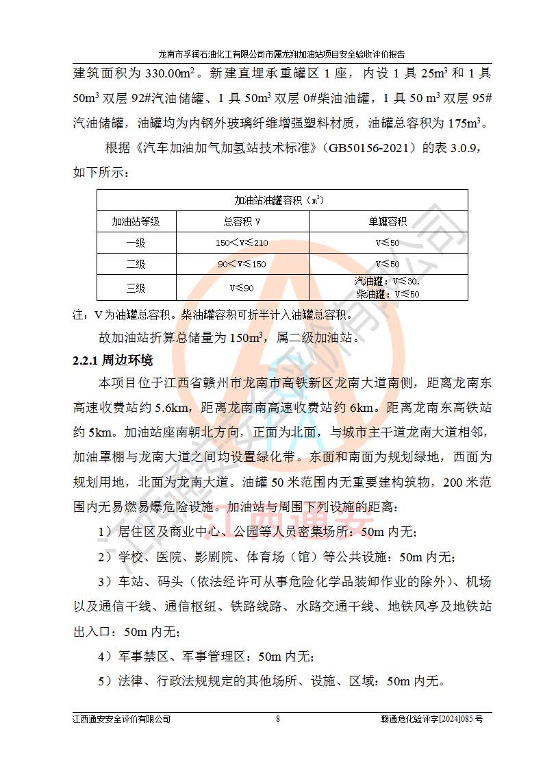 项目简介 | 龙南市孚润石油化工有限公司属于有限责任公司(非自然人投资或控股的法人独资企业),负责人徐宇波,统一社会信用代码:91360727MA3AD8RJ1A,经营范围包括许可项目:道路货物运输(含危险货物)(依法需经批准的项目,经相关部门批准后方可开展经营活动);一般项目:石油制品销售(不含危险化学品),化工产品销售(不含许可类化工产品)(除许可业务外,可自主依法经营法律法规非禁止或限制的项目)。 龙南市孚润石油化工有限公司市属龙翔加油站,2024年4月成立,是一家有限责任公司(非自然人投资或控股的法人独资),经营范围:许可项目:道路危险货物运输,成品油零售(不含危险化学品),烟草制品零售,食品销售(依法须经批准的项目,经相关部门批准后在许可**期内方可开展经营活动,具体经营项目和许可期限以相关部门批准文件或许可证件为准)一般项目食品销售(仅销售预包装食品),保健食品(预装)销售日用百货销售,**化学产品销售(不含危险化学品),润滑油销售,输配电及控制设备制造,化工产品销售(不含许可类化工产品),石油制品销售(不含危险化学品),机动车充电销售(除依法须经批准的项日外,凭营业执照依法自主开展经营活动)。 在江西省赣州市龙南市龙南经济技术开发区高铁新区龙南大道南侧地块建造二级加油站一座,加油站名称为龙南市孚润石油化工有限公司市属龙翔加油站(以下简称龙翔加油站)。龙翔加油站主要经营汽油、柴油,赣州市行政审批局对加油站地点予以规划确认(赣市行审证(3)字[2024]1号),该站建设用地面积约3462.8m2,经龙南市自然资源局审批同意加油站建设用地,取得建设用地规划许可证(地字第3607832024YG0009480号)和土地不动产权证(编号为:36020229990);已取得江西省企业投资项目备案通知书(项目统一代码为:2401-360727-04-01-236686),2024年6月18日已取得赣州市行政审批局出具的安全条件审查批复,2024年8月20日已取得赣州市市行政审批局出具的安全设施设计审查批复。设计单位为海湾工程有限公司(化工石化医药行业**),建筑施工单位为江西洛宣建设工程有限公司(建筑工程施工总承包壹级),设备安装施工单位为江西华锦石油化工设备有限公司(石油化工工程总承包叁级),监理单位为中成建充集团有限公司(可承担所有专业工程类别建设工程项目的工程监理业务)以及江西文中云工程管理有限公司(房屋建筑工程监理乙级等资质),中成建充集团有限公司负责设备监理,江西文中云工程管理有限公司负责土建监理。目前该加油站已完成建设。 加油站用地面积为3462.8m2,该加油站站内设6台多油品4枪潜油泵加油机,储罐区设置92#汽油罐25m3×1个、95#汽油罐50m3×1个、92#汽油罐50m3×1个、0#柴油罐50m3×1个,折算容量为150m3,按《汽车加油加气加氢站技术标准》(GB50156-2021)为二级加油站。该站属二级加油站。 汽油为危险化学品,其蒸汽与空气形成爆炸性气体,遇明火、高热易燃烧爆炸,火险分级为甲B类,是重点监管和特别管控危险化学品;柴油为危险化学品,火险分级为丙A类,遇明火、高热或与氧化剂接触,有引起燃烧爆炸的危险。因此,本项目存在的主要危险有害因素是火灾、爆炸、中毒窒息。 根据《中华人民共和国安全生产法》(主席令〔2002〕第13号发布,主席令〔2021〕第88号修订)、《危险化学品安全管理条例》(***第591号令)、《危险化学品经营许可证管理办法》(安监总局令第55号,安监总局令第79号修正)、《危险化学品建设项目安全监督管理办法》(**安全生产监督管理总局45号令,安监总局令第79号修正)、《江西省危险化学品建设项目安全监督管理实施细则(试行)》赣应急字【2021】100号文的要求,企业应对项目进行安全验收评价,以判断工程项目在劳动安全卫生方面对**及行业有关的标准和法规的符合性,并检查相关安全配套设施“三同时”的**性。 受龙南市孚润石油化工有限公司市属龙翔加油站的委托,江西通安安全评价有限公司承担其项目安全验收评价工作,于2024年10月组成评价小组,对所提供的资料、文件进行了审核,对现场进行了实地检测,根据《安全评价通则》AQ8001-2007和《危险化学品建设项目安全评价细则(试行)》(安监总危化[2007]255号)要求,编写此评价报告。 | ||||