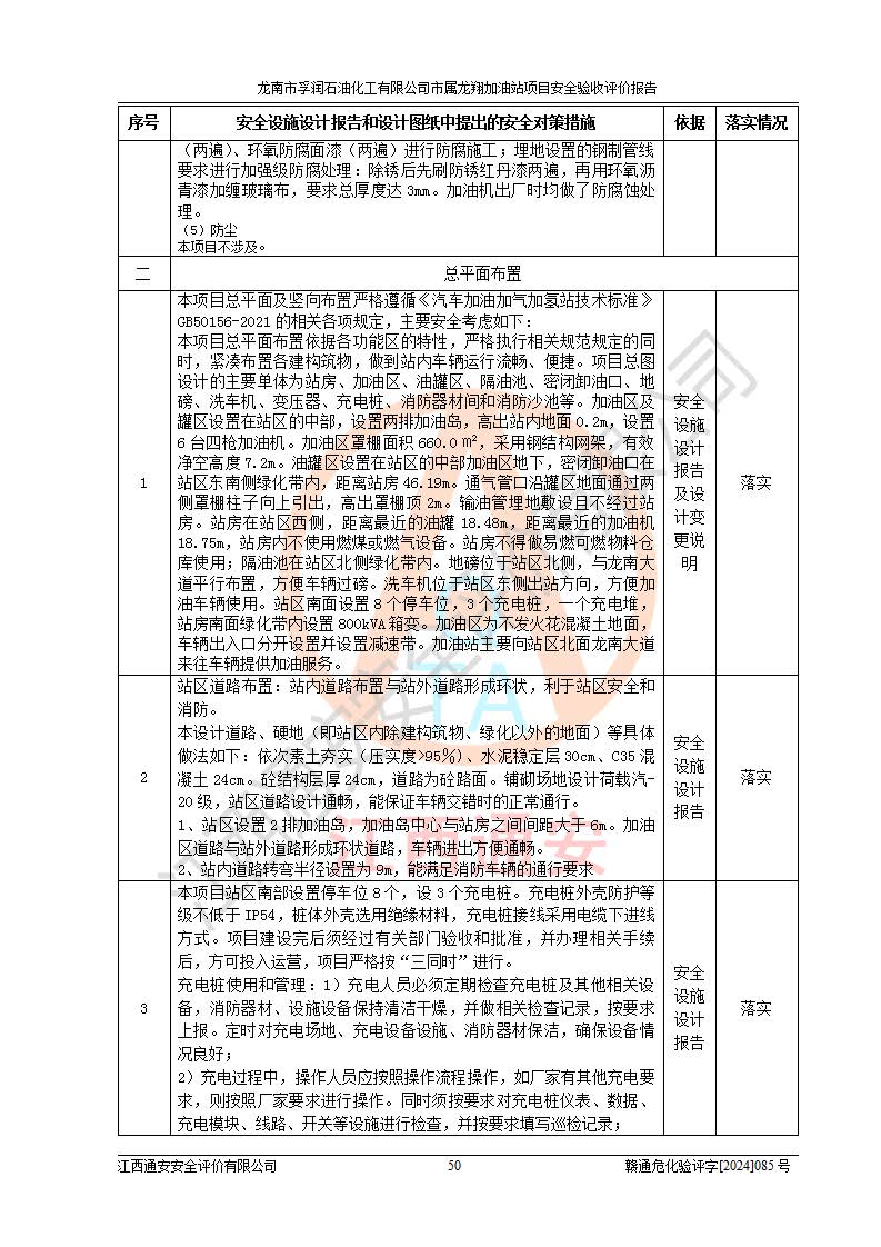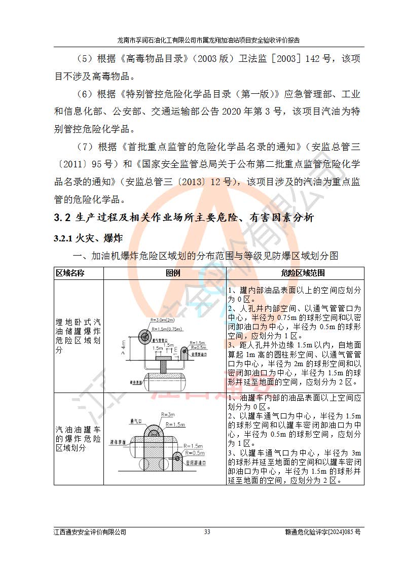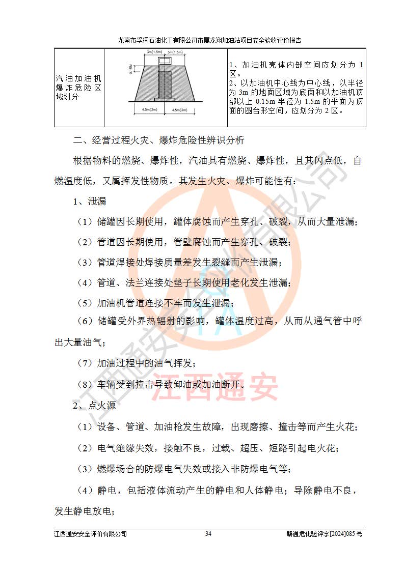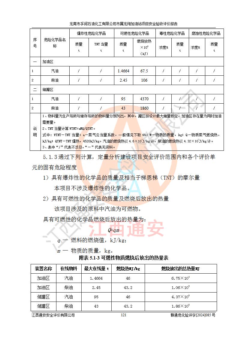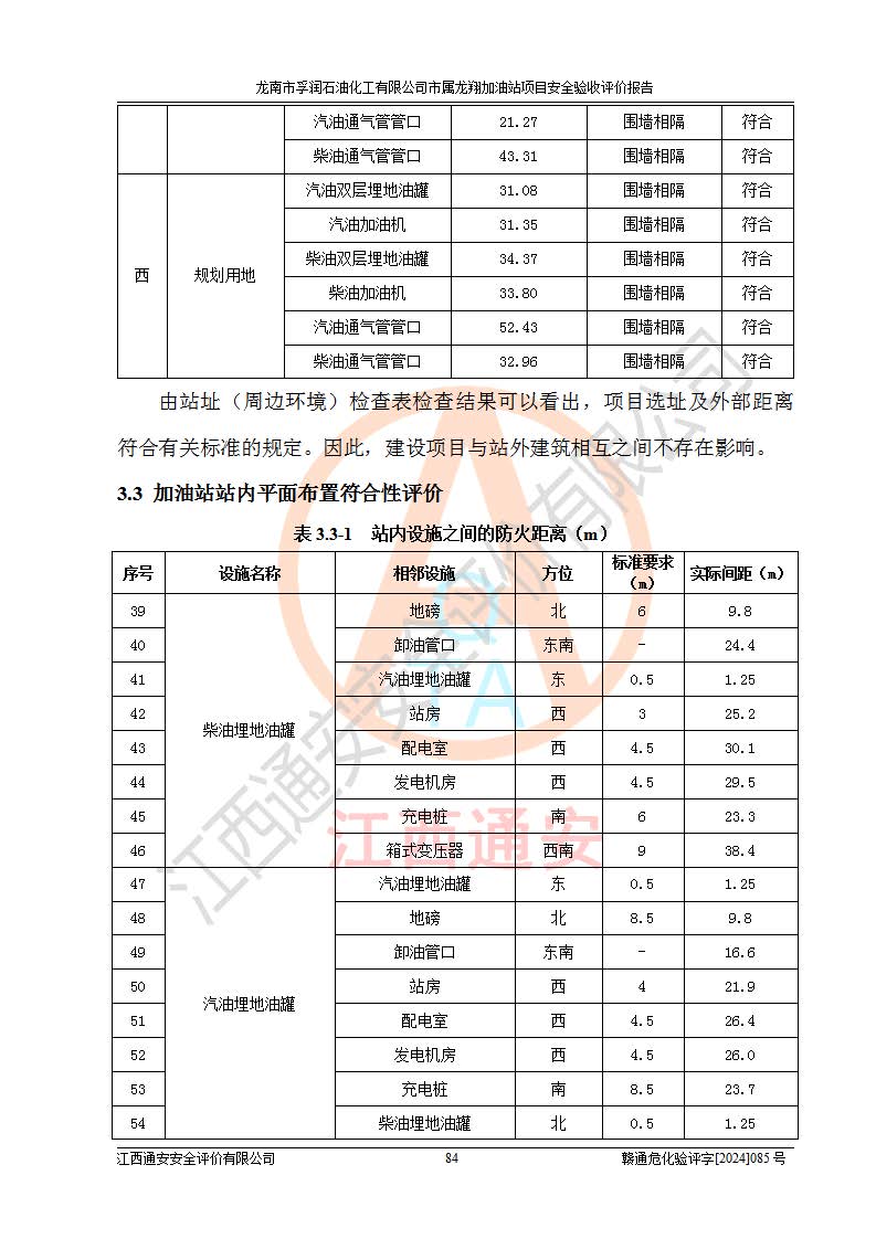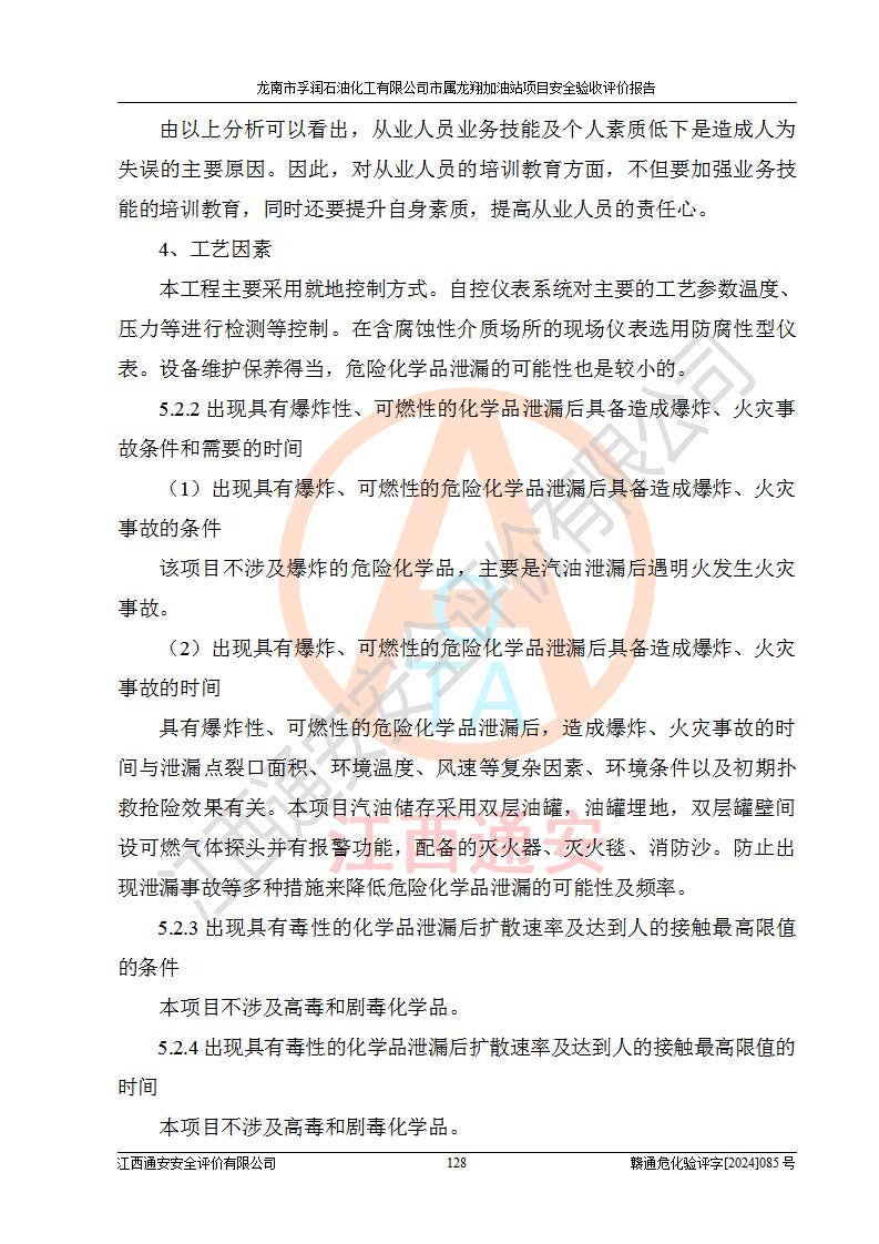 项目简介 | 龙南市孚润石油化工有限公司属于有限责任公司(非自然人投资或控股的法人独资企业),负责人徐宇波,统一社会信用代码:91360727MA3AD8RJ1A,经营范围包括许可项目:道路货物运输(含危险货物)(依法需经批准的项目,经相关部门批准后方可开展经营活动);一般项目:石油制品销售(不含危险化学品),化工产品销售(不含许可类化工产品)(除许可业务外,可自主依法经营法律法规非禁止或限制的项目)。 龙南市孚润石油化工有限公司市属龙翔加油站,2024年4月成立,是一家有限责任公司(非自然人投资或控股的法人独资),经营范围:许可项目:道路危险货物运输,成品油零售(不含危险化学品),烟草制品零售,食品销售(依法须经批准的项目,经相关部门批准后在许可**期内方可开展经营活动,具体经营项目和许可期限以相关部门批准文件或许可证件为准)一般项目食品销售(仅销售预包装食品),保健食品(预装)销售日用百货销售,**化学产品销售(不含危险化学品),润滑油销售,输配电及控制设备制造,化工产品销售(不含许可类化工产品),石油制品销售(不含危险化学品),机动车充电销售(除依法须经批准的项日外,凭营业执照依法自主开展经营活动)。 在江西省赣州市龙南市龙南经济技术开发区高铁新区龙南大道南侧地块建造二级加油站一座,加油站名称为龙南市孚润石油化工有限公司市属龙翔加油站(以下简称龙翔加油站)。龙翔加油站主要经营汽油、柴油,赣州市行政审批局对加油站地点予以规划确认(赣市行审证(3)字[2024]1号),该站建设用地面积约3462.8m2,经龙南市自然资源局审批同意加油站建设用地,取得建设用地规划许可证(地字第3607832024YG0009480号)和土地不动产权证(编号为:36020229990);已取得江西省企业投资项目备案通知书(项目统一代码为:2401-360727-04-01-236686),2024年6月18日已取得赣州市行政审批局出具的安全条件审查批复,2024年8月20日已取得赣州市市行政审批局出具的安全设施设计审查批复。设计单位为海湾工程有限公司(化工石化医药行业**),建筑施工单位为江西洛宣建设工程有限公司(建筑工程施工总承包壹级),设备安装施工单位为江西华锦石油化工设备有限公司(石油化工工程总承包叁级),监理单位为中成建充集团有限公司(可承担所有专业工程类别建设工程项目的工程监理业务)以及江西文中云工程管理有限公司(房屋建筑工程监理乙级等资质),中成建充集团有限公司负责设备监理,江西文中云工程管理有限公司负责土建监理。目前该加油站已完成建设。 加油站用地面积为3462.8m2,该加油站站内设6台多油品4枪潜油泵加油机,储罐区设置92#汽油罐25m3×1个、95#汽油罐50m3×1个、92#汽油罐50m3×1个、0#柴油罐50m3×1个,折算容量为150m3,按《汽车加油加气加氢站技术标准》(GB50156-2021)为二级加油站。该站属二级加油站。 汽油为危险化学品,其蒸汽与空气形成爆炸性气体,遇明火、高热易燃烧爆炸,火险分级为甲B类,是重点监管和特别管控危险化学品;柴油为危险化学品,火险分级为丙A类,遇明火、高热或与氧化剂接触,有引起燃烧爆炸的危险。因此,本项目存在的主要危险有害因素是火灾、爆炸、中毒窒息。 根据《中华人民共和国安全生产法》(主席令〔2002〕第13号发布,主席令〔2021〕第88号修订)、《危险化学品安全管理条例》(***第591号令)、《危险化学品经营许可证管理办法》(安监总局令第55号,安监总局令第79号修正)、《危险化学品建设项目安全监督管理办法》(**安全生产监督管理总局45号令,安监总局令第79号修正)、《江西省危险化学品建设项目安全监督管理实施细则(试行)》赣应急字【2021】100号文的要求,企业应对项目进行安全验收评价,以判断工程项目在劳动安全卫生方面对**及行业有关的标准和法规的符合性,并检查相关安全配套设施“三同时”的**性。 受龙南市孚润石油化工有限公司市属龙翔加油站的委托,江西通安安全评价有限公司承担其项目安全验收评价工作,于2024年10月组成评价小组,对所提供的资料、文件进行了审核,对现场进行了实地检测,根据《安全评价通则》AQ8001-2007和《危险化学品建设项目安全评价细则(试行)》(安监总危化[2007]255号)要求,编写此评价报告。 | ||||