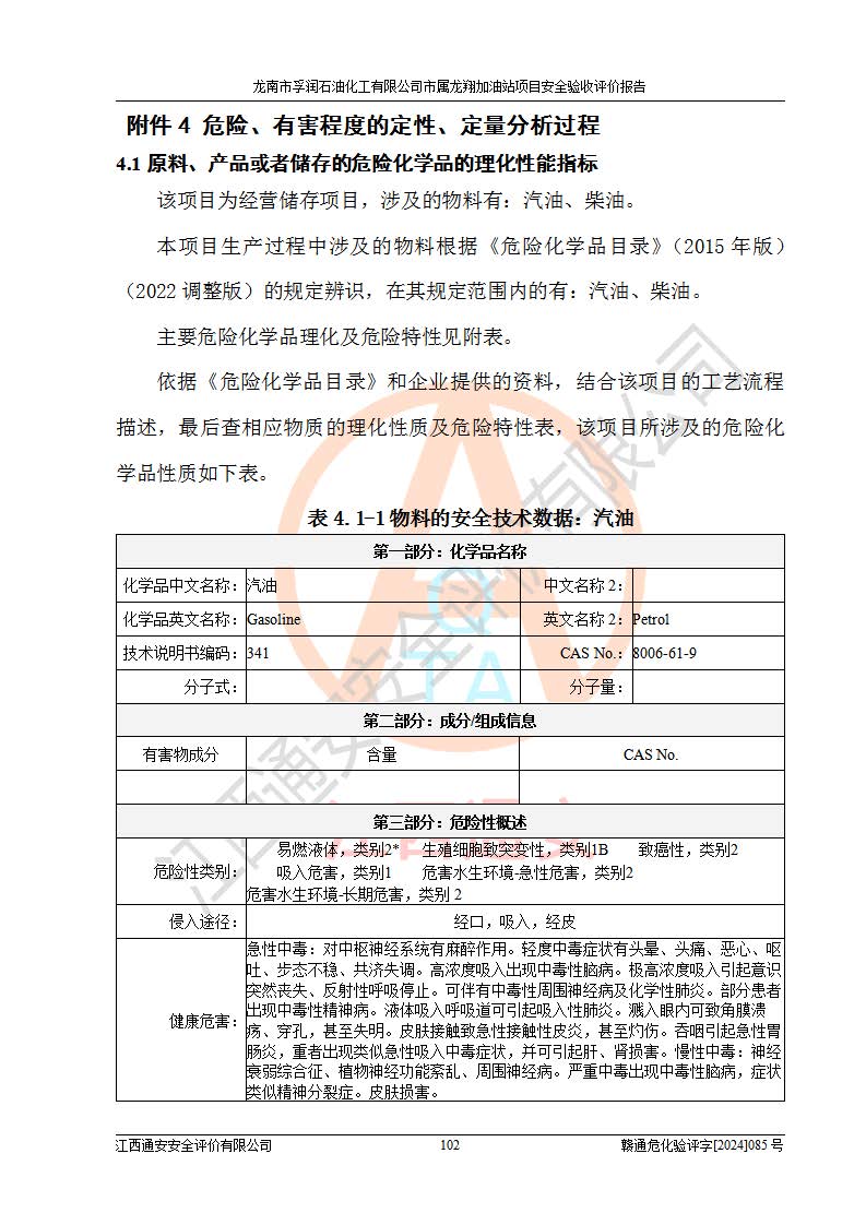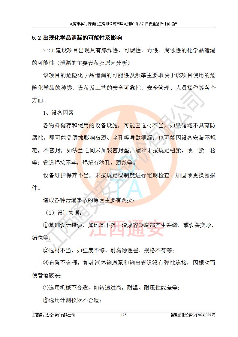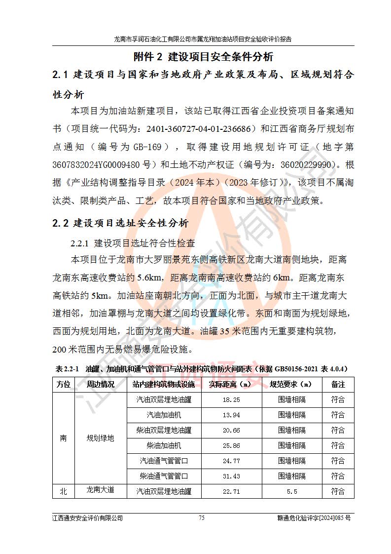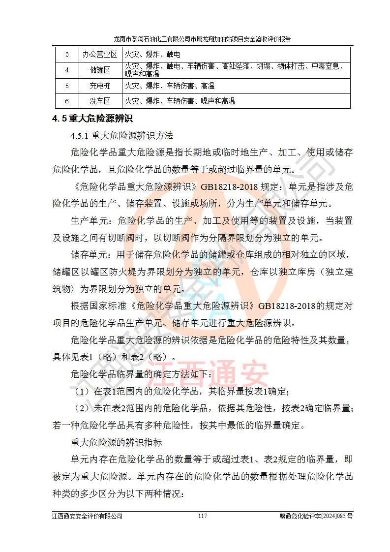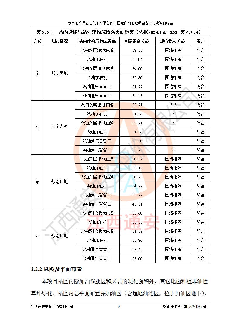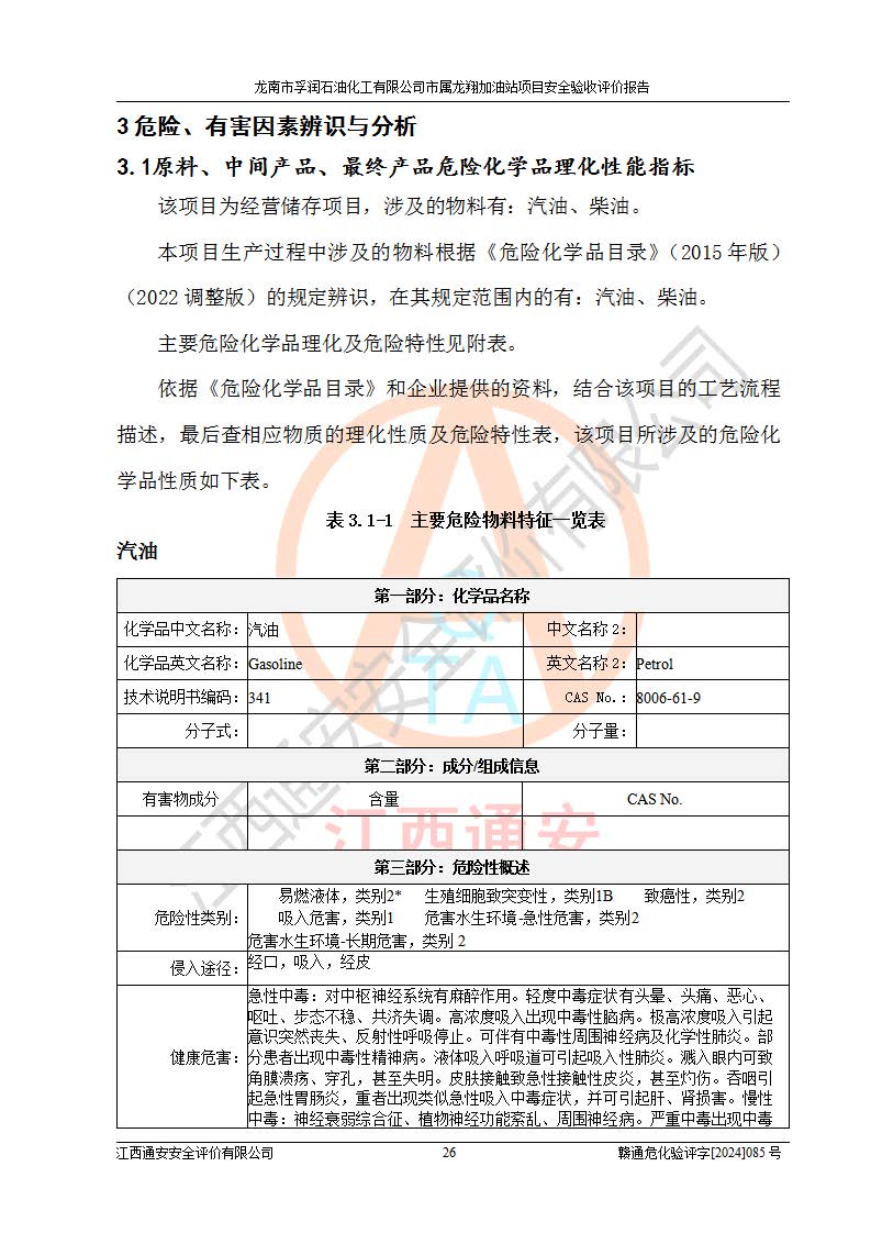 项目简介 | 龙南市孚润石油化工有限公司属于有限责任公司(非自然人投资或控股的法人独资企业),负责人徐宇波,统一社会信用代码:91360727MA3AD8RJ1A,经营范围包括许可项目:道路货物运输(含危险货物)(依法需经批准的项目,经相关部门批准后方可开展经营活动);一般项目:石油制品销售(不含危险化学品),化工产品销售(不含许可类化工产品)(除许可业务外,可自主依法经营法律法规非禁止或限制的项目)。 龙南市孚润石油化工有限公司市属龙翔加油站,2024年4月成立,是一家有限责任公司(非自然人投资或控股的法人独资),经营范围:许可项目:道路危险货物运输,成品油零售(不含危险化学品),烟草制品零售,食品销售(依法须经批准的项目,经相关部门批准后在许可**期内方可开展经营活动,具体经营项目和许可期限以相关部门批准文件或许可证件为准)一般项目食品销售(仅销售预包装食品),保健食品(预装)销售日用百货销售,**化学产品销售(不含危险化学品),润滑油销售,输配电及控制设备制造,化工产品销售(不含许可类化工产品),石油制品销售(不含危险化学品),机动车充电销售(除依法须经批准的项日外,凭营业执照依法自主开展经营活动)。 在江西省赣州市龙南市龙南经济技术开发区高铁新区龙南大道南侧地块建造二级加油站一座,加油站名称为龙南市孚润石油化工有限公司市属龙翔加油站(以下简称龙翔加油站)。龙翔加油站主要经营汽油、柴油,赣州市行政审批局对加油站地点予以规划确认(赣市行审证(3)字[2024]1号),该站建设用地面积约3462.8m2,经龙南市自然资源局审批同意加油站建设用地,取得建设用地规划许可证(地字第3607832024YG0009480号)和土地不动产权证(编号为:36020229990);已取得江西省企业投资项目备案通知书(项目统一代码为:2401-360727-04-01-236686),2024年6月18日已取得赣州市行政审批局出具的安全条件审查批复,2024年8月20日已取得赣州市市行政审批局出具的安全设施设计审查批复。设计单位为海湾工程有限公司(化工石化医药行业**),建筑施工单位为江西洛宣建设工程有限公司(建筑工程施工总承包壹级),设备安装施工单位为江西华锦石油化工设备有限公司(石油化工工程总承包叁级),监理单位为中成建充集团有限公司(可承担所有专业工程类别建设工程项目的工程监理业务)以及江西文中云工程管理有限公司(房屋建筑工程监理乙级等资质),中成建充集团有限公司负责设备监理,江西文中云工程管理有限公司负责土建监理。目前该加油站已完成建设。 加油站用地面积为3462.8m2,该加油站站内设6台多油品4枪潜油泵加油机,储罐区设置92#汽油罐25m3×1个、95#汽油罐50m3×1个、92#汽油罐50m3×1个、0#柴油罐50m3×1个,折算容量为150m3,按《汽车加油加气加氢站技术标准》(GB50156-2021)为二级加油站。该站属二级加油站。 汽油为危险化学品,其蒸汽与空气形成爆炸性气体,遇明火、高热易燃烧爆炸,火险分级为甲B类,是重点监管和特别管控危险化学品;柴油为危险化学品,火险分级为丙A类,遇明火、高热或与氧化剂接触,有引起燃烧爆炸的危险。因此,本项目存在的主要危险有害因素是火灾、爆炸、中毒窒息。 根据《中华人民共和国安全生产法》(主席令〔2002〕第13号发布,主席令〔2021〕第88号修订)、《危险化学品安全管理条例》(***第591号令)、《危险化学品经营许可证管理办法》(安监总局令第55号,安监总局令第79号修正)、《危险化学品建设项目安全监督管理办法》(**安全生产监督管理总局45号令,安监总局令第79号修正)、《江西省危险化学品建设项目安全监督管理实施细则(试行)》赣应急字【2021】100号文的要求,企业应对项目进行安全验收评价,以判断工程项目在劳动安全卫生方面对**及行业有关的标准和法规的符合性,并检查相关安全配套设施“三同时”的**性。 受龙南市孚润石油化工有限公司市属龙翔加油站的委托,江西通安安全评价有限公司承担其项目安全验收评价工作,于2024年10月组成评价小组,对所提供的资料、文件进行了审核,对现场进行了实地检测,根据《安全评价通则》AQ8001-2007和《危险化学品建设项目安全评价细则(试行)》(安监总危化[2007]255号)要求,编写此评价报告。 | ||||
