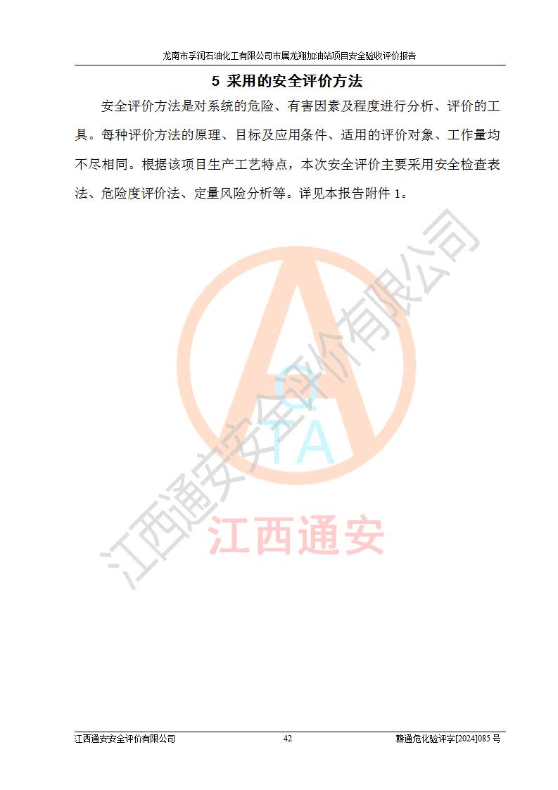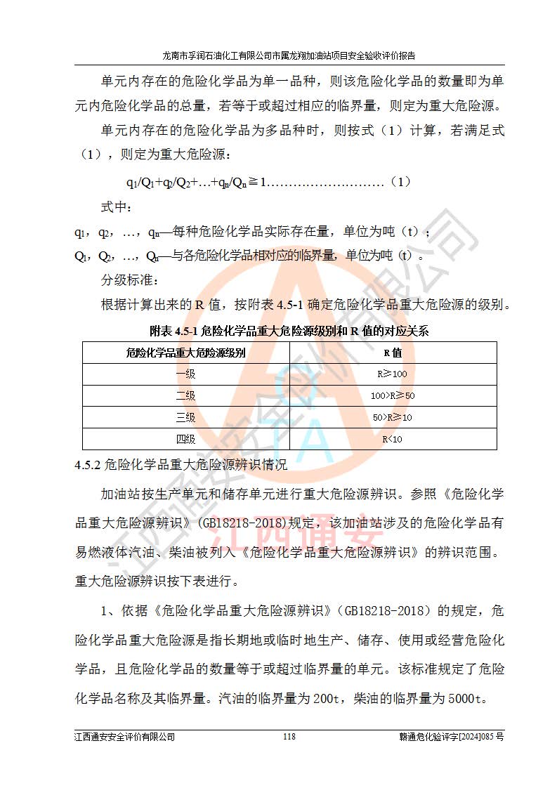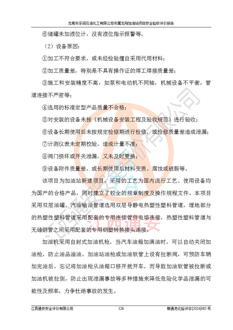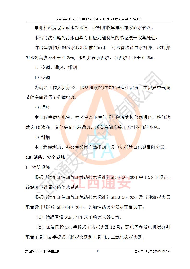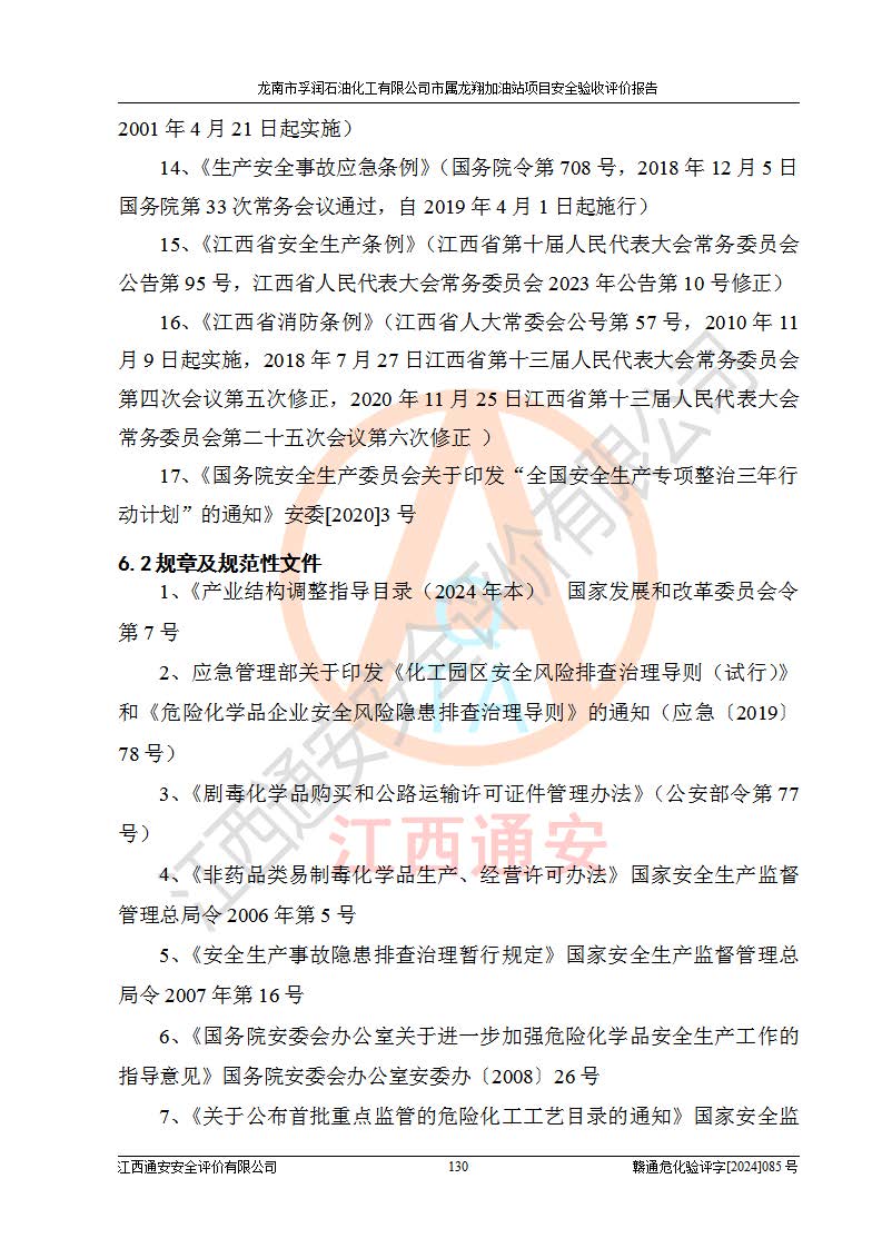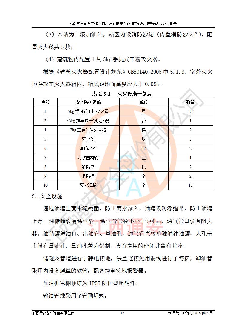 项目简介 | 龙南市孚润石油化工有限公司属于有限责任公司(非自然人投资或控股的法人独资企业),负责人徐宇波,统一社会信用代码:91360727MA3AD8RJ1A,经营范围包括许可项目:道路货物运输(含危险货物)(依法需经批准的项目,经相关部门批准后方可开展经营活动);一般项目:石油制品销售(不含危险化学品),化工产品销售(不含许可类化工产品)(除许可业务外,可自主依法经营法律法规非禁止或限制的项目)。 龙南市孚润石油化工有限公司市属龙翔加油站,2024年4月成立,是一家有限责任公司(非自然人投资或控股的法人独资),经营范围:许可项目:道路危险货物运输,成品油零售(不含危险化学品),烟草制品零售,食品销售(依法须经批准的项目,经相关部门批准后在许可**期内方可开展经营活动,具体经营项目和许可期限以相关部门批准文件或许可证件为准)一般项目食品销售(仅销售预包装食品),保健食品(预装)销售日用百货销售,**化学产品销售(不含危险化学品),润滑油销售,输配电及控制设备制造,化工产品销售(不含许可类化工产品),石油制品销售(不含危险化学品),机动车充电销售(除依法须经批准的项日外,凭营业执照依法自主开展经营活动)。 在江西省赣州市龙南市龙南经济技术开发区高铁新区龙南大道南侧地块建造二级加油站一座,加油站名称为龙南市孚润石油化工有限公司市属龙翔加油站(以下简称龙翔加油站)。龙翔加油站主要经营汽油、柴油,赣州市行政审批局对加油站地点予以规划确认(赣市行审证(3)字[2024]1号),该站建设用地面积约3462.8m2,经龙南市自然资源局审批同意加油站建设用地,取得建设用地规划许可证(地字第3607832024YG0009480号)和土地不动产权证(编号为:36020229990);已取得江西省企业投资项目备案通知书(项目统一代码为:2401-360727-04-01-236686),2024年6月18日已取得赣州市行政审批局出具的安全条件审查批复,2024年8月20日已取得赣州市市行政审批局出具的安全设施设计审查批复。设计单位为海湾工程有限公司(化工石化医药行业**),建筑施工单位为江西洛宣建设工程有限公司(建筑工程施工总承包壹级),设备安装施工单位为江西华锦石油化工设备有限公司(石油化工工程总承包叁级),监理单位为中成建充集团有限公司(可承担所有专业工程类别建设工程项目的工程监理业务)以及江西文中云工程管理有限公司(房屋建筑工程监理乙级等资质),中成建充集团有限公司负责设备监理,江西文中云工程管理有限公司负责土建监理。目前该加油站已完成建设。 加油站用地面积为3462.8m2,该加油站站内设6台多油品4枪潜油泵加油机,储罐区设置92#汽油罐25m3×1个、95#汽油罐50m3×1个、92#汽油罐50m3×1个、0#柴油罐50m3×1个,折算容量为150m3,按《汽车加油加气加氢站技术标准》(GB50156-2021)为二级加油站。该站属二级加油站。 汽油为危险化学品,其蒸汽与空气形成爆炸性气体,遇明火、高热易燃烧爆炸,火险分级为甲B类,是重点监管和特别管控危险化学品;柴油为危险化学品,火险分级为丙A类,遇明火、高热或与氧化剂接触,有引起燃烧爆炸的危险。因此,本项目存在的主要危险有害因素是火灾、爆炸、中毒窒息。 根据《中华人民共和国安全生产法》(主席令〔2002〕第13号发布,主席令〔2021〕第88号修订)、《危险化学品安全管理条例》(***第591号令)、《危险化学品经营许可证管理办法》(安监总局令第55号,安监总局令第79号修正)、《危险化学品建设项目安全监督管理办法》(**安全生产监督管理总局45号令,安监总局令第79号修正)、《江西省危险化学品建设项目安全监督管理实施细则(试行)》赣应急字【2021】100号文的要求,企业应对项目进行安全验收评价,以判断工程项目在劳动安全卫生方面对**及行业有关的标准和法规的符合性,并检查相关安全配套设施“三同时”的**性。 受龙南市孚润石油化工有限公司市属龙翔加油站的委托,江西通安安全评价有限公司承担其项目安全验收评价工作,于2024年10月组成评价小组,对所提供的资料、文件进行了审核,对现场进行了实地检测,根据《安全评价通则》AQ8001-2007和《危险化学品建设项目安全评价细则(试行)》(安监总危化[2007]255号)要求,编写此评价报告。 | ||||
