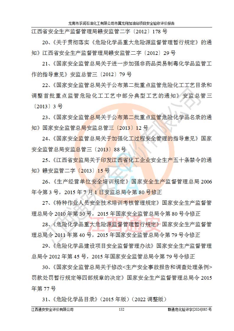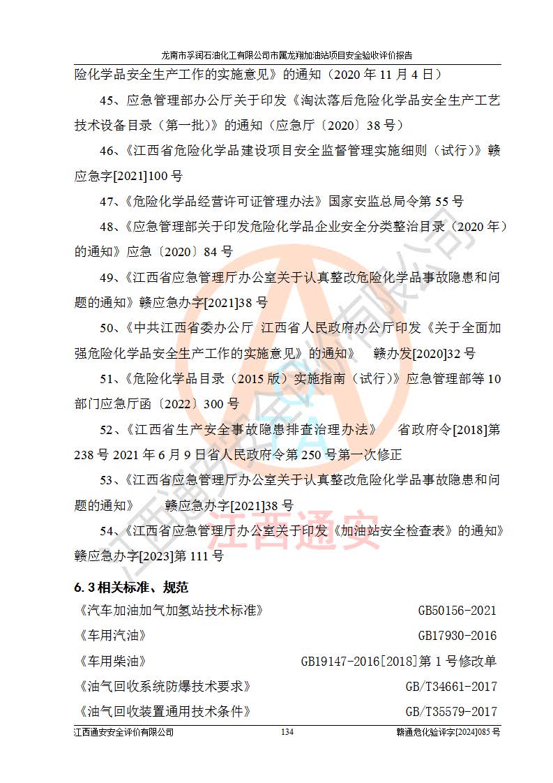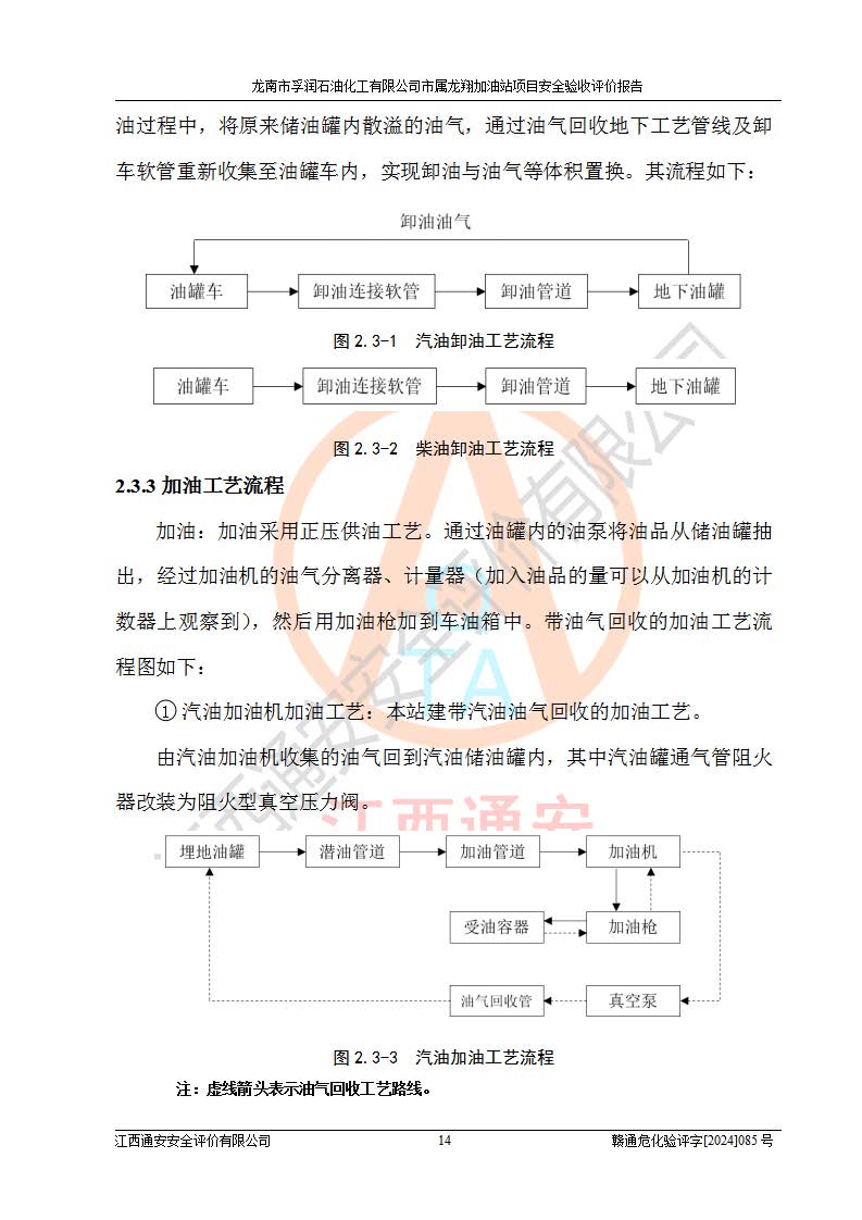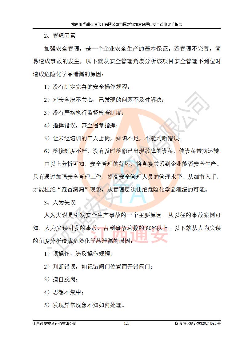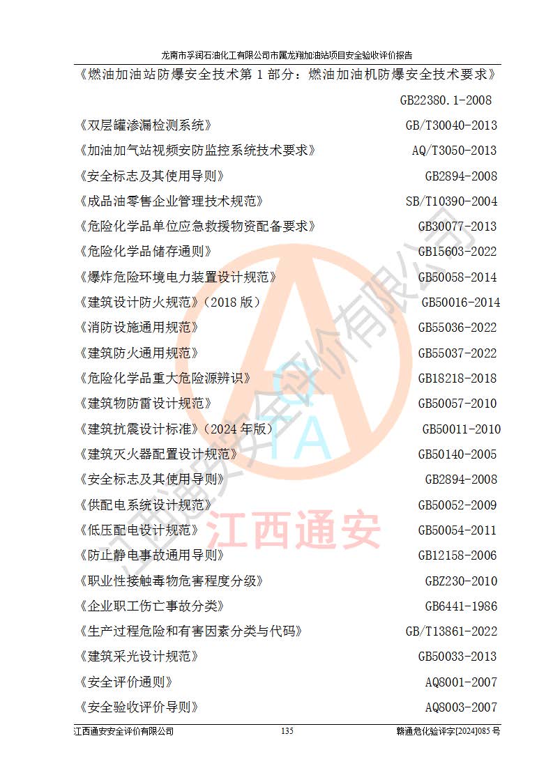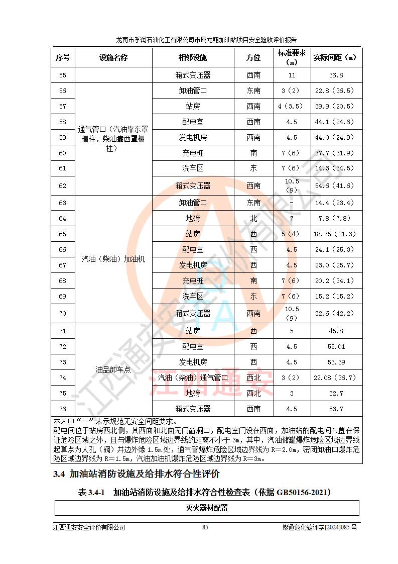 项目简介 | 龙南市孚润石油化工有限公司属于有限责任公司(非自然人投资或控股的法人独资企业),负责人徐宇波,统一社会信用代码:91360727MA3AD8RJ1A,经营范围包括许可项目:道路货物运输(含危险货物)(依法需经批准的项目,经相关部门批准后方可开展经营活动);一般项目:石油制品销售(不含危险化学品),化工产品销售(不含许可类化工产品)(除许可业务外,可自主依法经营法律法规非禁止或限制的项目)。 龙南市孚润石油化工有限公司市属龙翔加油站,2024年4月成立,是一家有限责任公司(非自然人投资或控股的法人独资),经营范围:许可项目:道路危险货物运输,成品油零售(不含危险化学品),烟草制品零售,食品销售(依法须经批准的项目,经相关部门批准后在许可**期内方可开展经营活动,具体经营项目和许可期限以相关部门批准文件或许可证件为准)一般项目食品销售(仅销售预包装食品),保健食品(预装)销售日用百货销售,**化学产品销售(不含危险化学品),润滑油销售,输配电及控制设备制造,化工产品销售(不含许可类化工产品),石油制品销售(不含危险化学品),机动车充电销售(除依法须经批准的项日外,凭营业执照依法自主开展经营活动)。 在江西省赣州市龙南市龙南经济技术开发区高铁新区龙南大道南侧地块建造二级加油站一座,加油站名称为龙南市孚润石油化工有限公司市属龙翔加油站(以下简称龙翔加油站)。龙翔加油站主要经营汽油、柴油,赣州市行政审批局对加油站地点予以规划确认(赣市行审证(3)字[2024]1号),该站建设用地面积约3462.8m2,经龙南市自然资源局审批同意加油站建设用地,取得建设用地规划许可证(地字第3607832024YG0009480号)和土地不动产权证(编号为:36020229990);已取得江西省企业投资项目备案通知书(项目统一代码为:2401-360727-04-01-236686),2024年6月18日已取得赣州市行政审批局出具的安全条件审查批复,2024年8月20日已取得赣州市市行政审批局出具的安全设施设计审查批复。设计单位为海湾工程有限公司(化工石化医药行业**),建筑施工单位为江西洛宣建设工程有限公司(建筑工程施工总承包壹级),设备安装施工单位为江西华锦石油化工设备有限公司(石油化工工程总承包叁级),监理单位为中成建充集团有限公司(可承担所有专业工程类别建设工程项目的工程监理业务)以及江西文中云工程管理有限公司(房屋建筑工程监理乙级等资质),中成建充集团有限公司负责设备监理,江西文中云工程管理有限公司负责土建监理。目前该加油站已完成建设。 加油站用地面积为3462.8m2,该加油站站内设6台多油品4枪潜油泵加油机,储罐区设置92#汽油罐25m3×1个、95#汽油罐50m3×1个、92#汽油罐50m3×1个、0#柴油罐50m3×1个,折算容量为150m3,按《汽车加油加气加氢站技术标准》(GB50156-2021)为二级加油站。该站属二级加油站。 汽油为危险化学品,其蒸汽与空气形成爆炸性气体,遇明火、高热易燃烧爆炸,火险分级为甲B类,是重点监管和特别管控危险化学品;柴油为危险化学品,火险分级为丙A类,遇明火、高热或与氧化剂接触,有引起燃烧爆炸的危险。因此,本项目存在的主要危险有害因素是火灾、爆炸、中毒窒息。 根据《中华人民共和国安全生产法》(主席令〔2002〕第13号发布,主席令〔2021〕第88号修订)、《危险化学品安全管理条例》(***第591号令)、《危险化学品经营许可证管理办法》(安监总局令第55号,安监总局令第79号修正)、《危险化学品建设项目安全监督管理办法》(**安全生产监督管理总局45号令,安监总局令第79号修正)、《江西省危险化学品建设项目安全监督管理实施细则(试行)》赣应急字【2021】100号文的要求,企业应对项目进行安全验收评价,以判断工程项目在劳动安全卫生方面对**及行业有关的标准和法规的符合性,并检查相关安全配套设施“三同时”的**性。 受龙南市孚润石油化工有限公司市属龙翔加油站的委托,江西通安安全评价有限公司承担其项目安全验收评价工作,于2024年10月组成评价小组,对所提供的资料、文件进行了审核,对现场进行了实地检测,根据《安全评价通则》AQ8001-2007和《危险化学品建设项目安全评价细则(试行)》(安监总危化[2007]255号)要求,编写此评价报告。 | ||||