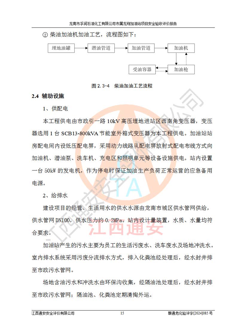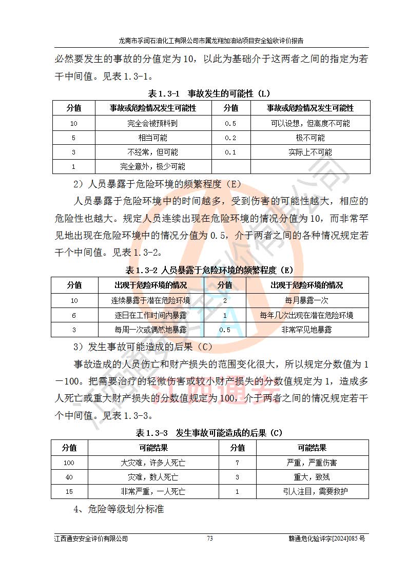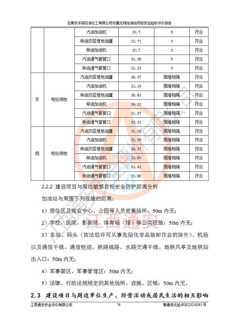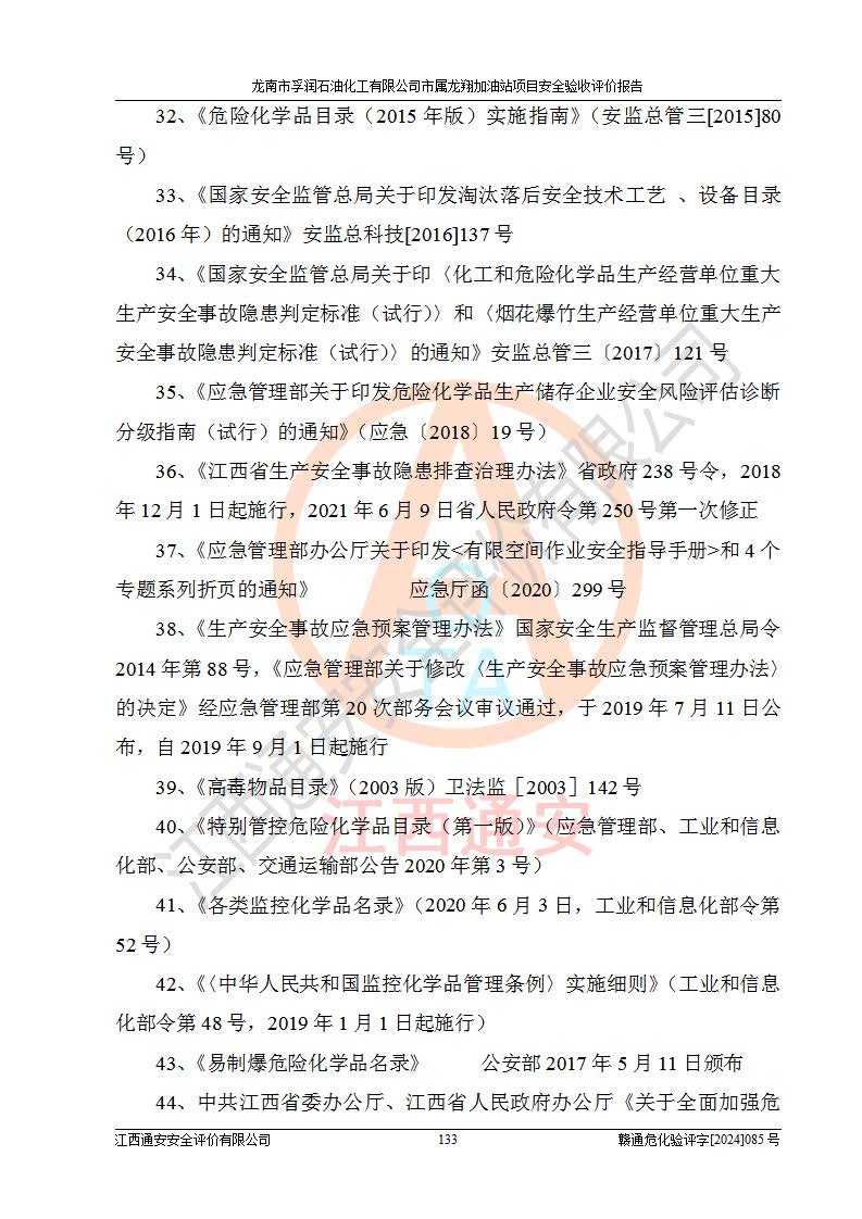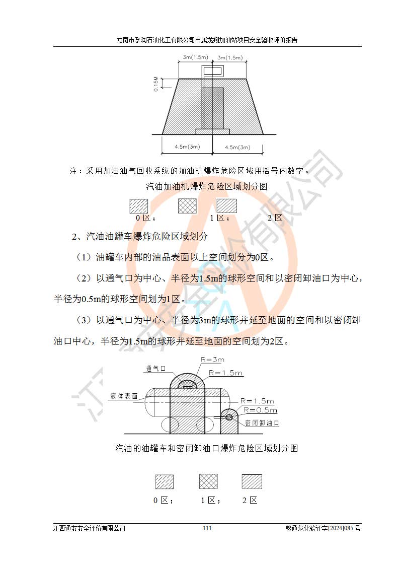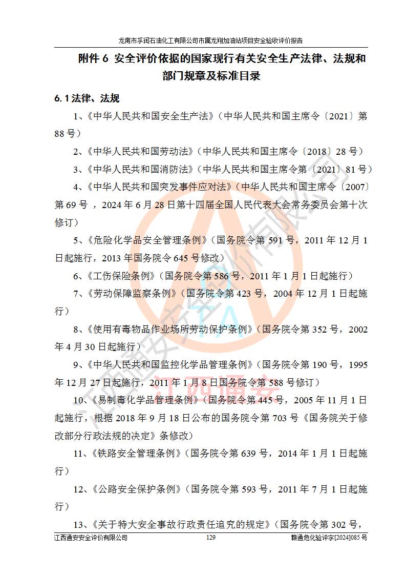 项目简介 | 龙南市孚润石油化工有限公司属于有限责任公司(非自然人投资或控股的法人独资企业),负责人徐宇波,统一社会信用代码:91360727MA3AD8RJ1A,经营范围包括许可项目:道路货物运输(含危险货物)(依法需经批准的项目,经相关部门批准后方可开展经营活动);一般项目:石油制品销售(不含危险化学品),化工产品销售(不含许可类化工产品)(除许可业务外,可自主依法经营法律法规非禁止或限制的项目)。 龙南市孚润石油化工有限公司市属龙翔加油站,2024年4月成立,是一家有限责任公司(非自然人投资或控股的法人独资),经营范围:许可项目:道路危险货物运输,成品油零售(不含危险化学品),烟草制品零售,食品销售(依法须经批准的项目,经相关部门批准后在许可**期内方可开展经营活动,具体经营项目和许可期限以相关部门批准文件或许可证件为准)一般项目食品销售(仅销售预包装食品),保健食品(预装)销售日用百货销售,**化学产品销售(不含危险化学品),润滑油销售,输配电及控制设备制造,化工产品销售(不含许可类化工产品),石油制品销售(不含危险化学品),机动车充电销售(除依法须经批准的项日外,凭营业执照依法自主开展经营活动)。 在江西省赣州市龙南市龙南经济技术开发区高铁新区龙南大道南侧地块建造二级加油站一座,加油站名称为龙南市孚润石油化工有限公司市属龙翔加油站(以下简称龙翔加油站)。龙翔加油站主要经营汽油、柴油,赣州市行政审批局对加油站地点予以规划确认(赣市行审证(3)字[2024]1号),该站建设用地面积约3462.8m2,经龙南市自然资源局审批同意加油站建设用地,取得建设用地规划许可证(地字第3607832024YG0009480号)和土地不动产权证(编号为:36020229990);已取得江西省企业投资项目备案通知书(项目统一代码为:2401-360727-04-01-236686),2024年6月18日已取得赣州市行政审批局出具的安全条件审查批复,2024年8月20日已取得赣州市市行政审批局出具的安全设施设计审查批复。设计单位为海湾工程有限公司(化工石化医药行业**),建筑施工单位为江西洛宣建设工程有限公司(建筑工程施工总承包壹级),设备安装施工单位为江西华锦石油化工设备有限公司(石油化工工程总承包叁级),监理单位为中成建充集团有限公司(可承担所有专业工程类别建设工程项目的工程监理业务)以及江西文中云工程管理有限公司(房屋建筑工程监理乙级等资质),中成建充集团有限公司负责设备监理,江西文中云工程管理有限公司负责土建监理。目前该加油站已完成建设。 加油站用地面积为3462.8m2,该加油站站内设6台多油品4枪潜油泵加油机,储罐区设置92#汽油罐25m3×1个、95#汽油罐50m3×1个、92#汽油罐50m3×1个、0#柴油罐50m3×1个,折算容量为150m3,按《汽车加油加气加氢站技术标准》(GB50156-2021)为二级加油站。该站属二级加油站。 汽油为危险化学品,其蒸汽与空气形成爆炸性气体,遇明火、高热易燃烧爆炸,火险分级为甲B类,是重点监管和特别管控危险化学品;柴油为危险化学品,火险分级为丙A类,遇明火、高热或与氧化剂接触,有引起燃烧爆炸的危险。因此,本项目存在的主要危险有害因素是火灾、爆炸、中毒窒息。 根据《中华人民共和国安全生产法》(主席令〔2002〕第13号发布,主席令〔2021〕第88号修订)、《危险化学品安全管理条例》(***第591号令)、《危险化学品经营许可证管理办法》(安监总局令第55号,安监总局令第79号修正)、《危险化学品建设项目安全监督管理办法》(**安全生产监督管理总局45号令,安监总局令第79号修正)、《江西省危险化学品建设项目安全监督管理实施细则(试行)》赣应急字【2021】100号文的要求,企业应对项目进行安全验收评价,以判断工程项目在劳动安全卫生方面对**及行业有关的标准和法规的符合性,并检查相关安全配套设施“三同时”的**性。 受龙南市孚润石油化工有限公司市属龙翔加油站的委托,江西通安安全评价有限公司承担其项目安全验收评价工作,于2024年10月组成评价小组,对所提供的资料、文件进行了审核,对现场进行了实地检测,根据《安全评价通则》AQ8001-2007和《危险化学品建设项目安全评价细则(试行)》(安监总危化[2007]255号)要求,编写此评价报告。 | ||||