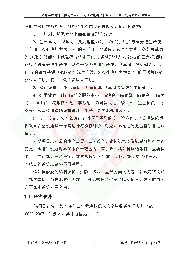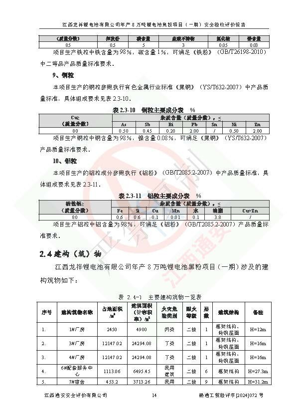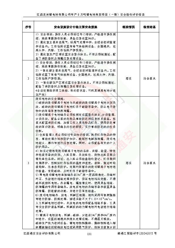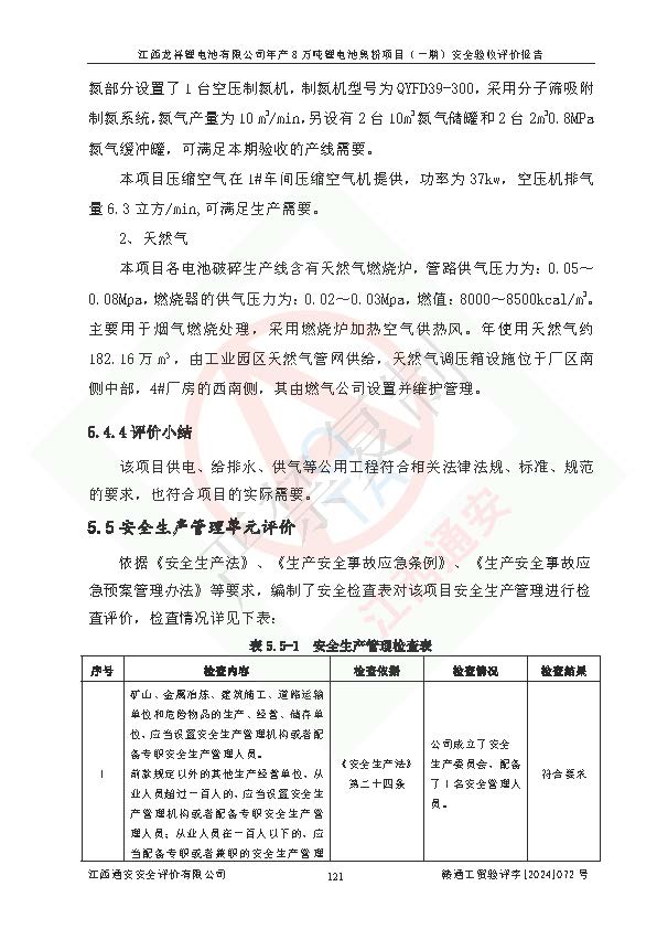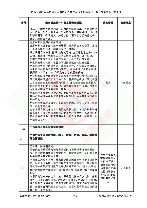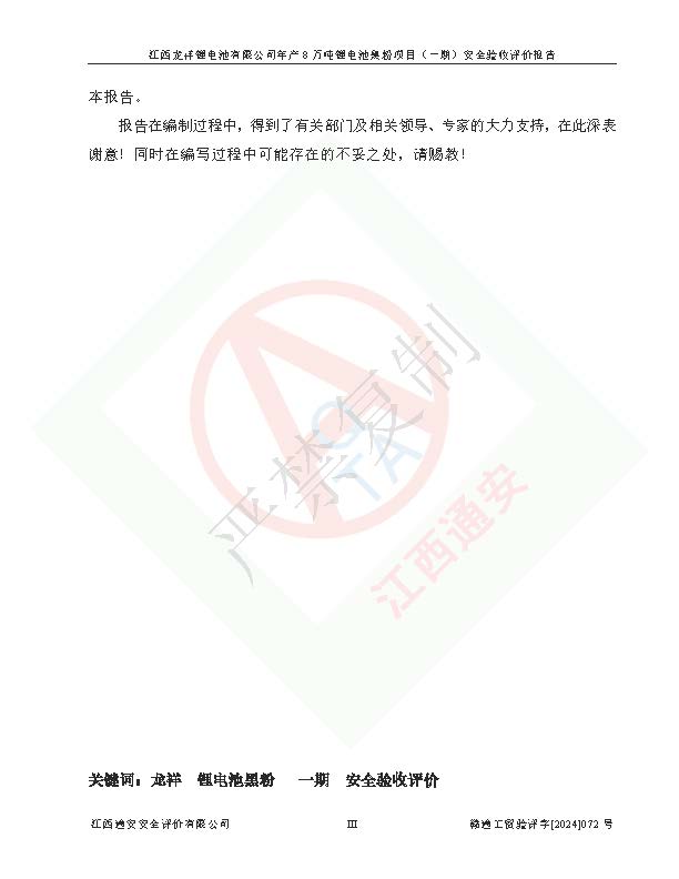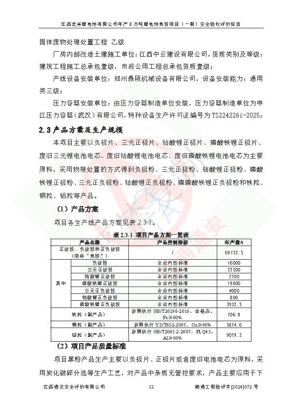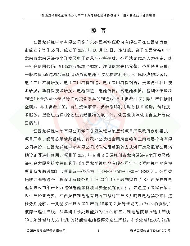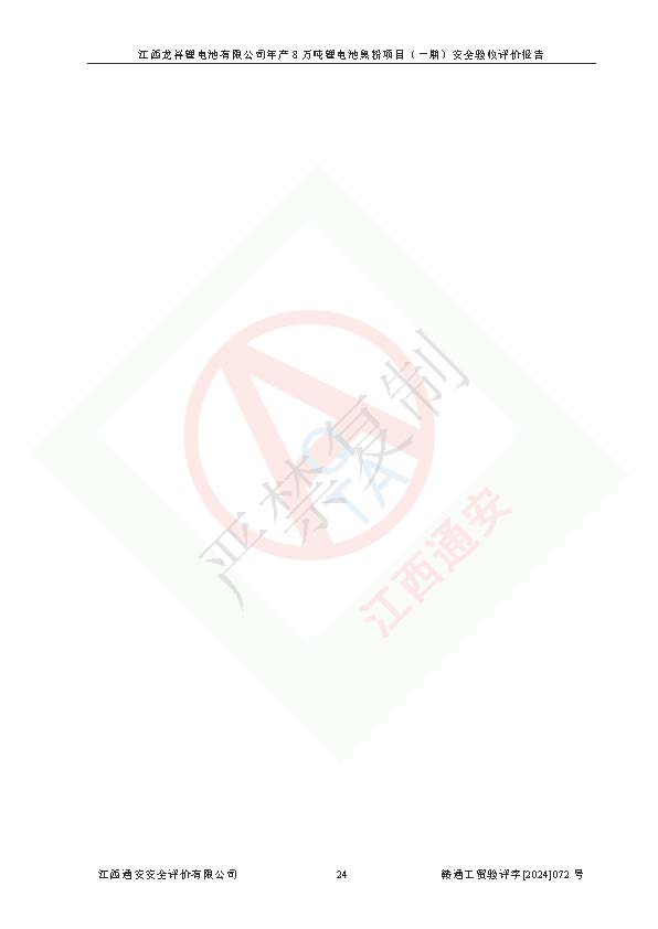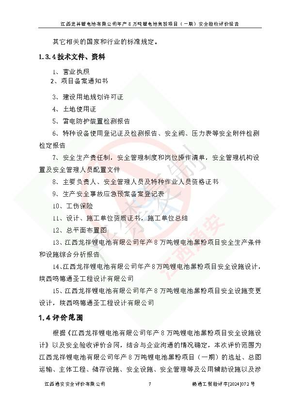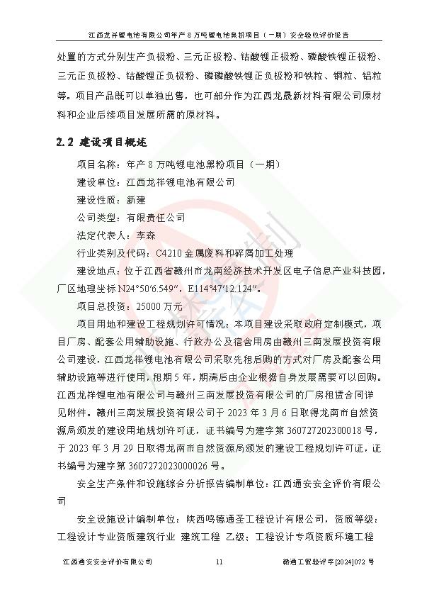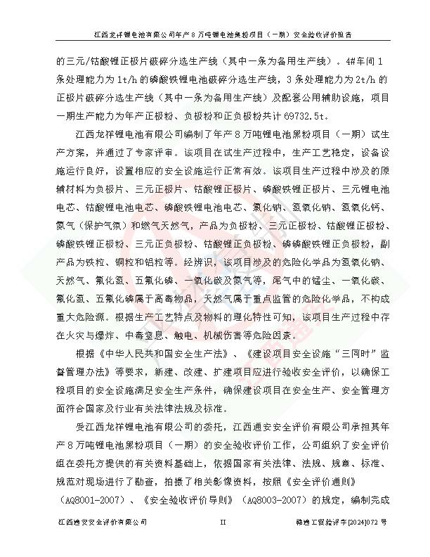 项目名称 | 江西龙祥锂电池有限公司年产8万吨锂电池黑粉项目(一期)安全验收评价报告 | ||||