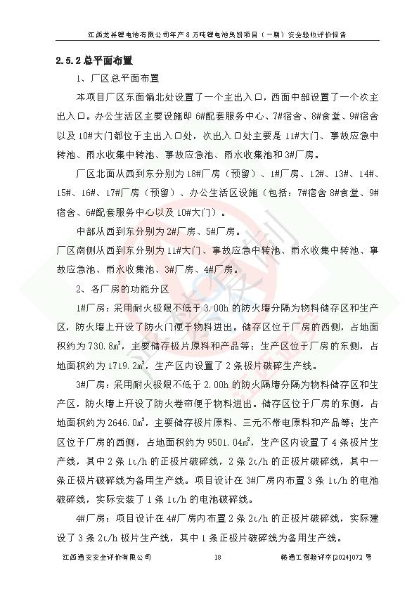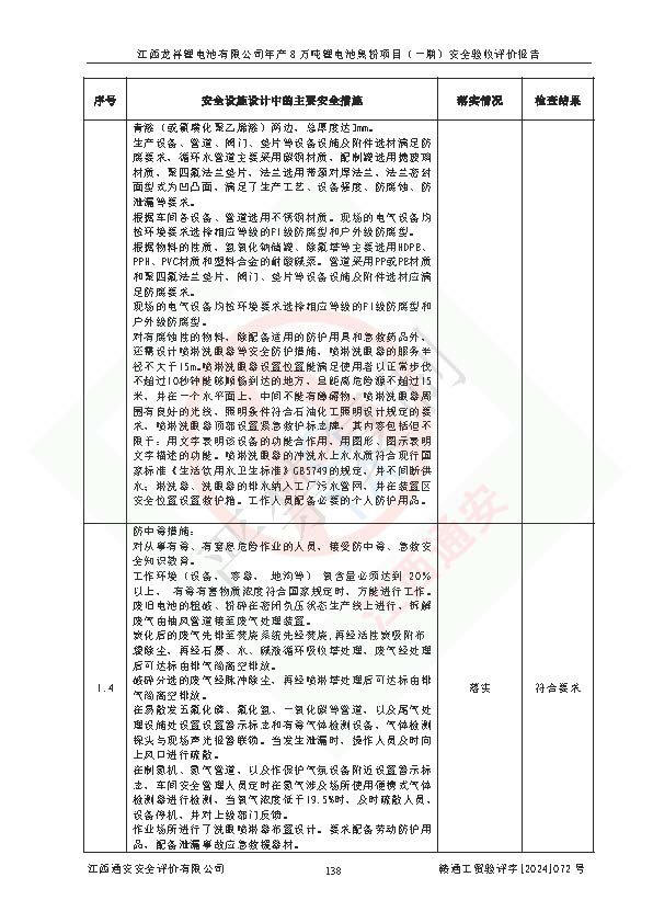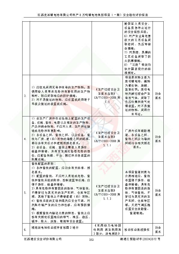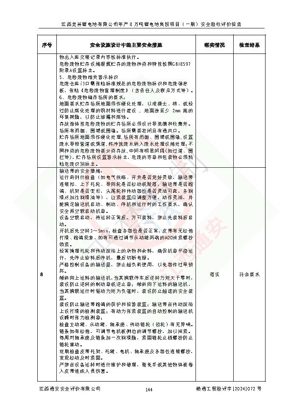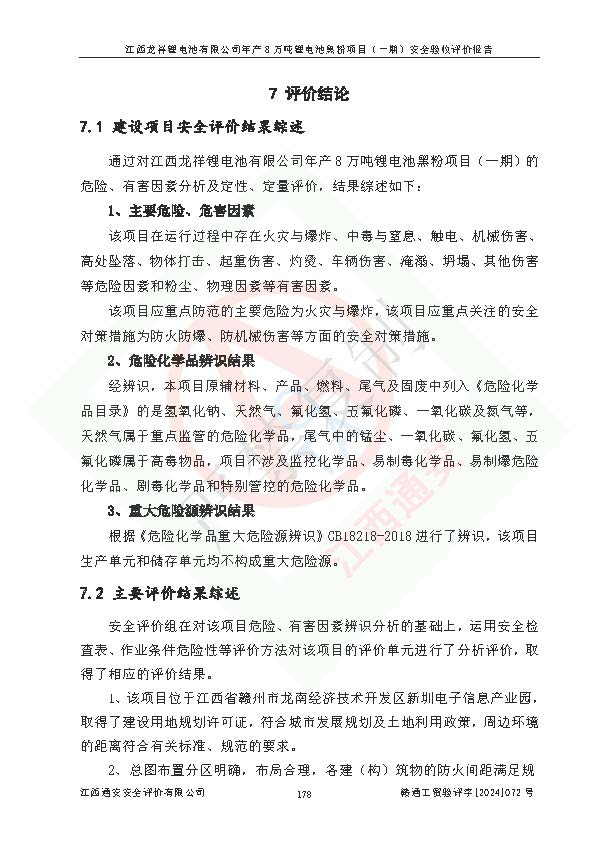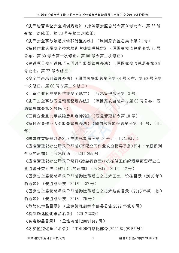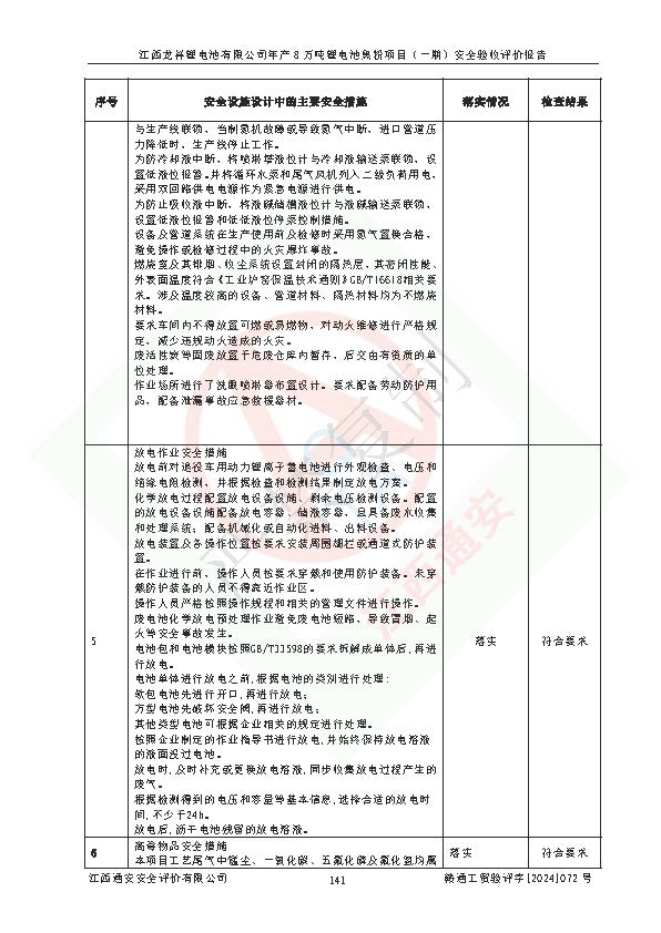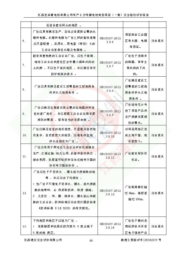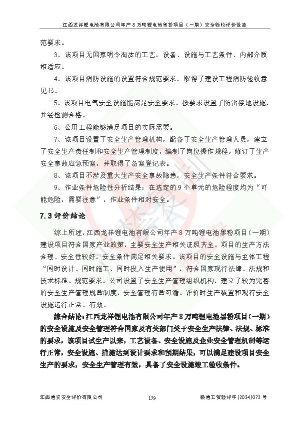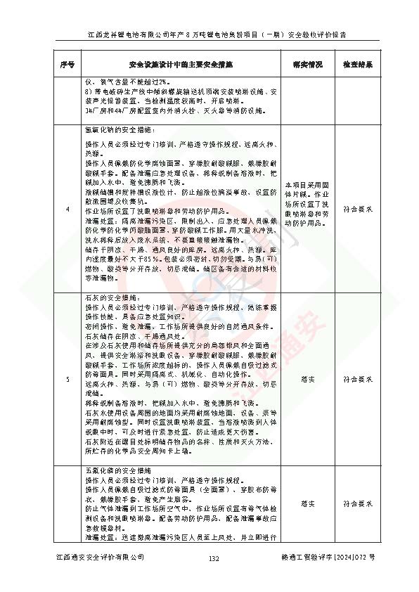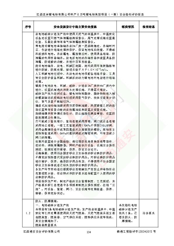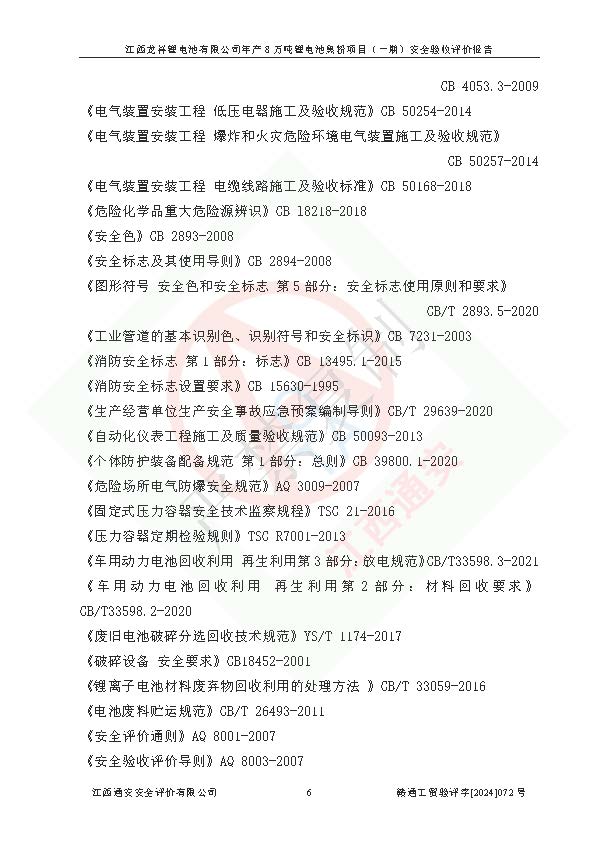 项目名称 | 江西龙祥锂电池有限公司年产8万吨锂电池黑粉项目(一期)安全验收评价报告 | ||||