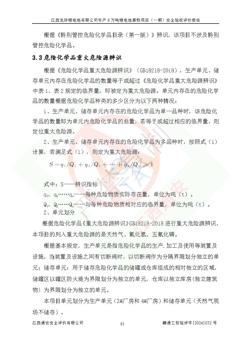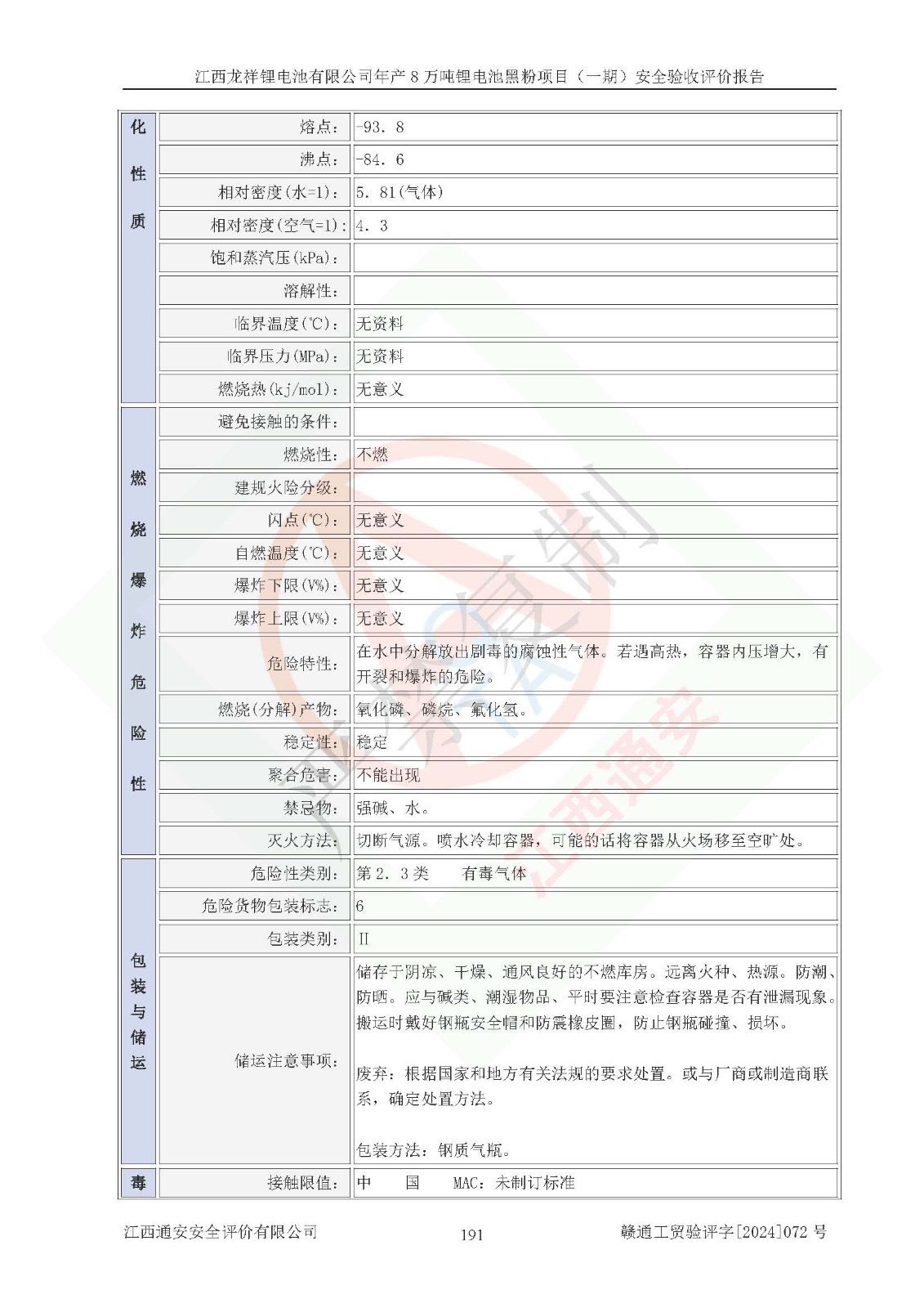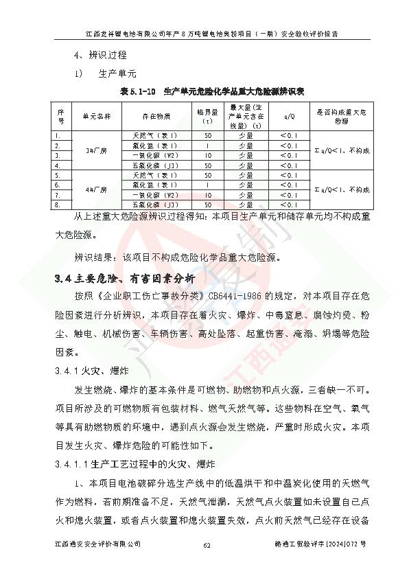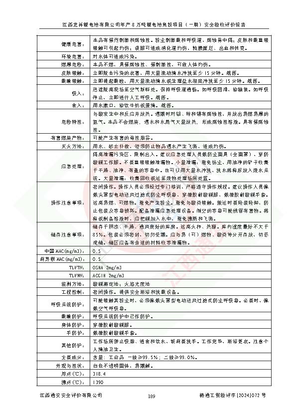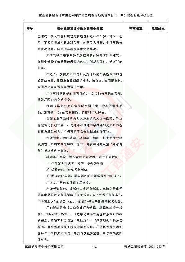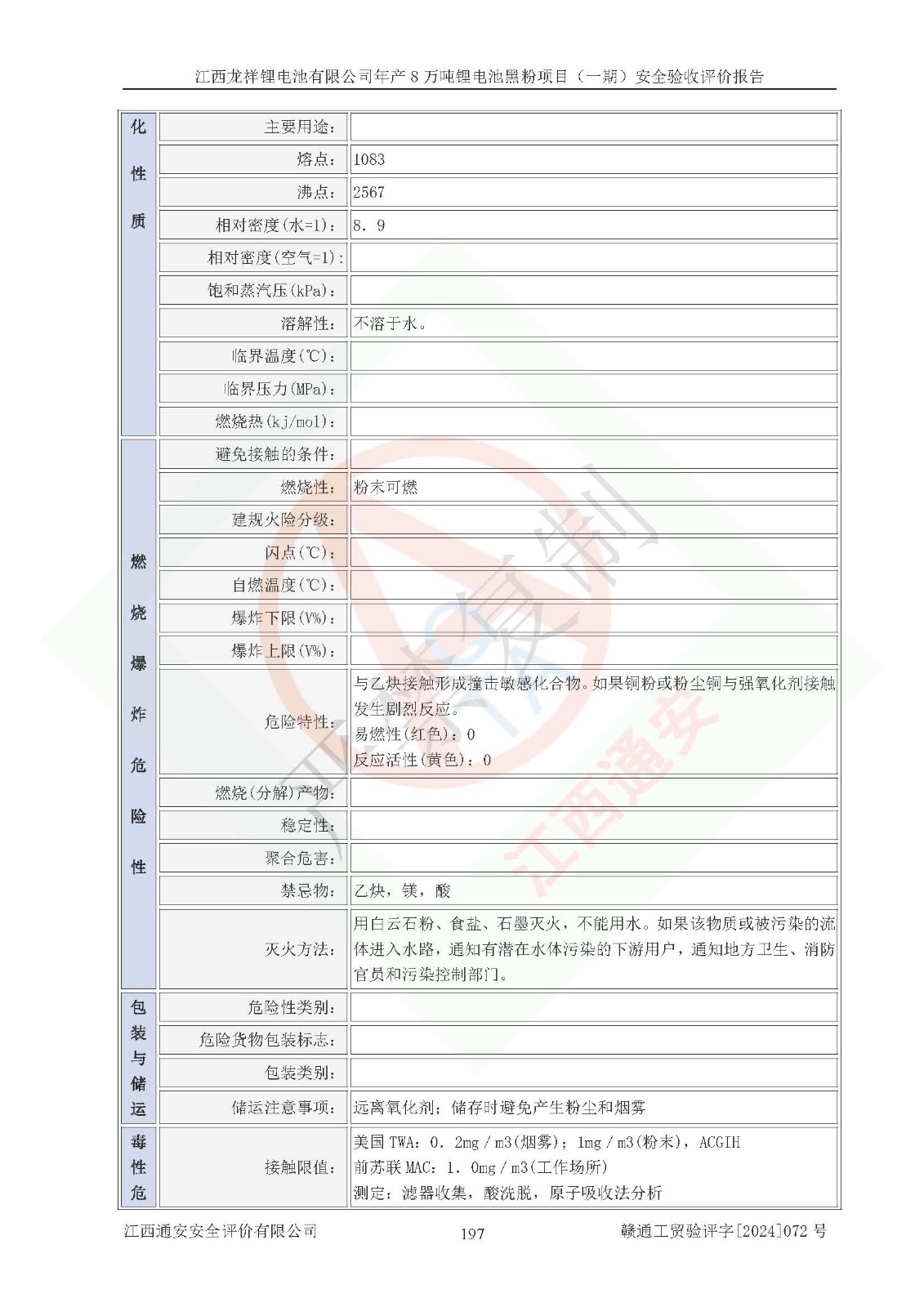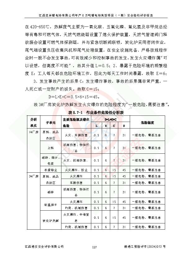 其它 | 通过对江西龙祥锂电池有限公司年产8万吨锂电池黑粉项目(一期)的危险、有害因素分析及定性、定量评价,结果综述如下: 1、主要危险、危害因素 该项目在运行过程中存在火灾与爆炸、中毒与窒息、触电、机械伤害、高处坠落、物体打击、起重伤害、灼烫、**伤害、淹溺、坍塌、其他伤害等危险因素和粉尘、物理因素等有害因素。 该项目应重点防范的主要危险为火灾与爆炸,该项目应重点关注的安全对策措施为防火防爆、防机械伤害等方面的安全对策措施。 2、危险化学品辨识结果 经辨识,本项目原辅材料、产品、燃料、尾气及固废中列入《危险化学品目录》的是氢氧化钠、天然气、氟化氢、五氟化磷、一氧化碳及氮气等,天然气属于重点监管的危险化学品,尾气中的锰尘、一氧化碳、氟化氢、五氟化磷属于高毒物品,项目不涉及监控化学品、易制毒化学品、易制爆危险化学品、剧毒化学品和特别管控的危险化学品。 3、重大危险源辨识结果 根据《危险化学品重大危险源辨识》GB18218-2018进行了辨识,该项目生产单元和储存单元均不构成重大危险源。 安全评价组在对该项目危险、有害因素辨识分析的基础上,运用安全检查表、作业条件危险性等评价方法对该项目的评价单元进行了分析评价,取得了相应的评价结果。 1、该项目位于江西省赣州市龙南经济技术开发区新圳电子信息产业园,取得了建设用地规划许可证,符合城市发展规划及土地利用政策,周边环境的距离符合有关标准、规范的要求。 2、总图布置分区明确,布局合理,各建(构)筑物的防火间距满足规范要求。 3、该项目无**明令淘汰的工艺,设备、设施与工艺条件、内部介质相适应。 4、该项目消防设施的设置符合规范要求,取得了建设工程消防验收意见书。 5、该项目电气安全设施能满足安全要求,按要求设置了防雷接地设施,并经检测合格。 6、公用工程能够满足项目的实际需要。 7、该项目设置了安全生产管理机构,配备了安全生产管理人员,建立了安全生产责任制和安全生产管理制度,编制了岗位操作规程,修订了生产安全事故应急预案,并取得了备案登记表。 8、该项目不涉及重大生产安全事故隐患,安全生产条件符合要求。 9、作业条件危险性分析结果:在选定的9个单元的危险程度均为“可能危险,需要注意”,作业条件相对安全。 评价结论 综上所述,江西龙祥锂电池有限公司年产8万吨锂电池黑粉项目(一期)建设项目符合**产业政策,主要安全生产相关证照齐全,项目的生产方法合理、安全性较好,安全条件满足相关要求。该项目的安全设施与主体工程“同时设计、同时施工、同时投入生产使用”,符合**现行法律、法规和技术标准、规范要求。公司设置了安全生产管理组织机构,建立了较为完善的安全生产管理规章制度,安全管理有章可循。评价时生产装置和现有安全设施运行正常、**。 综合结论:江西龙祥锂电池有限公司年产8万吨锂电池黑粉项目(一期)的安全设施及安全管理符合**及有关部门关于安全生产法律、法规、标准的要求,该项目试生产以来,工艺设备、安全设施及企业安全管理机制等运行正常,安全设施、措施达到设计要求和预期结果,可以满足建设项目安全生产的要求,安全生产管理**,具备了安全设施竣工验收条件。
