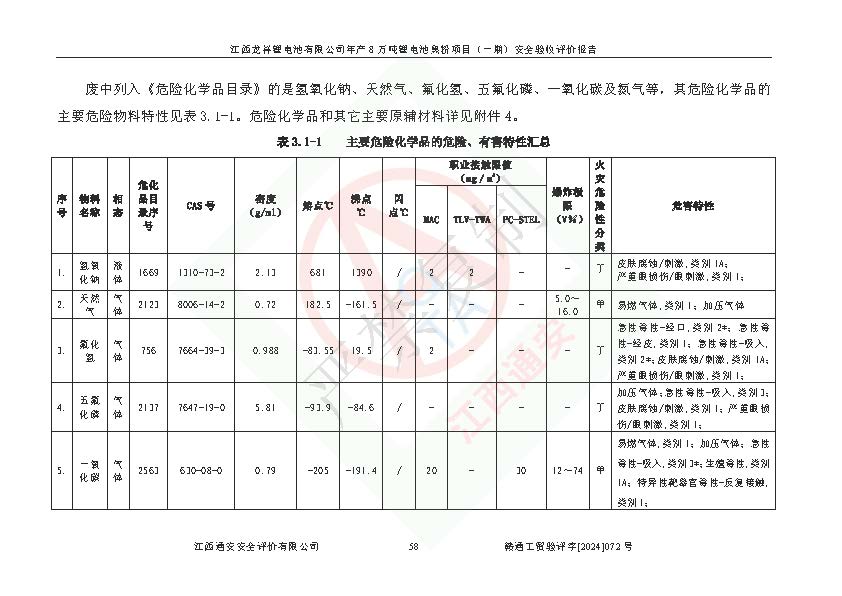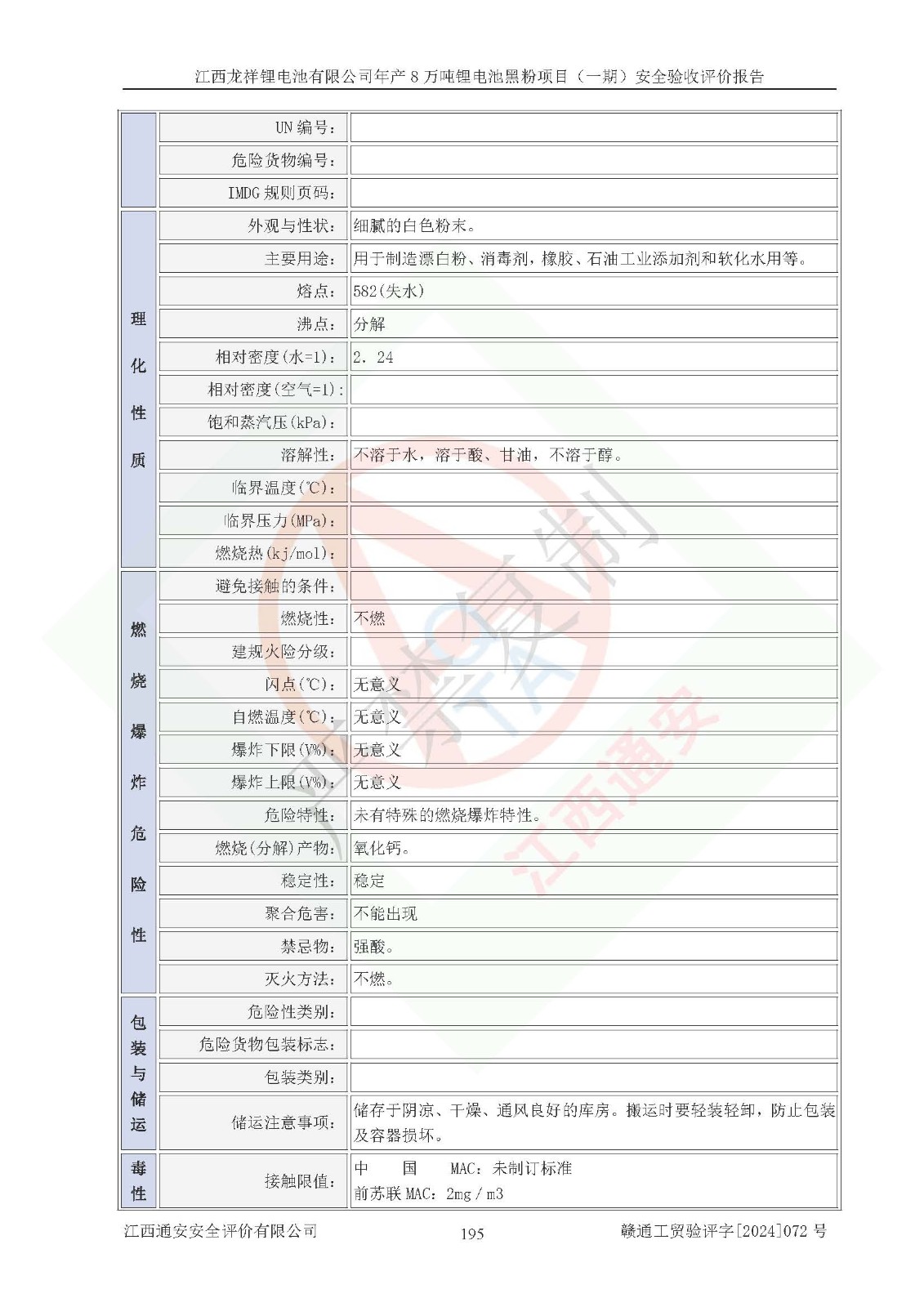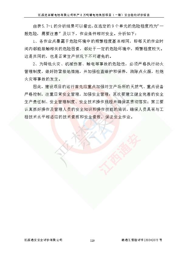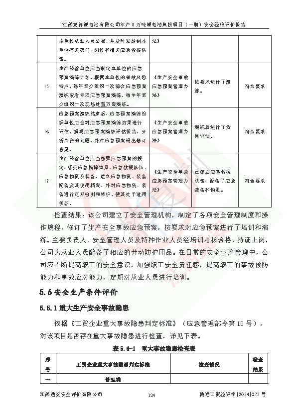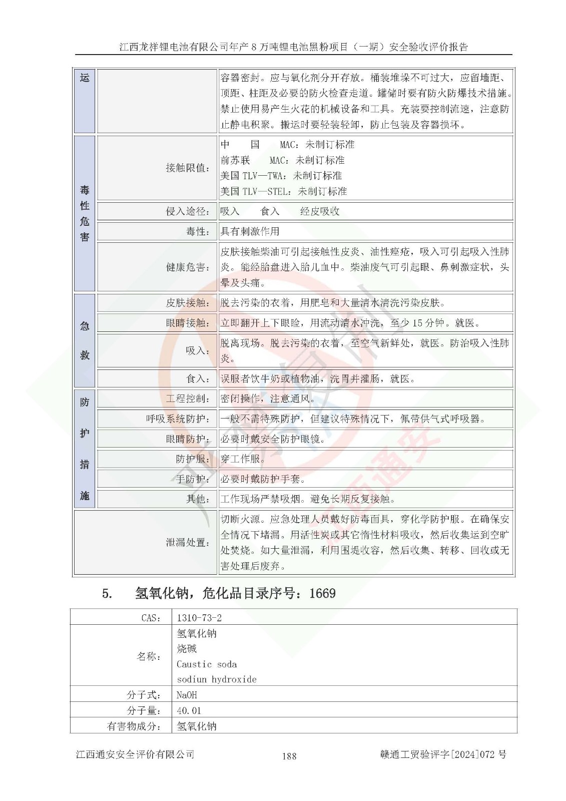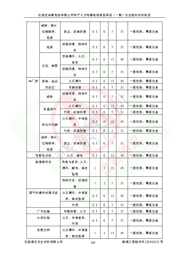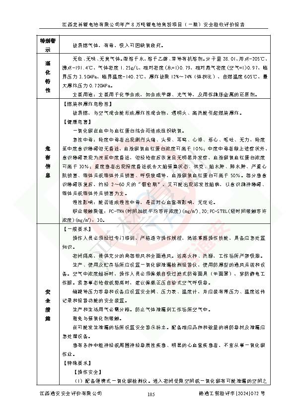其它 | 通过对江西龙祥锂电池有限公司年产8万吨锂电池黑粉项目(一期)的危险、有害因素分析及定性、定量评价,结果综述如下: 1、主要危险、危害因素 该项目在运行过程中存在火灾与爆炸、中毒与窒息、触电、机械伤害、高处坠落、物体打击、起重伤害、灼烫、**伤害、淹溺、坍塌、其他伤害等危险因素和粉尘、物理因素等有害因素。 该项目应重点防范的主要危险为火灾与爆炸,该项目应重点关注的安全对策措施为防火防爆、防机械伤害等方面的安全对策措施。 2、危险化学品辨识结果 经辨识,本项目原辅材料、产品、燃料、尾气及固废中列入《危险化学品目录》的是氢氧化钠、天然气、氟化氢、五氟化磷、一氧化碳及氮气等,天然气属于重点监管的危险化学品,尾气中的锰尘、一氧化碳、氟化氢、五氟化磷属于高毒物品,项目不涉及监控化学品、易制毒化学品、易制爆危险化学品、剧毒化学品和特别管控的危险化学品。 3、重大危险源辨识结果 根据《危险化学品重大危险源辨识》GB18218-2018进行了辨识,该项目生产单元和储存单元均不构成重大危险源。 安全评价组在对该项目危险、有害因素辨识分析的基础上,运用安全检查表、作业条件危险性等评价方法对该项目的评价单元进行了分析评价,取得了相应的评价结果。 1、该项目位于江西省赣州市龙南经济技术开发区新圳电子信息产业园,取得了建设用地规划许可证,符合城市发展规划及土地利用政策,周边环境的距离符合有关标准、规范的要求。 2、总图布置分区明确,布局合理,各建(构)筑物的防火间距满足规范要求。 3、该项目无**明令淘汰的工艺,设备、设施与工艺条件、内部介质相适应。 4、该项目消防设施的设置符合规范要求,取得了建设工程消防验收意见书。 5、该项目电气安全设施能满足安全要求,按要求设置了防雷接地设施,并经检测合格。 6、公用工程能够满足项目的实际需要。 7、该项目设置了安全生产管理机构,配备了安全生产管理人员,建立了安全生产责任制和安全生产管理制度,编制了岗位操作规程,修订了生产安全事故应急预案,并取得了备案登记表。 8、该项目不涉及重大生产安全事故隐患,安全生产条件符合要求。 9、作业条件危险性分析结果:在选定的9个单元的危险程度均为“可能危险,需要注意”,作业条件相对安全。 评价结论 综上所述,江西龙祥锂电池有限公司年产8万吨锂电池黑粉项目(一期)建设项目符合**产业政策,主要安全生产相关证照齐全,项目的生产方法合理、安全性较好,安全条件满足相关要求。该项目的安全设施与主体工程“同时设计、同时施工、同时投入生产使用”,符合**现行法律、法规和技术标准、规范要求。公司设置了安全生产管理组织机构,建立了较为完善的安全生产管理规章制度,安全管理有章可循。评价时生产装置和现有安全设施运行正常、**。 综合结论:江西龙祥锂电池有限公司年产8万吨锂电池黑粉项目(一期)的安全设施及安全管理符合**及有关部门关于安全生产法律、法规、标准的要求,该项目试生产以来,工艺设备、安全设施及企业安全管理机制等运行正常,安全设施、措施达到设计要求和预期结果,可以满足建设项目安全生产的要求,安全生产管理**,具备了安全设施竣工验收条件。