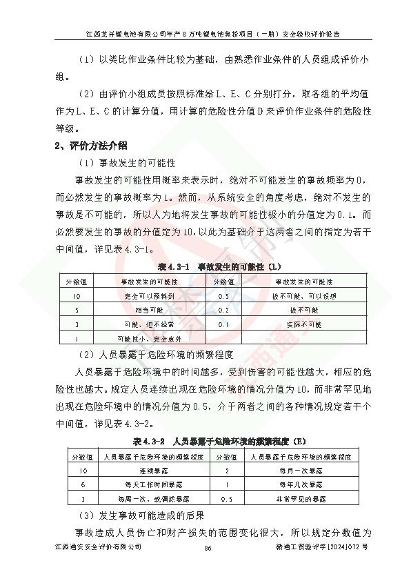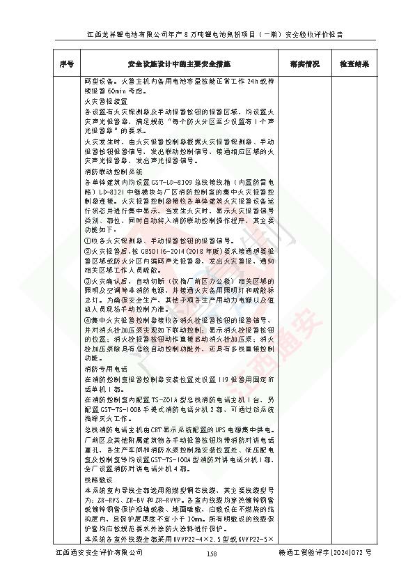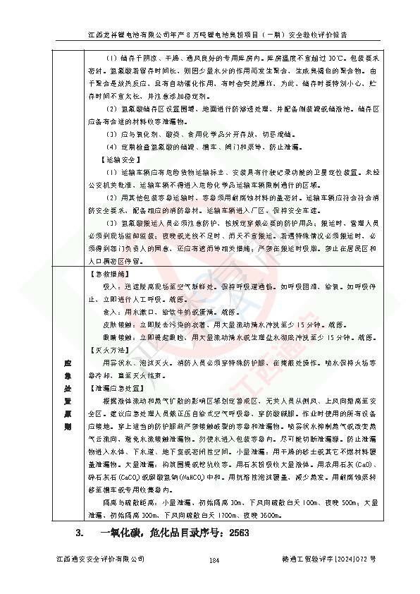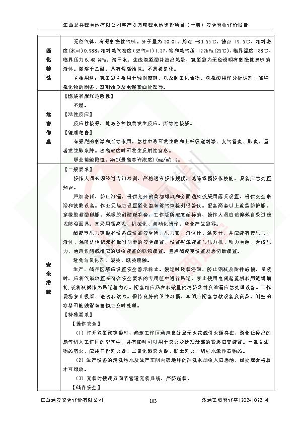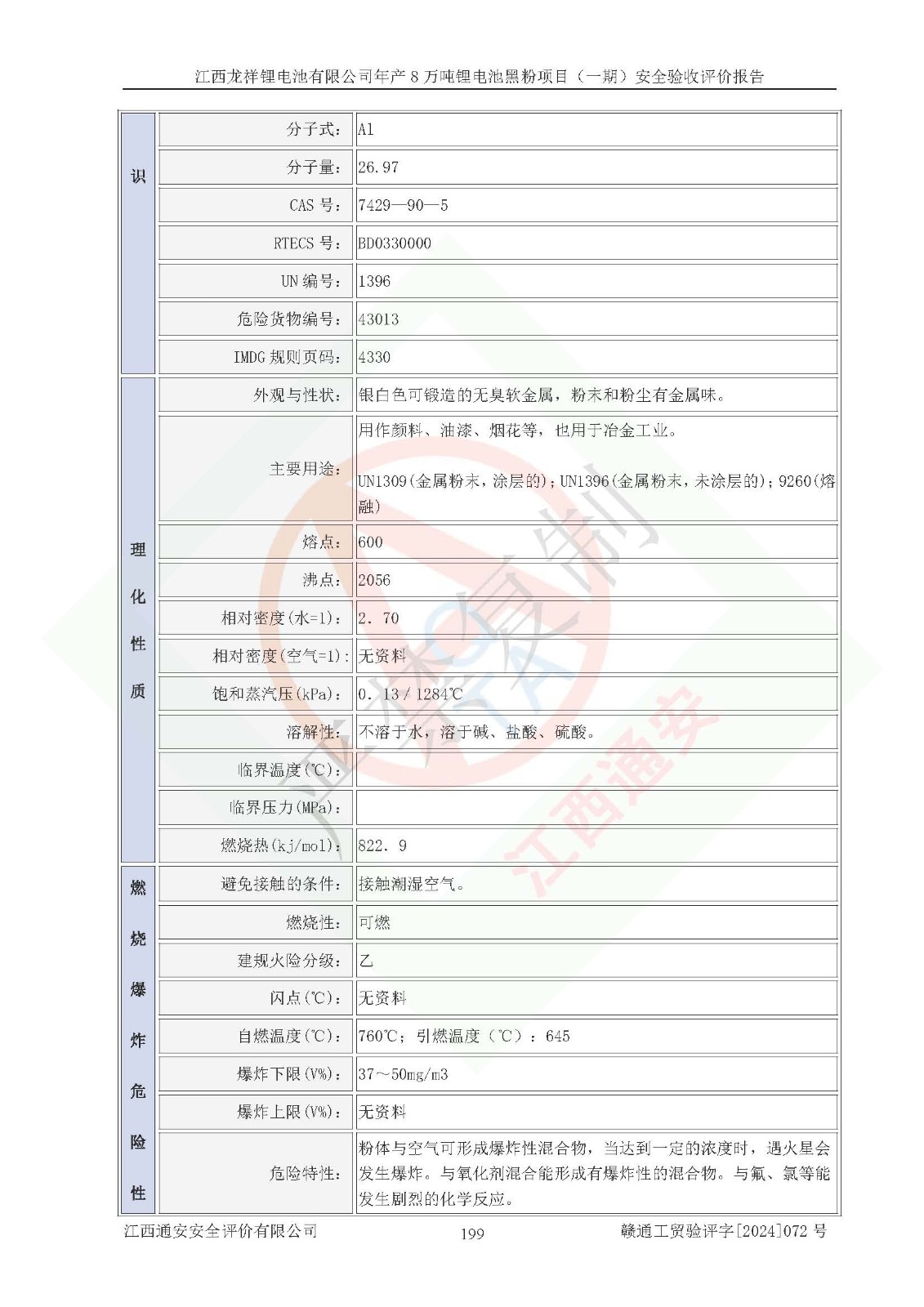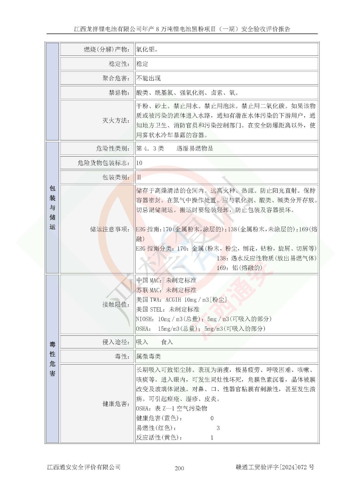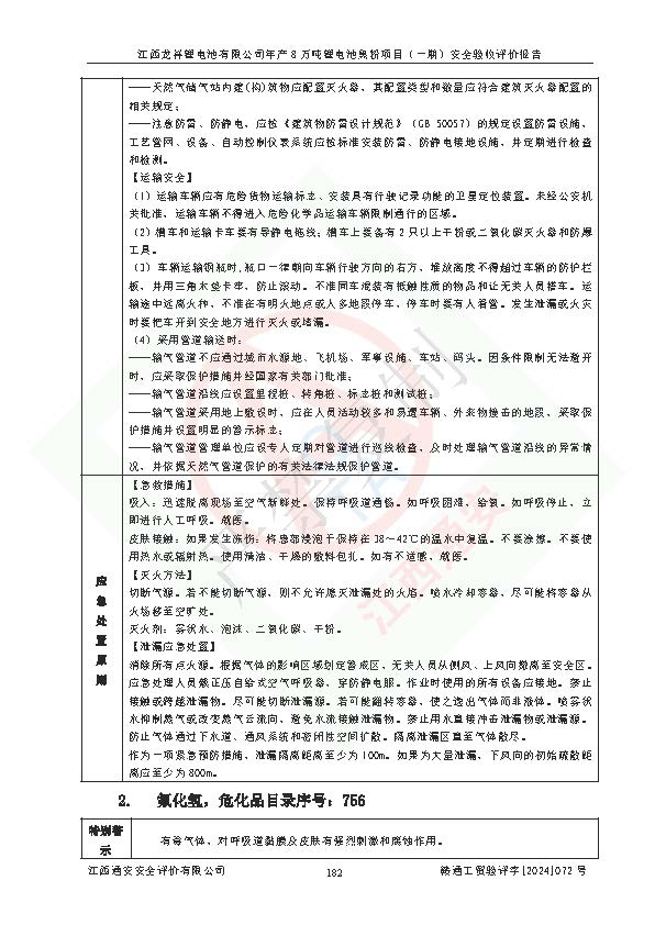 其它 | 通过对江西龙祥锂电池有限公司年产8万吨锂电池黑粉项目(一期)的危险、有害因素分析及定性、定量评价,结果综述如下: 1、主要危险、危害因素 该项目在运行过程中存在火灾与爆炸、中毒与窒息、触电、机械伤害、高处坠落、物体打击、起重伤害、灼烫、**伤害、淹溺、坍塌、其他伤害等危险因素和粉尘、物理因素等有害因素。 该项目应重点防范的主要危险为火灾与爆炸,该项目应重点关注的安全对策措施为防火防爆、防机械伤害等方面的安全对策措施。 2、危险化学品辨识结果 经辨识,本项目原辅材料、产品、燃料、尾气及固废中列入《危险化学品目录》的是氢氧化钠、天然气、氟化氢、五氟化磷、一氧化碳及氮气等,天然气属于重点监管的危险化学品,尾气中的锰尘、一氧化碳、氟化氢、五氟化磷属于高毒物品,项目不涉及监控化学品、易制毒化学品、易制爆危险化学品、剧毒化学品和特别管控的危险化学品。 3、重大危险源辨识结果 根据《危险化学品重大危险源辨识》GB18218-2018进行了辨识,该项目生产单元和储存单元均不构成重大危险源。 安全评价组在对该项目危险、有害因素辨识分析的基础上,运用安全检查表、作业条件危险性等评价方法对该项目的评价单元进行了分析评价,取得了相应的评价结果。 1、该项目位于江西省赣州市龙南经济技术开发区新圳电子信息产业园,取得了建设用地规划许可证,符合城市发展规划及土地利用政策,周边环境的距离符合有关标准、规范的要求。 2、总图布置分区明确,布局合理,各建(构)筑物的防火间距满足规范要求。 3、该项目无**明令淘汰的工艺,设备、设施与工艺条件、内部介质相适应。 4、该项目消防设施的设置符合规范要求,取得了建设工程消防验收意见书。 5、该项目电气安全设施能满足安全要求,按要求设置了防雷接地设施,并经检测合格。 6、公用工程能够满足项目的实际需要。 7、该项目设置了安全生产管理机构,配备了安全生产管理人员,建立了安全生产责任制和安全生产管理制度,编制了岗位操作规程,修订了生产安全事故应急预案,并取得了备案登记表。 8、该项目不涉及重大生产安全事故隐患,安全生产条件符合要求。 9、作业条件危险性分析结果:在选定的9个单元的危险程度均为“可能危险,需要注意”,作业条件相对安全。 评价结论 综上所述,江西龙祥锂电池有限公司年产8万吨锂电池黑粉项目(一期)建设项目符合**产业政策,主要安全生产相关证照齐全,项目的生产方法合理、安全性较好,安全条件满足相关要求。该项目的安全设施与主体工程“同时设计、同时施工、同时投入生产使用”,符合**现行法律、法规和技术标准、规范要求。公司设置了安全生产管理组织机构,建立了较为完善的安全生产管理规章制度,安全管理有章可循。评价时生产装置和现有安全设施运行正常、**。 综合结论:江西龙祥锂电池有限公司年产8万吨锂电池黑粉项目(一期)的安全设施及安全管理符合**及有关部门关于安全生产法律、法规、标准的要求,该项目试生产以来,工艺设备、安全设施及企业安全管理机制等运行正常,安全设施、措施达到设计要求和预期结果,可以满足建设项目安全生产的要求,安全生产管理**,具备了安全设施竣工验收条件。