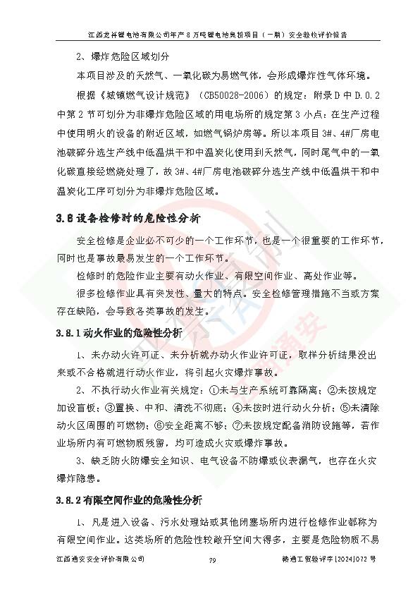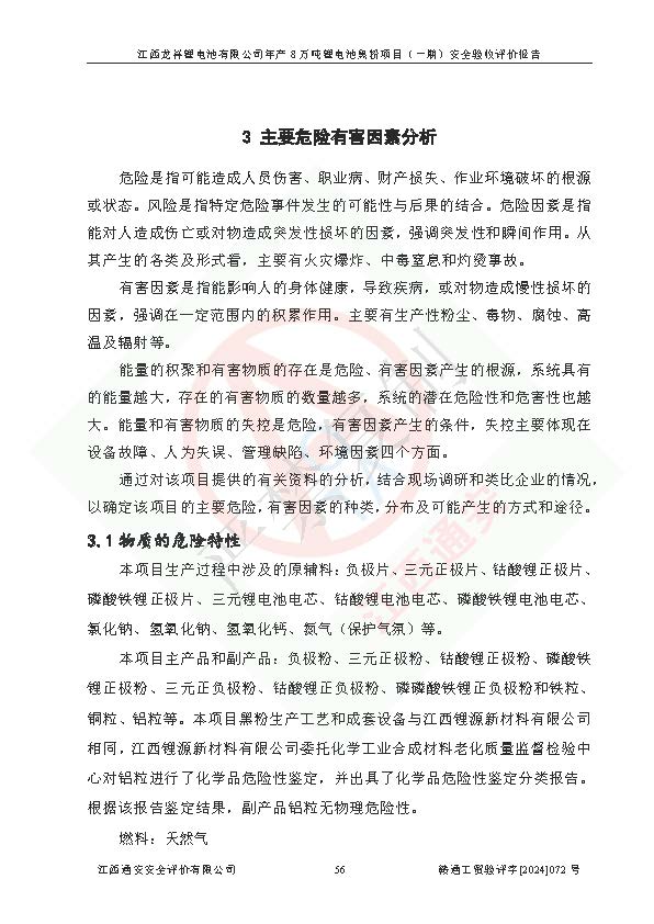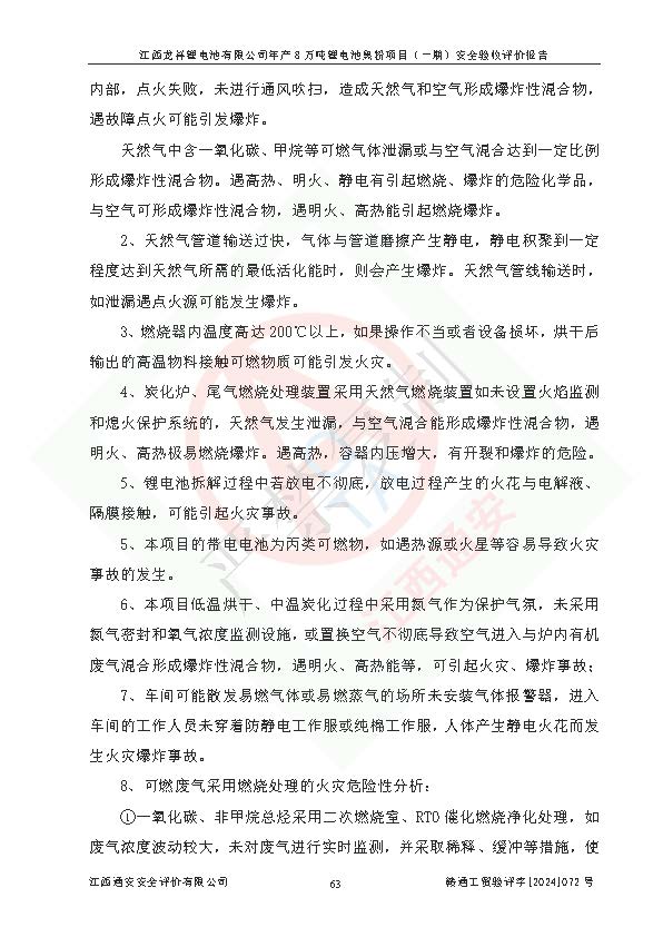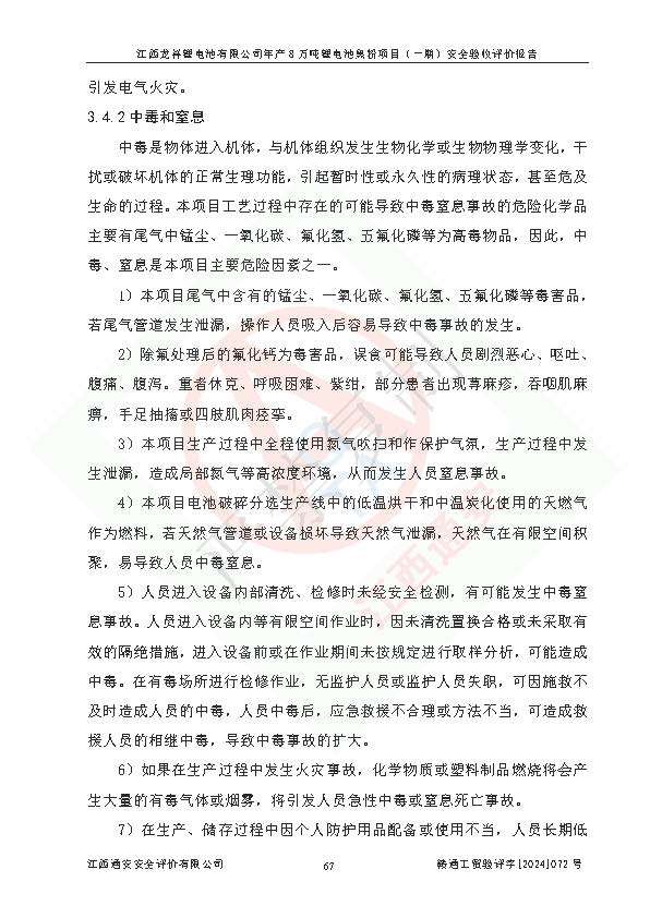 项目简介 | 江西龙祥锂电池有限公司是广东金晟新能源股份有限公司在江西省龙南市成立全资子公司,成立于2023年06月13日,注册地址位于江西省赣州市龙南市龙南经济技术开发区电子信息产业科技城,公司法定**人为李森,统一社会信用代码:91360727MACM2DH2X6,注册资本壹亿元整。公司经营范围:一般项目:新能源汽车废旧动力蓄电池回收及梯次利用(不含危险废物经营),电子**材料研发,电子**材料制造,电子**材料销售,资源再生利用技术研发,新材料技术研发,电池制造,电池销售,蓄电池租赁,基础化学原料制造(不含危险化学品等许可类化学品的制造),再生资源回收( 除生产性废旧金属),再生资源加工,再生资源销售,资源循环利用服务技术咨询,储能技术服务,货物进出口(除依法须经批准的项目外,凭营业执照依法自主开展经营活动)。 江西龙祥锂电池有限公司年产8万吨锂电池黑粉项目采取**定制模式,项目厂房、配套公用辅助设施、行政办公及宿舍用房由赣州三南发展投资有限公司建设,江西龙祥锂电池有限公司采取先租后购的方式对厂房及配套公用辅助设施等进行使用。项目于2023年8月8日经赣州市龙南经济技术开发区经济社会发展局核发并出具了《江西龙祥锂电池有限公司年产8万吨锂电池黑粉项目备案的通知》(项目统一代码为:2308-360797-04-05-434200)。公司委托陕西鸣德通圣工程设计有限公司于2023年10月编制完成了《江西龙祥锂电池有限公司年产8万吨锂电池黑粉项目安全设施设计》,并通过了专家评审。因生产经营需要,江西龙祥锂电池有限公司拟对年产8万吨锂电池黑粉项目进行分期验收,一期验收已投入试生产的1#车间2条处理能力为2t/h的负极片破碎分选生产线,3#车间1条处理能力为1t/h的三元锂电池破碎分选生产线和1条处理能力为1t/h的钴酸锂电池破碎分选生产线,3条处理能力为2t/h的三元/钴酸锂正极片破碎分选生产线(其中一条为备用生产线)。4#车间1条处理能力为1t/h的磷酸铁锂电池破碎分选生产线,3条处理能力为2t/h的正极片破碎分选生产线(其中一条为备用生产线)及配套公用辅助设施,项目一期生产能力为年产正极粉、负极粉和正负极粉共计69732.5t。 江西龙祥锂电池有限公司编制了年产8万吨锂电池黑粉项目(一期)试生产方案,并通过了专家评审。该项目在试生产过程中,生产工艺稳定,设备设施运行良好,设置相应的安全设施运行正常**。该项目生产过程中涉及的原辅材料为负极片、三元正极片、钴酸锂正极片、磷酸铁锂正极片、三元锂电池电芯、钴酸锂电池电芯、磷酸铁锂电池电芯、氯化钠、氢氧化钠、氢氧化钙、氮气(保护气氛)和燃气天然气,产品为负极粉、三元正极粉、钴酸锂正极粉、磷酸铁锂正极粉、三元正负极粉、钴酸锂正负极粉、磷磷酸铁锂正负极粉,副产品为铁粒、铜粒和铝粒等。经辨识,该项目涉及的危险化学品为氢氧化钠、天然气、氟化氢、五氟化磷、一氧化碳及氮气等,尾气中的锰尘、一氧化碳、氟化氢、五氟化磷属于高毒物品,天然气属于重点监管的危险化学品,不构成重大危险源。根据生产工艺特点及物料的理化特性可知,该项目生产过程中存在火灾与爆炸、中毒窒息、触电、机械伤害等危险因素。 根据《中华人民共和国安全生产法》、《建设项目安全设施“三同时”监督管理办法》等要求,新建、改建、扩建项目应进行验收安全评价,以**工程项目的安全设施满足安全生产条件,**建设项目在安全生产、安全管理方面符合**及行业有关法律法规及标准。 受江西龙祥锂电池有限公司的委托,江西通安安全评价有限公司承担其年产8万吨锂电池黑粉项目(一期)的安全验收评价工作,公司组织了安全评价组在委托方提供的有关资料基础上,依据**有关法律、法规、规章、标准、规范对现场进行了勘查,拍摄了相关影像资料,按照《安全评价通则》(AQ8001-2007)、《安全验收评价导则》(AQ8003-2007)的规定,编制完成本报告。
