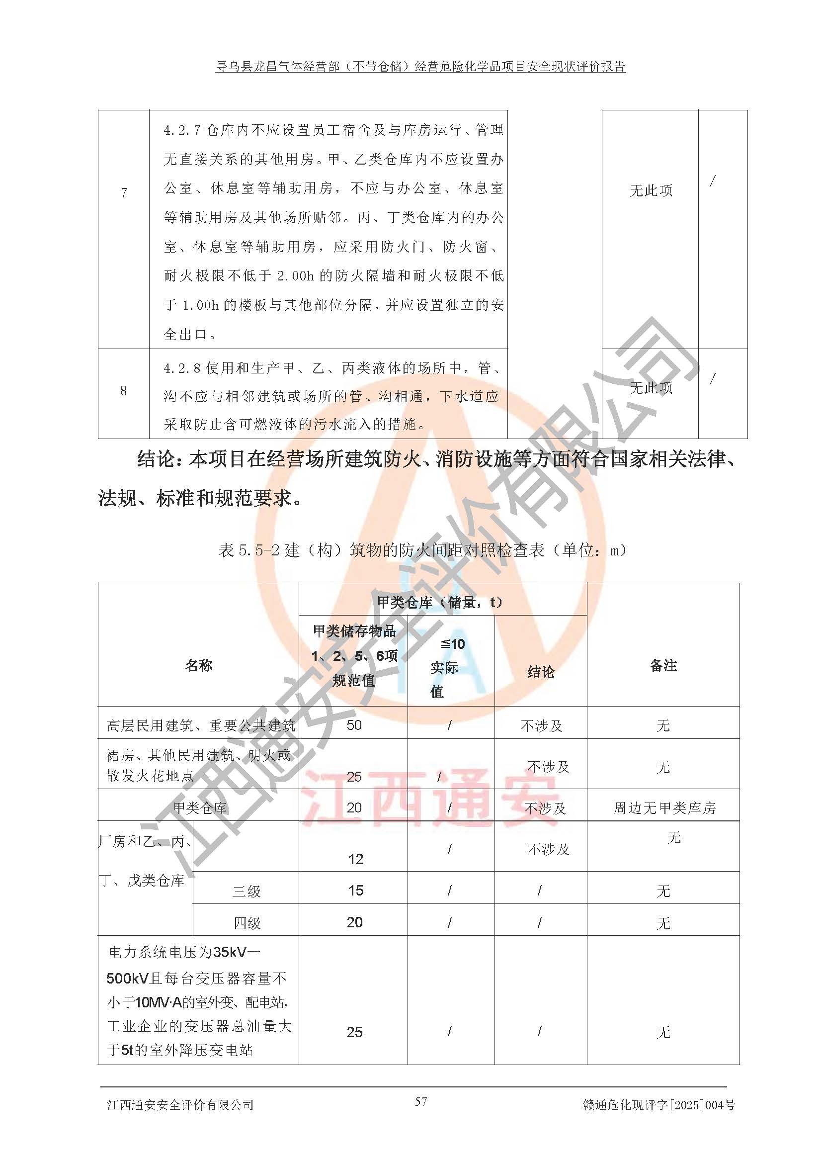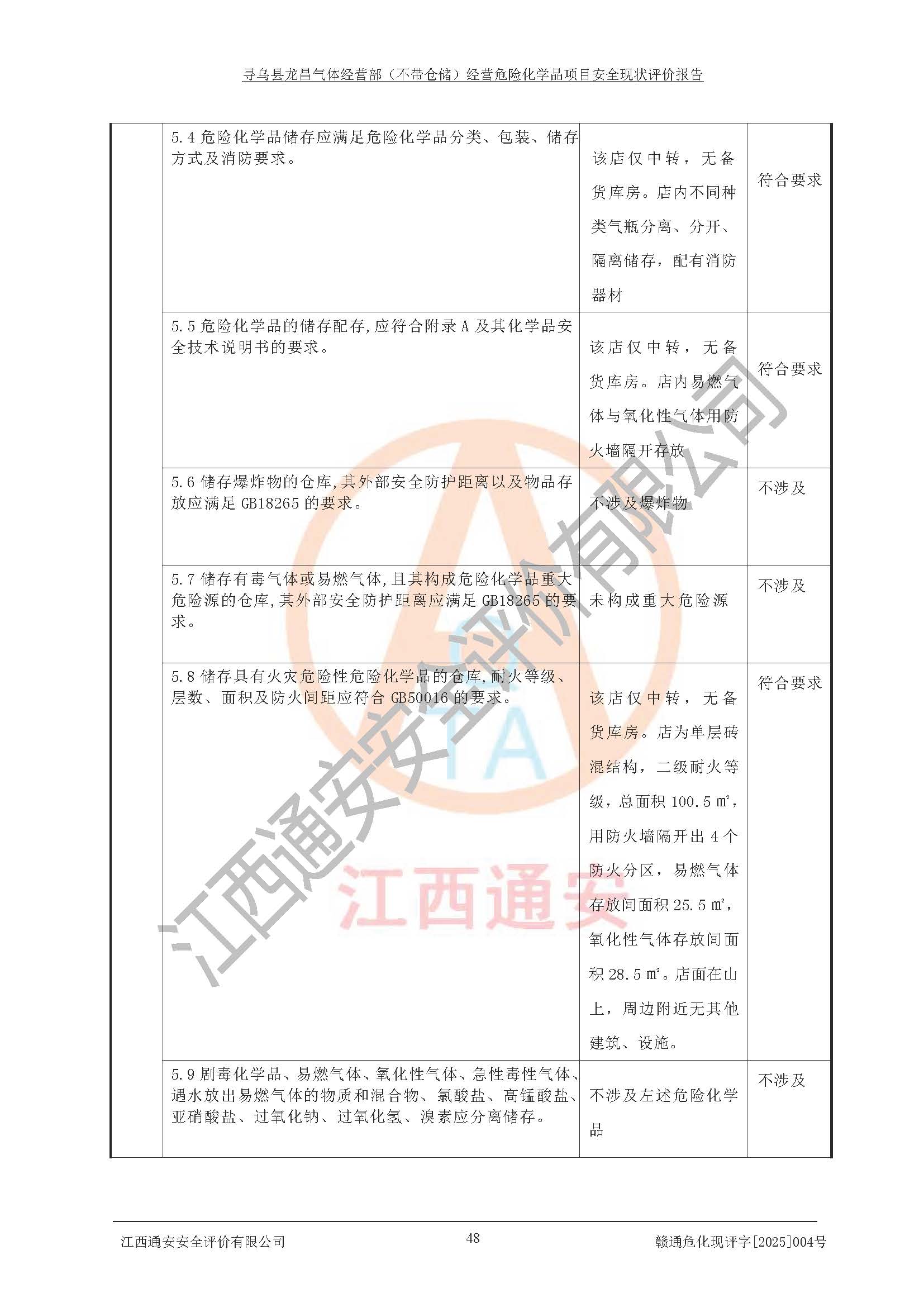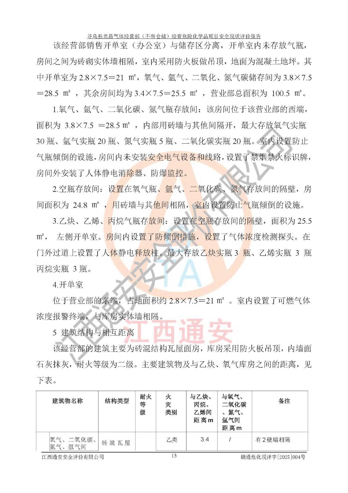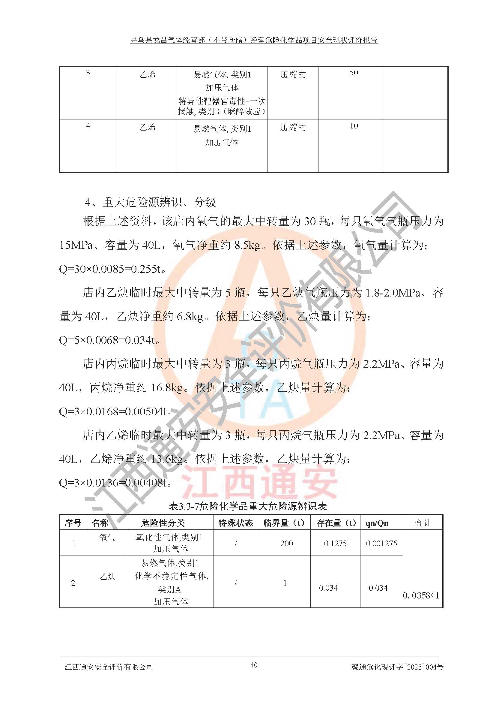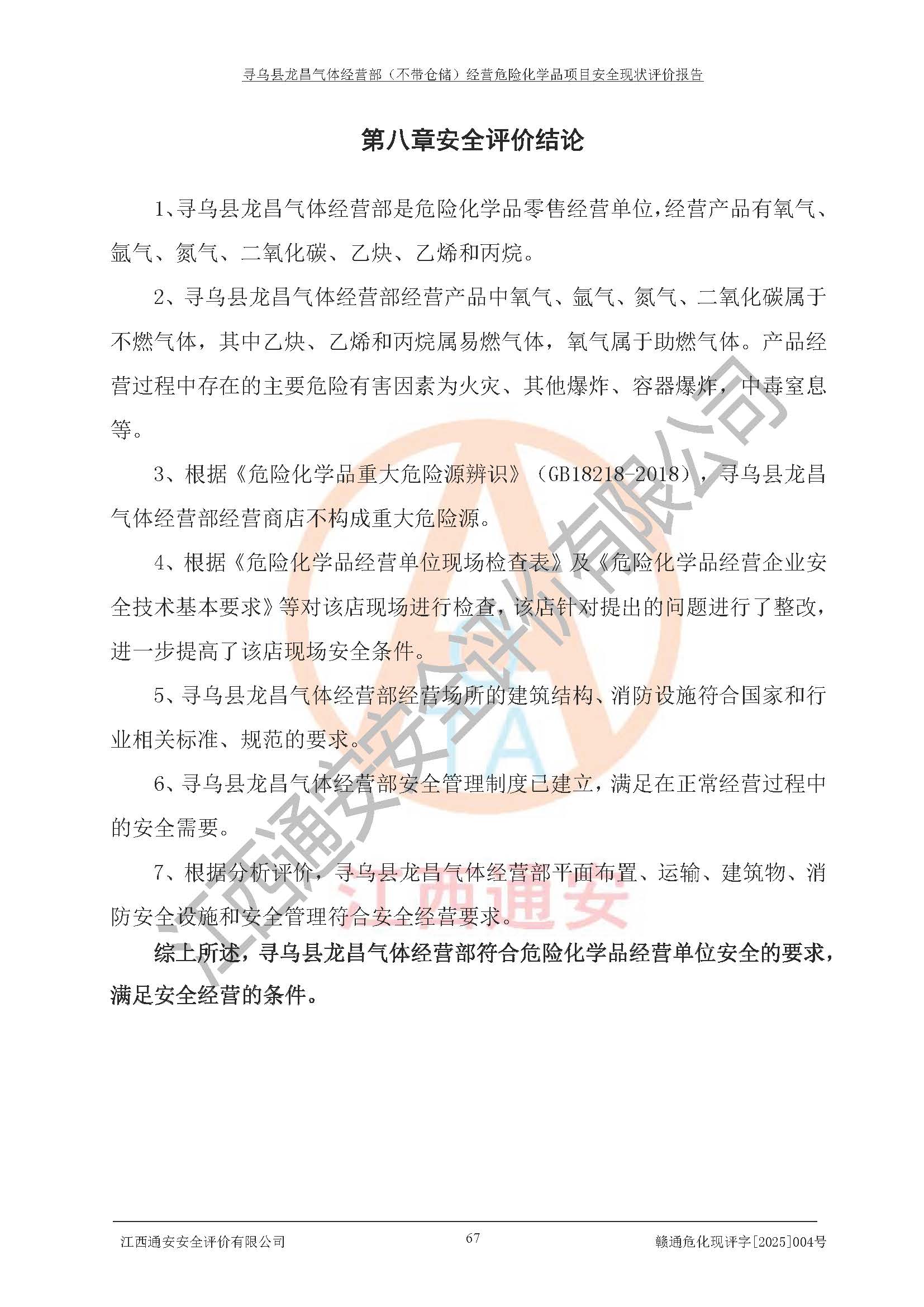 其它 | 1、寻乌县龙昌气体经营部是危险化学品零售经营单位,经营产品有氧气、氩气、氮气、二氧化碳、乙炔、乙烯和丙烷。 2、寻乌县龙昌气体经营部经营产品中氧气、氩气、氮气、二氧化碳属于不燃气体,其中乙炔、乙烯和丙烷属易燃气体,氧气属于助燃气体。产品经营过程中存在的主要危险有害因素为火灾、其他爆炸、容器爆炸,中毒窒息等。 3、根据《危险化学品重大危险源辨识》(GB18218-2018),寻乌县龙昌气体经营部经营商店不构成重大危险源。 4、根据《危险化学品经营单位现场检查表》及《危险化学品经营企业安全技术基本要求》等对该店现场进行检查,该店针对提出的问题进行了整改,进一步提高了该店现场安全条件。 5、寻乌县龙昌气体经营部经营场所的建筑结构、消防设施符合**和行业相关标准、规范的要求。 6、寻乌县龙昌气体经营部安全管理制度已建立,满足在正常经营过程中的安全需要。 7、根据分析评价,寻乌县龙昌气体经营部平面布置、运输、建筑物、消防安全设施和安全管理符合安全经营要求。 综上所述,寻乌县龙昌气体经营部符合危险化学品经营单位安全的要求,满足安全经营的条件。