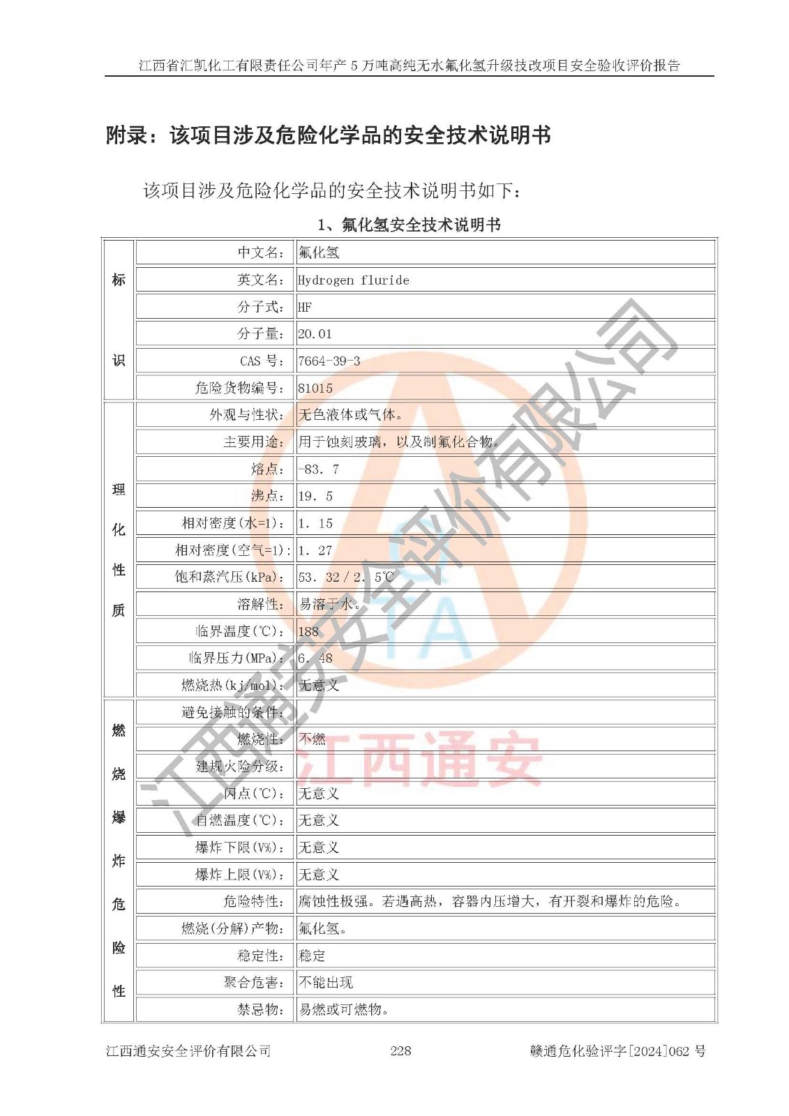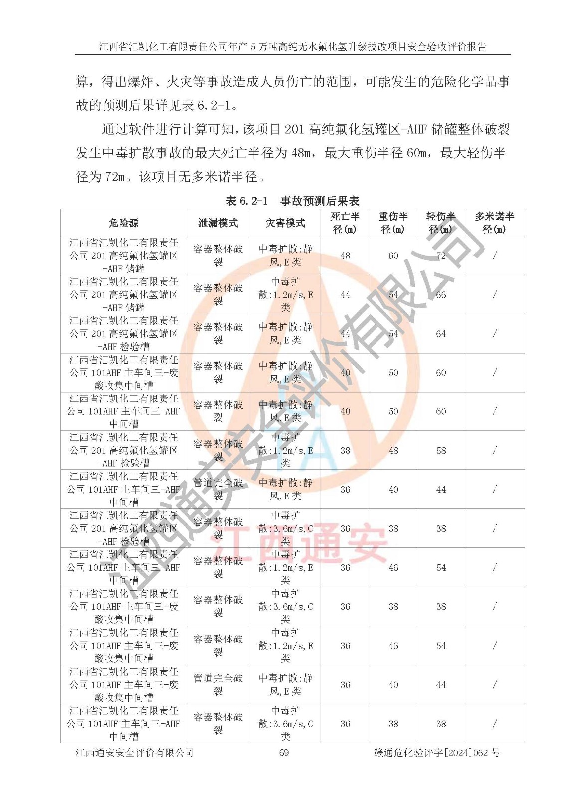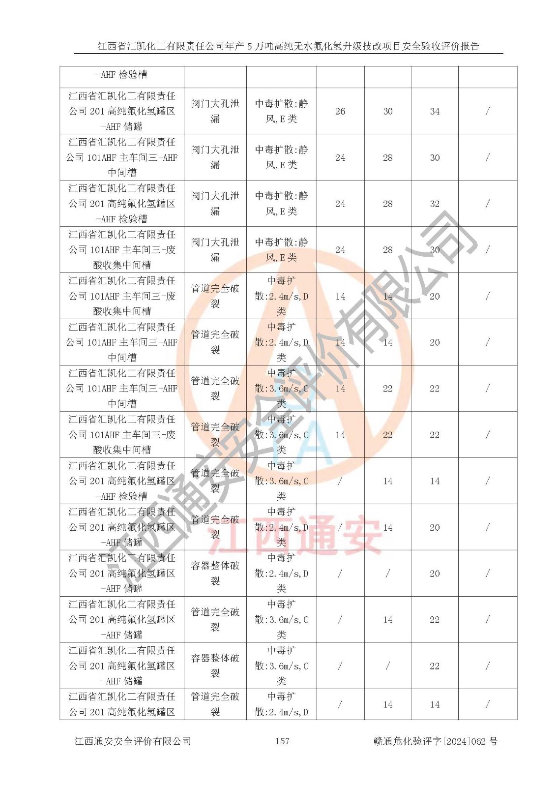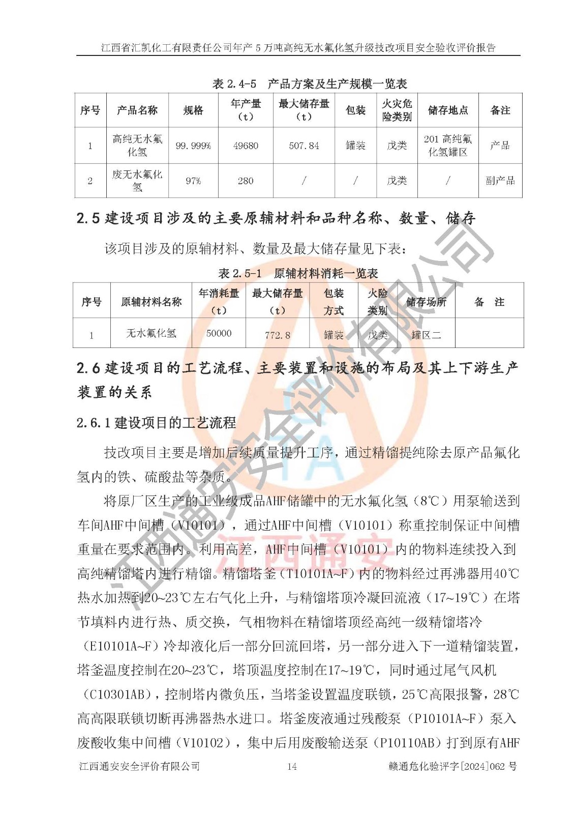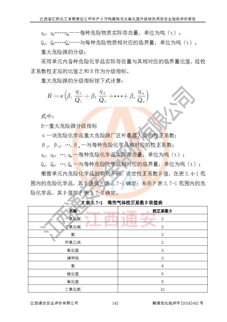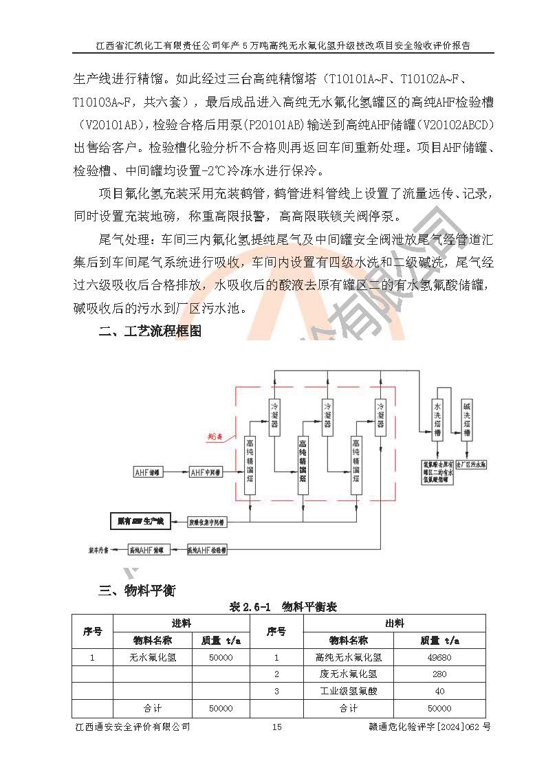 项目简介 | 江西省汇凯化工有限责任公司(以下简称“汇凯化工”)成立于2017年08月08日,注册地址位于江西省赣州市会昌县筠门岭镇九二工业基地,法定**人为张裕生,注册资本壹亿元整,经营范围为危险化学品生产、化工产品销售等。 汇凯化工公司2022年11月03日取得了《安全生产许可证》,许可证编号:(赣)WH安许证字[2019]1060号,许可范围为无水氟化氢(50kt/a)、氢氟酸(1690t/a)、氟硅酸(4468t/a),**期:2022年11月25日至2025年11月24日。 2017年9月21日,会昌县工信局同意公司在收购鹰鹏化工有限公司原有2万吨氢氟酸生产线基础上,建设“年产2万吨无水氟化氢异地搬迁技改项目”,并出具《关于江西省汇凯化工有限责任公司年产2万吨无水氟化氢异地搬迁技改项目备案的批复》(会工信投资字[2017]3号),项目已于2019年9月通过了竣工验收;2019年依据工业和信息化部公告《氟化氢行业准入条件》(2011年第6号)规定“为满足节能、**以及安全生产要求,提高氟资源利用率,实现合理的规模经济,新建生产企业的氟化氢总规模不得低于5万吨/年”;为满足《氟化氢行业准入条件》及企业未来发展需要,公司在现有生产线的基础上进行技改,二期于2019年10月建设年产3万吨无水氟化氢,2021年9月已竣工验收,达到5万吨/年无水氟化氢的生产规模,满足行业准入的规模要求。 汇凯化工公司为了进一步提升竞争力,现对原有年产5万吨无水氟化氢项目进行技改,将原产品进一步纯化,达到高纯无水氟化氢。汇凯化工公司已取得了年产5万吨高纯无水氟化氢升级技改项目备案通知书。 汇凯化工公司委托江西伟灿工程技术咨询有限责任公司编制了年产5万吨高纯无水氟化氢升级技改项目安全预评价报告,并于2022年4月18日取得了赣州市行政审批局《关于江西省汇凯化工有限责任公司年产5万吨高纯无水氟化氢升级技改项目安全条件审查的批复》{赣市行审证(3)字[2022]131号},委托河北英科石化工程有限公司编制了年产5万吨高纯无水氟化氢升级技改项目安全设施设计,并于2022年7月4日取得了赣州市行政审批局《关于江西省汇凯化工有限责任公司年产5万吨高纯无水氟化氢升级技改项目安全设施设计审查的批复》{赣市行审证(3)字[2022]253号}。因生产经营需要,汇凯化工公司编制了年产5万吨高纯无水氟化氢升级技改项目试生产方案,2024年1月5日组织专家对试生产方案及现场进行了评审,经整改后取得了会昌县应急管理局出具的试生产方案备案回执,试生产期限为2024年5月31日至2025年5月30日,目前试生产目标任务基本达成,拟进行项目的安全设施验收工作。 江西省汇凯化工有限责任公司年产5万吨高纯无水氟化氢升级技改项目(以下简称“该项目”)主要建设内容为101AHF主车间三高纯氟化氢生产线设备、201高纯氟化氢罐区、201-1装卸区、202萤石粉库二、401中心控制室,生产工艺为通过精馏提纯除去原产品氟化氢内的铁、硫酸盐等杂质,得到高纯无水氟化氢产品(99.999%)。 该项目生产过程中涉及的物料为氟化氢、液碱(氢氧化钠)和氢氟酸,氟化氢、氢氧化钠和氢氟酸属于危险化学品。经辨识,该项目涉及的氟化氢和氢氟酸属于重点监管的危险化学品和高毒物品,不涉及监控化学品、易制毒化学品、易制爆危险化学品、剧毒化学品和特别管控危险化学品,不涉及重点监管的危险化工工艺。101AHF主车间三内精馏生产单元、201高纯氟化氢罐区内高纯氟化氢存储单元分别构成危险化学品一级重大危险源。根据生产工艺特点及物料的理化特性可知,该项目生产过程中主要存在火灾与爆炸、中毒与窒息、灼烫、触电、机械伤害等危险因素。 | ||||||