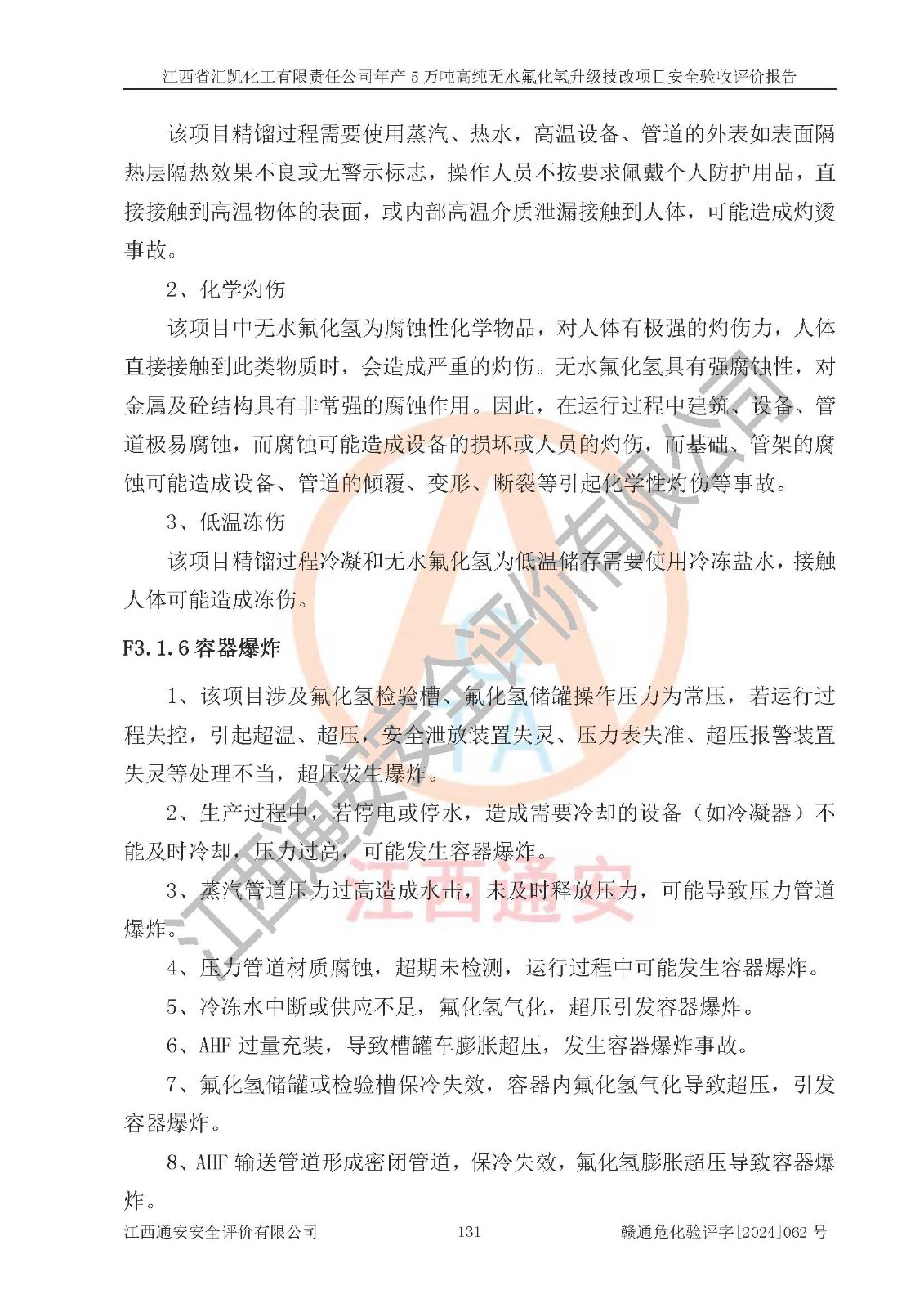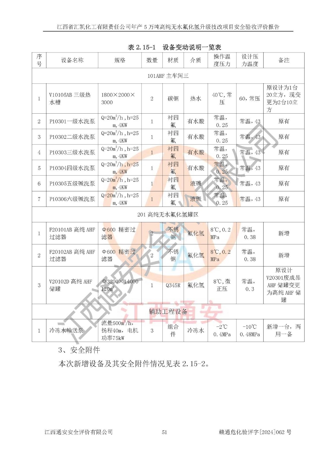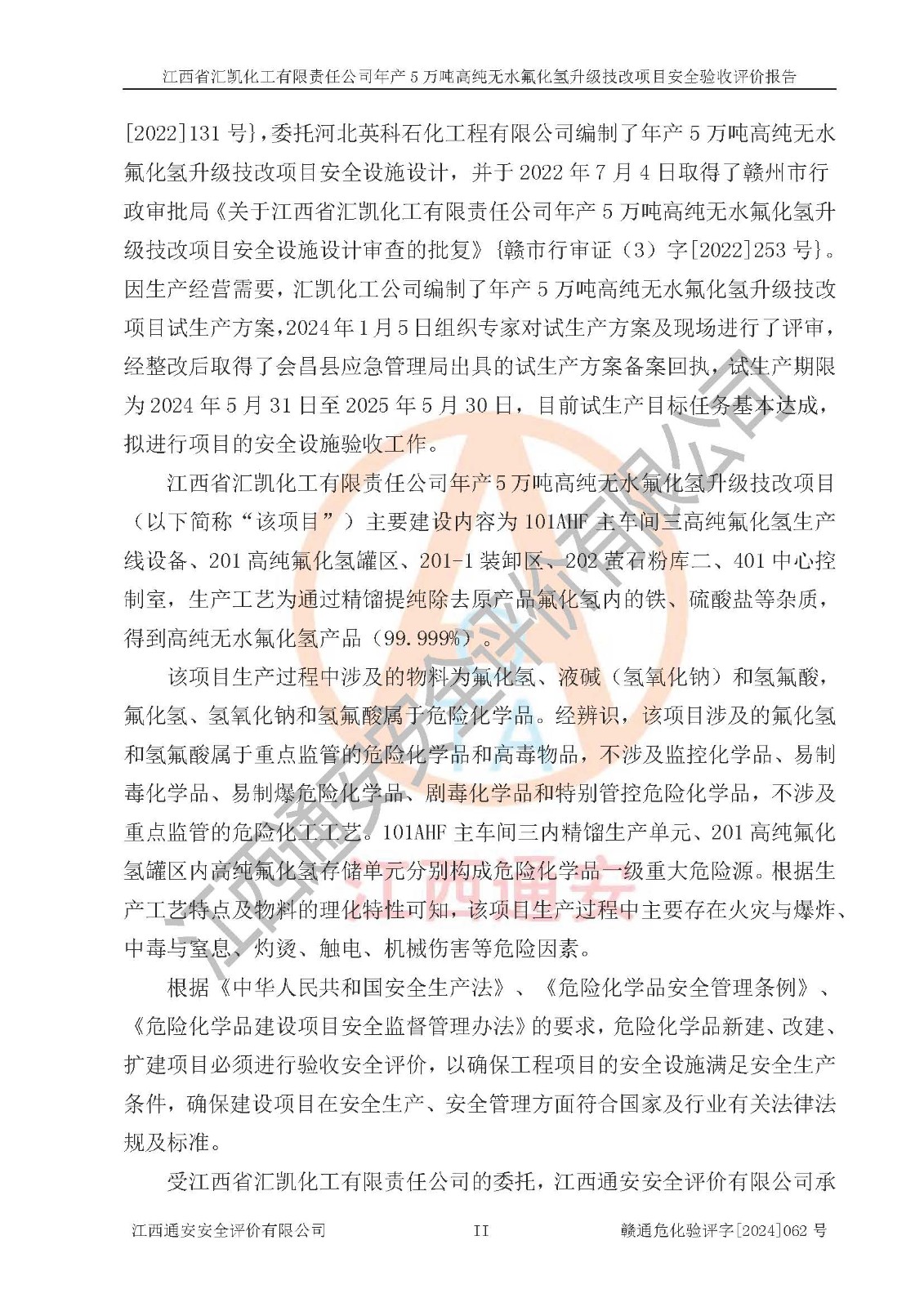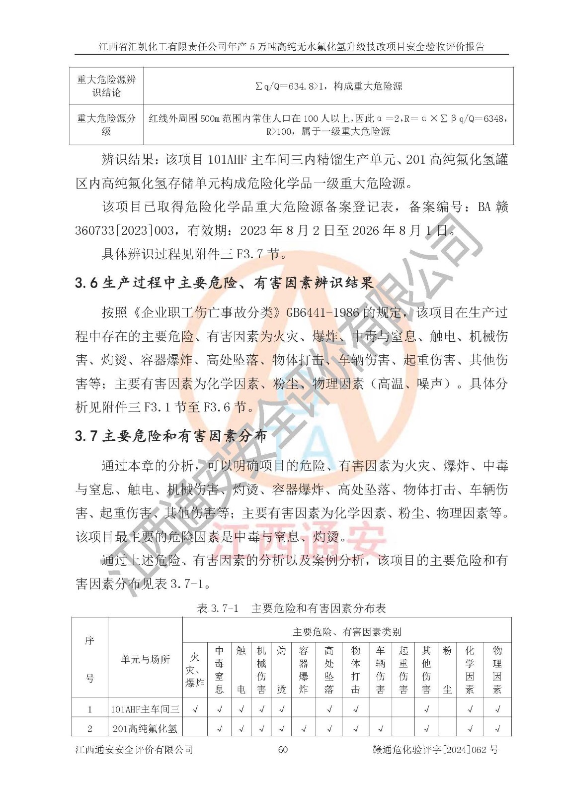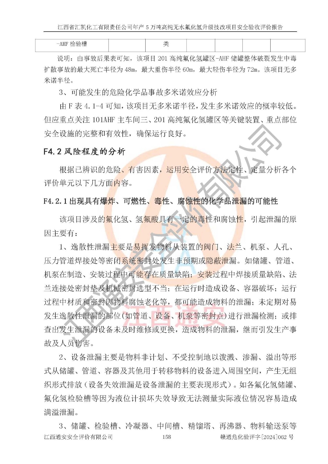 项目简介 | 江西省汇凯化工有限责任公司(以下简称“汇凯化工”)成立于2017年08月08日,注册地址位于江西省赣州市会昌县筠门岭镇九二工业基地,法定**人为张裕生,注册资本壹亿元整,经营范围为危险化学品生产、化工产品销售等。 汇凯化工公司2022年11月03日取得了《安全生产许可证》,许可证编号:(赣)WH安许证字[2019]1060号,许可范围为无水氟化氢(50kt/a)、氢氟酸(1690t/a)、氟硅酸(4468t/a),**期:2022年11月25日至2025年11月24日。 2017年9月21日,会昌县工信局同意公司在收购鹰鹏化工有限公司原有2万吨氢氟酸生产线基础上,建设“年产2万吨无水氟化氢异地搬迁技改项目”,并出具《关于江西省汇凯化工有限责任公司年产2万吨无水氟化氢异地搬迁技改项目备案的批复》(会工信投资字[2017]3号),项目已于2019年9月通过了竣工验收;2019年依据工业和信息化部公告《氟化氢行业准入条件》(2011年第6号)规定“为满足节能、**以及安全生产要求,提高氟资源利用率,实现合理的规模经济,新建生产企业的氟化氢总规模不得低于5万吨/年”;为满足《氟化氢行业准入条件》及企业未来发展需要,公司在现有生产线的基础上进行技改,二期于2019年10月建设年产3万吨无水氟化氢,2021年9月已竣工验收,达到5万吨/年无水氟化氢的生产规模,满足行业准入的规模要求。 汇凯化工公司为了进一步提升竞争力,现对原有年产5万吨无水氟化氢项目进行技改,将原产品进一步纯化,达到高纯无水氟化氢。汇凯化工公司已取得了年产5万吨高纯无水氟化氢升级技改项目备案通知书。 汇凯化工公司委托江西伟灿工程技术咨询有限责任公司编制了年产5万吨高纯无水氟化氢升级技改项目安全预评价报告,并于2022年4月18日取得了赣州市行政审批局《关于江西省汇凯化工有限责任公司年产5万吨高纯无水氟化氢升级技改项目安全条件审查的批复》{赣市行审证(3)字[2022]131号},委托河北英科石化工程有限公司编制了年产5万吨高纯无水氟化氢升级技改项目安全设施设计,并于2022年7月4日取得了赣州市行政审批局《关于江西省汇凯化工有限责任公司年产5万吨高纯无水氟化氢升级技改项目安全设施设计审查的批复》{赣市行审证(3)字[2022]253号}。因生产经营需要,汇凯化工公司编制了年产5万吨高纯无水氟化氢升级技改项目试生产方案,2024年1月5日组织专家对试生产方案及现场进行了评审,经整改后取得了会昌县应急管理局出具的试生产方案备案回执,试生产期限为2024年5月31日至2025年5月30日,目前试生产目标任务基本达成,拟进行项目的安全设施验收工作。 江西省汇凯化工有限责任公司年产5万吨高纯无水氟化氢升级技改项目(以下简称“该项目”)主要建设内容为101AHF主车间三高纯氟化氢生产线设备、201高纯氟化氢罐区、201-1装卸区、202萤石粉库二、401中心控制室,生产工艺为通过精馏提纯除去原产品氟化氢内的铁、硫酸盐等杂质,得到高纯无水氟化氢产品(99.999%)。 该项目生产过程中涉及的物料为氟化氢、液碱(氢氧化钠)和氢氟酸,氟化氢、氢氧化钠和氢氟酸属于危险化学品。经辨识,该项目涉及的氟化氢和氢氟酸属于重点监管的危险化学品和高毒物品,不涉及监控化学品、易制毒化学品、易制爆危险化学品、剧毒化学品和特别管控危险化学品,不涉及重点监管的危险化工工艺。101AHF主车间三内精馏生产单元、201高纯氟化氢罐区内高纯氟化氢存储单元分别构成危险化学品一级重大危险源。根据生产工艺特点及物料的理化特性可知,该项目生产过程中主要存在火灾与爆炸、中毒与窒息、灼烫、触电、机械伤害等危险因素。 | ||||||