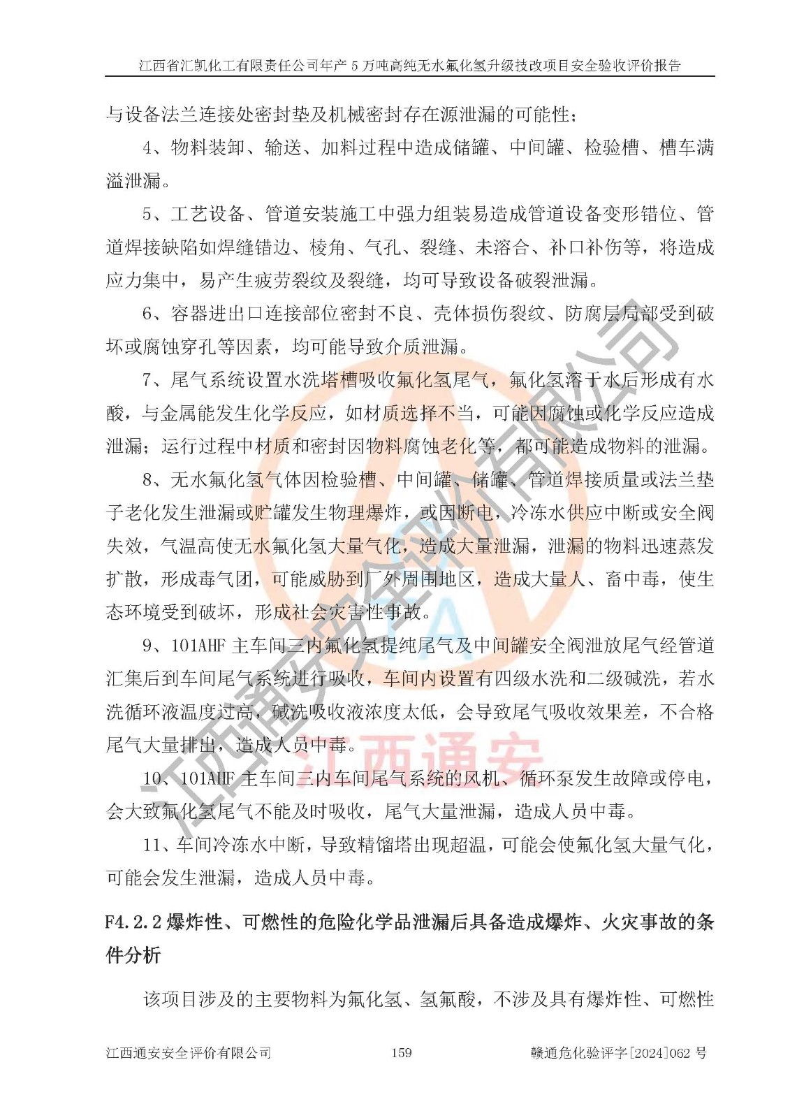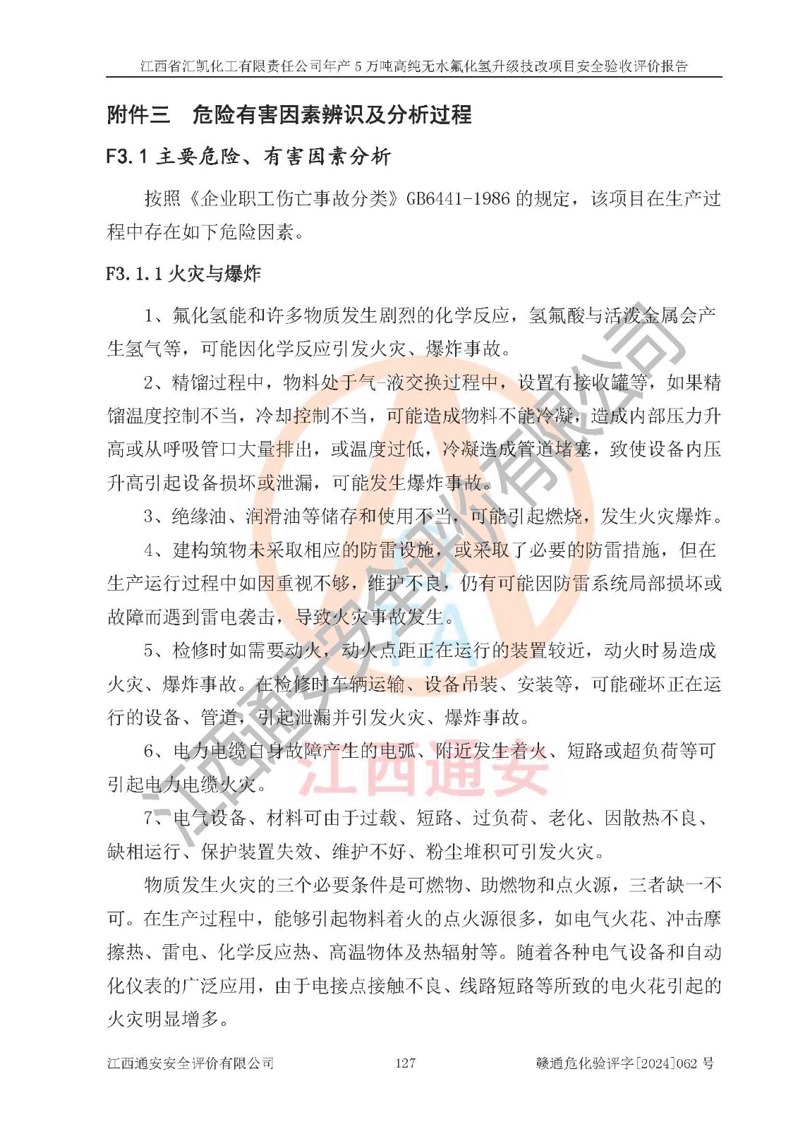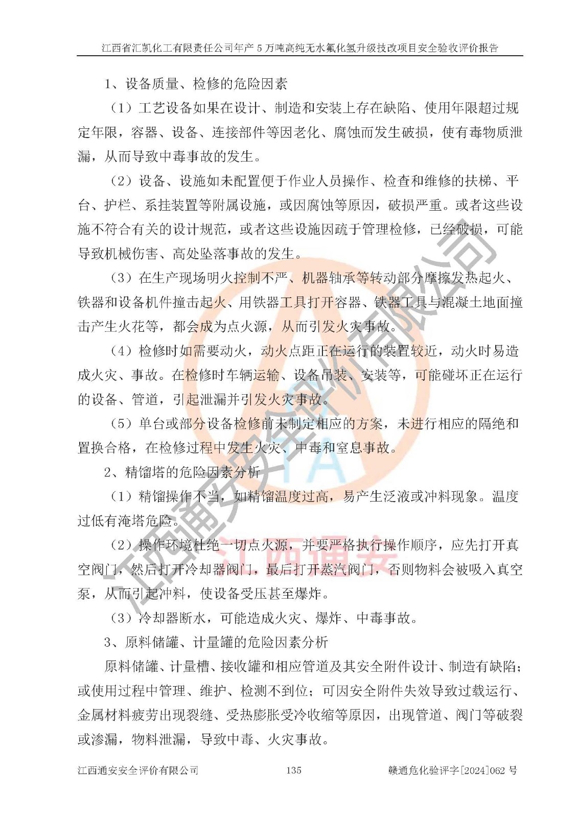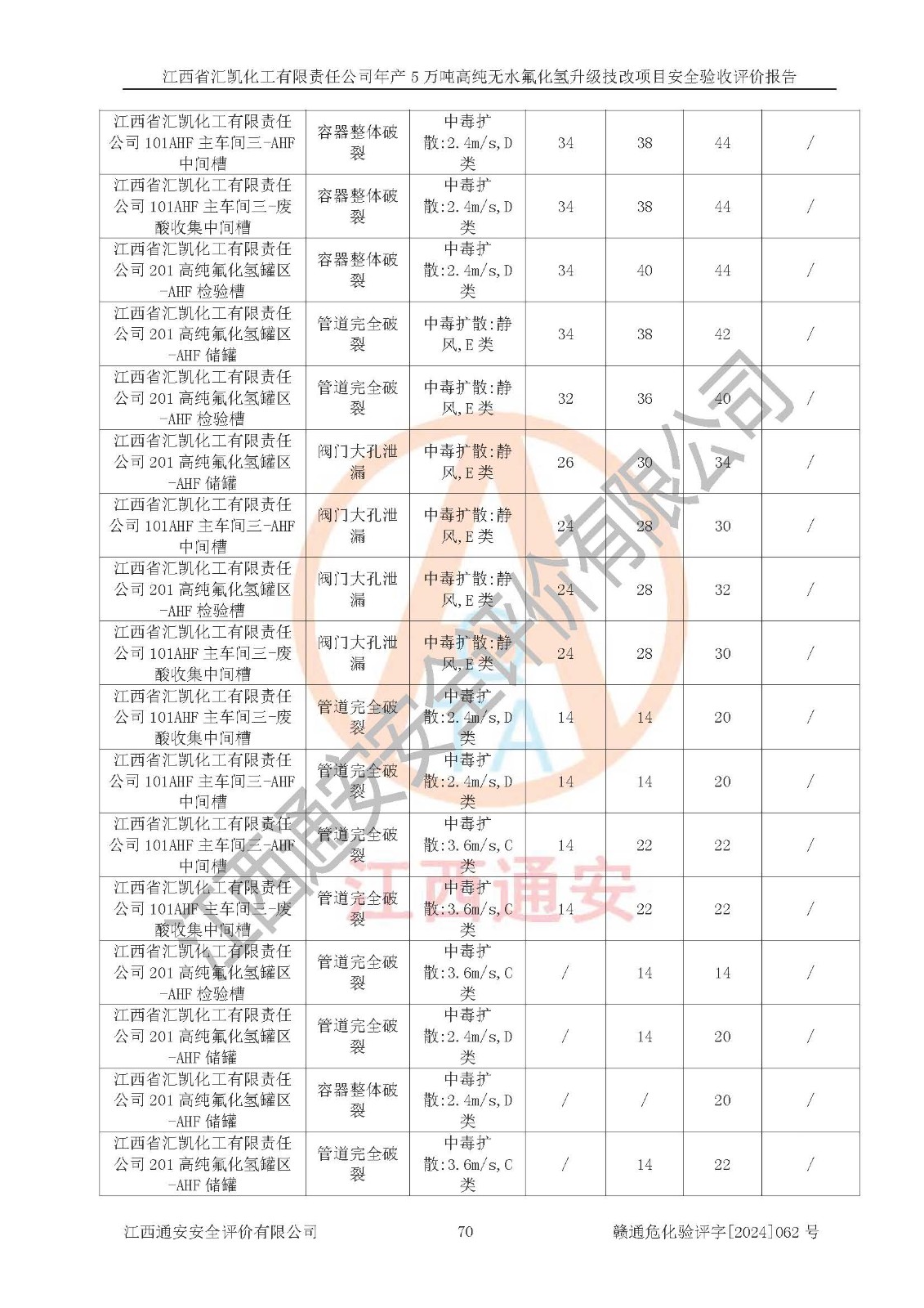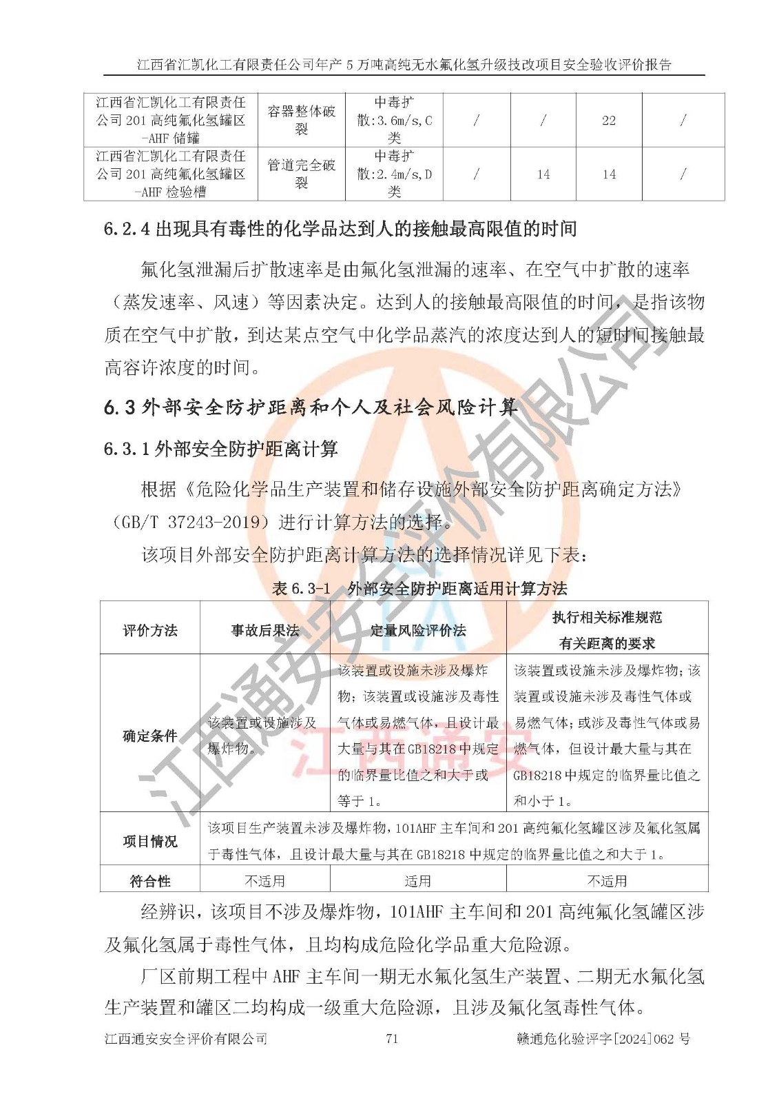 项目简介 | 江西省汇凯化工有限责任公司(以下简称“汇凯化工”)成立于2017年08月08日,注册地址位于江西省赣州市会昌县筠门岭镇九二工业基地,法定**人为张裕生,注册资本壹亿元整,经营范围为危险化学品生产、化工产品销售等。 汇凯化工公司2022年11月03日取得了《安全生产许可证》,许可证编号:(赣)WH安许证字[2019]1060号,许可范围为无水氟化氢(50kt/a)、氢氟酸(1690t/a)、氟硅酸(4468t/a),**期:2022年11月25日至2025年11月24日。 2017年9月21日,会昌县工信局同意公司在收购鹰鹏化工有限公司原有2万吨氢氟酸生产线基础上,建设“年产2万吨无水氟化氢异地搬迁技改项目”,并出具《关于江西省汇凯化工有限责任公司年产2万吨无水氟化氢异地搬迁技改项目备案的批复》(会工信投资字[2017]3号),项目已于2019年9月通过了竣工验收;2019年依据工业和信息化部公告《氟化氢行业准入条件》(2011年第6号)规定“为满足节能、**以及安全生产要求,提高氟资源利用率,实现合理的规模经济,新建生产企业的氟化氢总规模不得低于5万吨/年”;为满足《氟化氢行业准入条件》及企业未来发展需要,公司在现有生产线的基础上进行技改,二期于2019年10月建设年产3万吨无水氟化氢,2021年9月已竣工验收,达到5万吨/年无水氟化氢的生产规模,满足行业准入的规模要求。 汇凯化工公司为了进一步提升竞争力,现对原有年产5万吨无水氟化氢项目进行技改,将原产品进一步纯化,达到高纯无水氟化氢。汇凯化工公司已取得了年产5万吨高纯无水氟化氢升级技改项目备案通知书。 汇凯化工公司委托江西伟灿工程技术咨询有限责任公司编制了年产5万吨高纯无水氟化氢升级技改项目安全预评价报告,并于2022年4月18日取得了赣州市行政审批局《关于江西省汇凯化工有限责任公司年产5万吨高纯无水氟化氢升级技改项目安全条件审查的批复》{赣市行审证(3)字[2022]131号},委托河北英科石化工程有限公司编制了年产5万吨高纯无水氟化氢升级技改项目安全设施设计,并于2022年7月4日取得了赣州市行政审批局《关于江西省汇凯化工有限责任公司年产5万吨高纯无水氟化氢升级技改项目安全设施设计审查的批复》{赣市行审证(3)字[2022]253号}。因生产经营需要,汇凯化工公司编制了年产5万吨高纯无水氟化氢升级技改项目试生产方案,2024年1月5日组织专家对试生产方案及现场进行了评审,经整改后取得了会昌县应急管理局出具的试生产方案备案回执,试生产期限为2024年5月31日至2025年5月30日,目前试生产目标任务基本达成,拟进行项目的安全设施验收工作。 江西省汇凯化工有限责任公司年产5万吨高纯无水氟化氢升级技改项目(以下简称“该项目”)主要建设内容为101AHF主车间三高纯氟化氢生产线设备、201高纯氟化氢罐区、201-1装卸区、202萤石粉库二、401中心控制室,生产工艺为通过精馏提纯除去原产品氟化氢内的铁、硫酸盐等杂质,得到高纯无水氟化氢产品(99.999%)。 该项目生产过程中涉及的物料为氟化氢、液碱(氢氧化钠)和氢氟酸,氟化氢、氢氧化钠和氢氟酸属于危险化学品。经辨识,该项目涉及的氟化氢和氢氟酸属于重点监管的危险化学品和高毒物品,不涉及监控化学品、易制毒化学品、易制爆危险化学品、剧毒化学品和特别管控危险化学品,不涉及重点监管的危险化工工艺。101AHF主车间三内精馏生产单元、201高纯氟化氢罐区内高纯氟化氢存储单元分别构成危险化学品一级重大危险源。根据生产工艺特点及物料的理化特性可知,该项目生产过程中主要存在火灾与爆炸、中毒与窒息、灼烫、触电、机械伤害等危险因素。 | ||||||