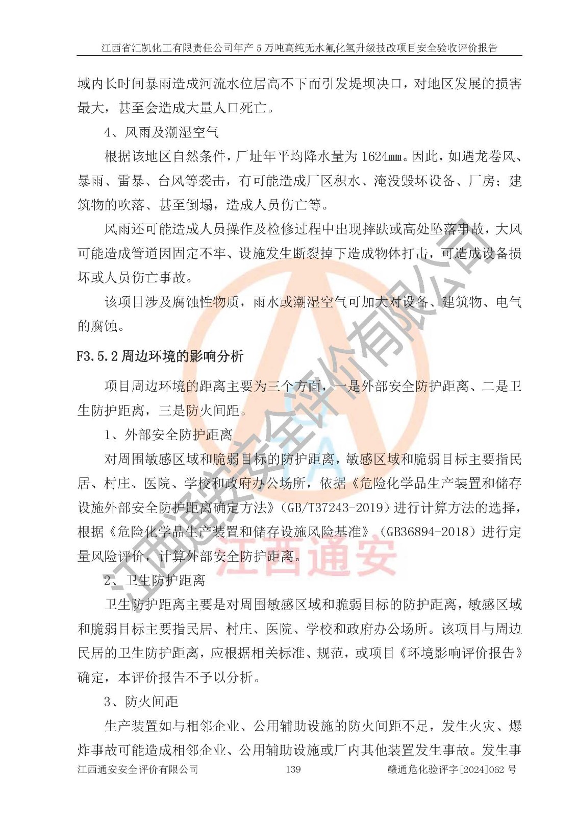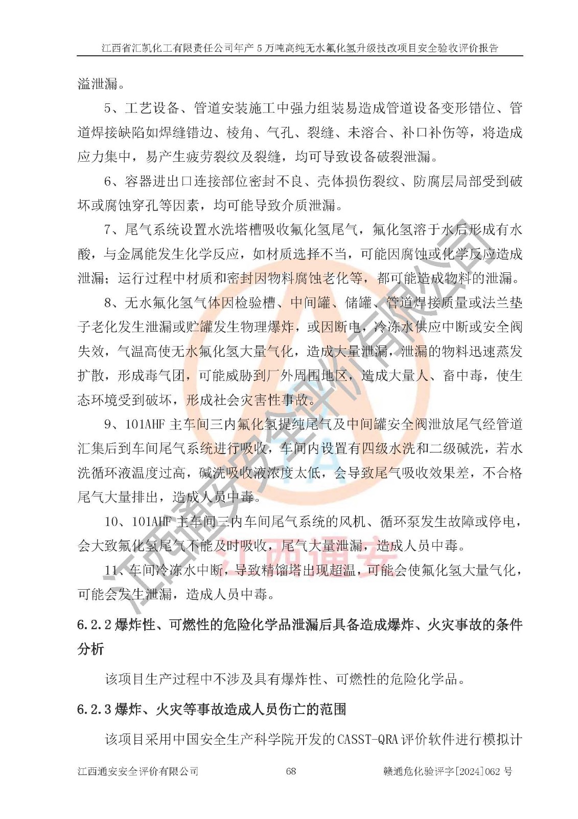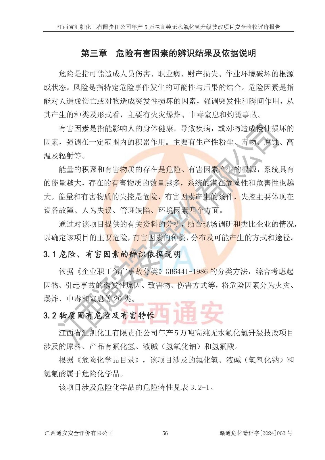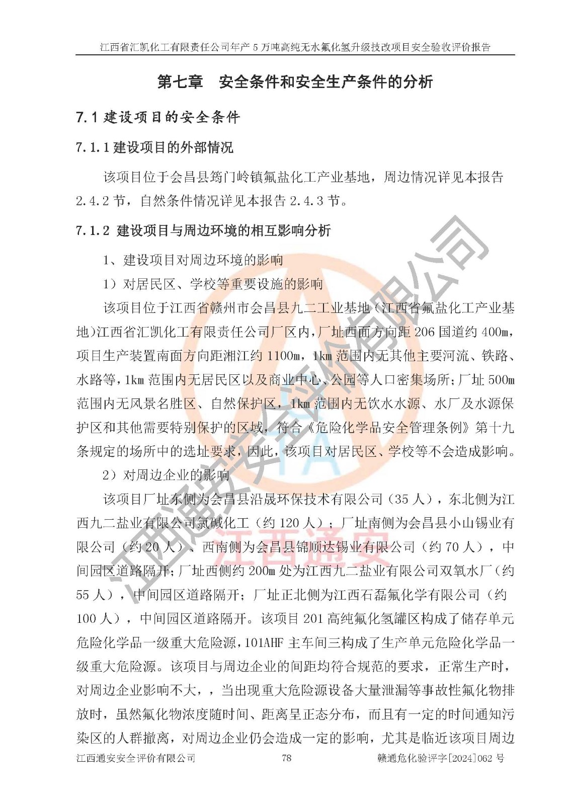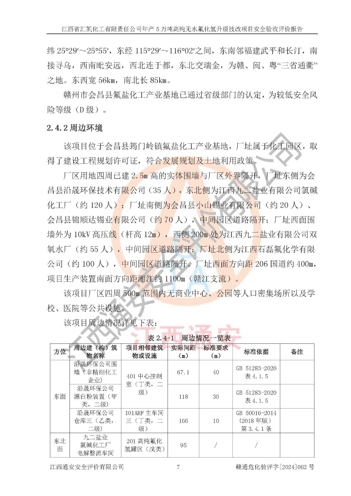 项目简介 | 江西省汇凯化工有限责任公司(以下简称“汇凯化工”)成立于2017年08月08日,注册地址位于江西省赣州市会昌县筠门岭镇九二工业基地,法定**人为张裕生,注册资本壹亿元整,经营范围为危险化学品生产、化工产品销售等。 汇凯化工公司2022年11月03日取得了《安全生产许可证》,许可证编号:(赣)WH安许证字[2019]1060号,许可范围为无水氟化氢(50kt/a)、氢氟酸(1690t/a)、氟硅酸(4468t/a),**期:2022年11月25日至2025年11月24日。 2017年9月21日,会昌县工信局同意公司在收购鹰鹏化工有限公司原有2万吨氢氟酸生产线基础上,建设“年产2万吨无水氟化氢异地搬迁技改项目”,并出具《关于江西省汇凯化工有限责任公司年产2万吨无水氟化氢异地搬迁技改项目备案的批复》(会工信投资字[2017]3号),项目已于2019年9月通过了竣工验收;2019年依据工业和信息化部公告《氟化氢行业准入条件》(2011年第6号)规定“为满足节能、**以及安全生产要求,提高氟资源利用率,实现合理的规模经济,新建生产企业的氟化氢总规模不得低于5万吨/年”;为满足《氟化氢行业准入条件》及企业未来发展需要,公司在现有生产线的基础上进行技改,二期于2019年10月建设年产3万吨无水氟化氢,2021年9月已竣工验收,达到5万吨/年无水氟化氢的生产规模,满足行业准入的规模要求。 汇凯化工公司为了进一步提升竞争力,现对原有年产5万吨无水氟化氢项目进行技改,将原产品进一步纯化,达到高纯无水氟化氢。汇凯化工公司已取得了年产5万吨高纯无水氟化氢升级技改项目备案通知书。 汇凯化工公司委托江西伟灿工程技术咨询有限责任公司编制了年产5万吨高纯无水氟化氢升级技改项目安全预评价报告,并于2022年4月18日取得了赣州市行政审批局《关于江西省汇凯化工有限责任公司年产5万吨高纯无水氟化氢升级技改项目安全条件审查的批复》{赣市行审证(3)字[2022]131号},委托河北英科石化工程有限公司编制了年产5万吨高纯无水氟化氢升级技改项目安全设施设计,并于2022年7月4日取得了赣州市行政审批局《关于江西省汇凯化工有限责任公司年产5万吨高纯无水氟化氢升级技改项目安全设施设计审查的批复》{赣市行审证(3)字[2022]253号}。因生产经营需要,汇凯化工公司编制了年产5万吨高纯无水氟化氢升级技改项目试生产方案,2024年1月5日组织专家对试生产方案及现场进行了评审,经整改后取得了会昌县应急管理局出具的试生产方案备案回执,试生产期限为2024年5月31日至2025年5月30日,目前试生产目标任务基本达成,拟进行项目的安全设施验收工作。 江西省汇凯化工有限责任公司年产5万吨高纯无水氟化氢升级技改项目(以下简称“该项目”)主要建设内容为101AHF主车间三高纯氟化氢生产线设备、201高纯氟化氢罐区、201-1装卸区、202萤石粉库二、401中心控制室,生产工艺为通过精馏提纯除去原产品氟化氢内的铁、硫酸盐等杂质,得到高纯无水氟化氢产品(99.999%)。 该项目生产过程中涉及的物料为氟化氢、液碱(氢氧化钠)和氢氟酸,氟化氢、氢氧化钠和氢氟酸属于危险化学品。经辨识,该项目涉及的氟化氢和氢氟酸属于重点监管的危险化学品和高毒物品,不涉及监控化学品、易制毒化学品、易制爆危险化学品、剧毒化学品和特别管控危险化学品,不涉及重点监管的危险化工工艺。101AHF主车间三内精馏生产单元、201高纯氟化氢罐区内高纯氟化氢存储单元分别构成危险化学品一级重大危险源。根据生产工艺特点及物料的理化特性可知,该项目生产过程中主要存在火灾与爆炸、中毒与窒息、灼烫、触电、机械伤害等危险因素。 | ||||||