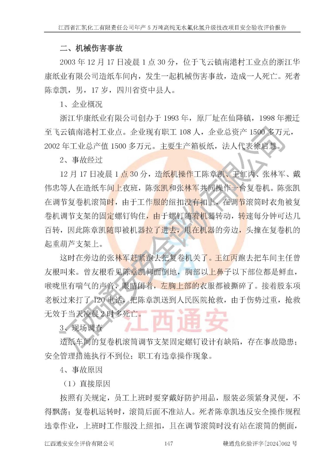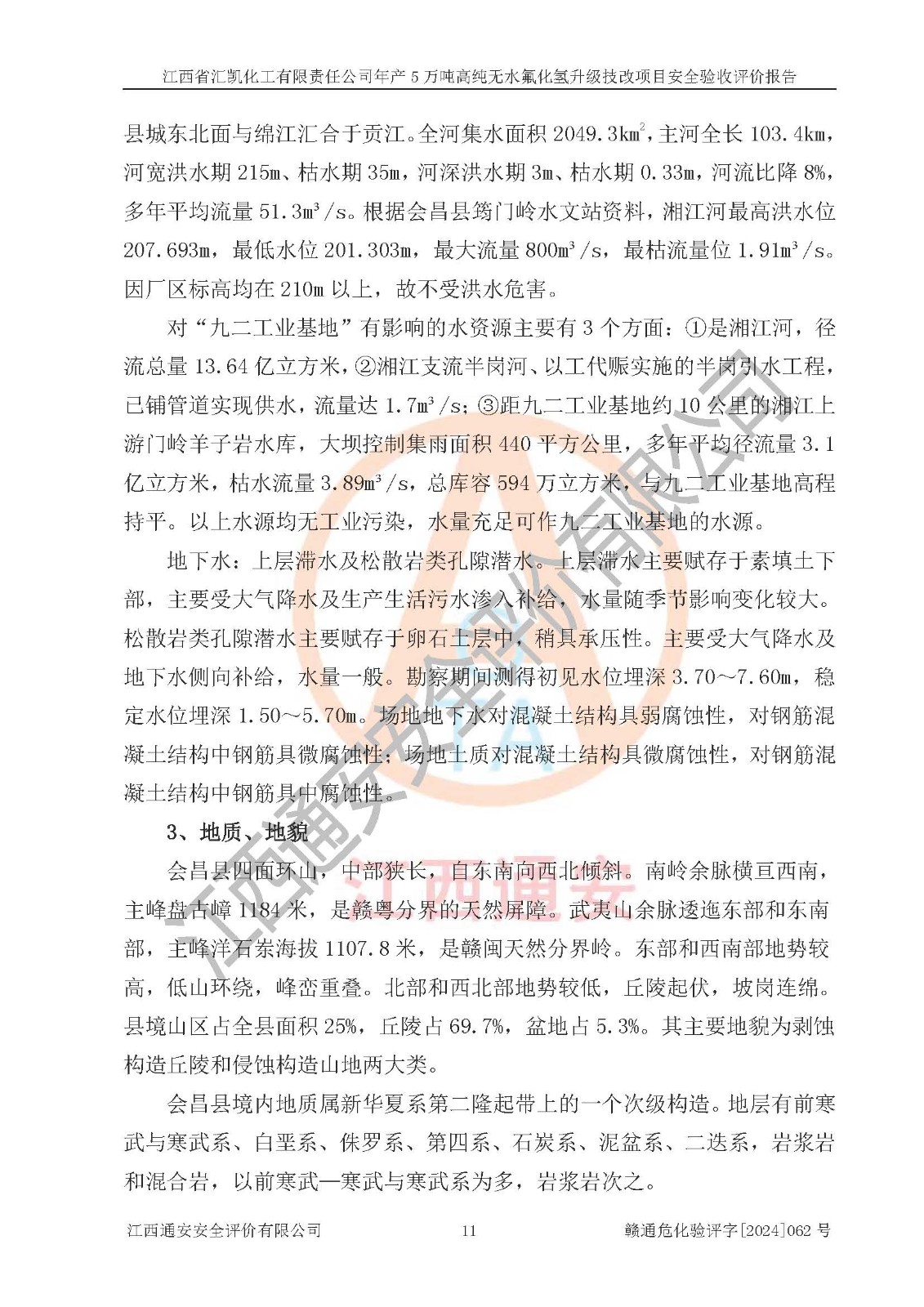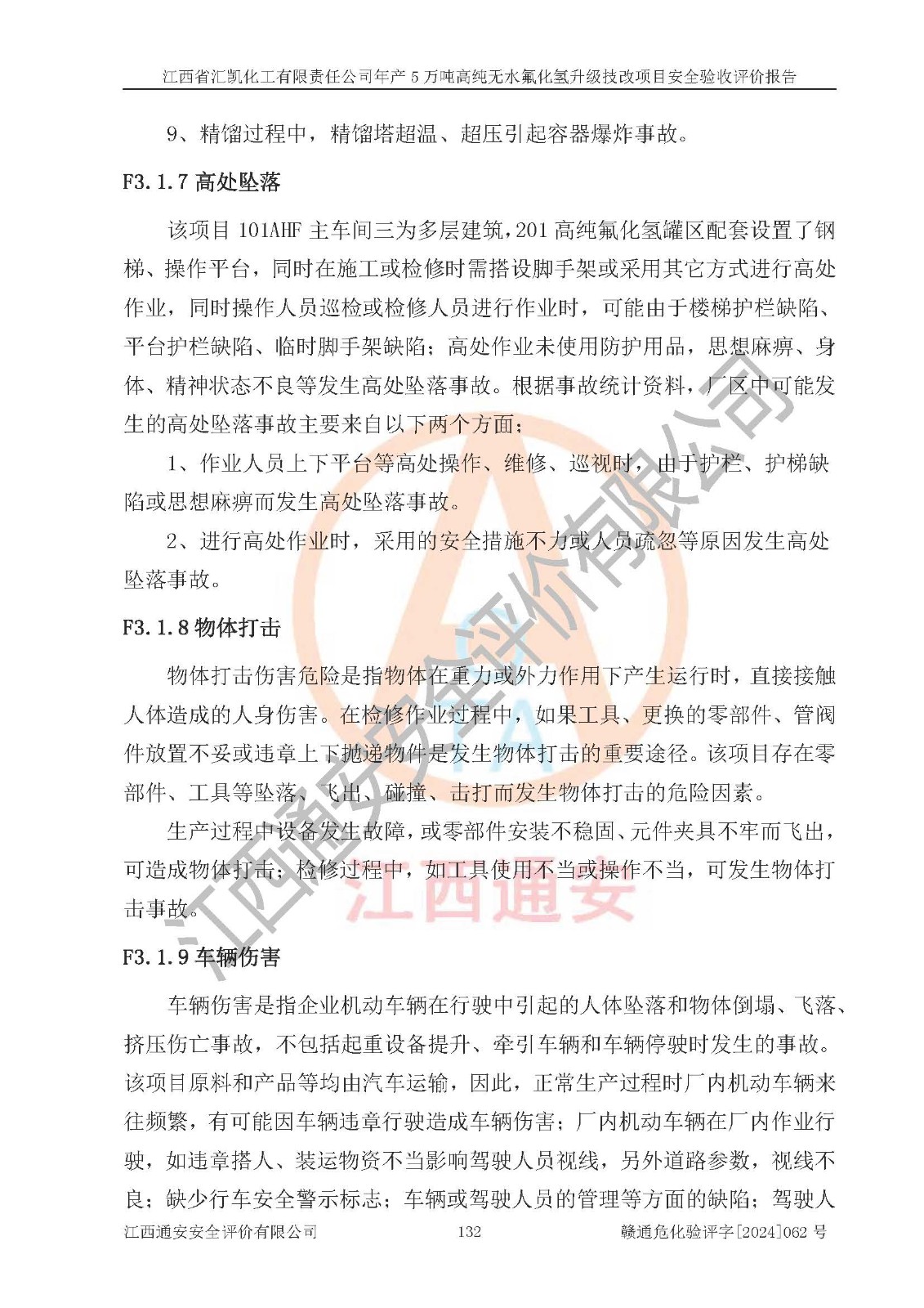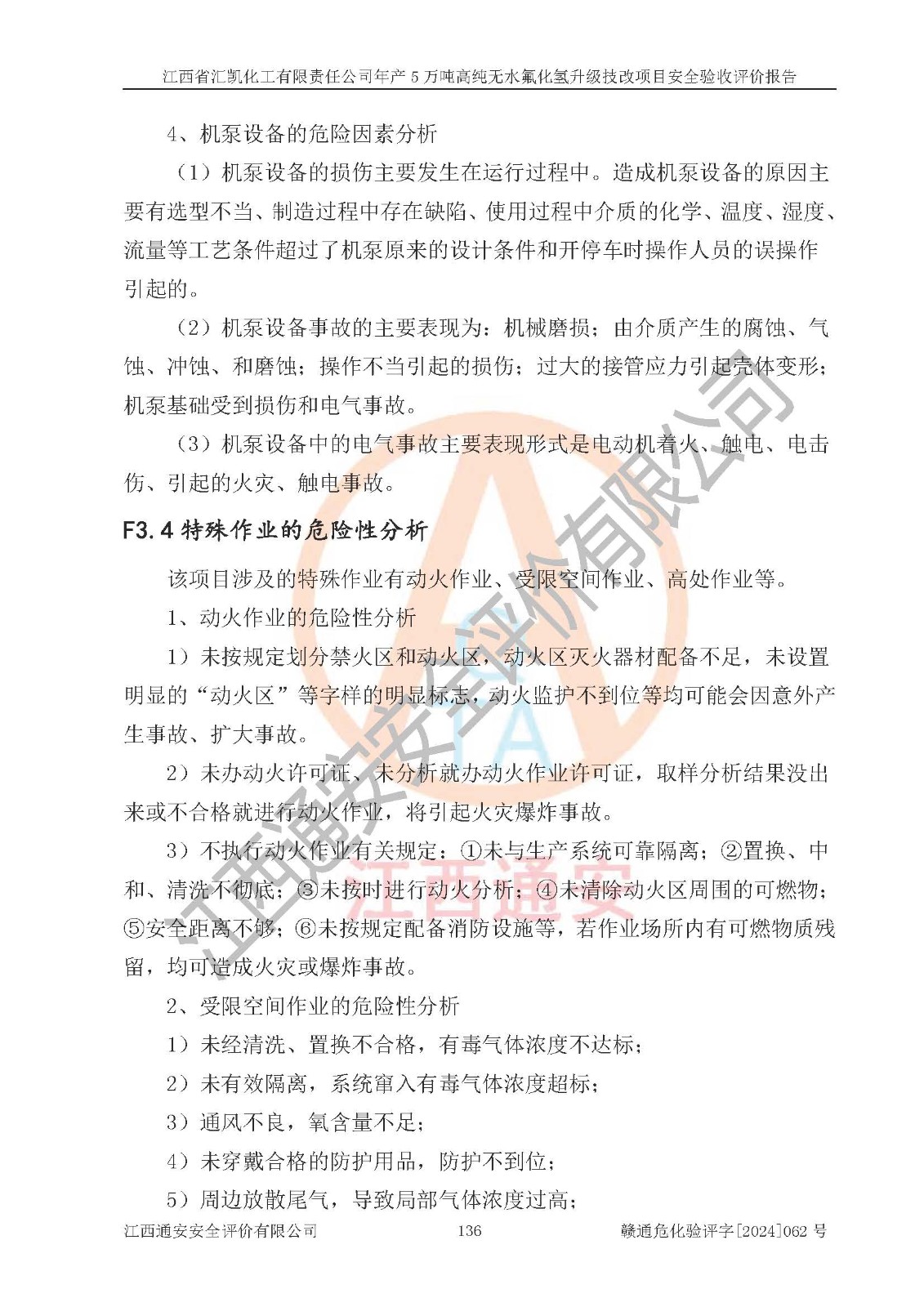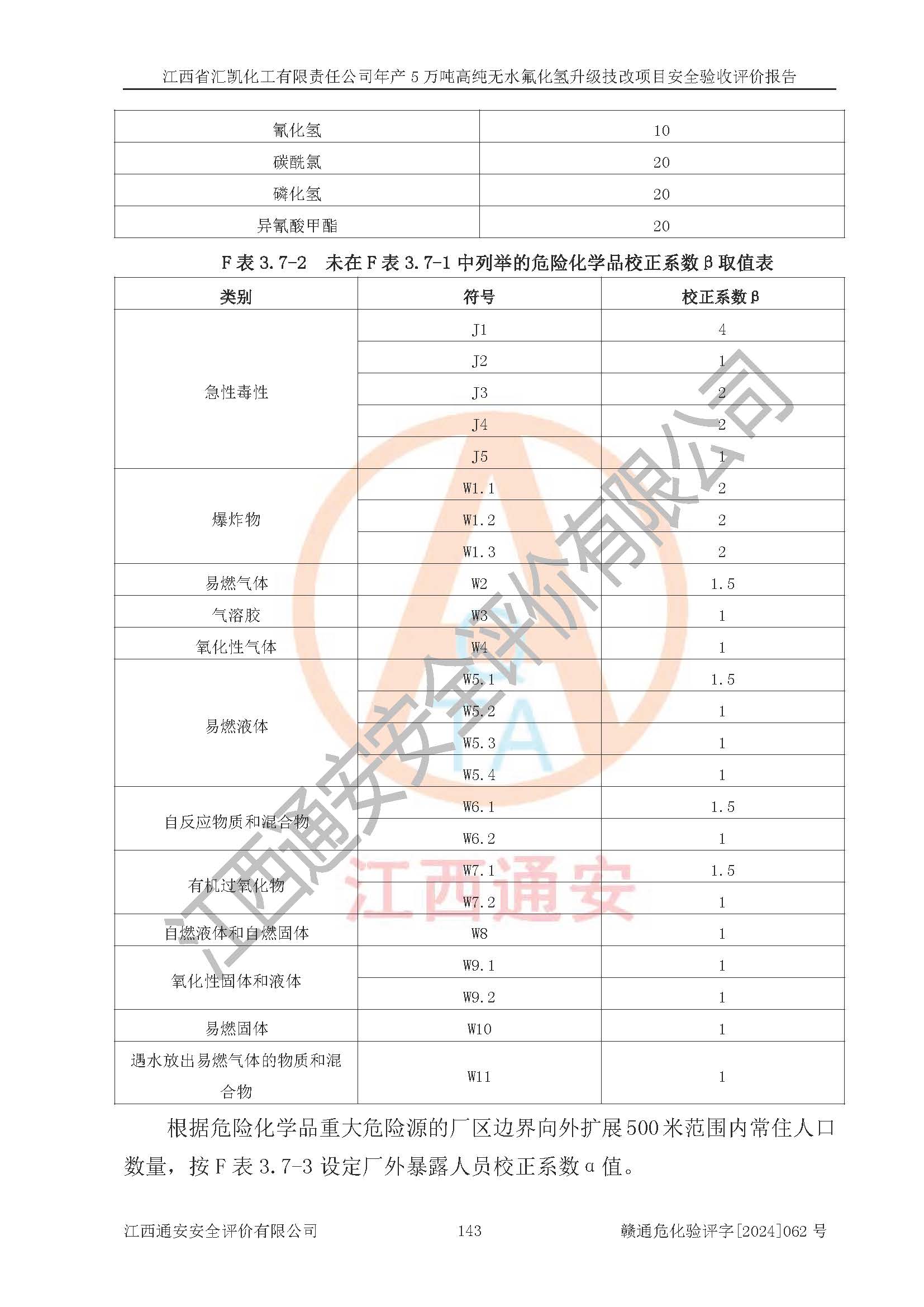 项目简介 | 江西省汇凯化工有限责任公司(以下简称“汇凯化工”)成立于2017年08月08日,注册地址位于江西省赣州市会昌县筠门岭镇九二工业基地,法定**人为张裕生,注册资本壹亿元整,经营范围为危险化学品生产、化工产品销售等。 汇凯化工公司2022年11月03日取得了《安全生产许可证》,许可证编号:(赣)WH安许证字[2019]1060号,许可范围为无水氟化氢(50kt/a)、氢氟酸(1690t/a)、氟硅酸(4468t/a),**期:2022年11月25日至2025年11月24日。 2017年9月21日,会昌县工信局同意公司在收购鹰鹏化工有限公司原有2万吨氢氟酸生产线基础上,建设“年产2万吨无水氟化氢异地搬迁技改项目”,并出具《关于江西省汇凯化工有限责任公司年产2万吨无水氟化氢异地搬迁技改项目备案的批复》(会工信投资字[2017]3号),项目已于2019年9月通过了竣工验收;2019年依据工业和信息化部公告《氟化氢行业准入条件》(2011年第6号)规定“为满足节能、**以及安全生产要求,提高氟资源利用率,实现合理的规模经济,新建生产企业的氟化氢总规模不得低于5万吨/年”;为满足《氟化氢行业准入条件》及企业未来发展需要,公司在现有生产线的基础上进行技改,二期于2019年10月建设年产3万吨无水氟化氢,2021年9月已竣工验收,达到5万吨/年无水氟化氢的生产规模,满足行业准入的规模要求。 汇凯化工公司为了进一步提升竞争力,现对原有年产5万吨无水氟化氢项目进行技改,将原产品进一步纯化,达到高纯无水氟化氢。汇凯化工公司已取得了年产5万吨高纯无水氟化氢升级技改项目备案通知书。 汇凯化工公司委托江西伟灿工程技术咨询有限责任公司编制了年产5万吨高纯无水氟化氢升级技改项目安全预评价报告,并于2022年4月18日取得了赣州市行政审批局《关于江西省汇凯化工有限责任公司年产5万吨高纯无水氟化氢升级技改项目安全条件审查的批复》{赣市行审证(3)字[2022]131号},委托河北英科石化工程有限公司编制了年产5万吨高纯无水氟化氢升级技改项目安全设施设计,并于2022年7月4日取得了赣州市行政审批局《关于江西省汇凯化工有限责任公司年产5万吨高纯无水氟化氢升级技改项目安全设施设计审查的批复》{赣市行审证(3)字[2022]253号}。因生产经营需要,汇凯化工公司编制了年产5万吨高纯无水氟化氢升级技改项目试生产方案,2024年1月5日组织专家对试生产方案及现场进行了评审,经整改后取得了会昌县应急管理局出具的试生产方案备案回执,试生产期限为2024年5月31日至2025年5月30日,目前试生产目标任务基本达成,拟进行项目的安全设施验收工作。 江西省汇凯化工有限责任公司年产5万吨高纯无水氟化氢升级技改项目(以下简称“该项目”)主要建设内容为101AHF主车间三高纯氟化氢生产线设备、201高纯氟化氢罐区、201-1装卸区、202萤石粉库二、401中心控制室,生产工艺为通过精馏提纯除去原产品氟化氢内的铁、硫酸盐等杂质,得到高纯无水氟化氢产品(99.999%)。 该项目生产过程中涉及的物料为氟化氢、液碱(氢氧化钠)和氢氟酸,氟化氢、氢氧化钠和氢氟酸属于危险化学品。经辨识,该项目涉及的氟化氢和氢氟酸属于重点监管的危险化学品和高毒物品,不涉及监控化学品、易制毒化学品、易制爆危险化学品、剧毒化学品和特别管控危险化学品,不涉及重点监管的危险化工工艺。101AHF主车间三内精馏生产单元、201高纯氟化氢罐区内高纯氟化氢存储单元分别构成危险化学品一级重大危险源。根据生产工艺特点及物料的理化特性可知,该项目生产过程中主要存在火灾与爆炸、中毒与窒息、灼烫、触电、机械伤害等危险因素。 | ||||||