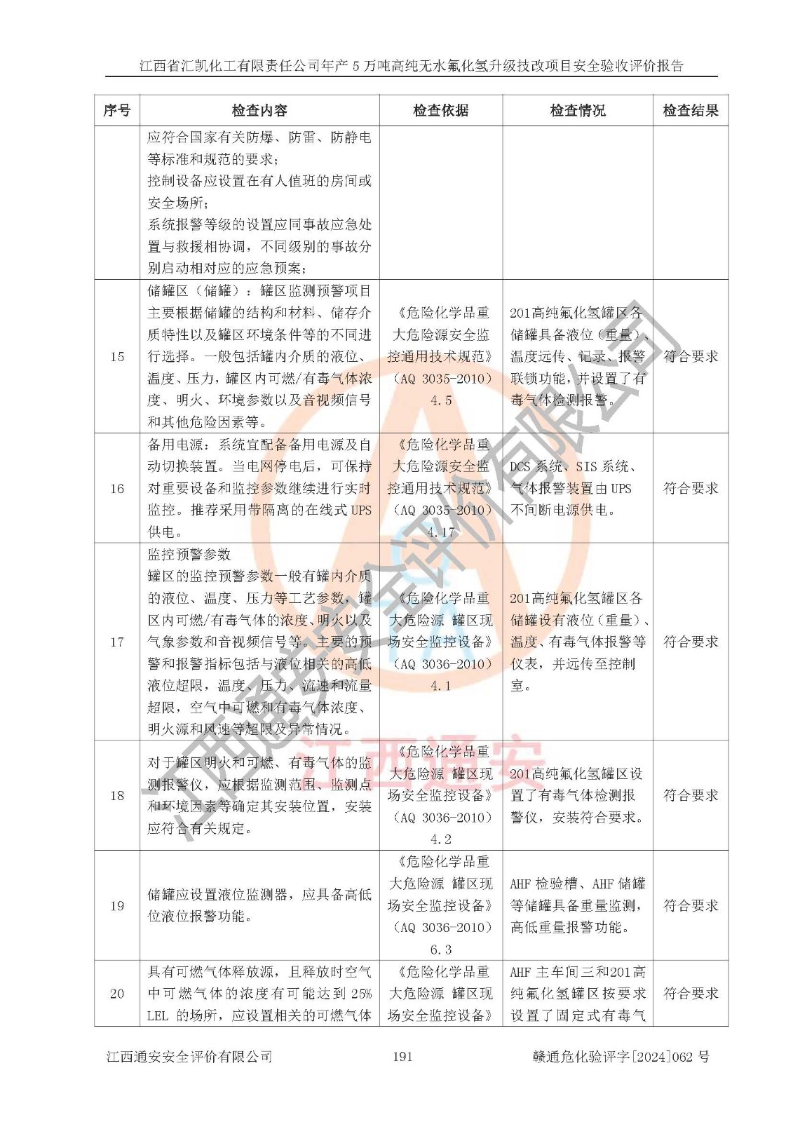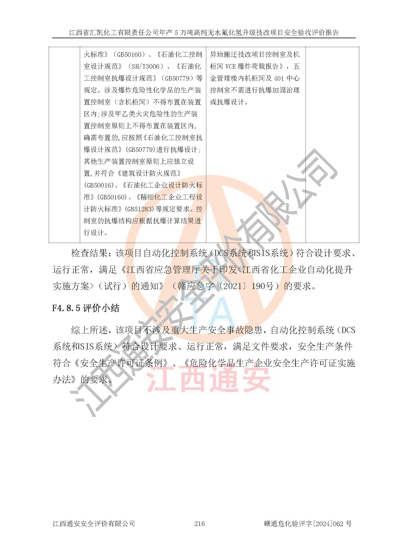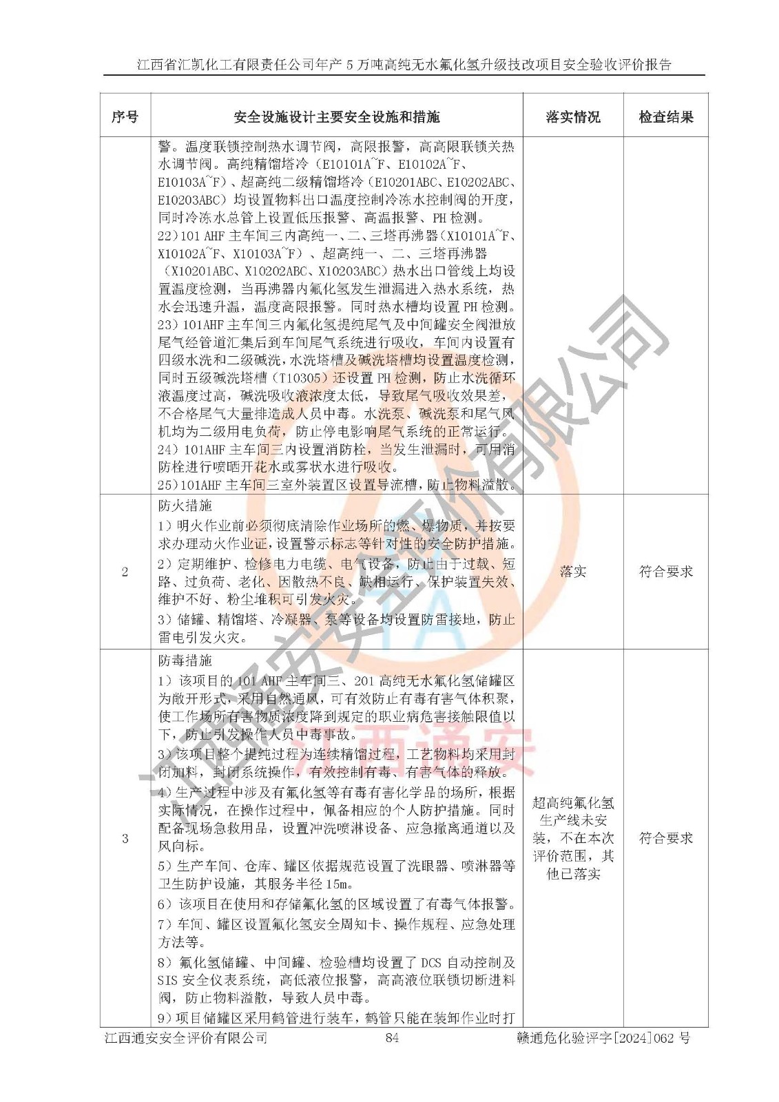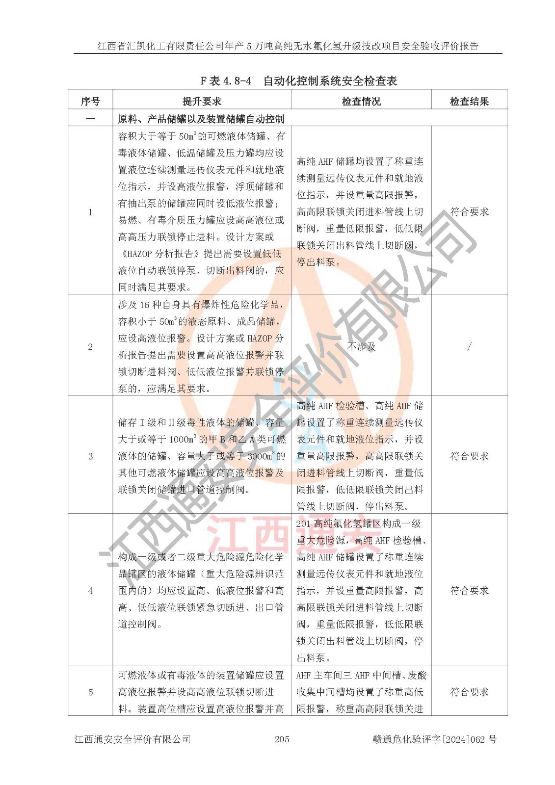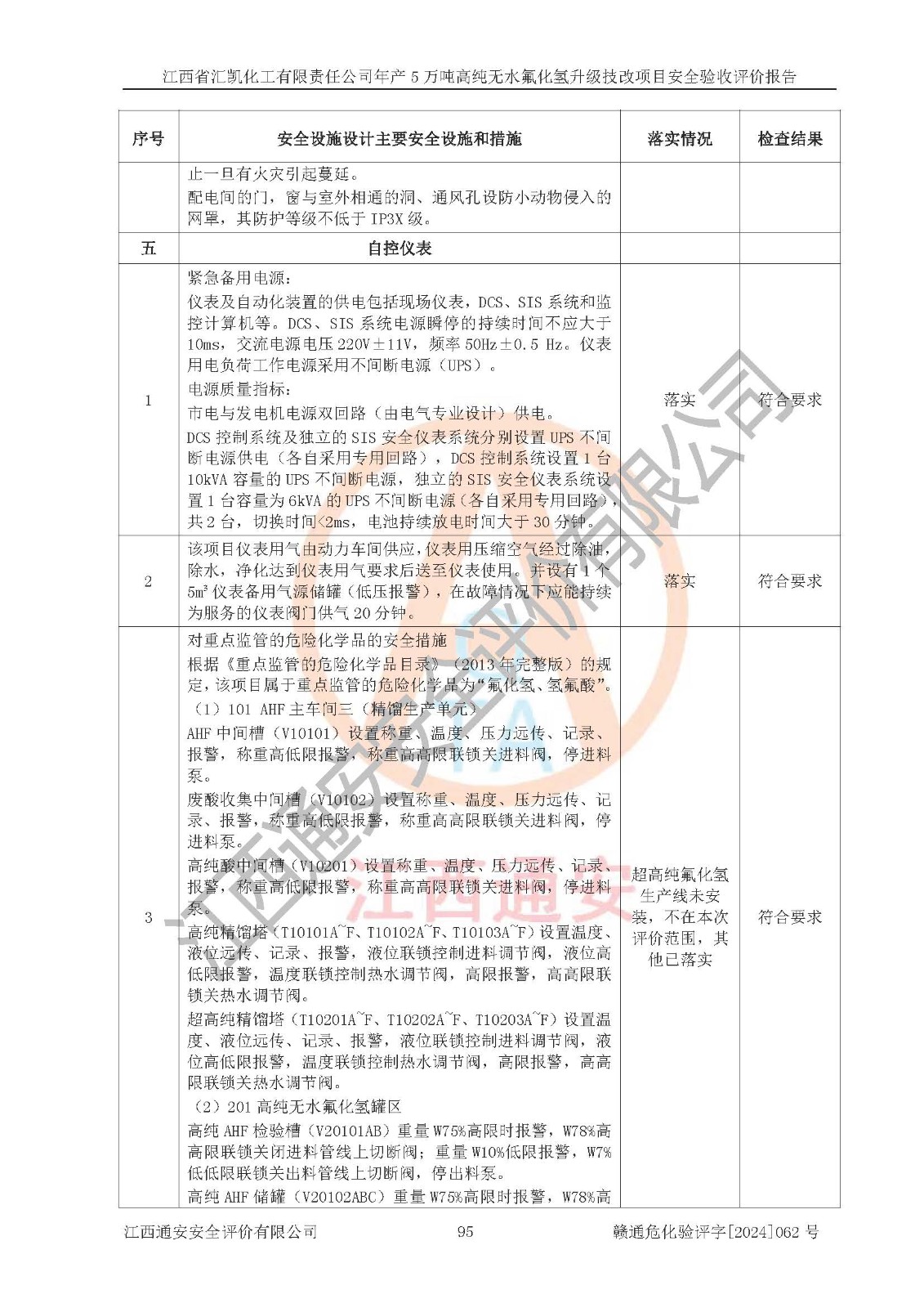 评价结论 | 江西省汇凯化工有限责任公司年产5万吨高纯无水氟化氢升级技改项目现场情况与设计图纸一致,DCS系统和SIS系统符合设计要求、运行正常,主要负责人、安全管理人员等有关从业人员资质符合《江西省危险化学品安全专项整治三年行动实施方案》要求,安全设施及安全管理符合**及有关部门关于安全生产法律、法规、标准的要求,该项目试生产以来,工艺设备运行正常,安全设施和采取的安全技术措施符合设计要求并达到预期结果,可以满足建设项目安全生产的要求,安全生产管理**,具备了安全设施竣工验收条件。 | ||||||
