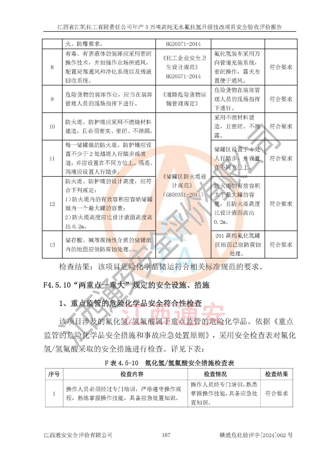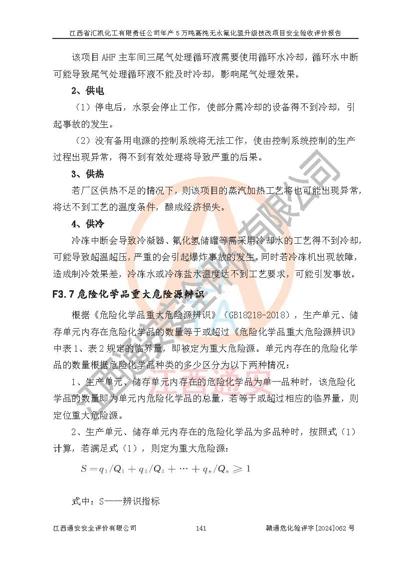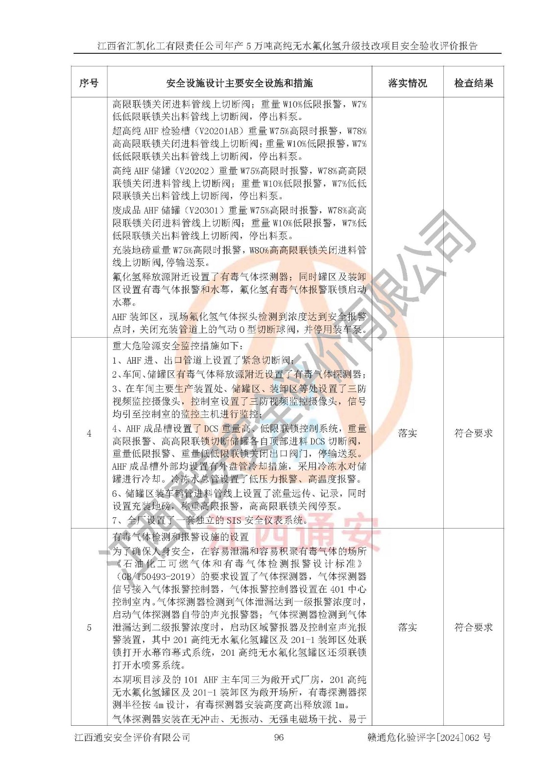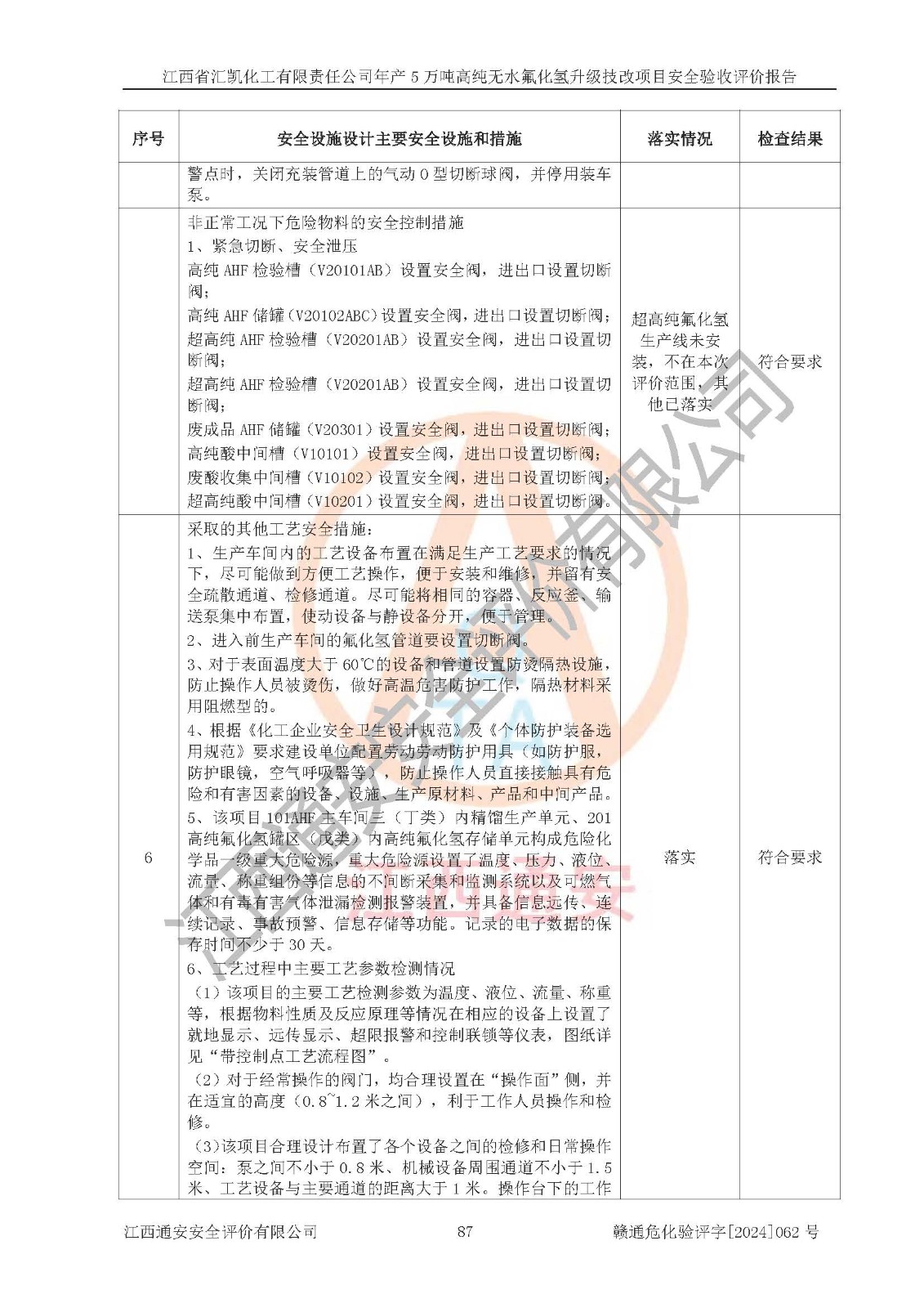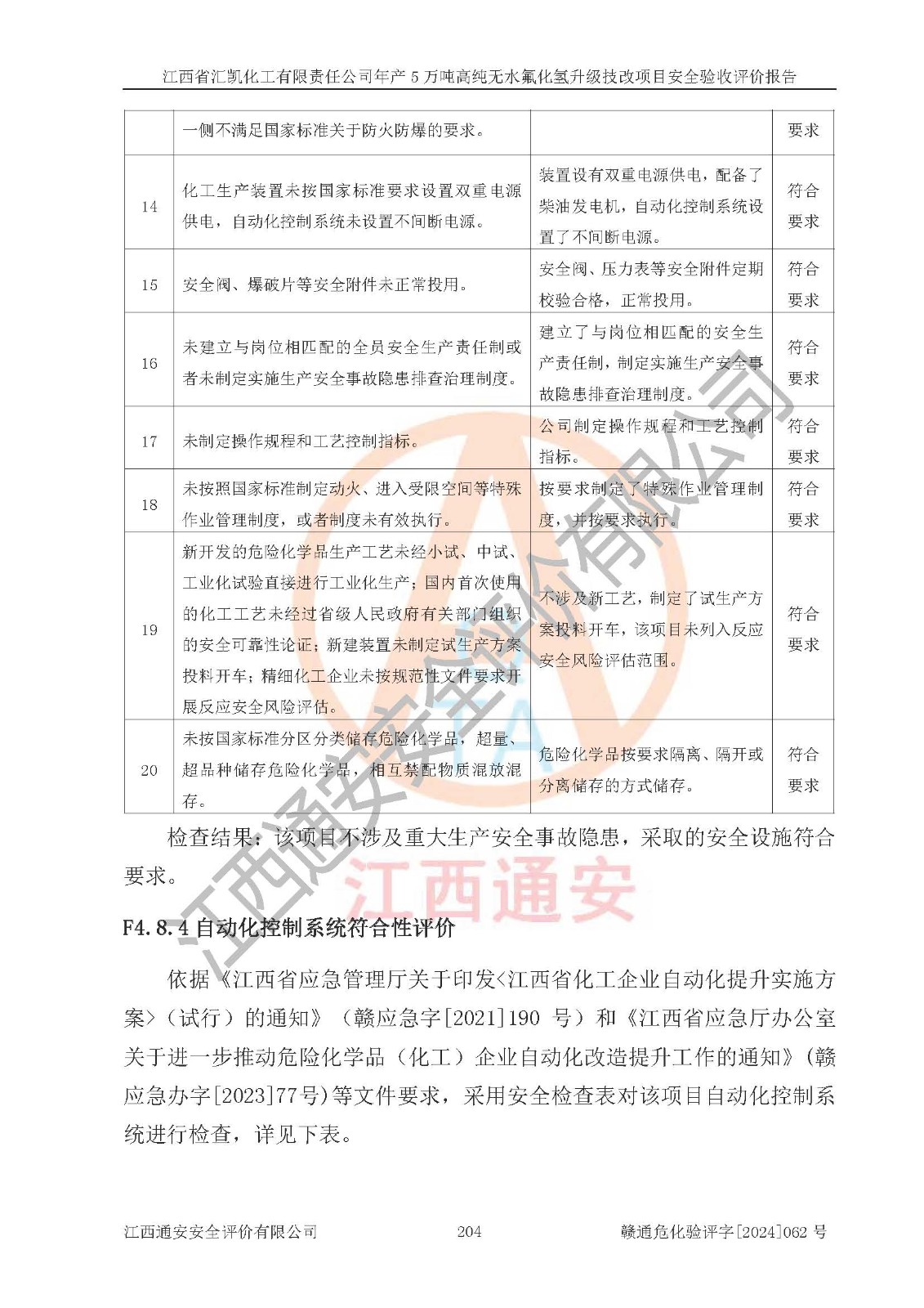 评价结论 | 江西省汇凯化工有限责任公司年产5万吨高纯无水氟化氢升级技改项目现场情况与设计图纸一致,DCS系统和SIS系统符合设计要求、运行正常,主要负责人、安全管理人员等有关从业人员资质符合《江西省危险化学品安全专项整治三年行动实施方案》要求,安全设施及安全管理符合**及有关部门关于安全生产法律、法规、标准的要求,该项目试生产以来,工艺设备运行正常,安全设施和采取的安全技术措施符合设计要求并达到预期结果,可以满足建设项目安全生产的要求,安全生产管理**,具备了安全设施竣工验收条件。 | ||||||