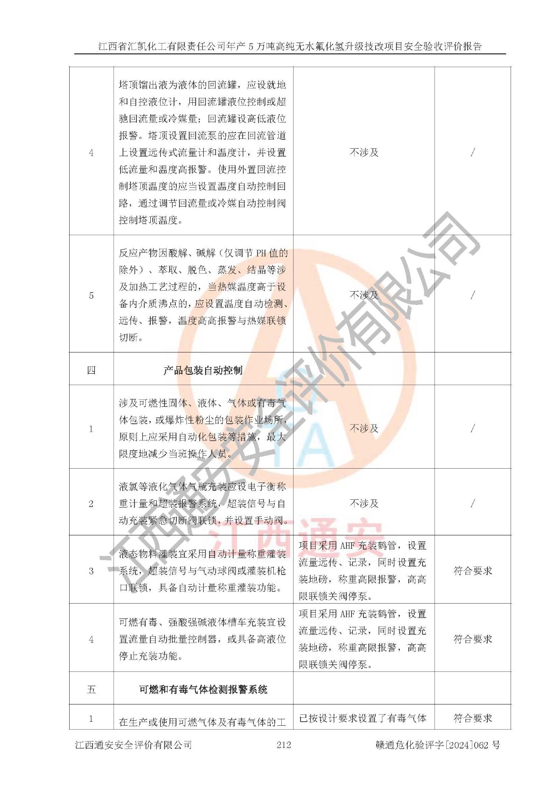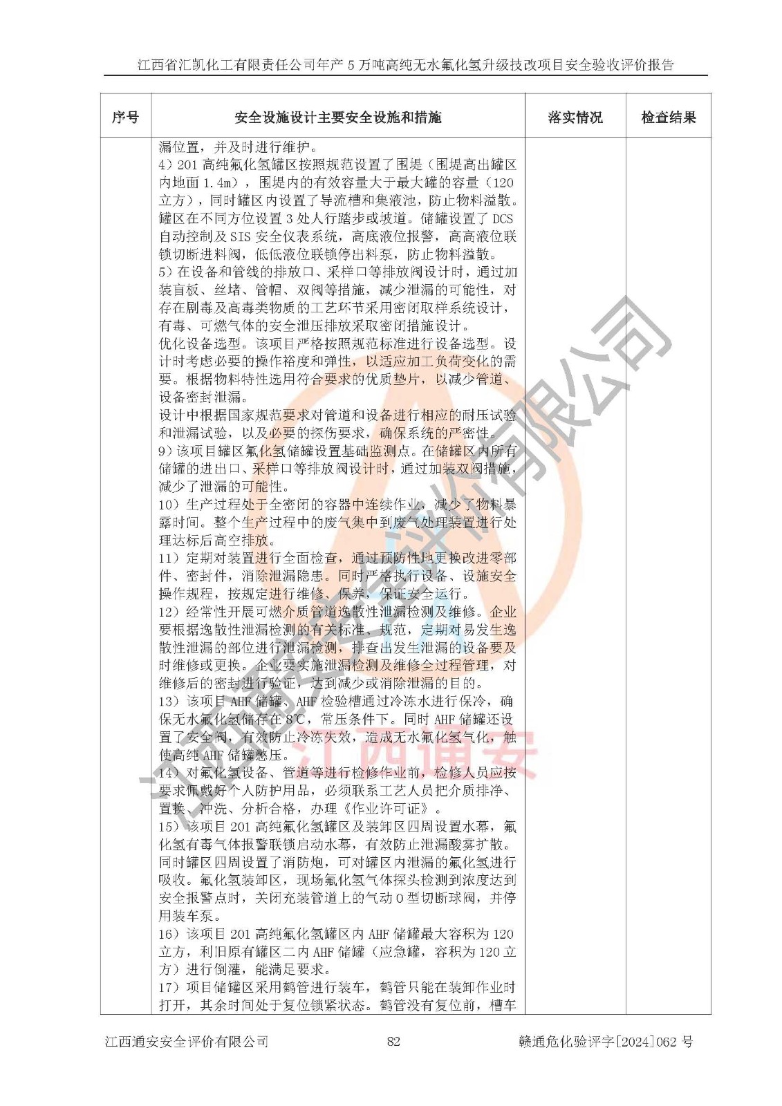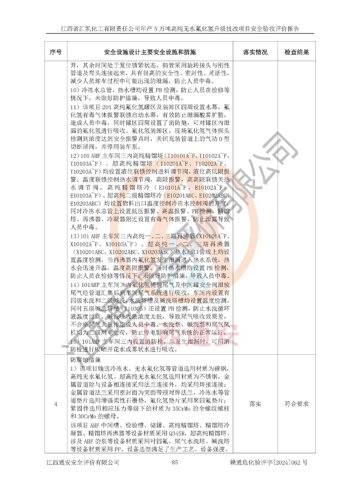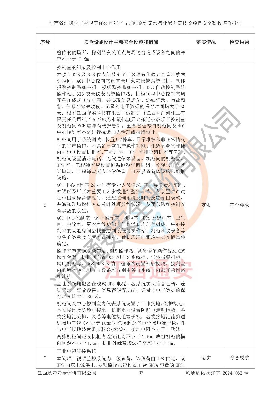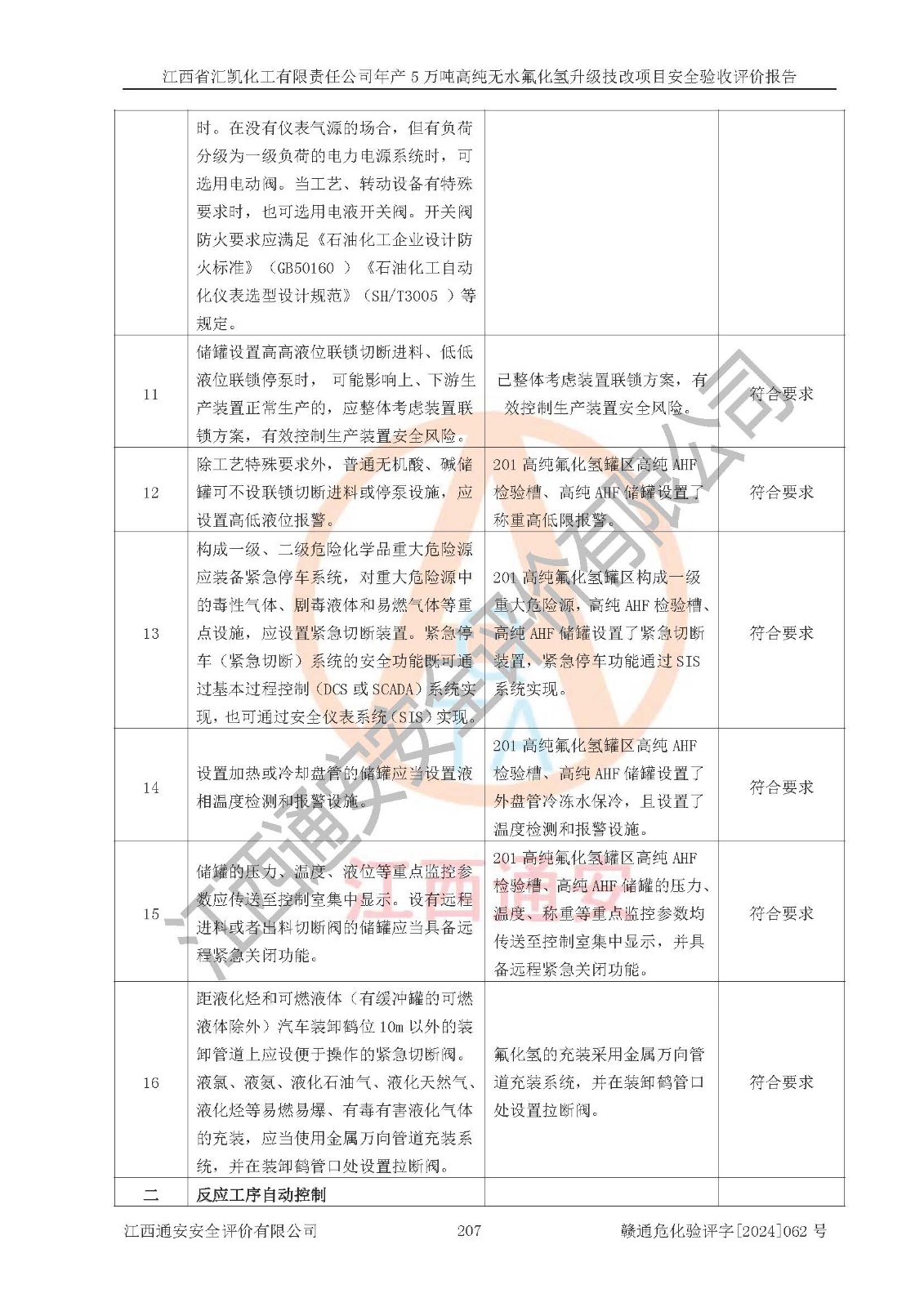 评价结论 | 江西省汇凯化工有限责任公司年产5万吨高纯无水氟化氢升级技改项目现场情况与设计图纸一致,DCS系统和SIS系统符合设计要求、运行正常,主要负责人、安全管理人员等有关从业人员资质符合《江西省危险化学品安全专项整治三年行动实施方案》要求,安全设施及安全管理符合**及有关部门关于安全生产法律、法规、标准的要求,该项目试生产以来,工艺设备运行正常,安全设施和采取的安全技术措施符合设计要求并达到预期结果,可以满足建设项目安全生产的要求,安全生产管理**,具备了安全设施竣工验收条件。 | ||||||