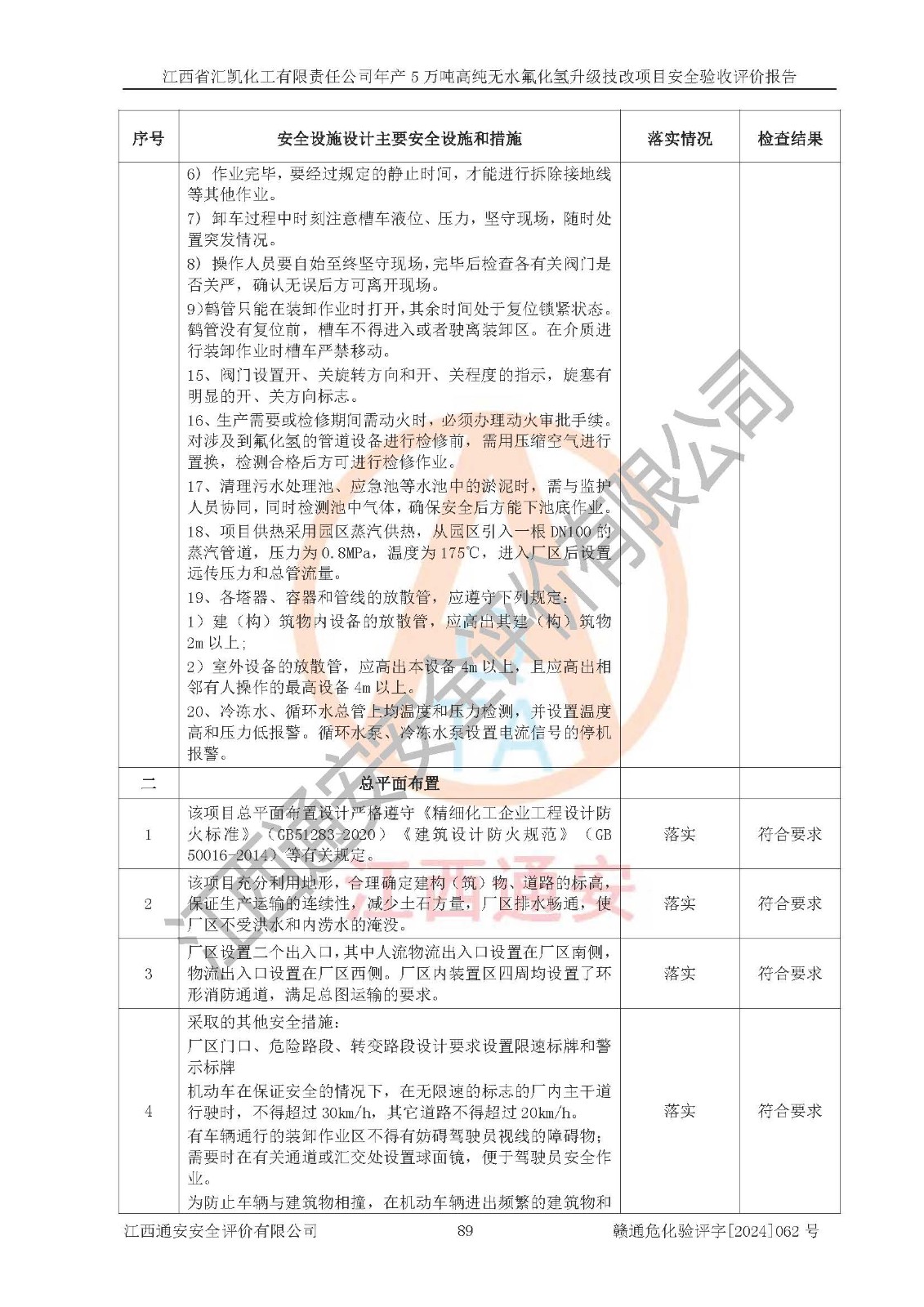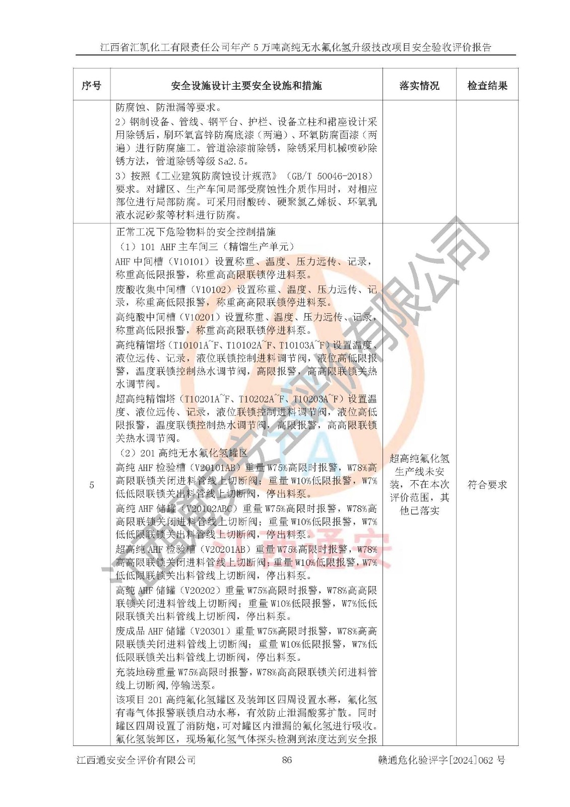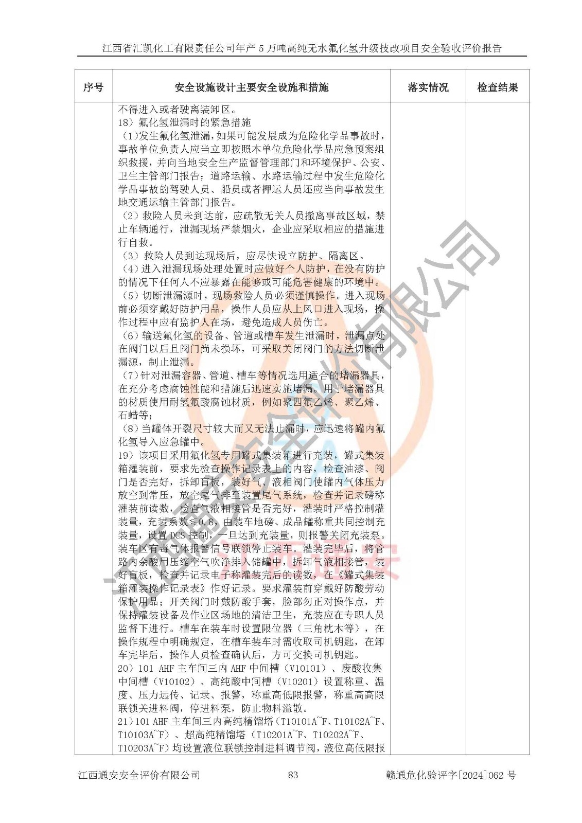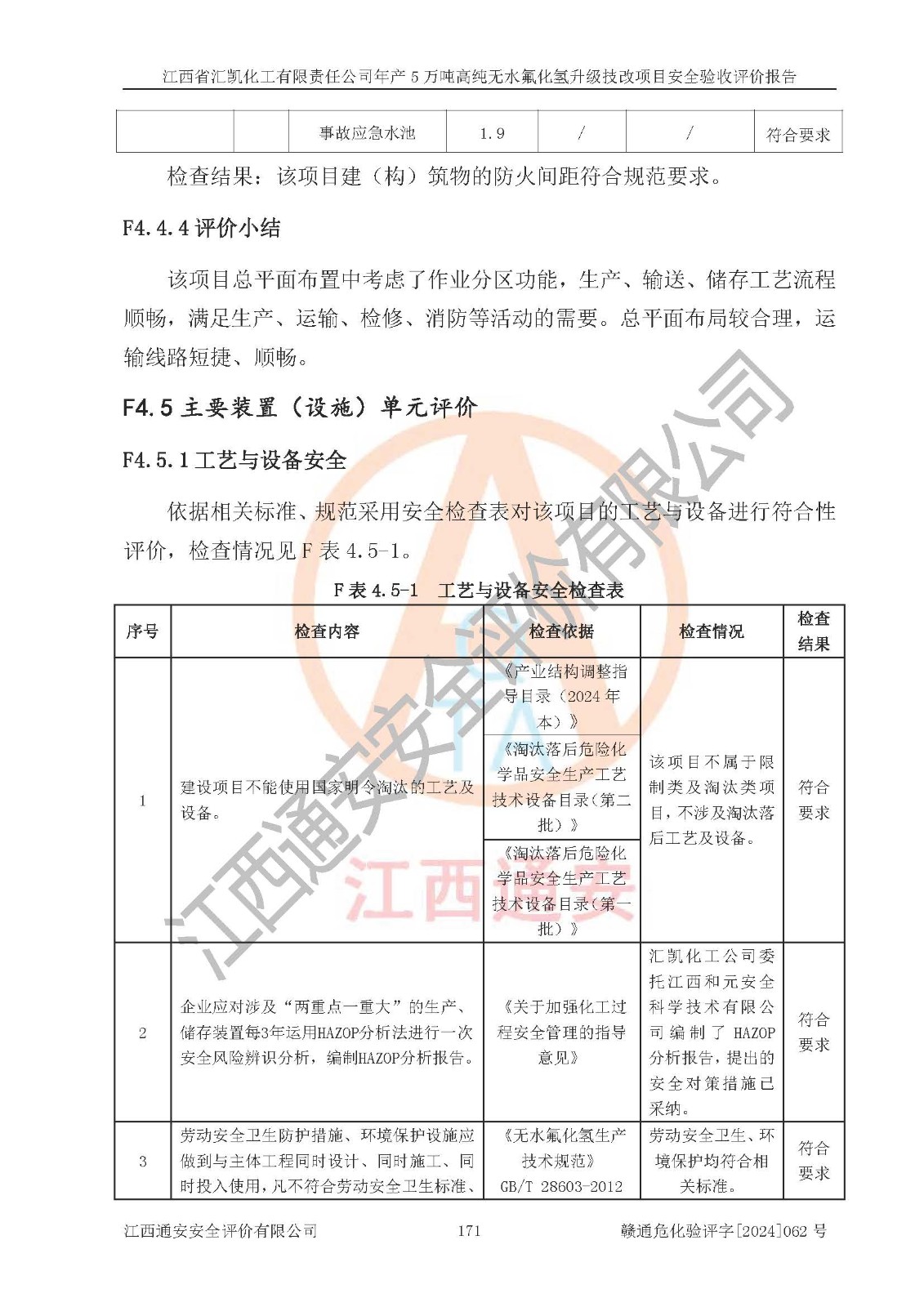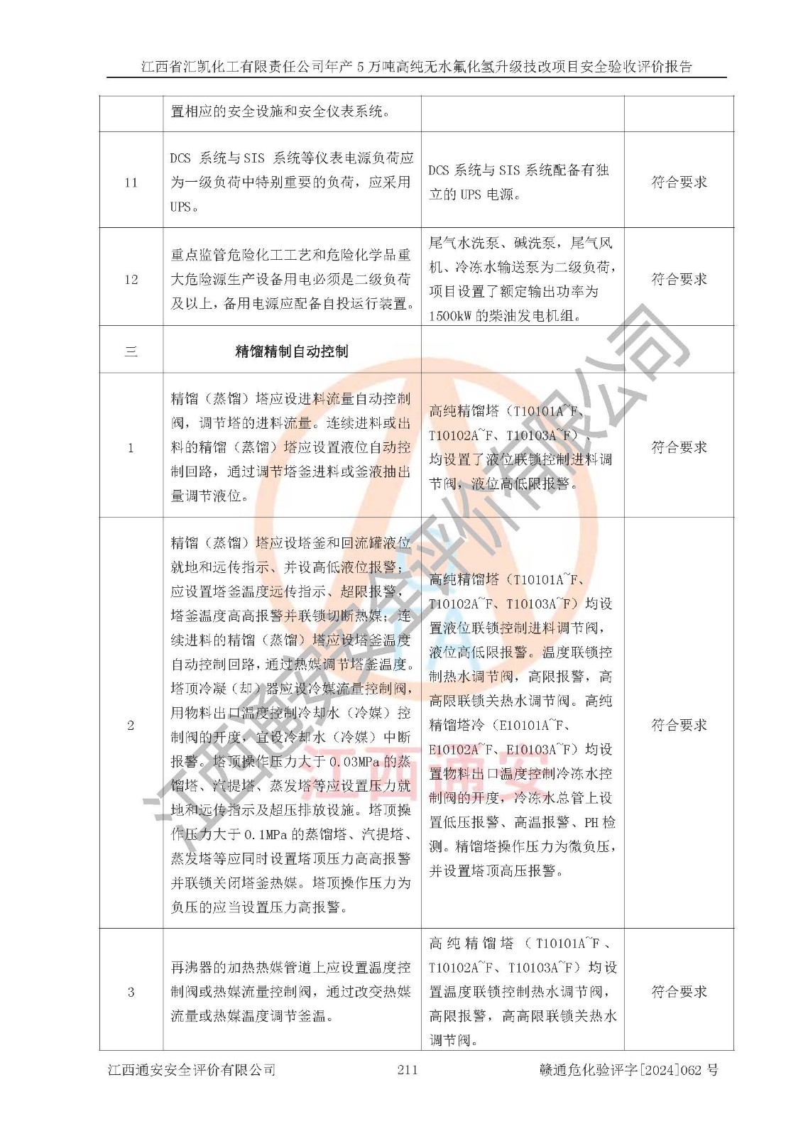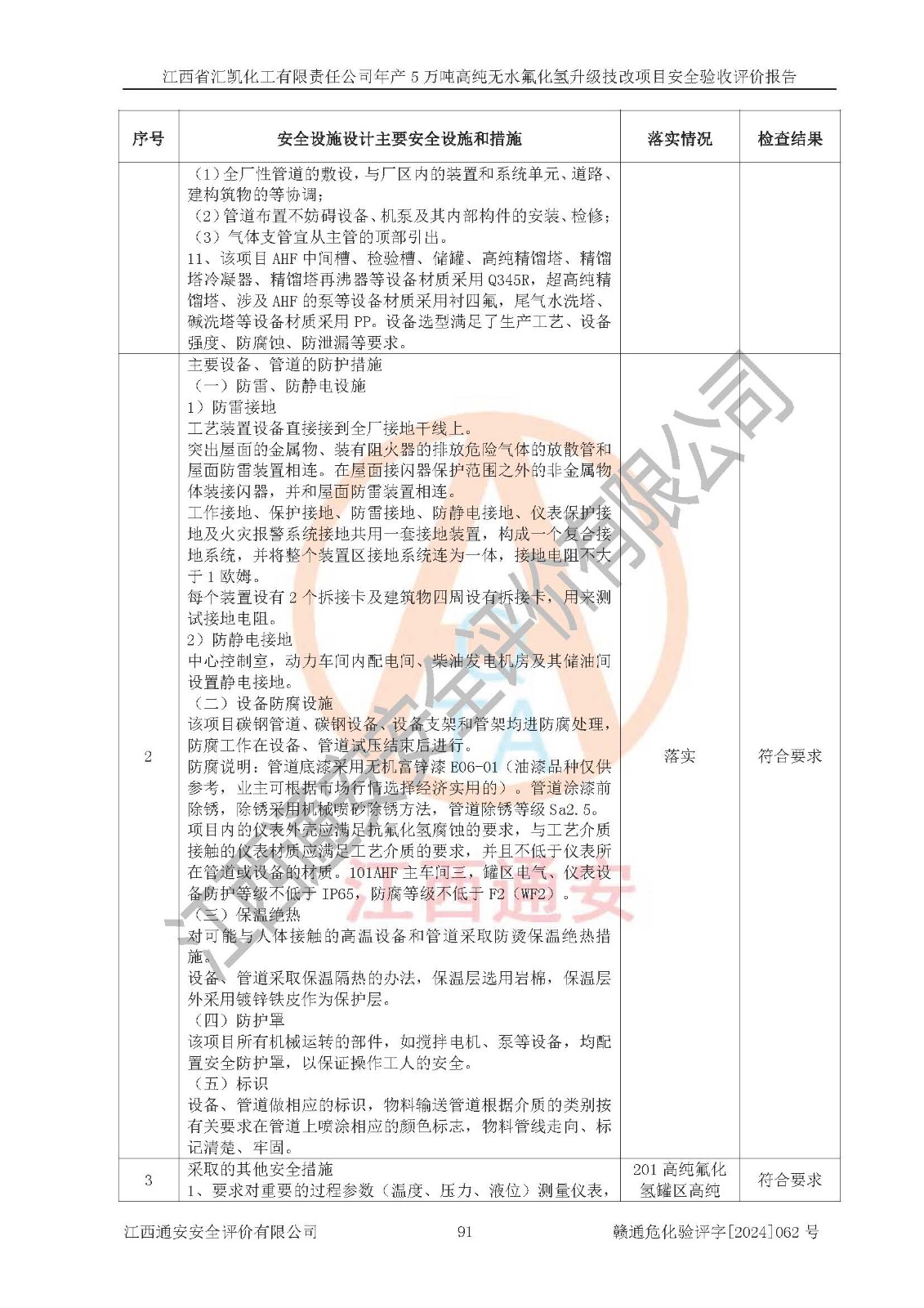 评价结论 | 江西省汇凯化工有限责任公司年产5万吨高纯无水氟化氢升级技改项目现场情况与设计图纸一致,DCS系统和SIS系统符合设计要求、运行正常,主要负责人、安全管理人员等有关从业人员资质符合《江西省危险化学品安全专项整治三年行动实施方案》要求,安全设施及安全管理符合**及有关部门关于安全生产法律、法规、标准的要求,该项目试生产以来,工艺设备运行正常,安全设施和采取的安全技术措施符合设计要求并达到预期结果,可以满足建设项目安全生产的要求,安全生产管理**,具备了安全设施竣工验收条件。 | ||||||
